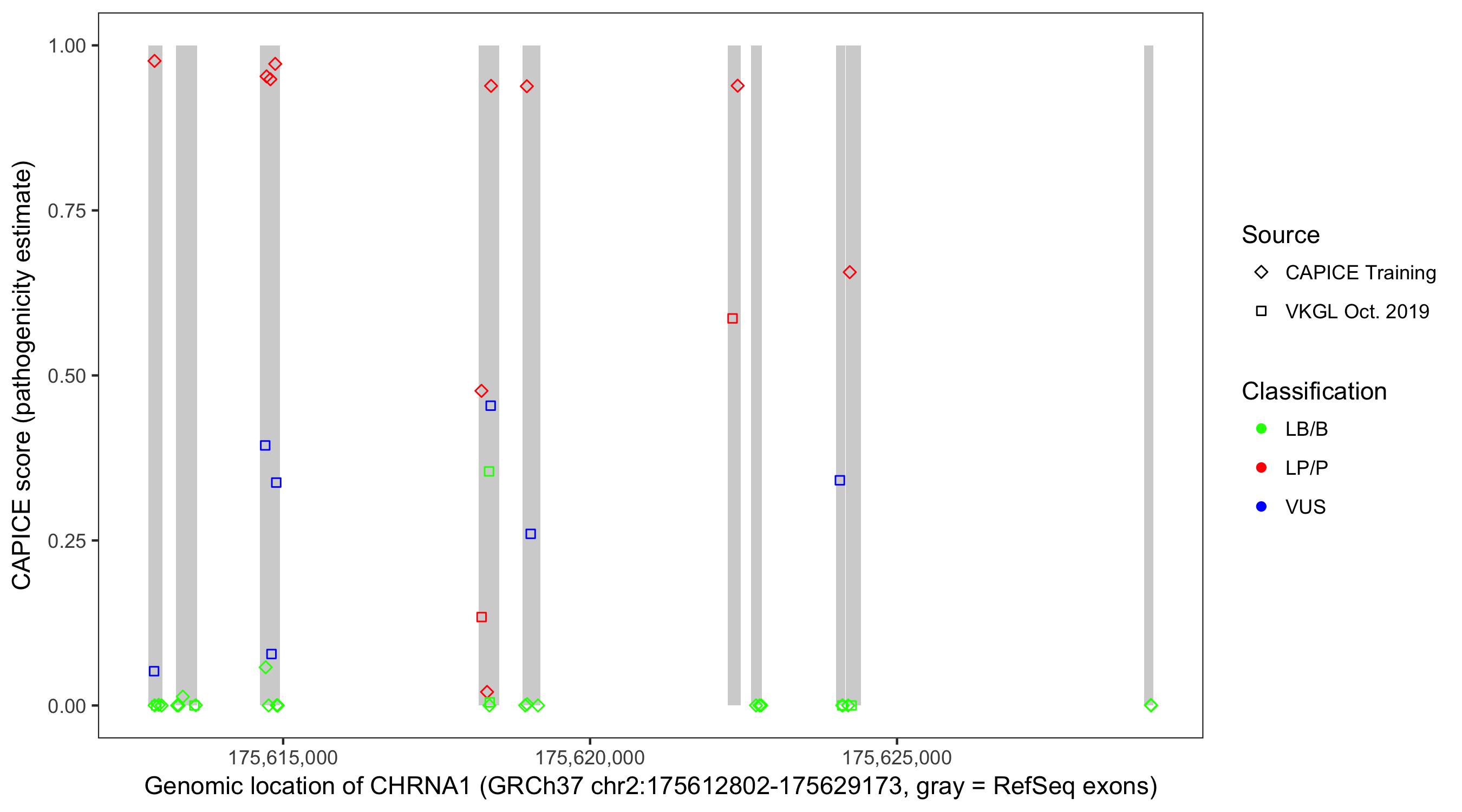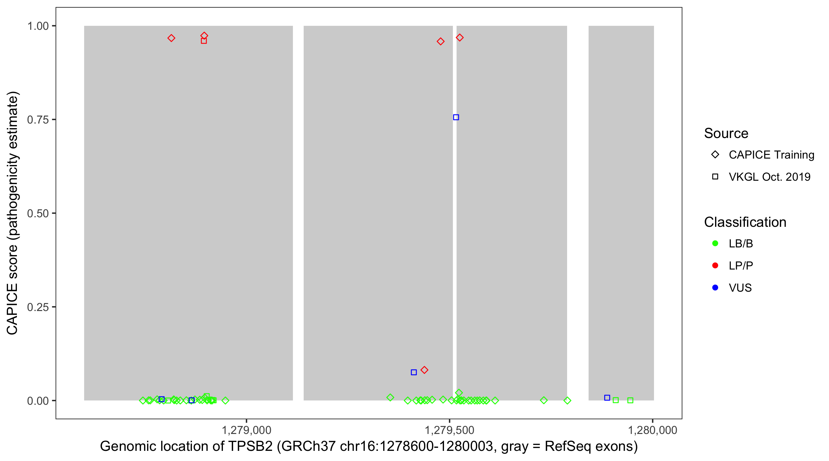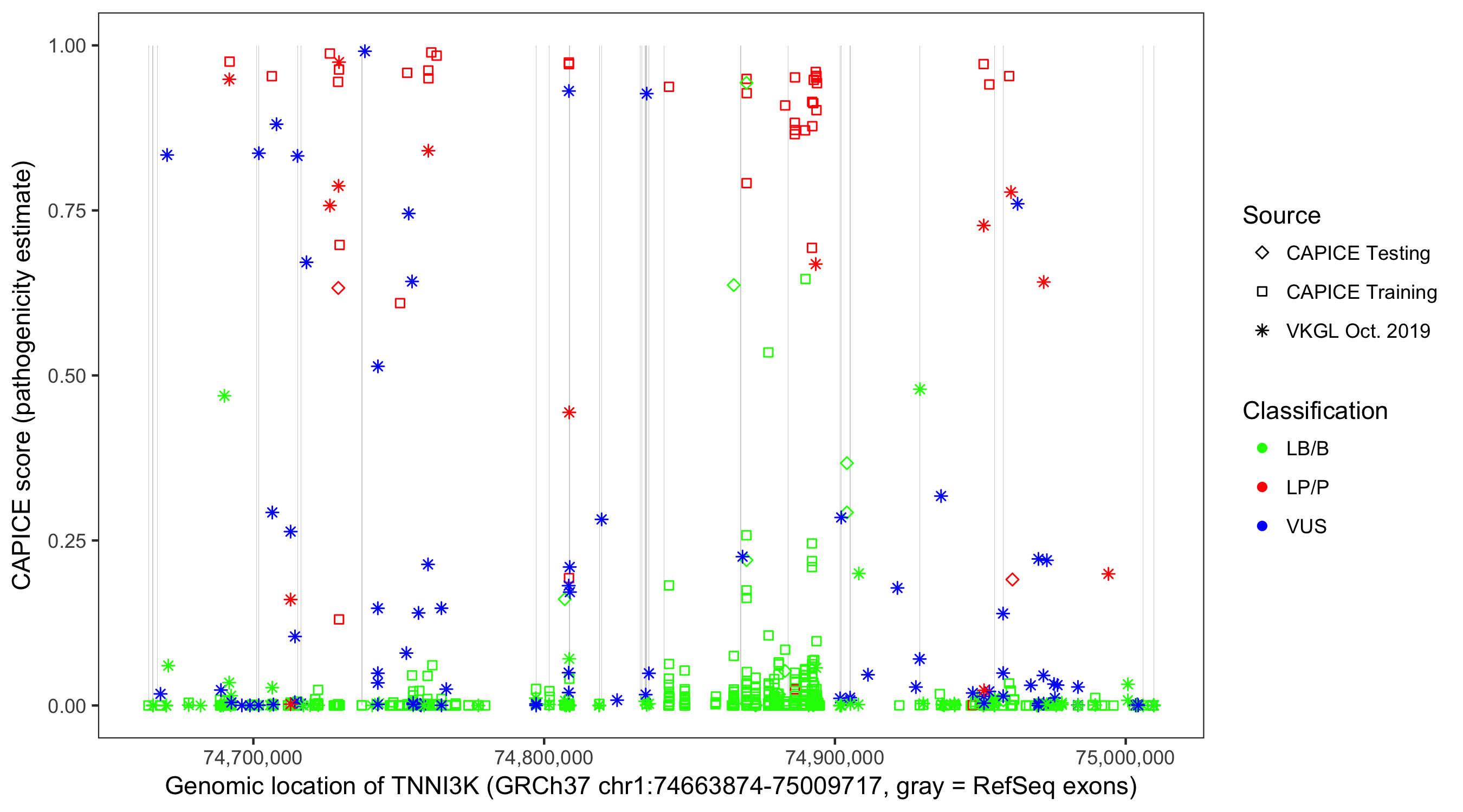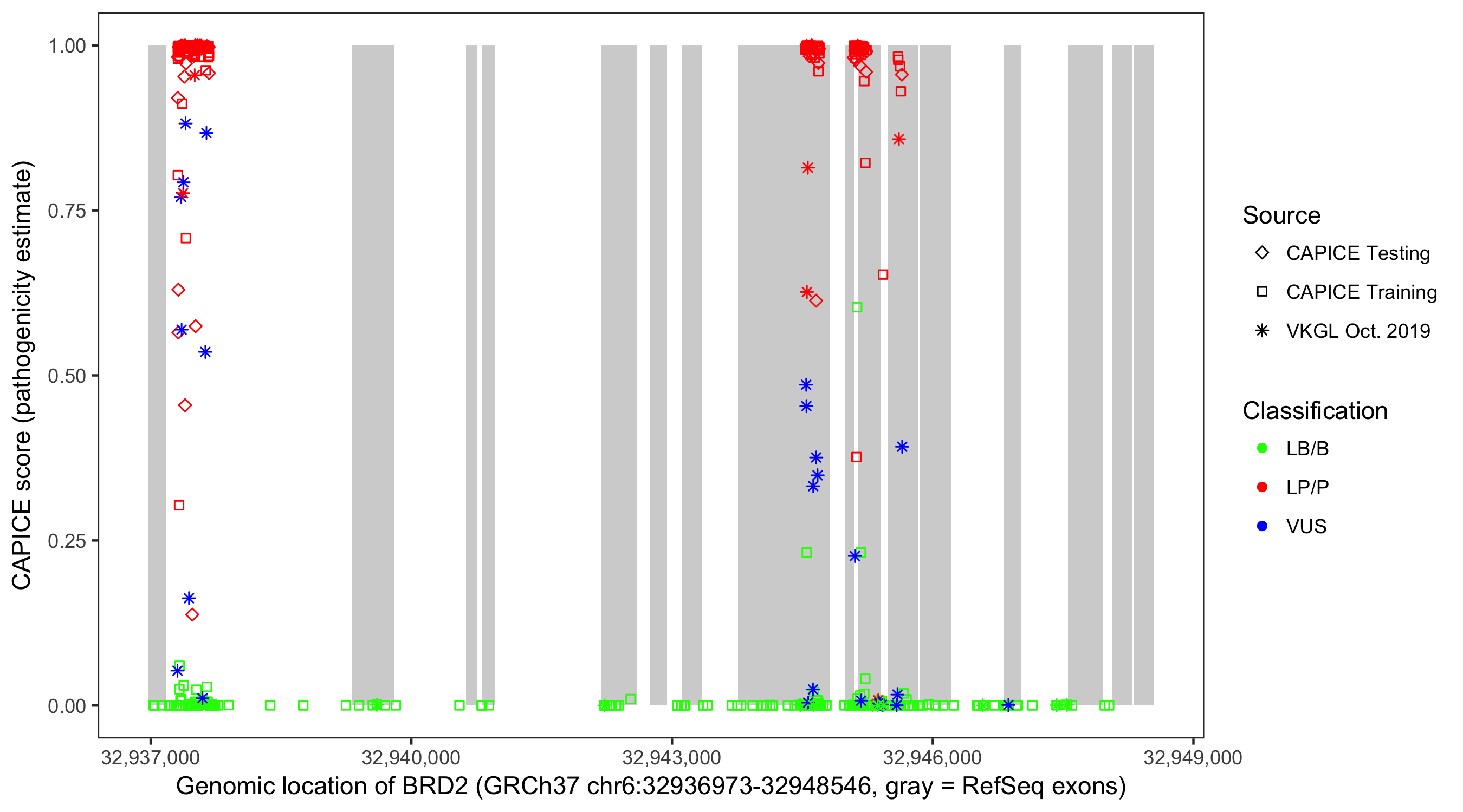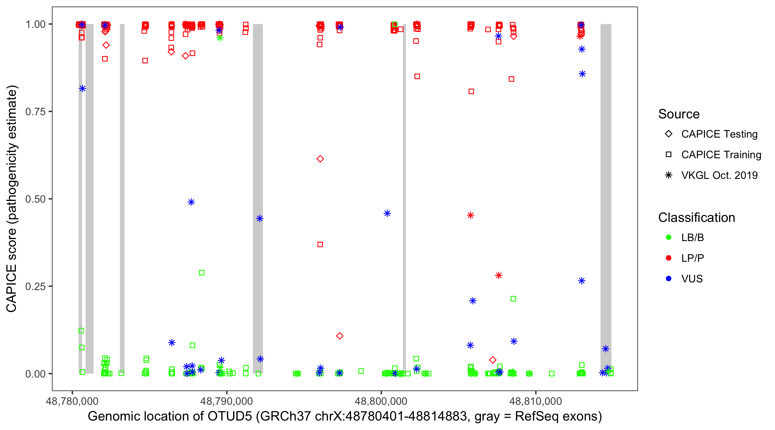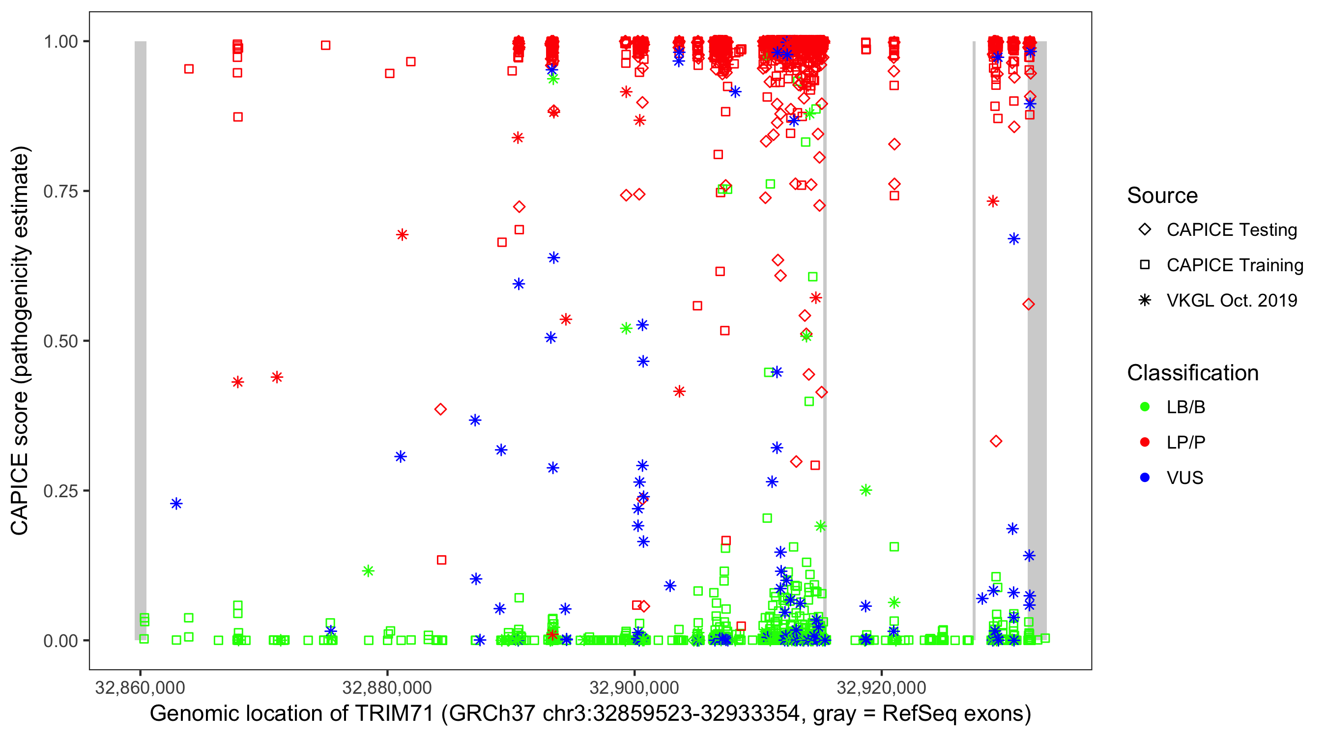 Shown are CAPICE train/test variants plus VKGL Oct 2019.