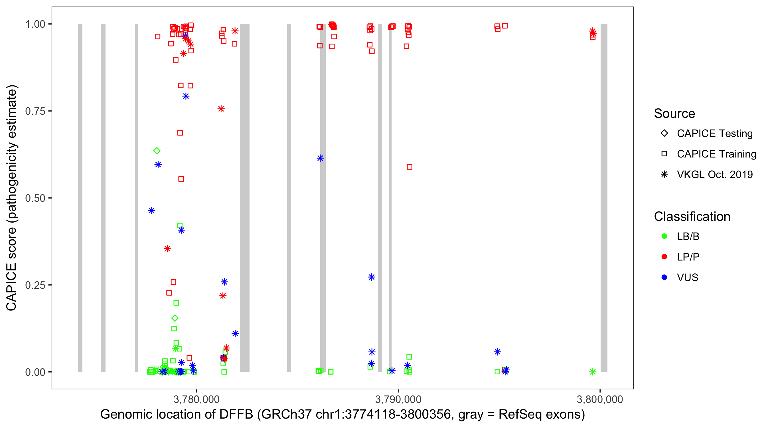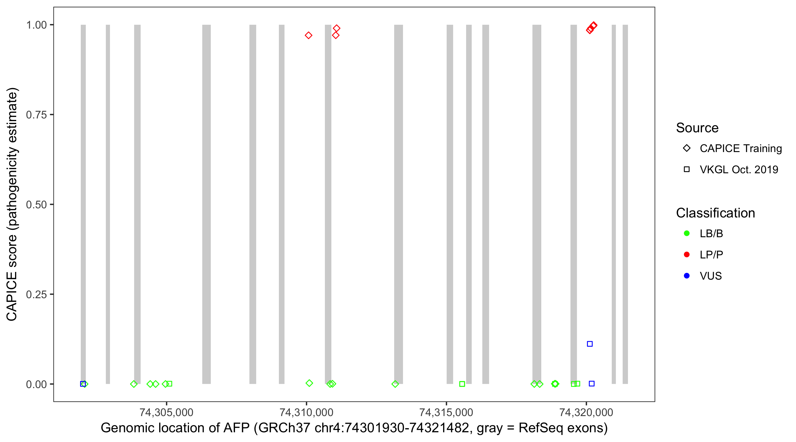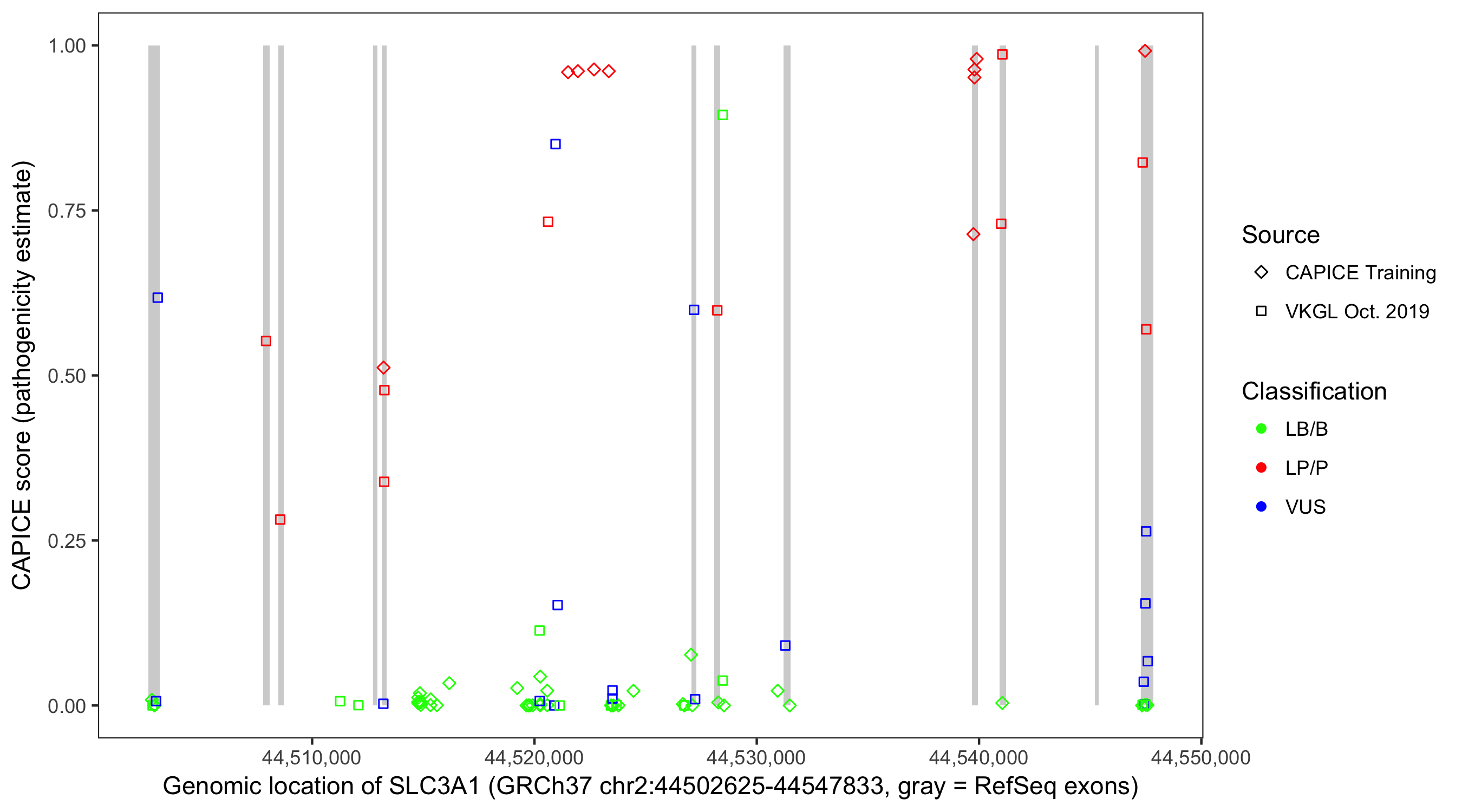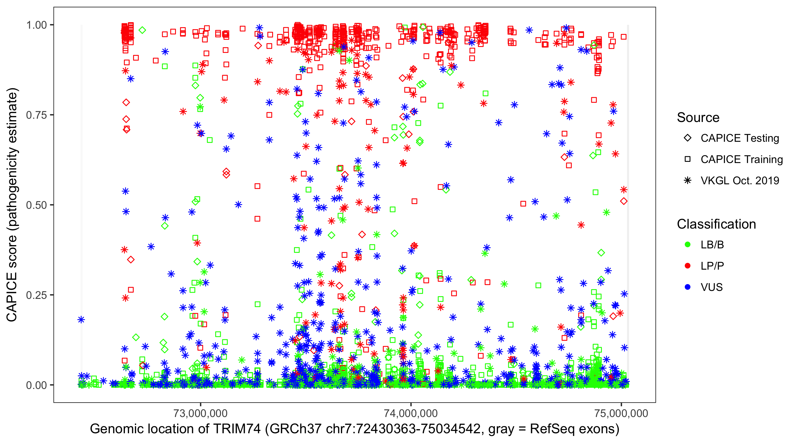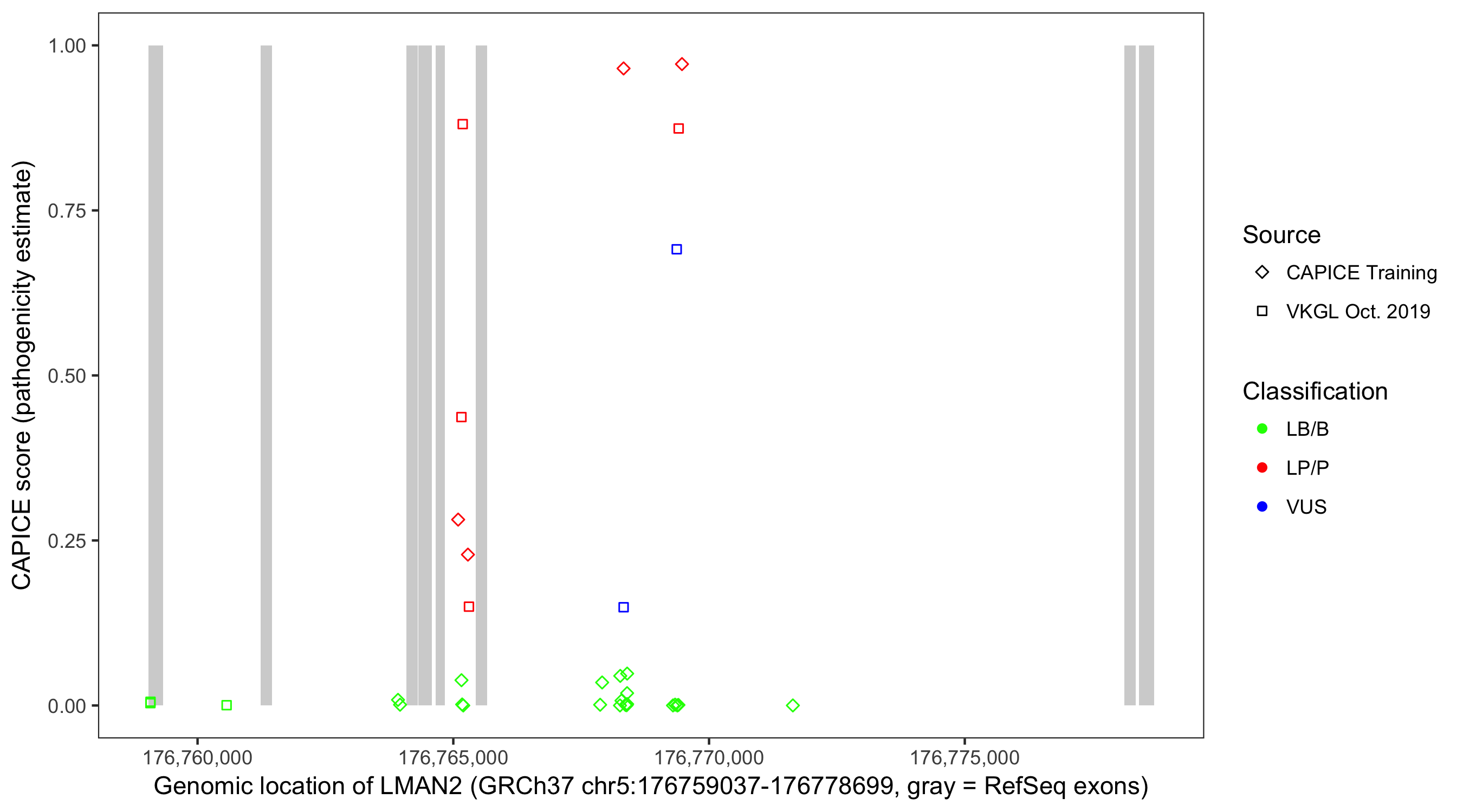 Shown are CAPICE train/test variants plus VKGL Oct 2019.