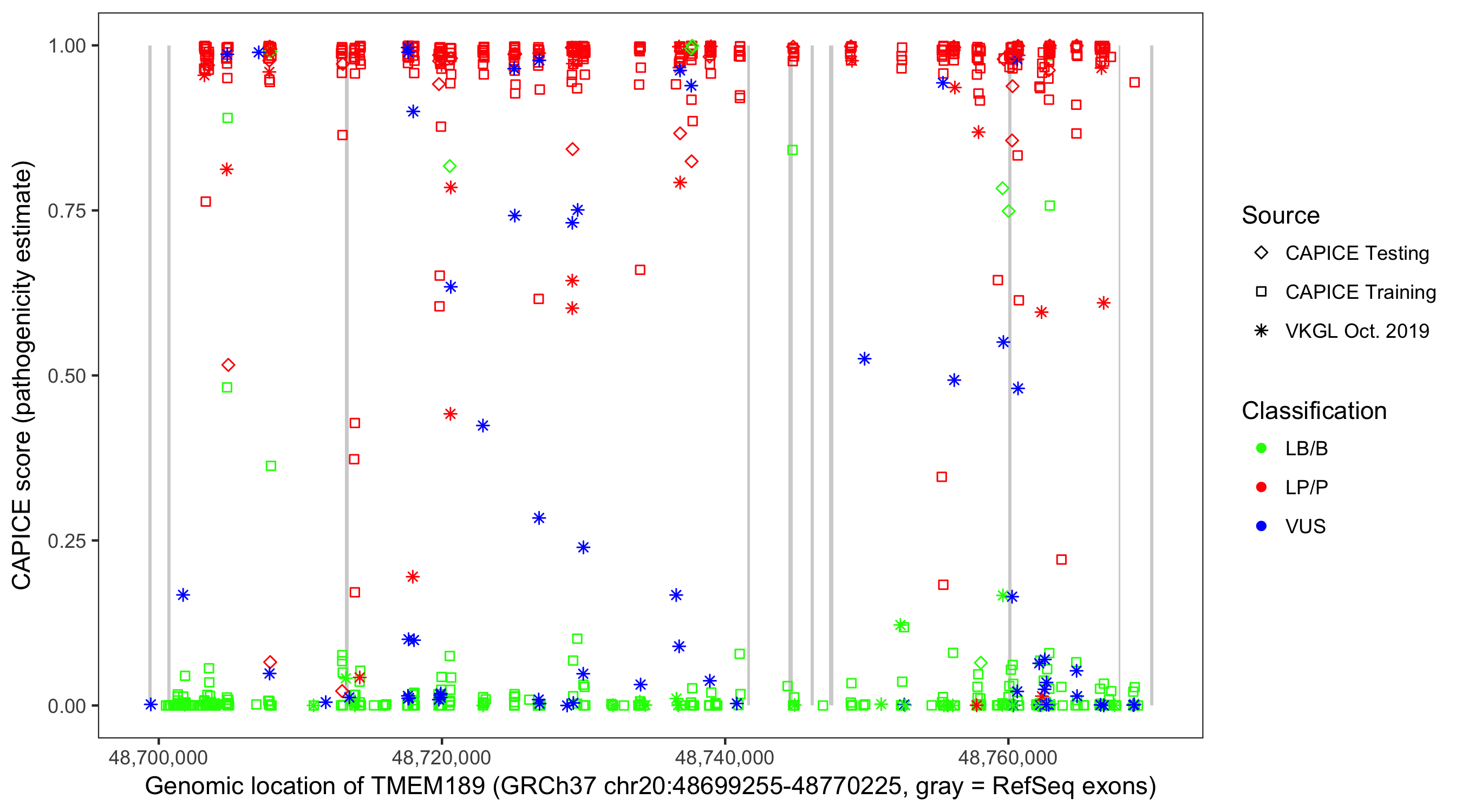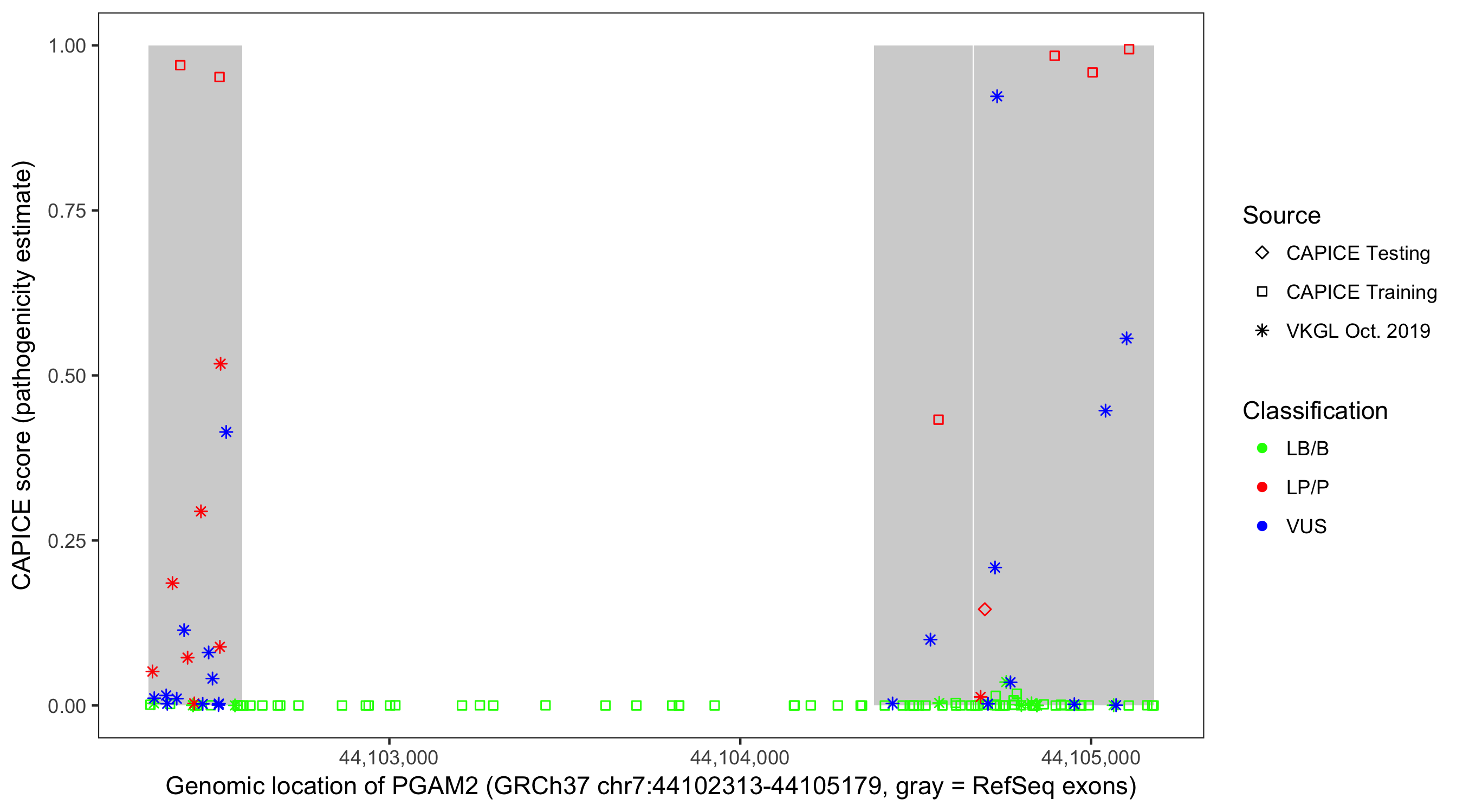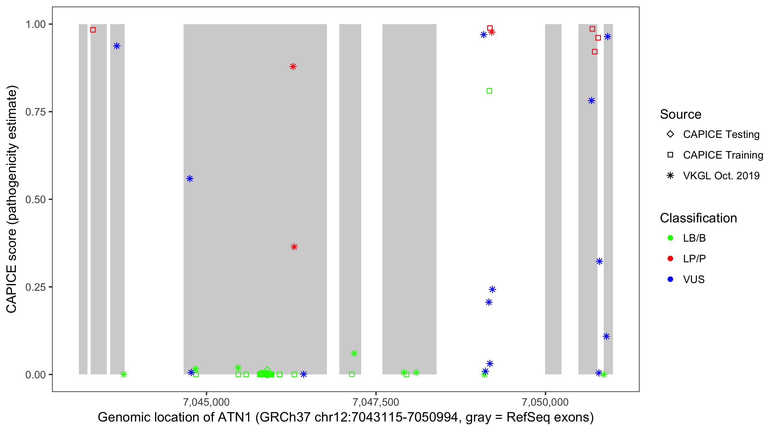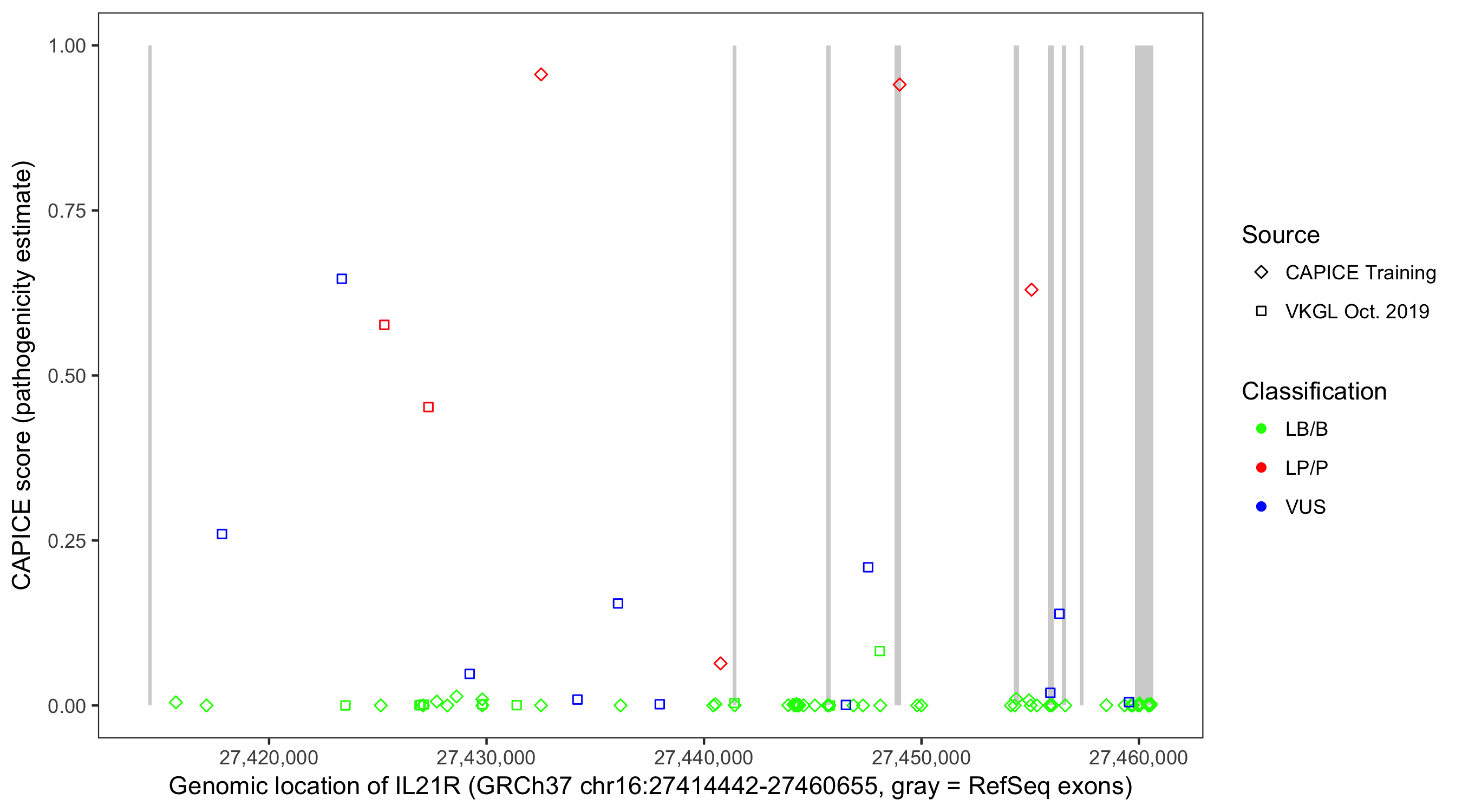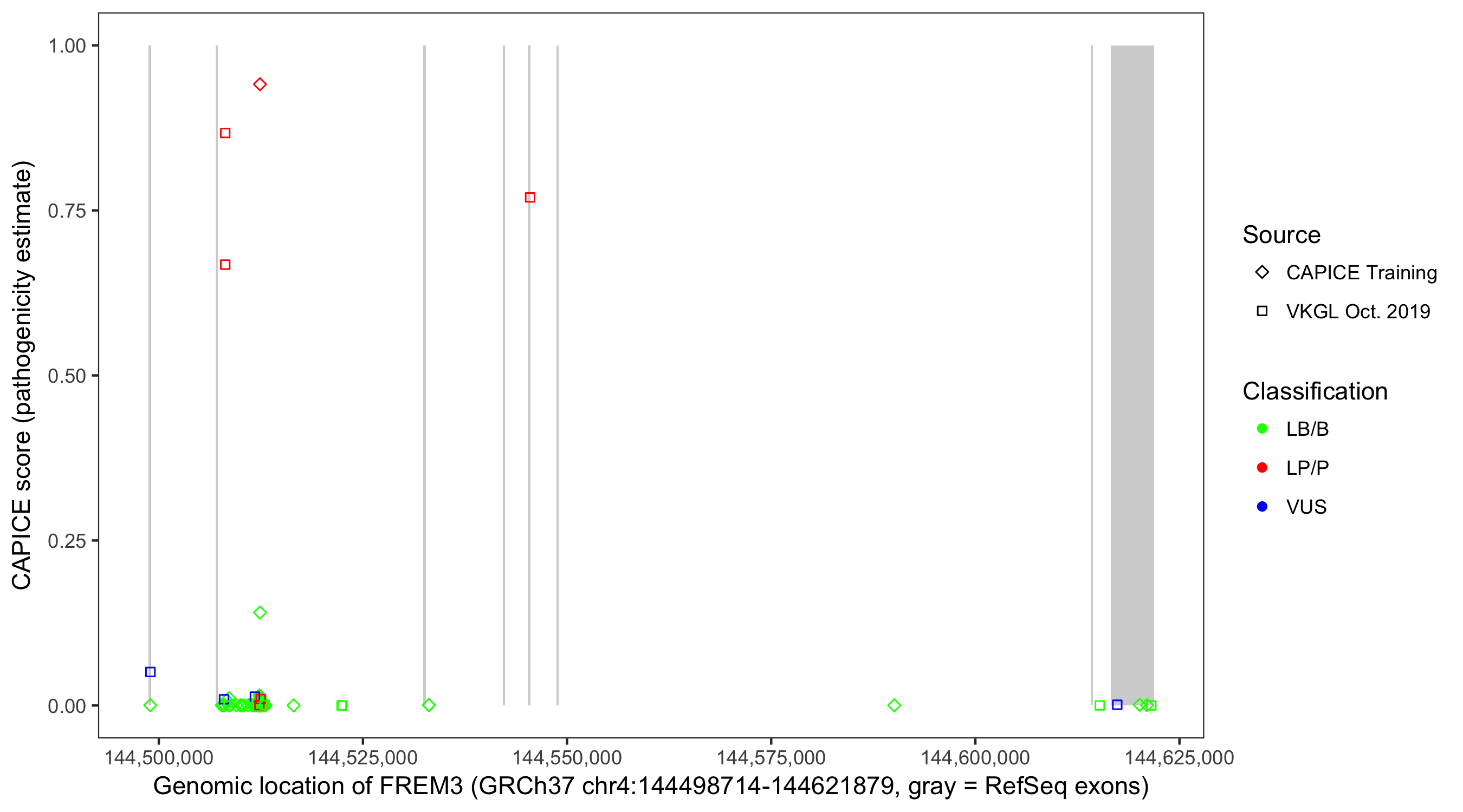 Shown are CAPICE train/test variants plus VKGL Oct 2019.