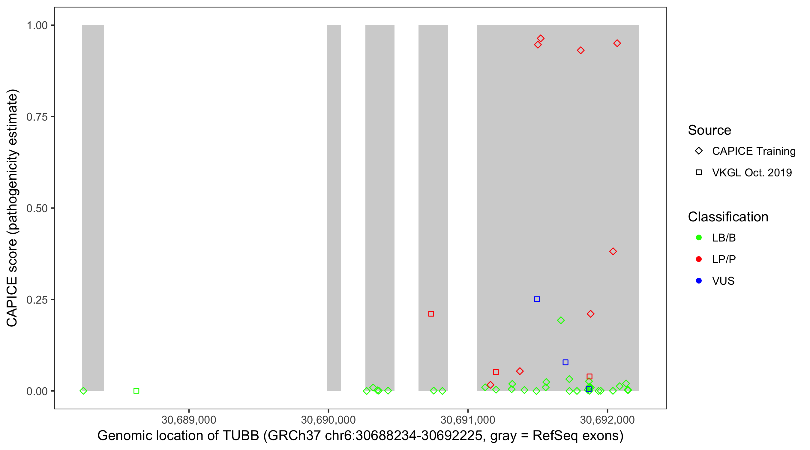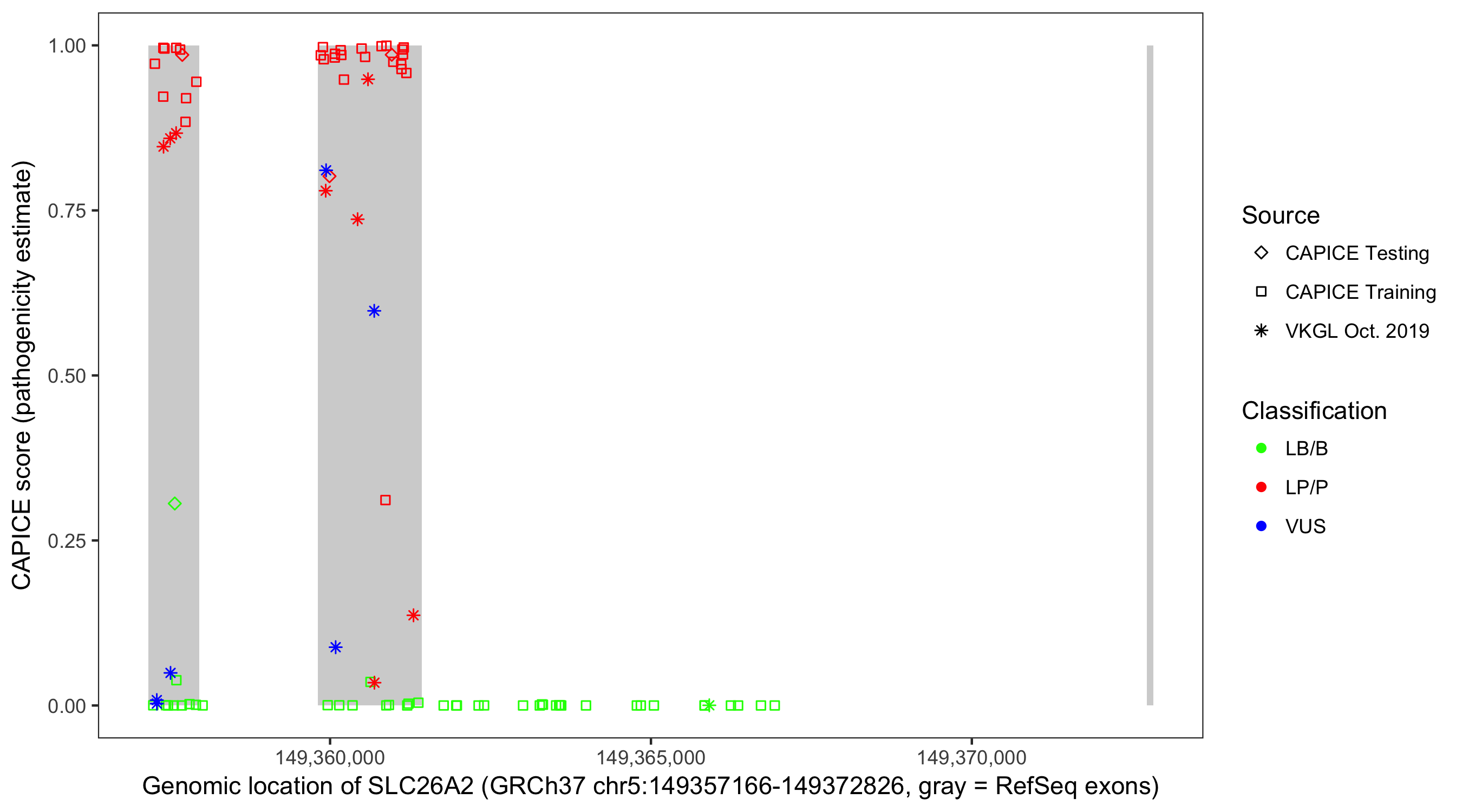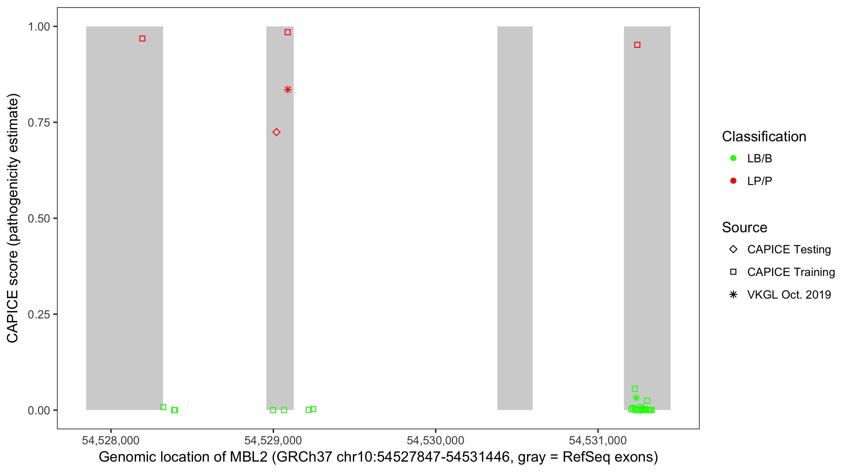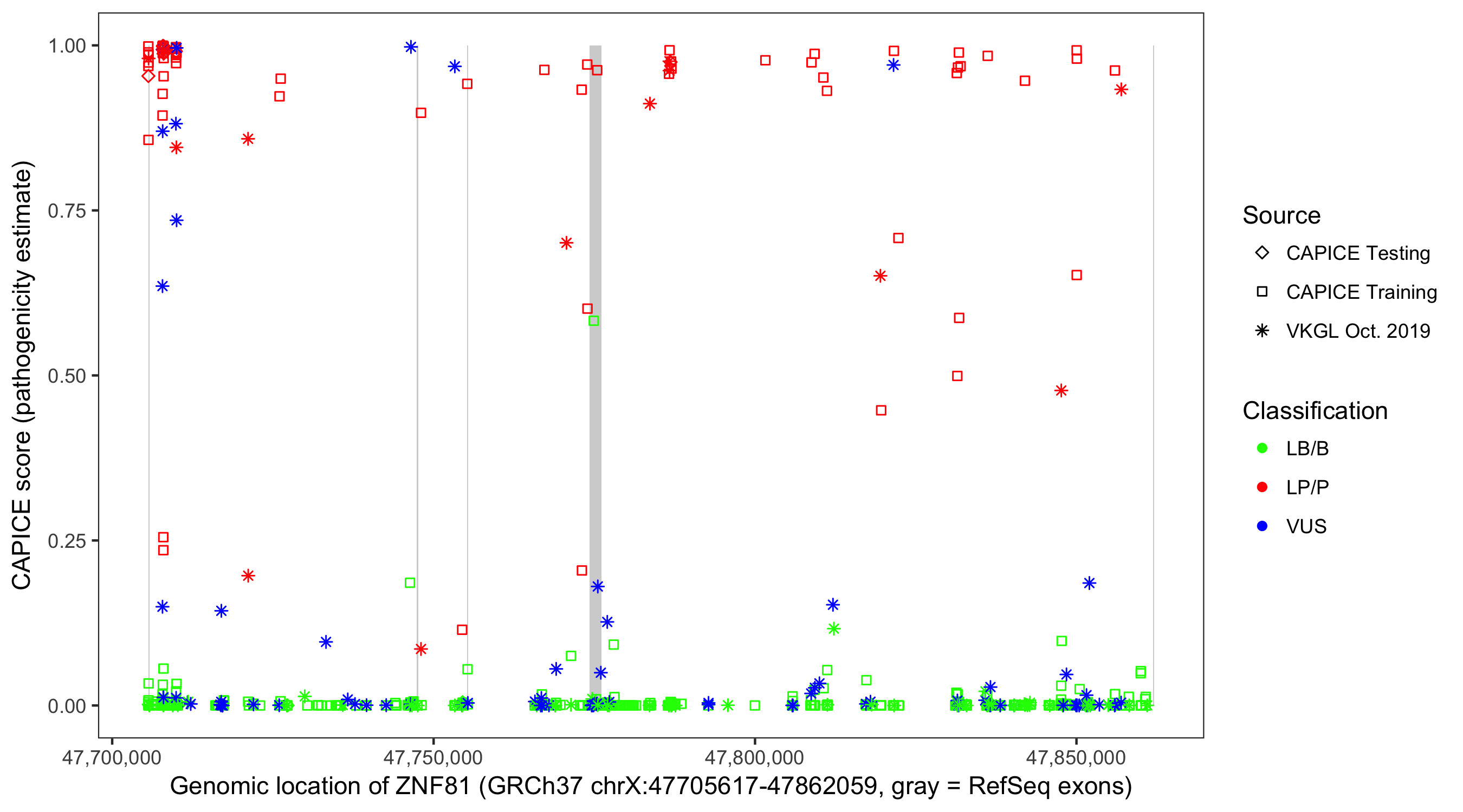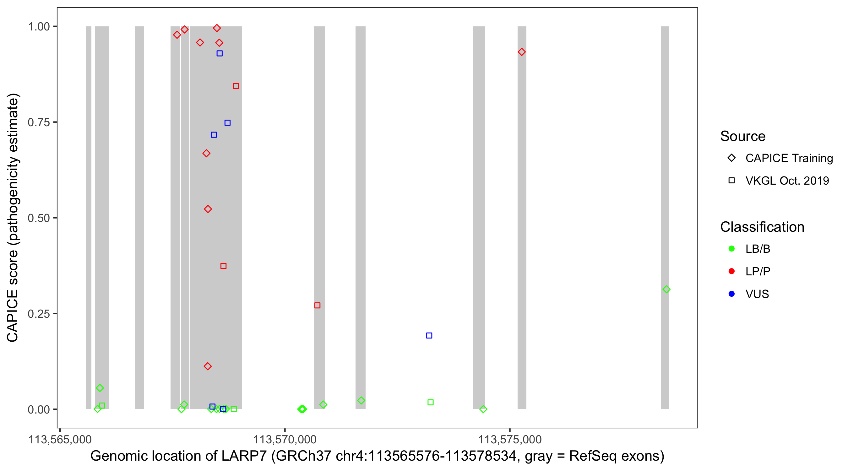 Shown are CAPICE train/test variants plus VKGL Oct 2019.