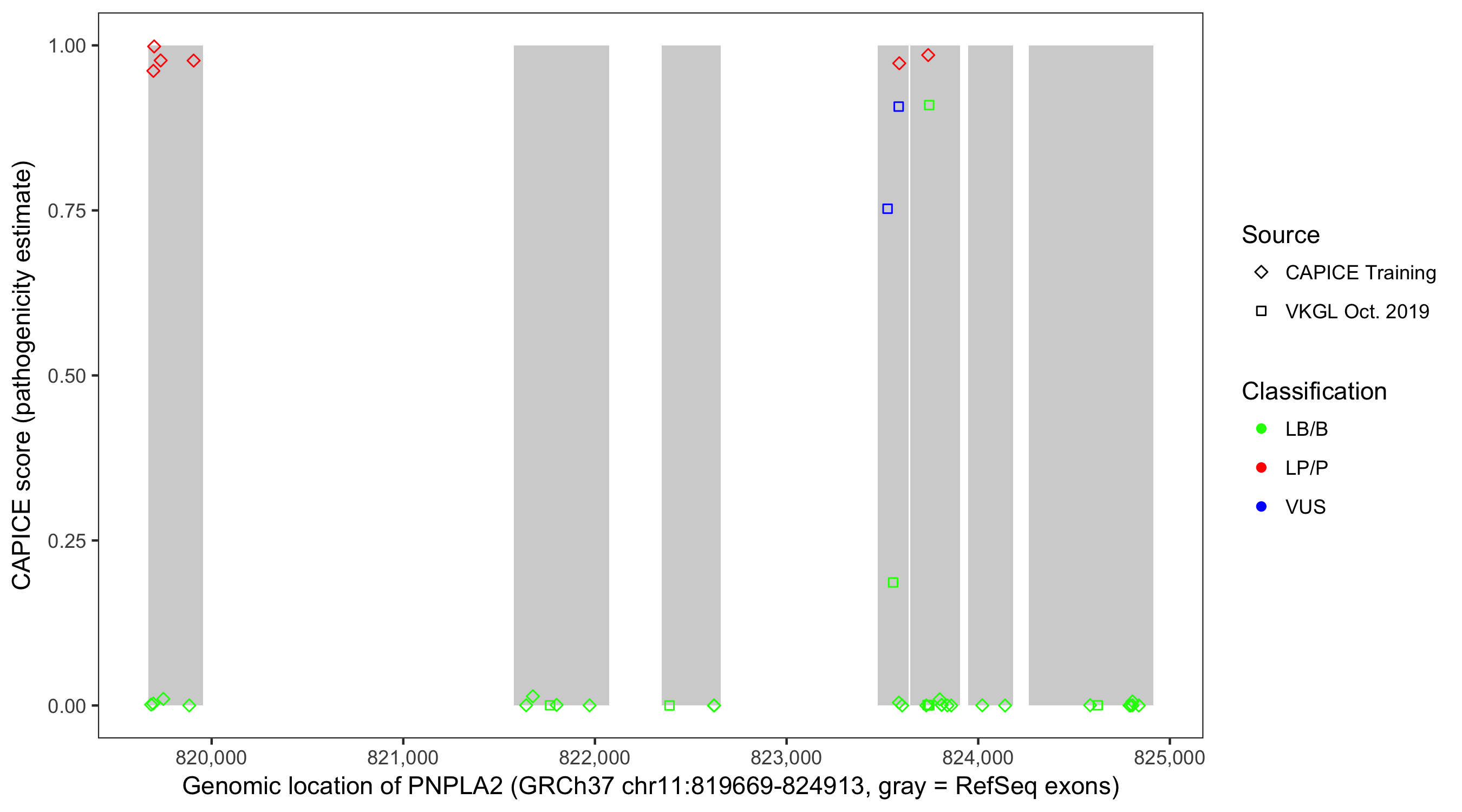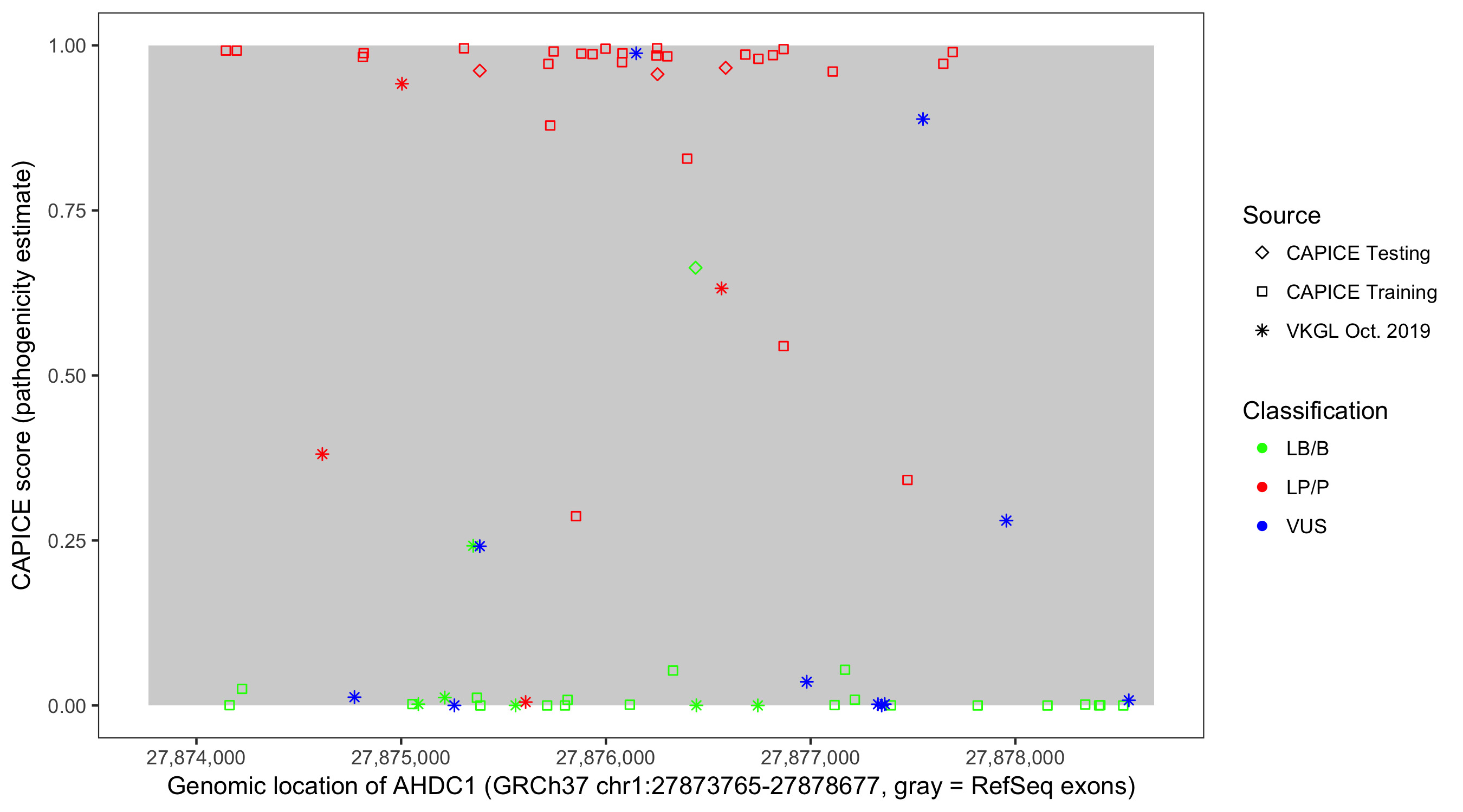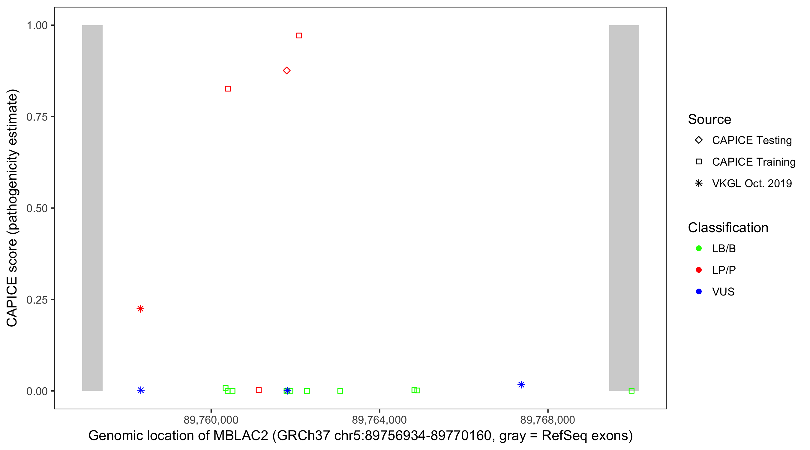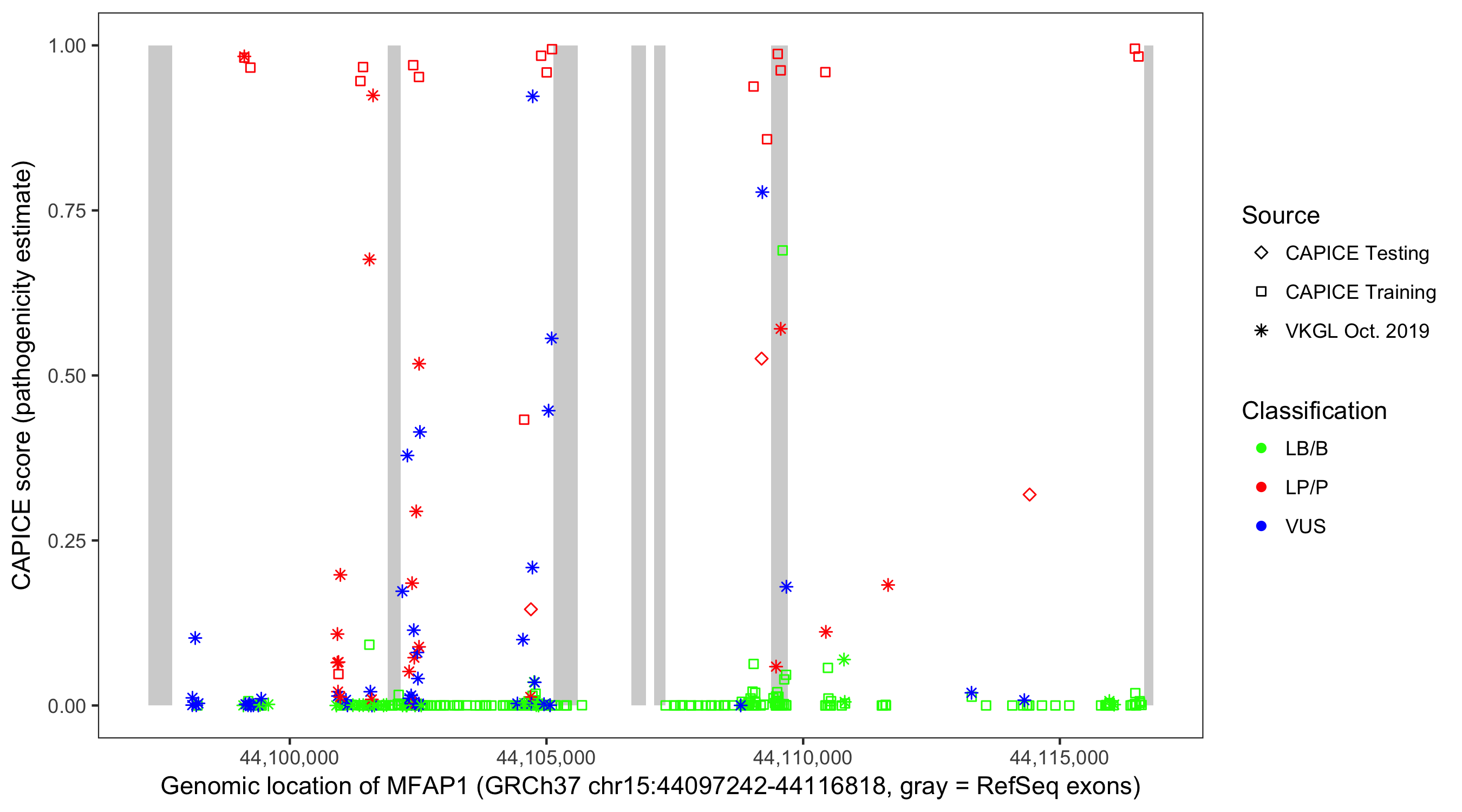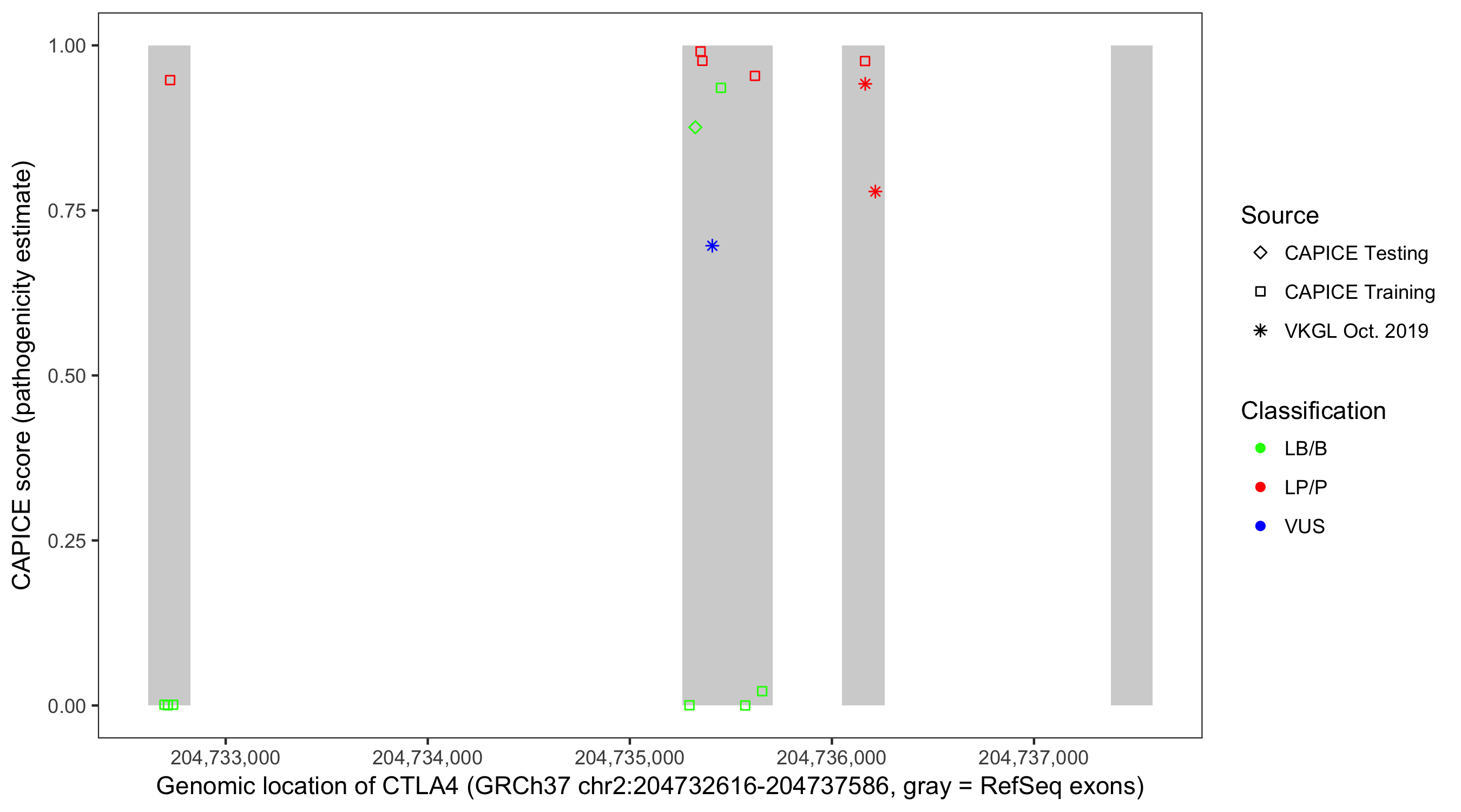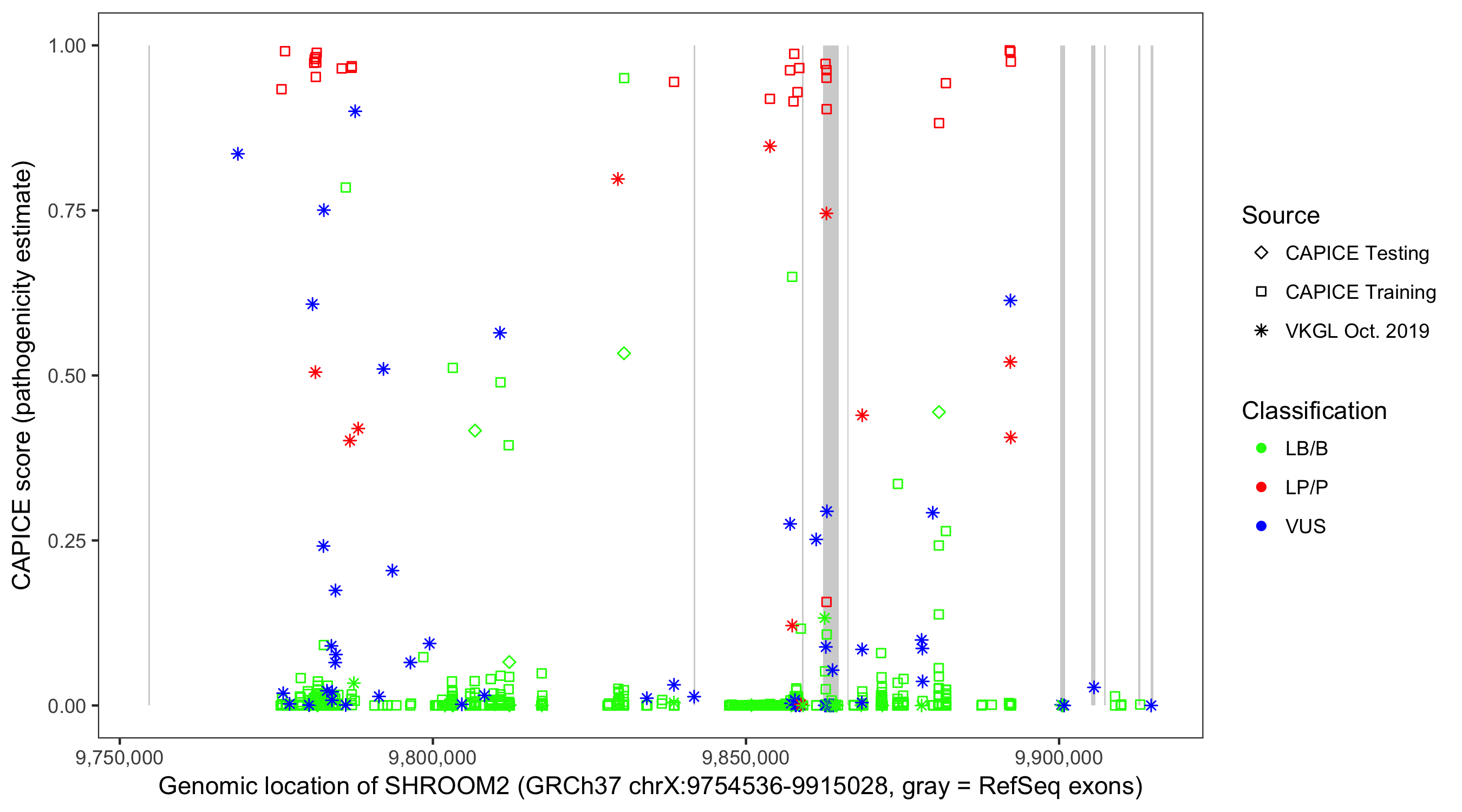 Shown are CAPICE train/test variants plus VKGL Oct 2019.