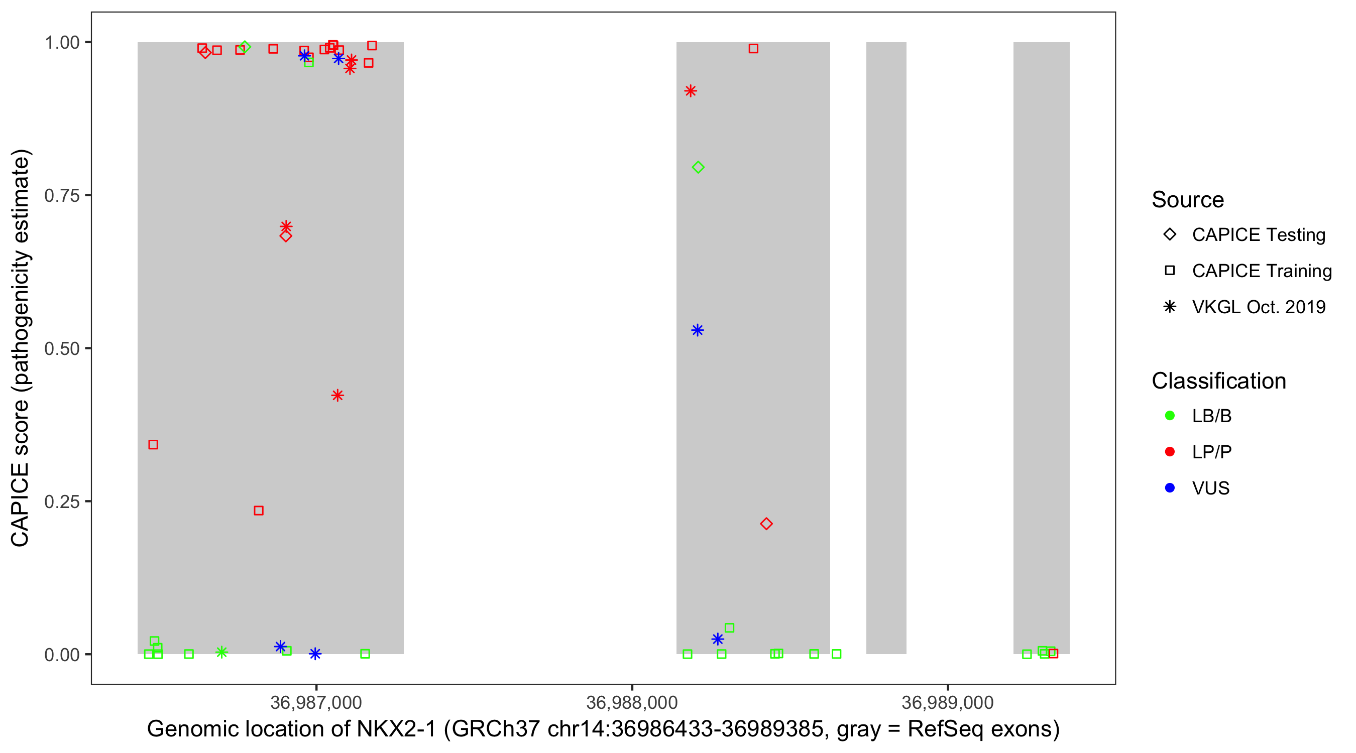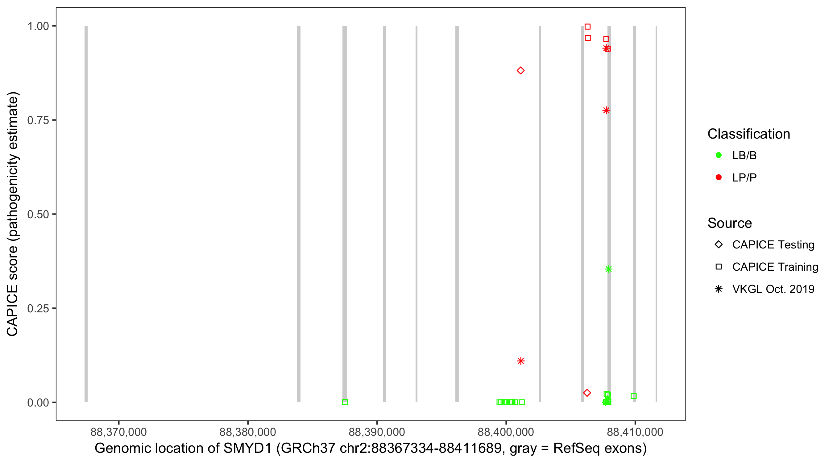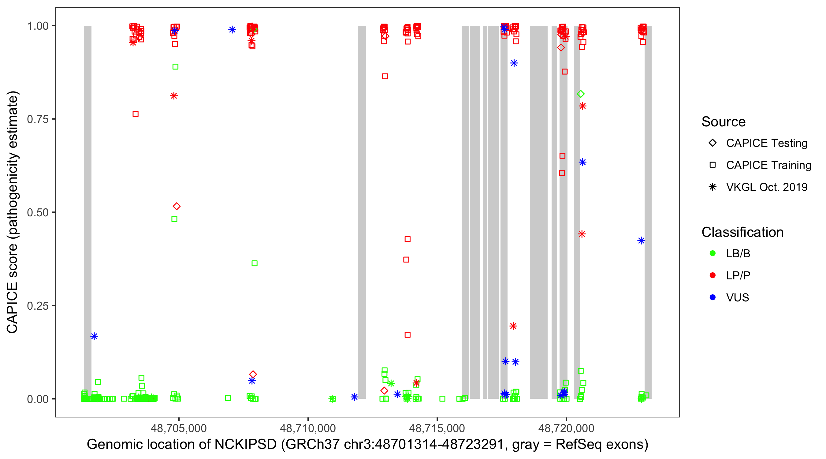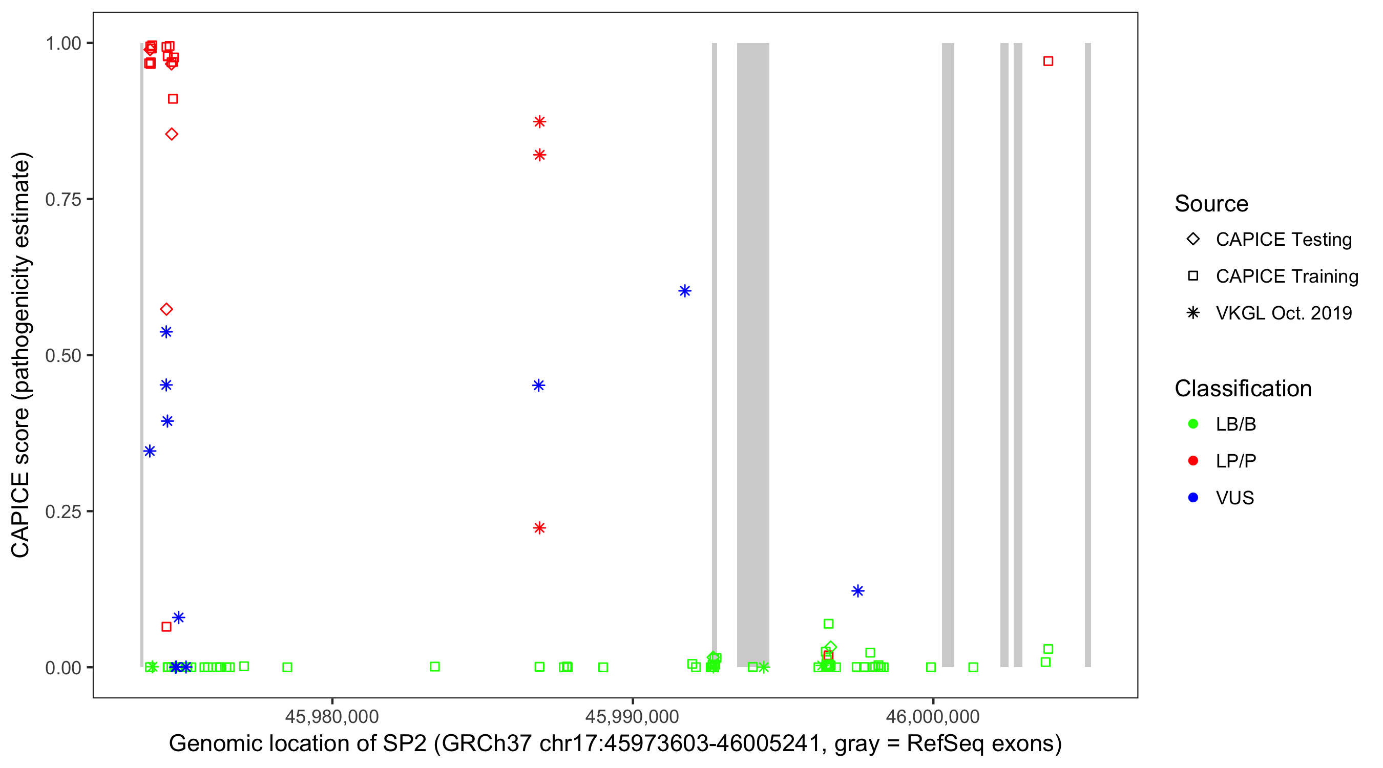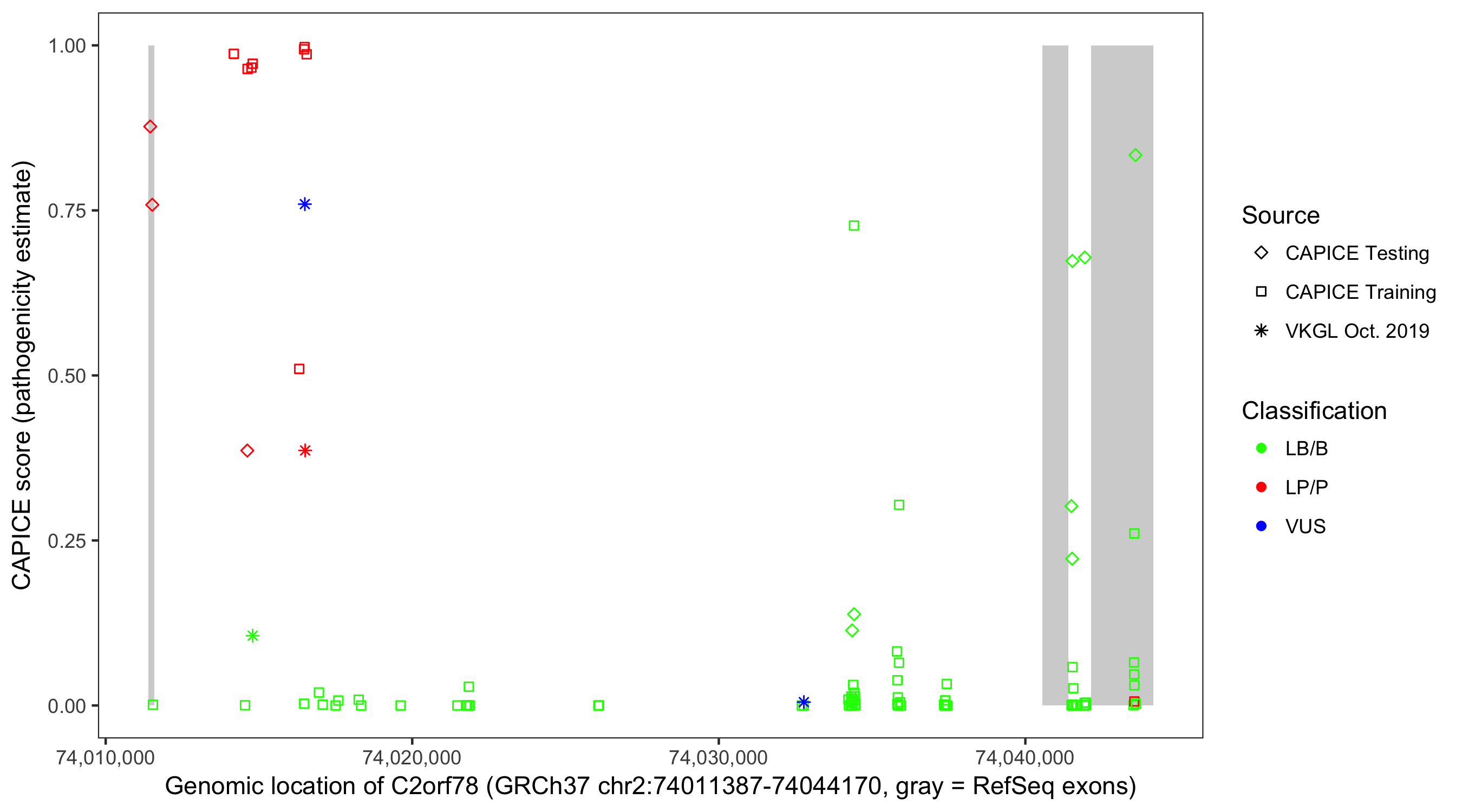 Shown are CAPICE train/test variants plus VKGL Oct 2019.