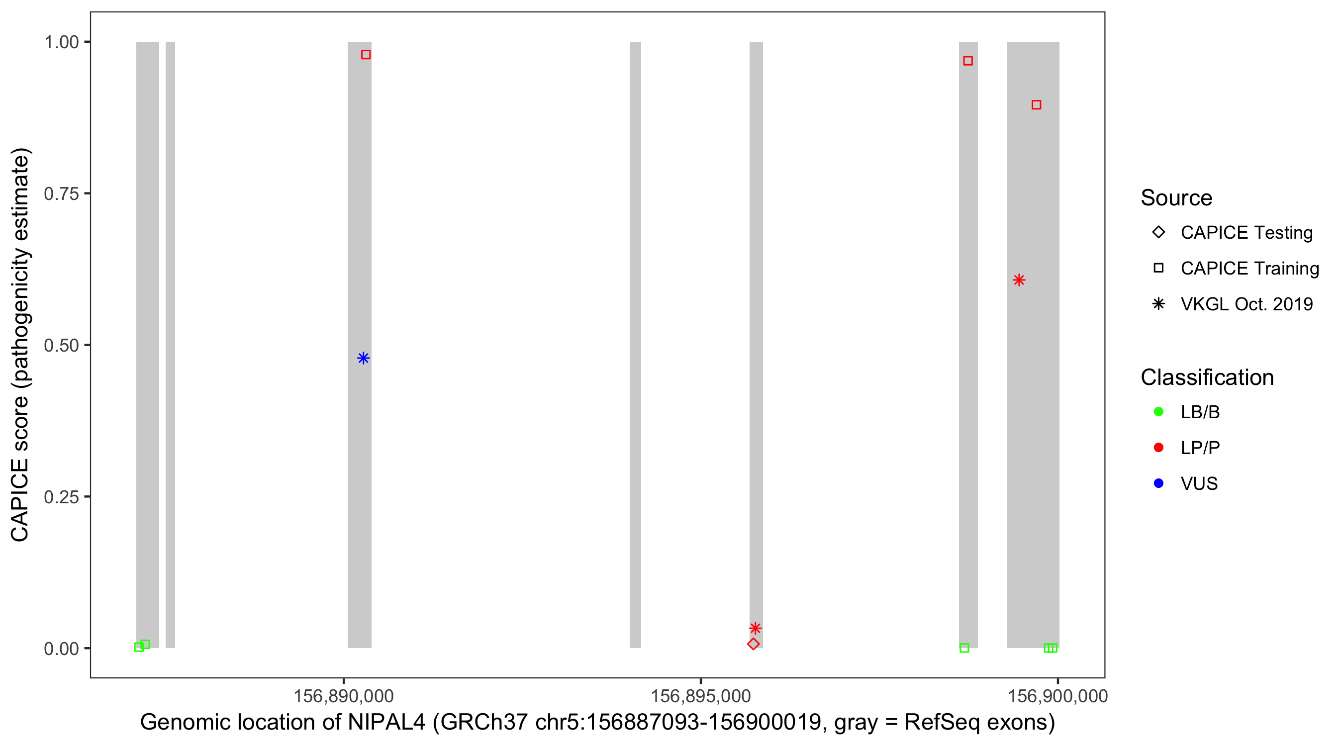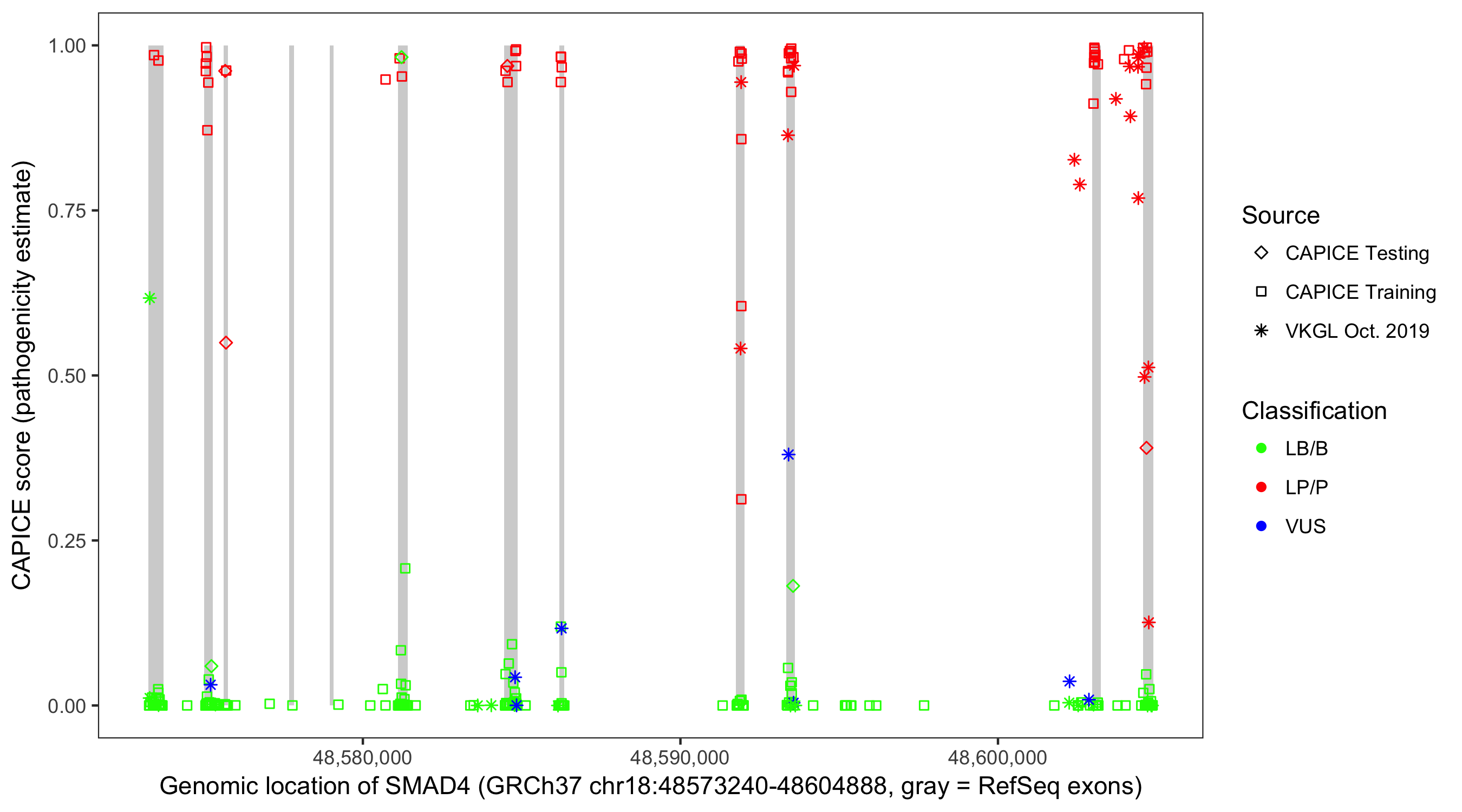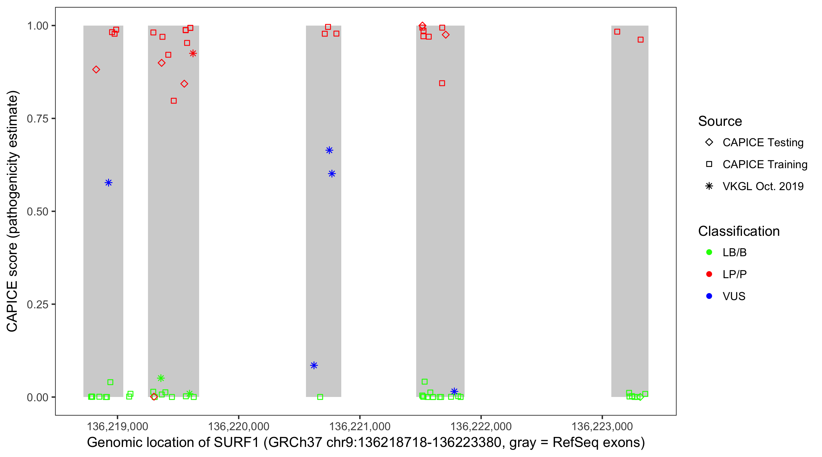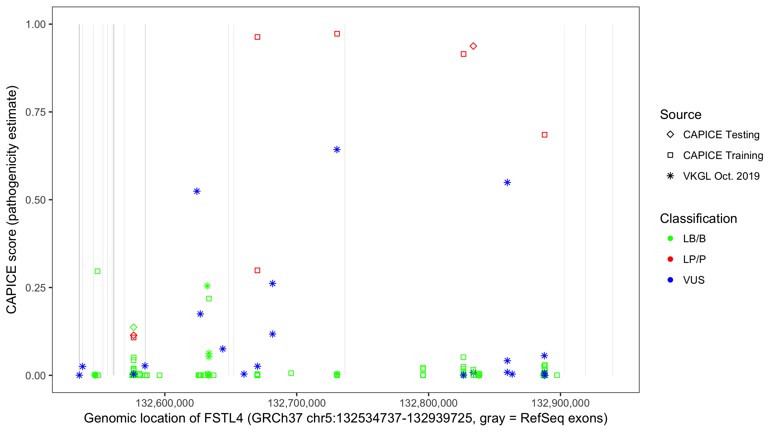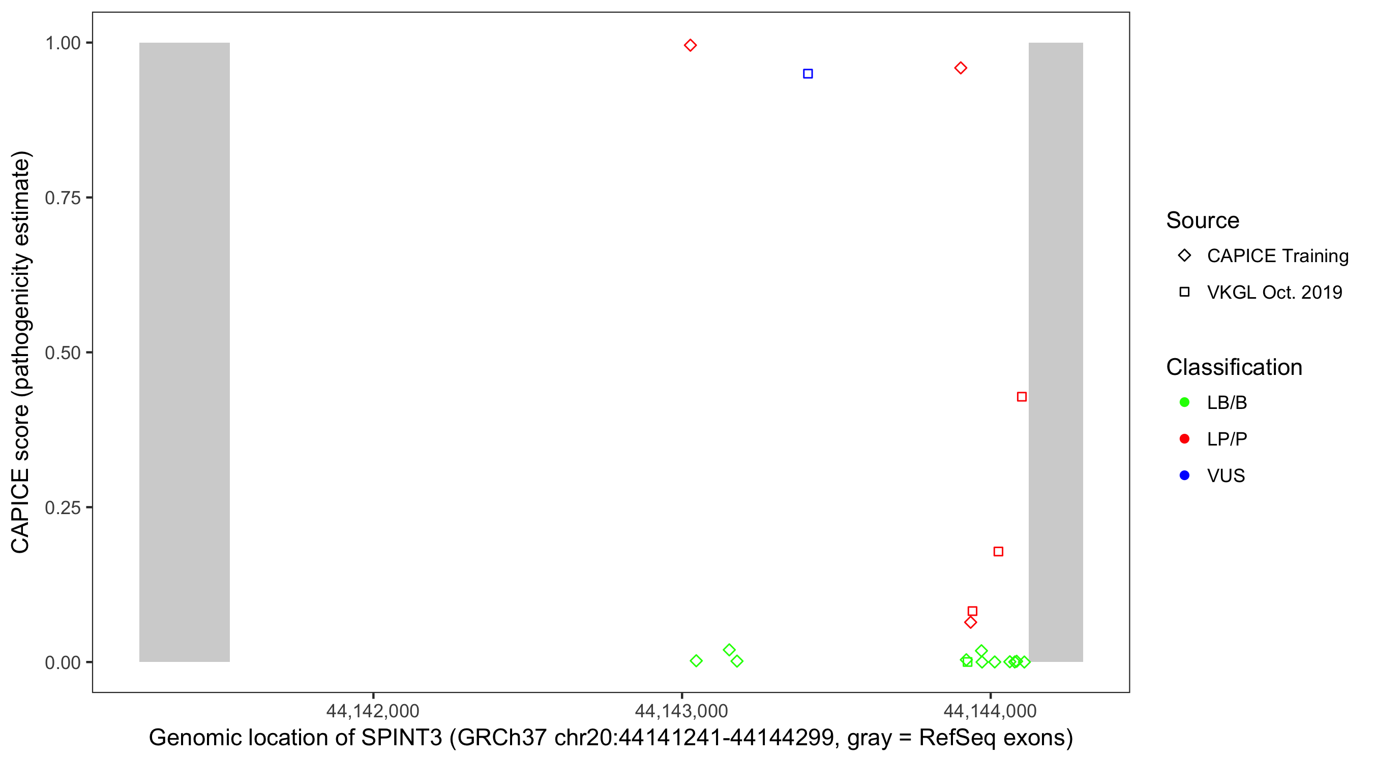 Shown are CAPICE train/test variants plus VKGL Oct 2019.