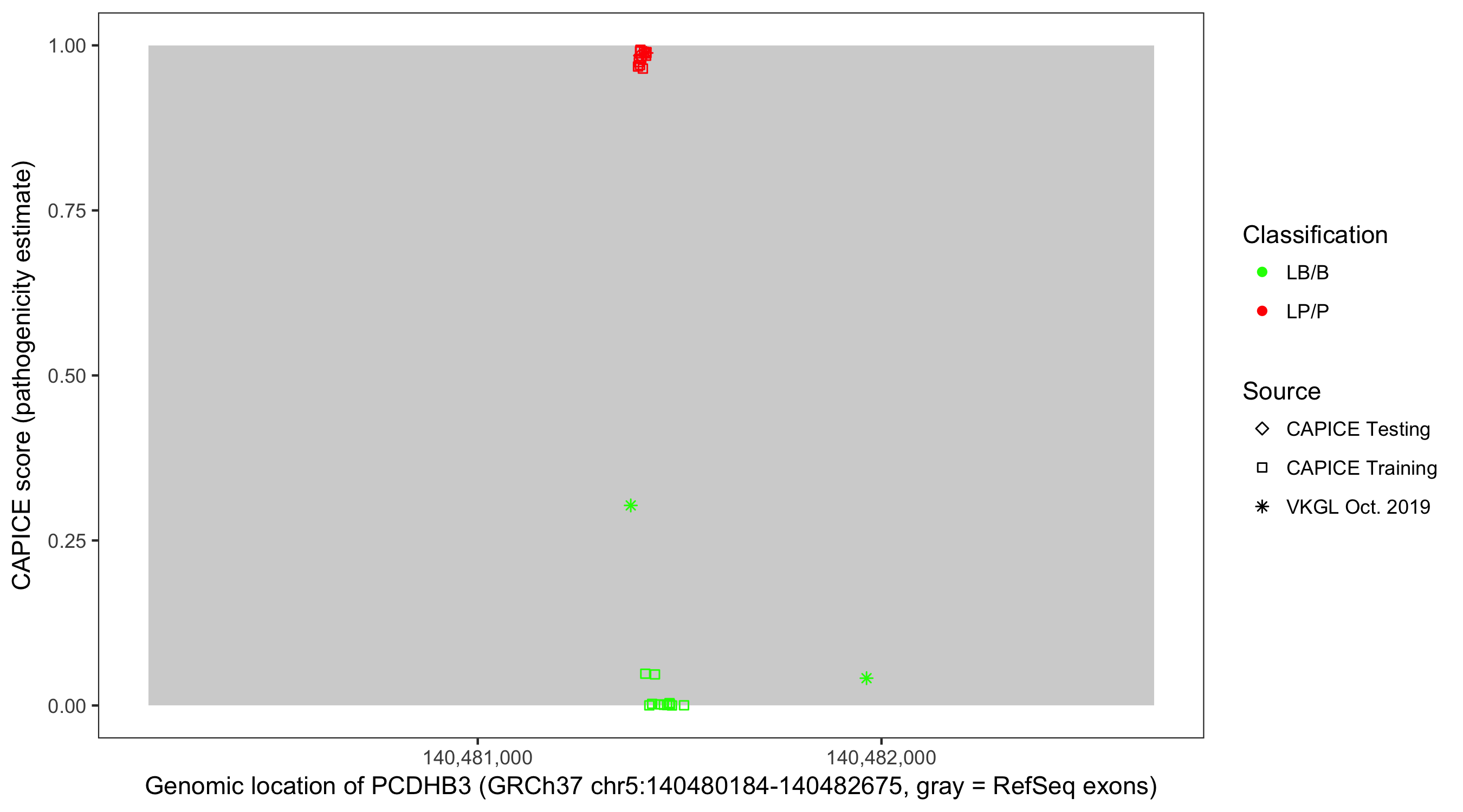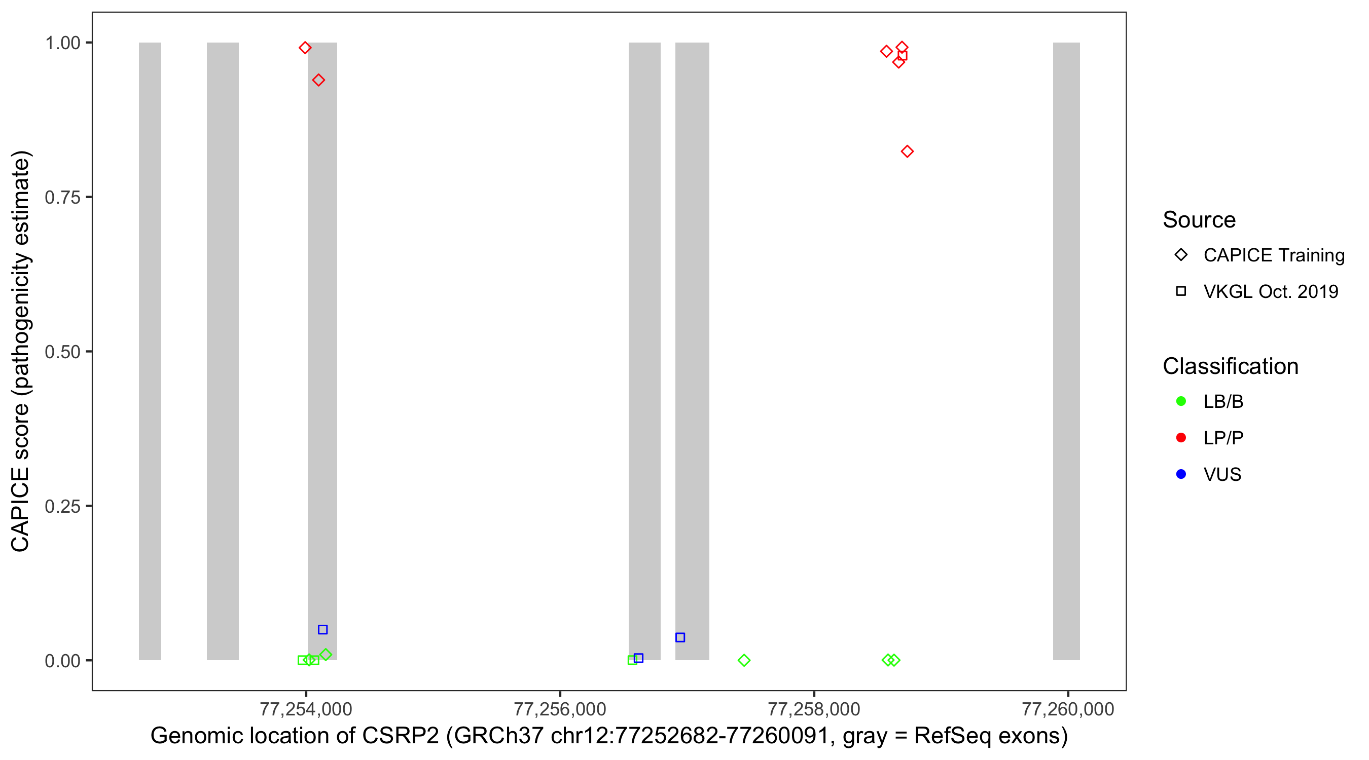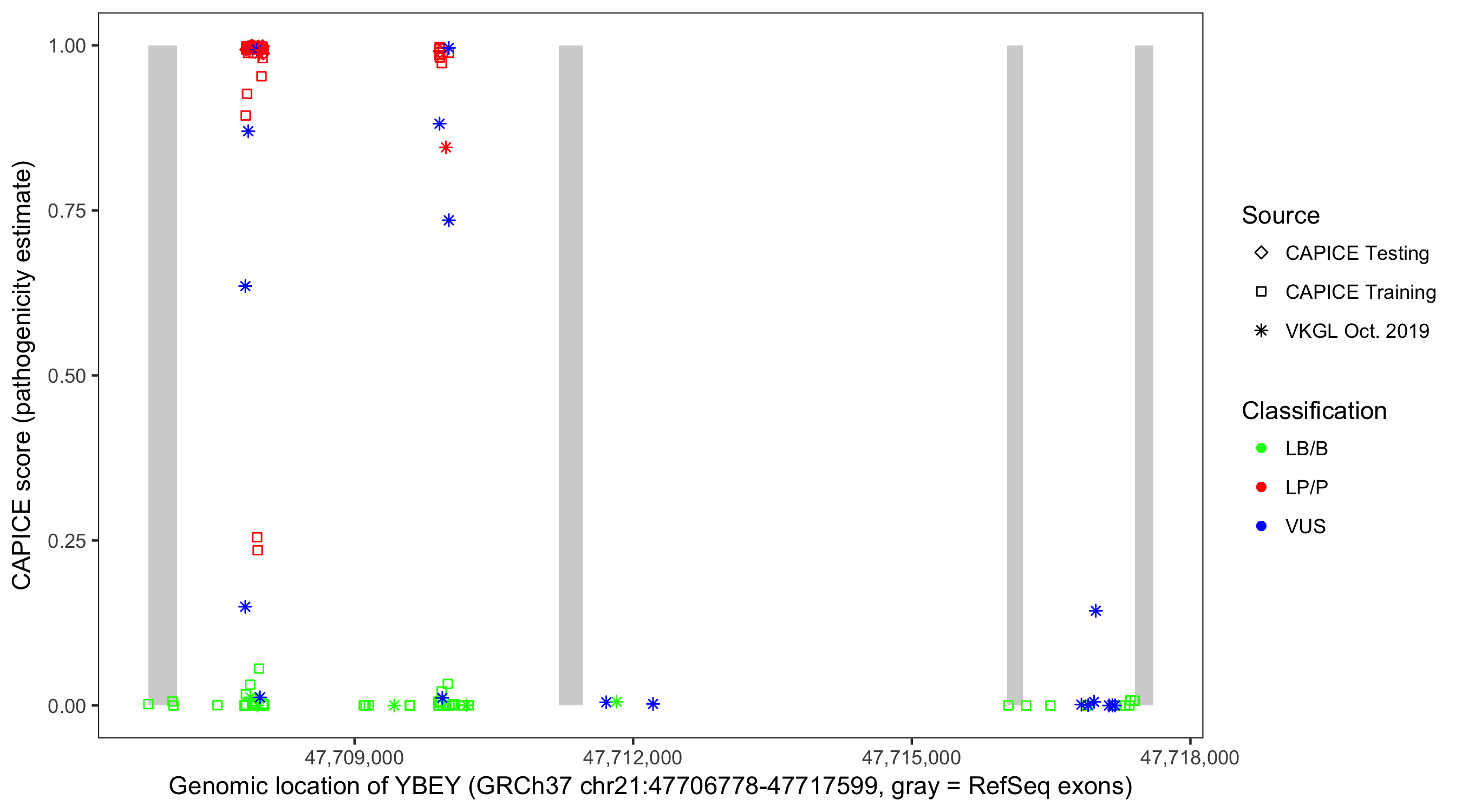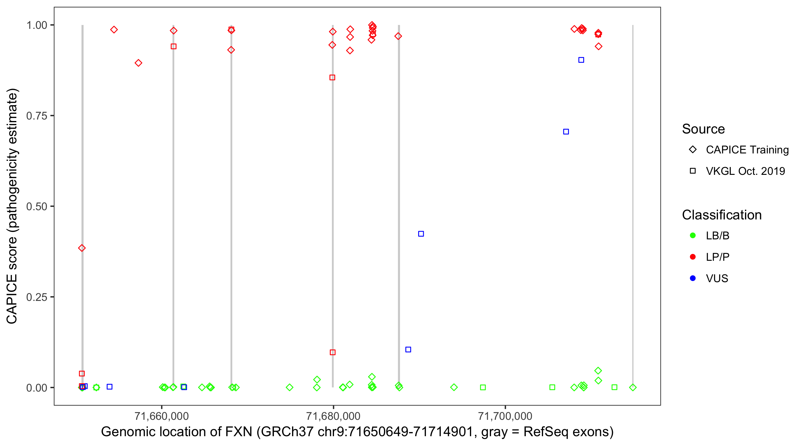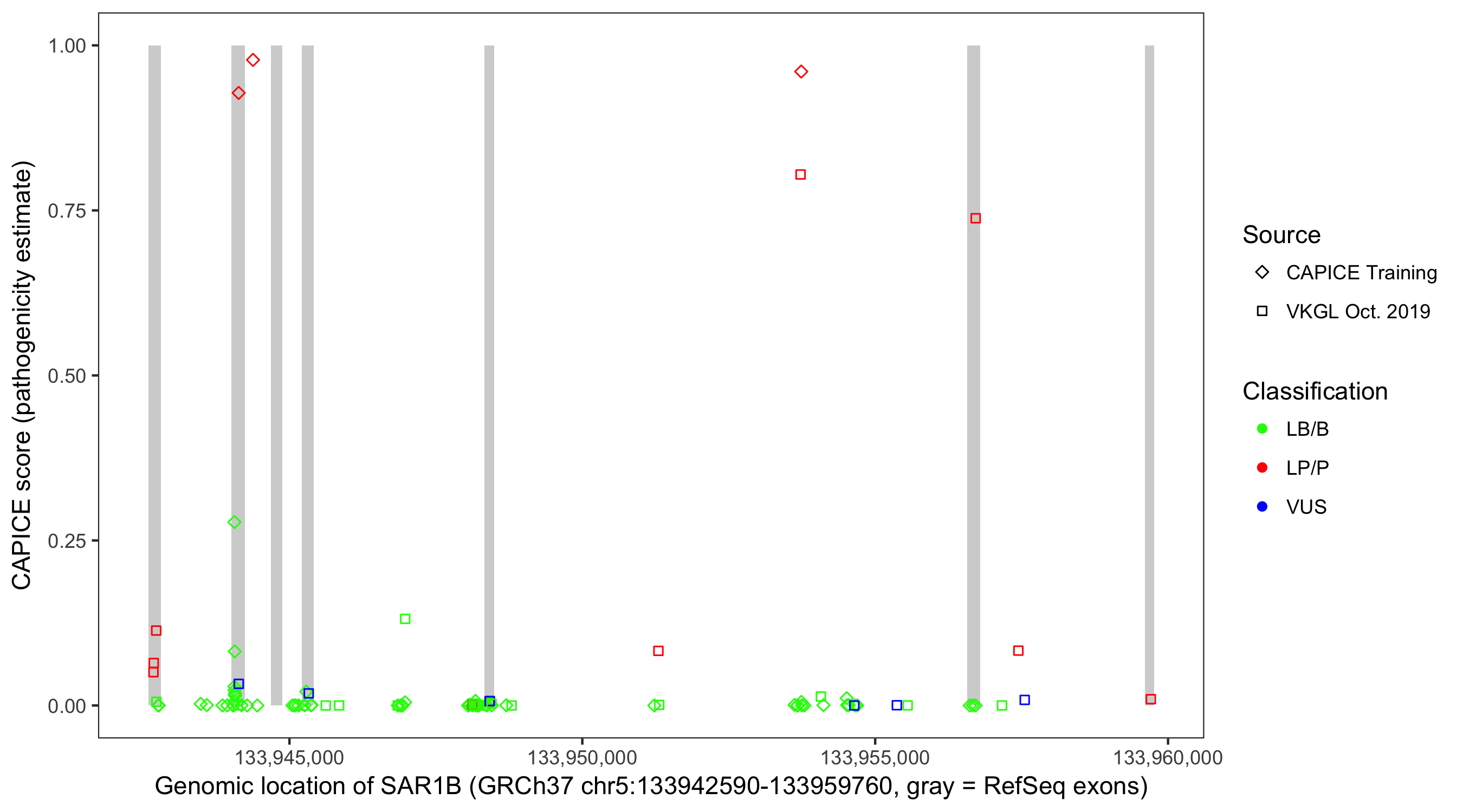 Shown are CAPICE train/test variants plus VKGL Oct 2019.