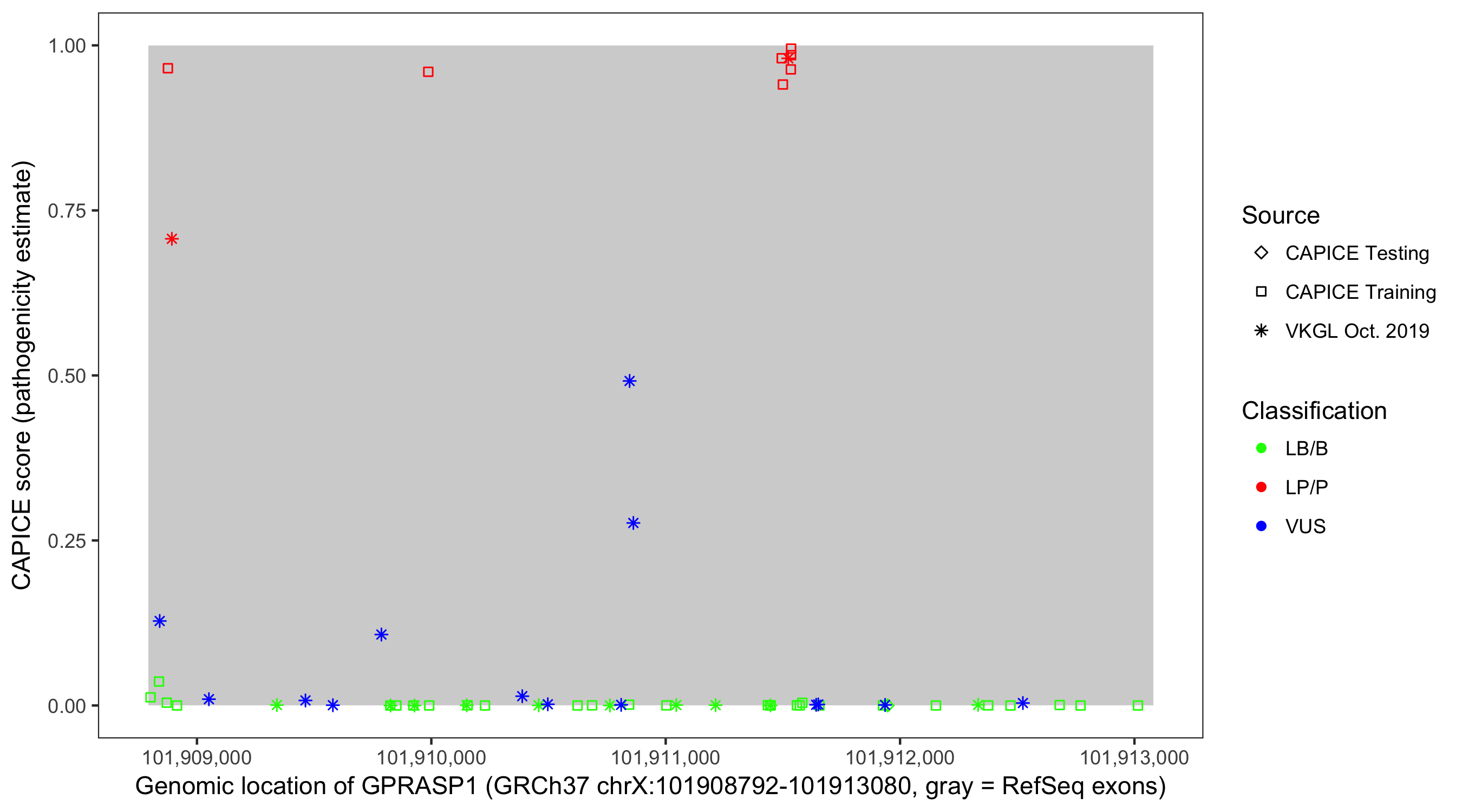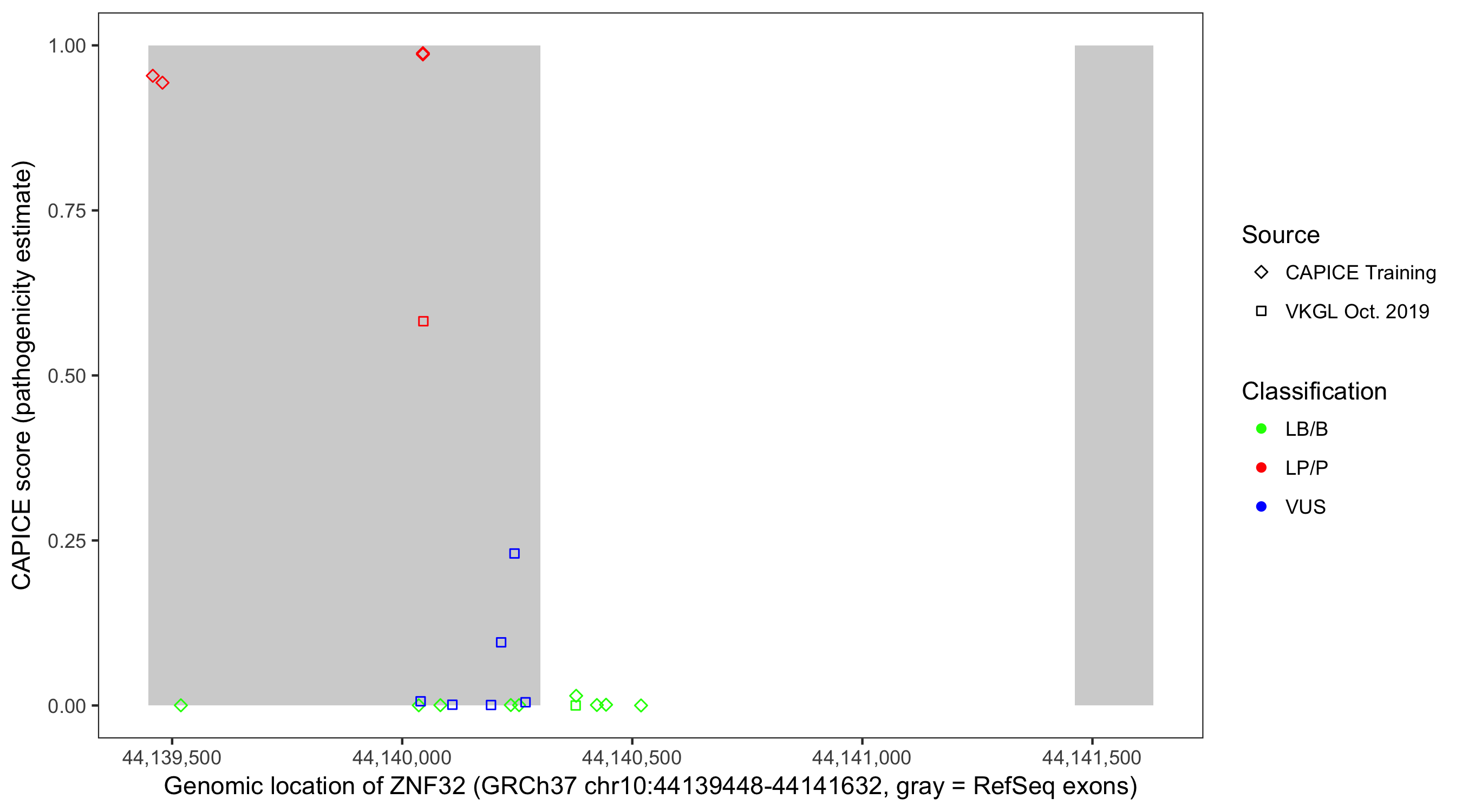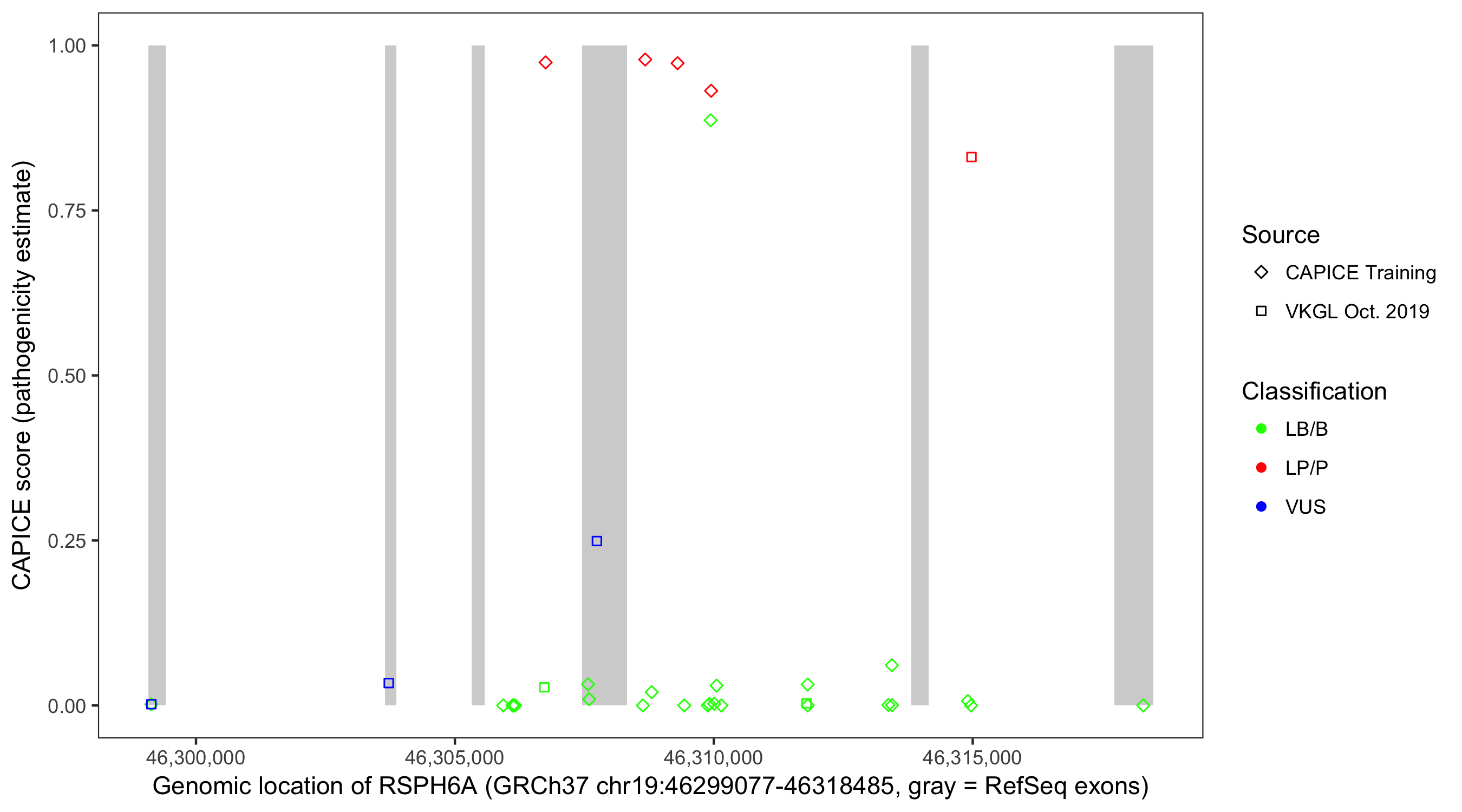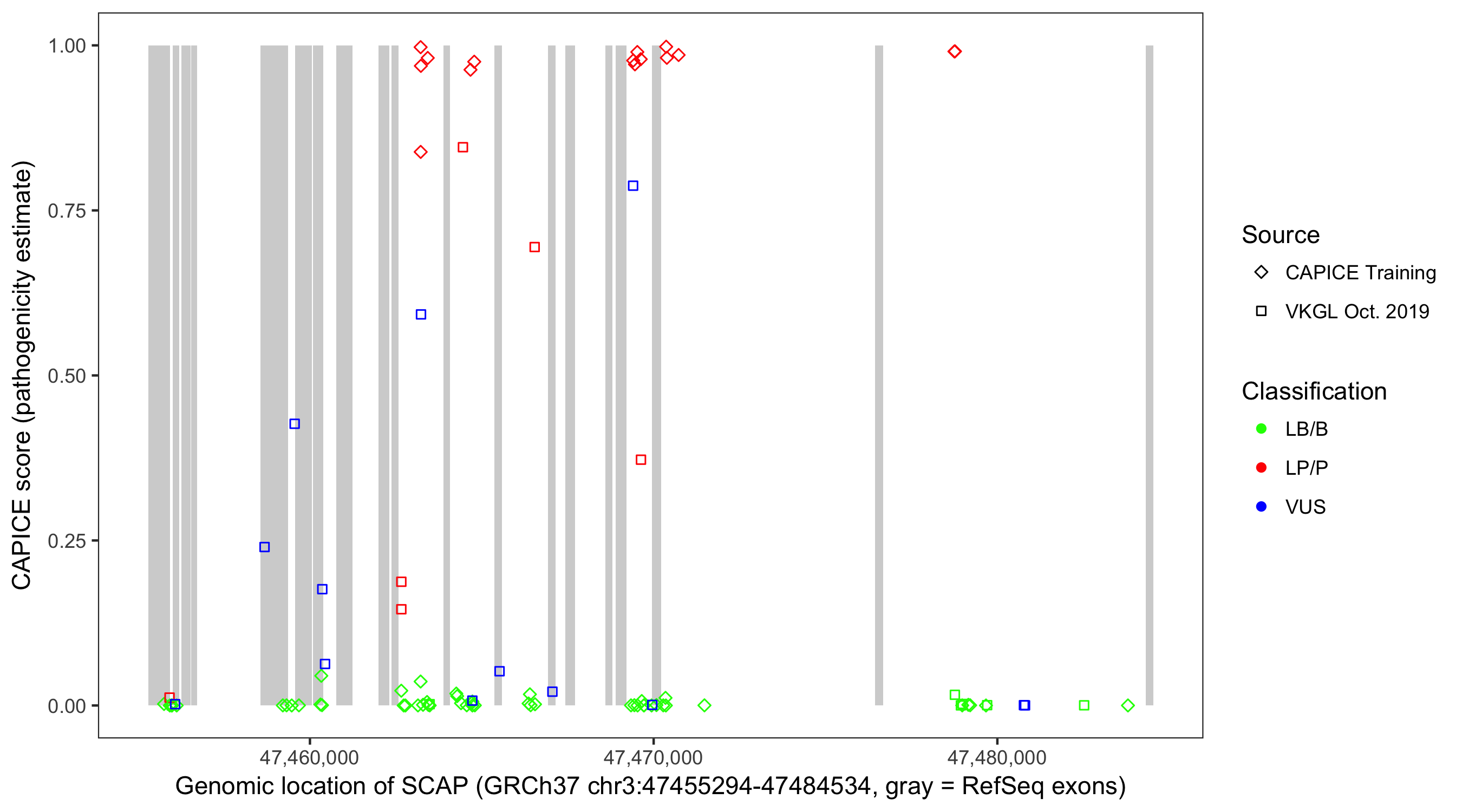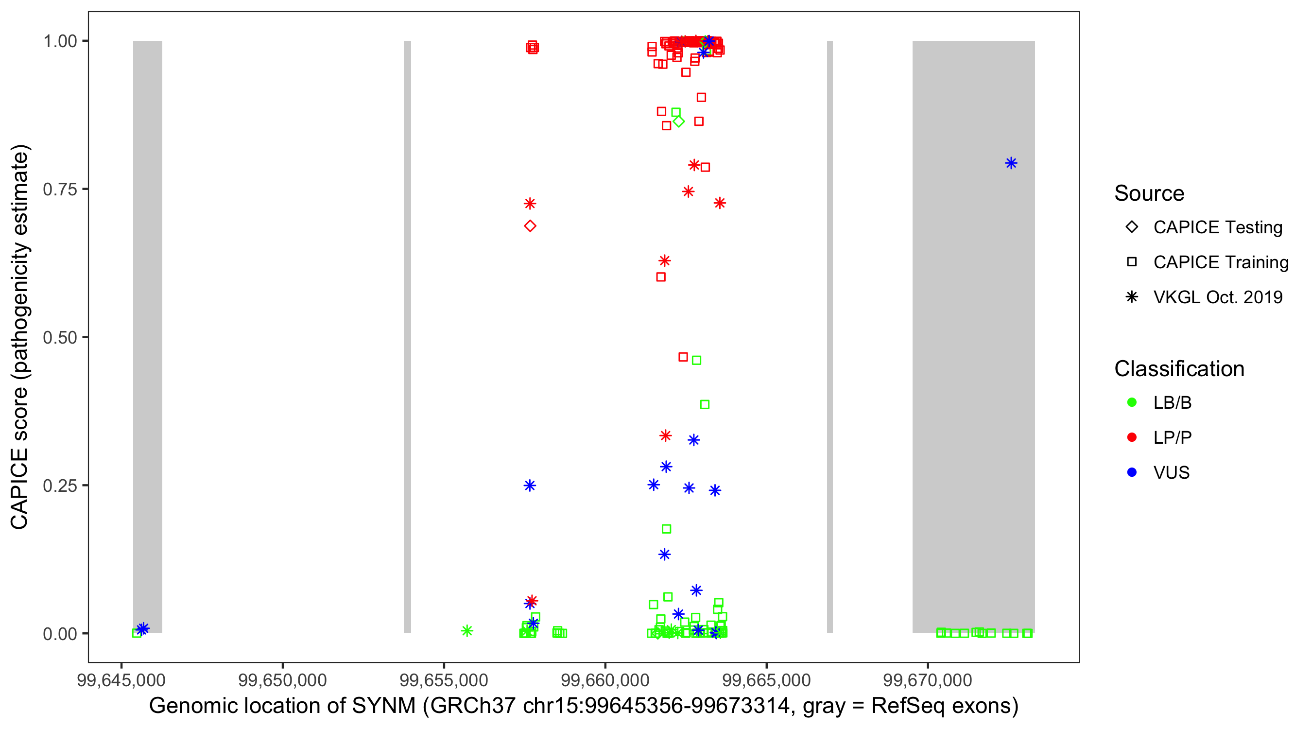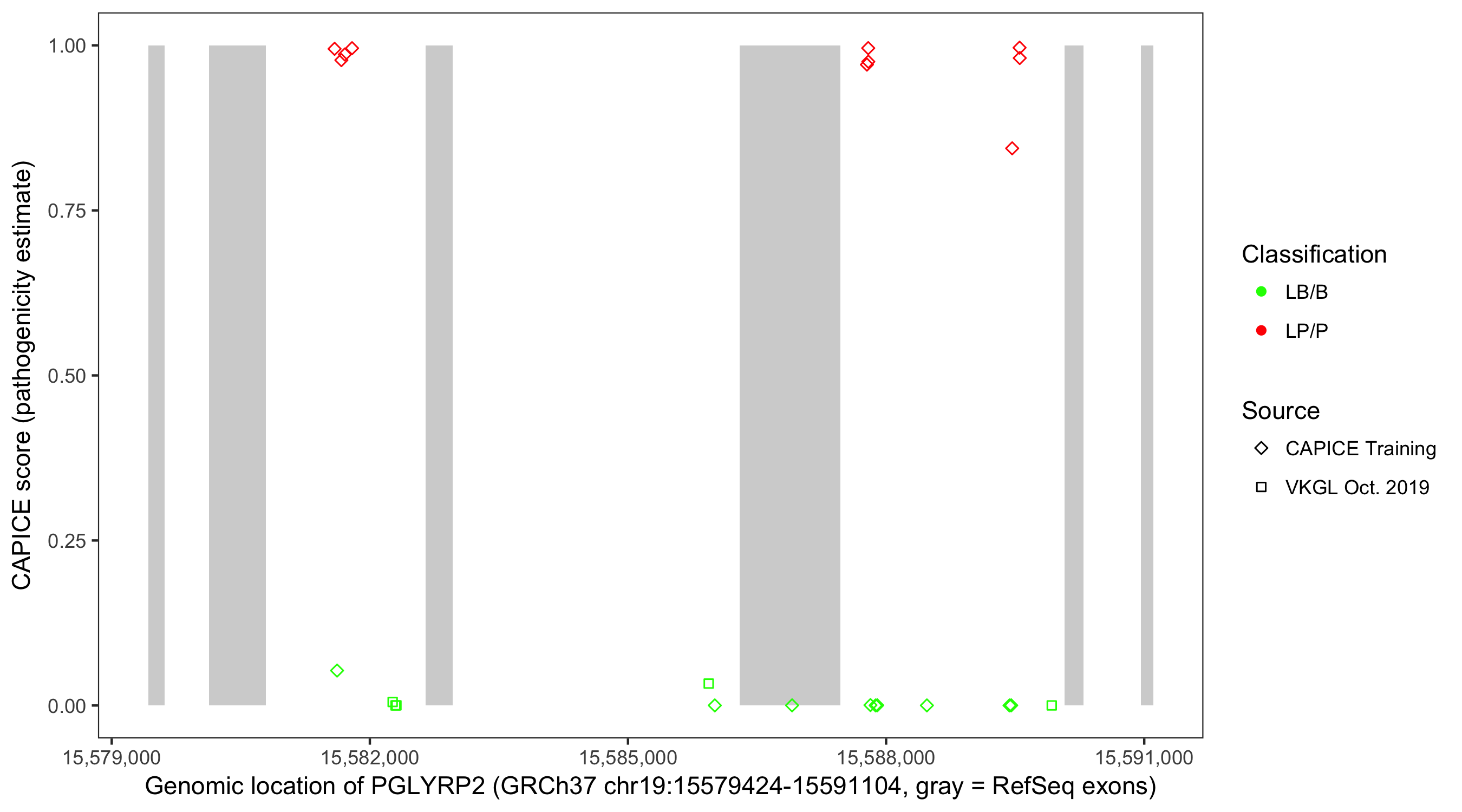 Shown are CAPICE train/test variants plus VKGL Oct 2019.