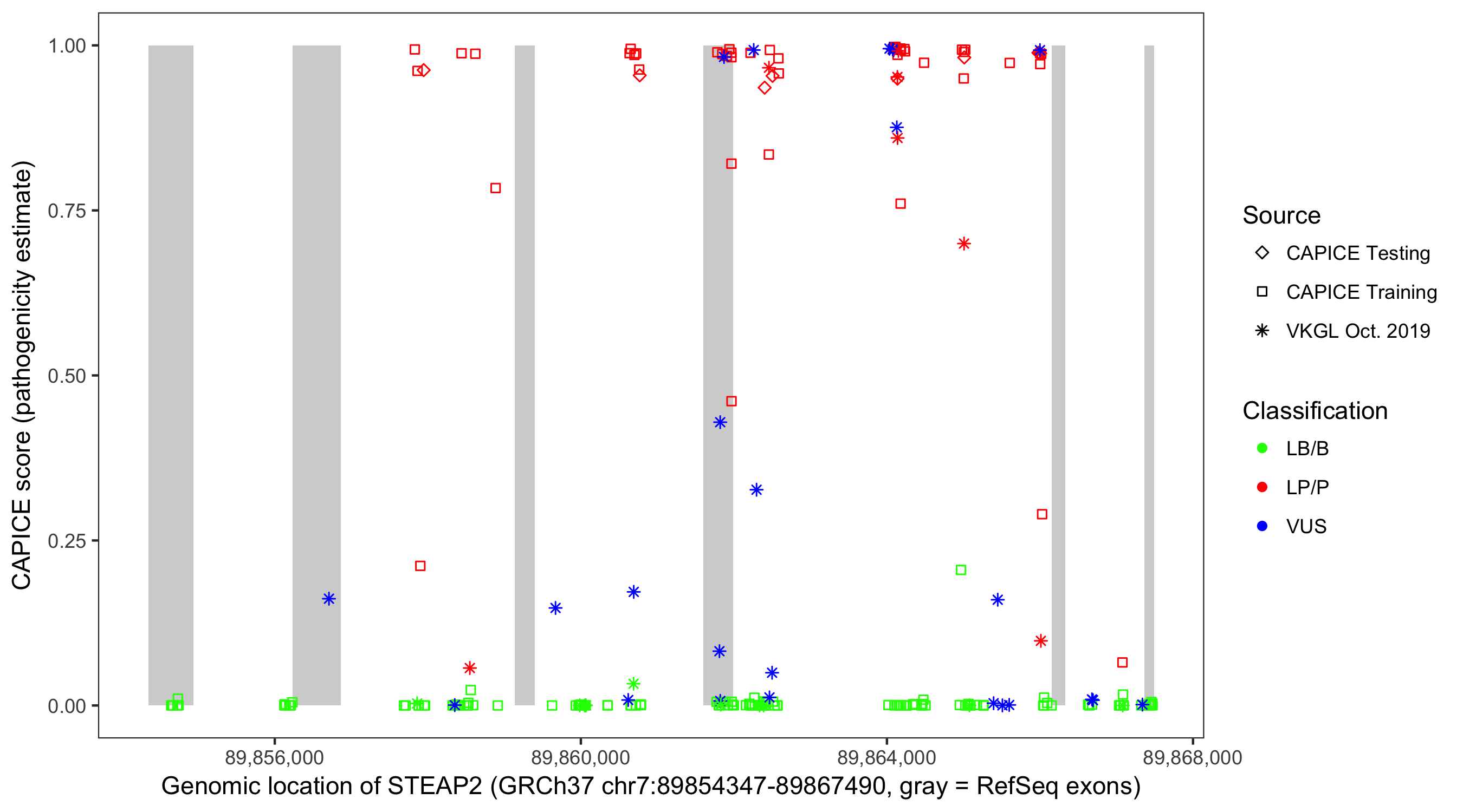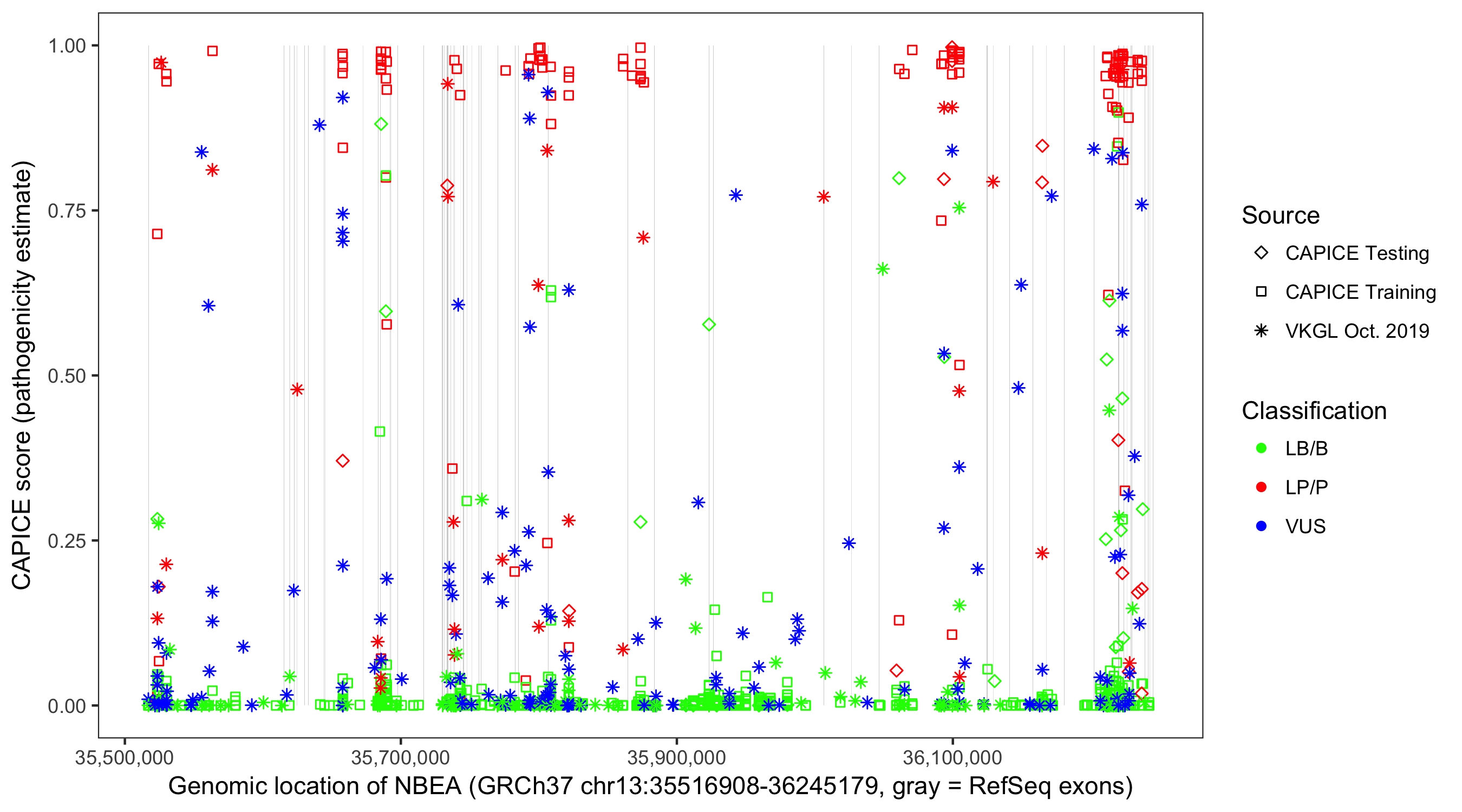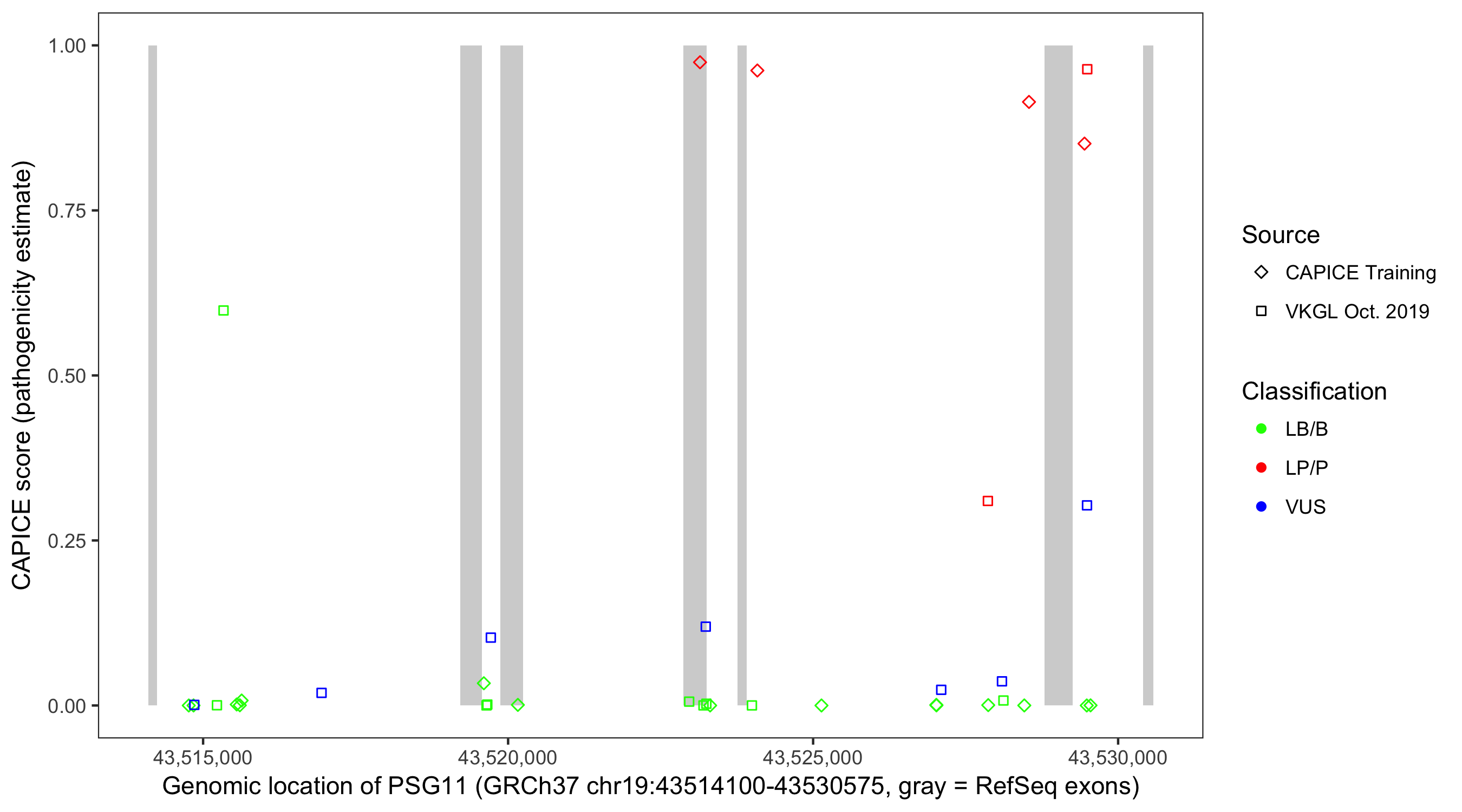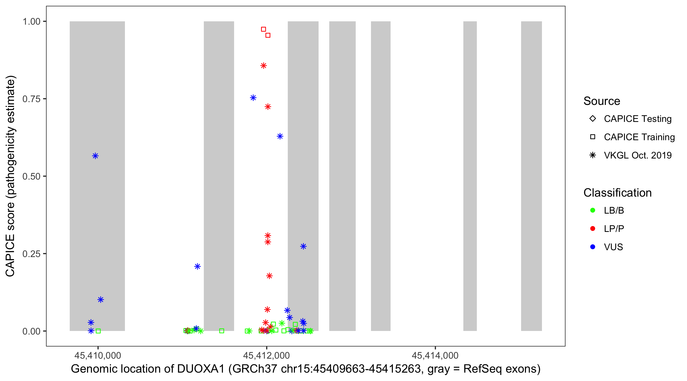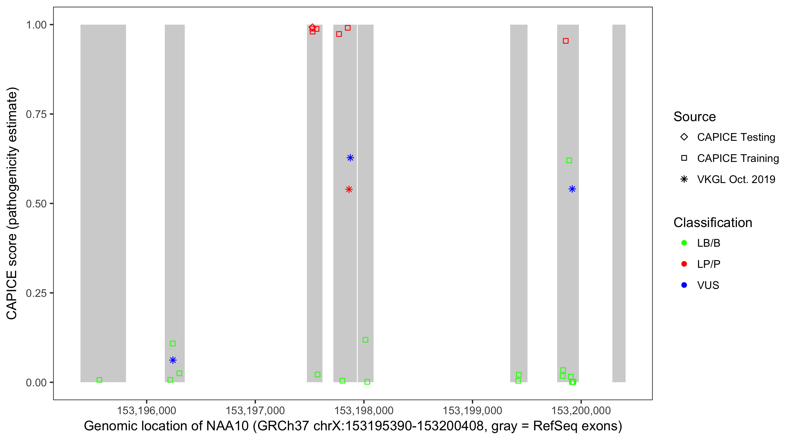 Shown are CAPICE train/test variants plus VKGL Oct 2019.