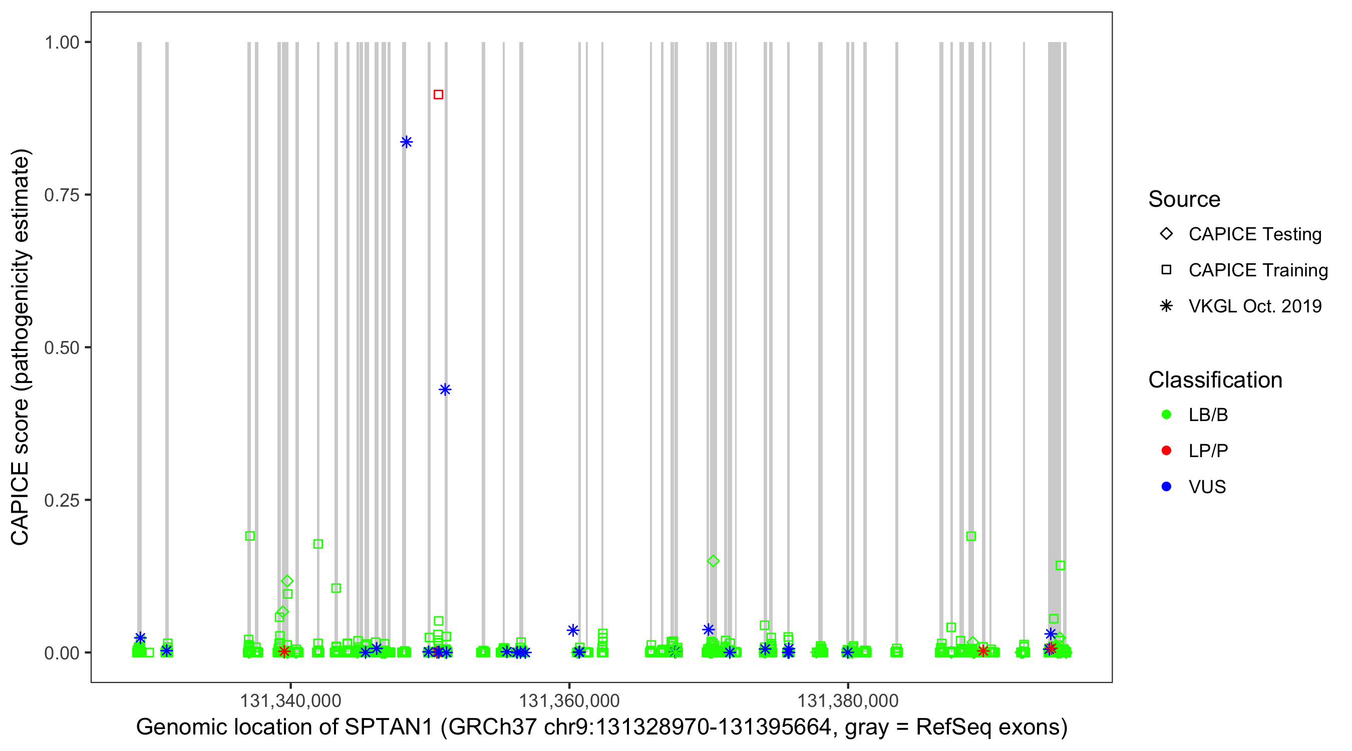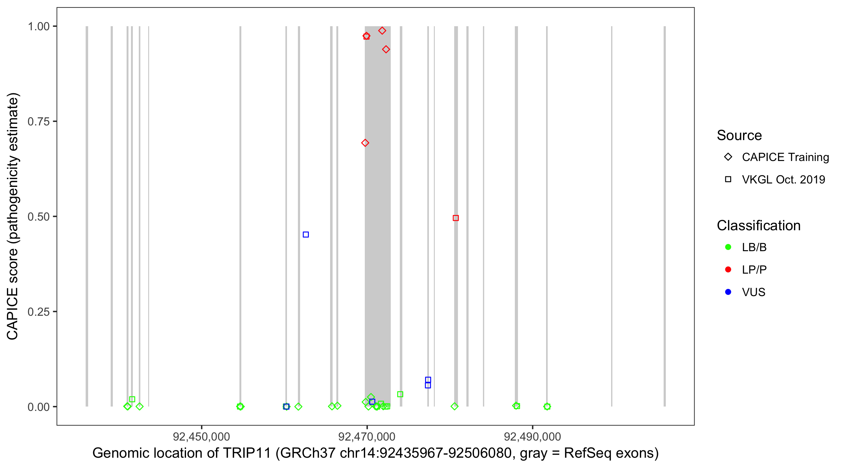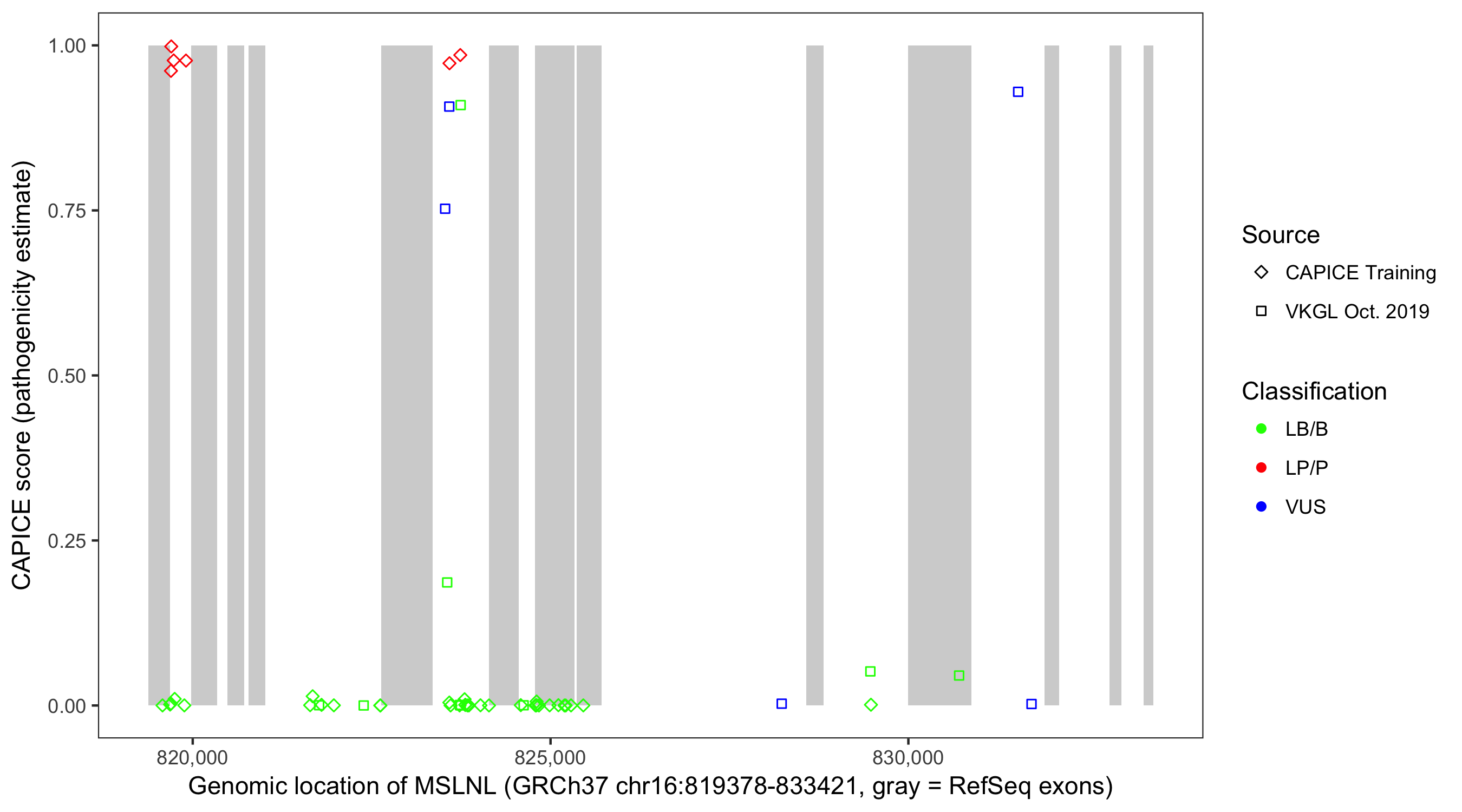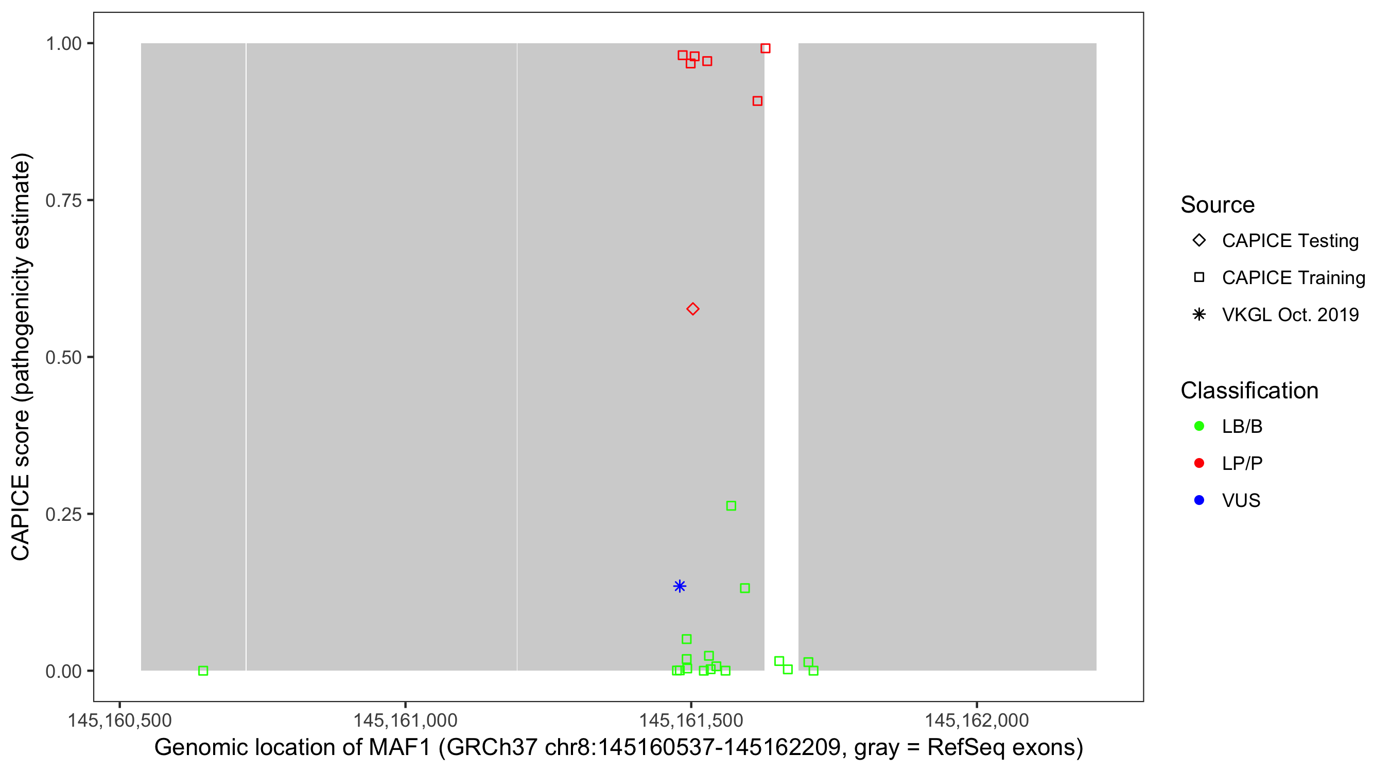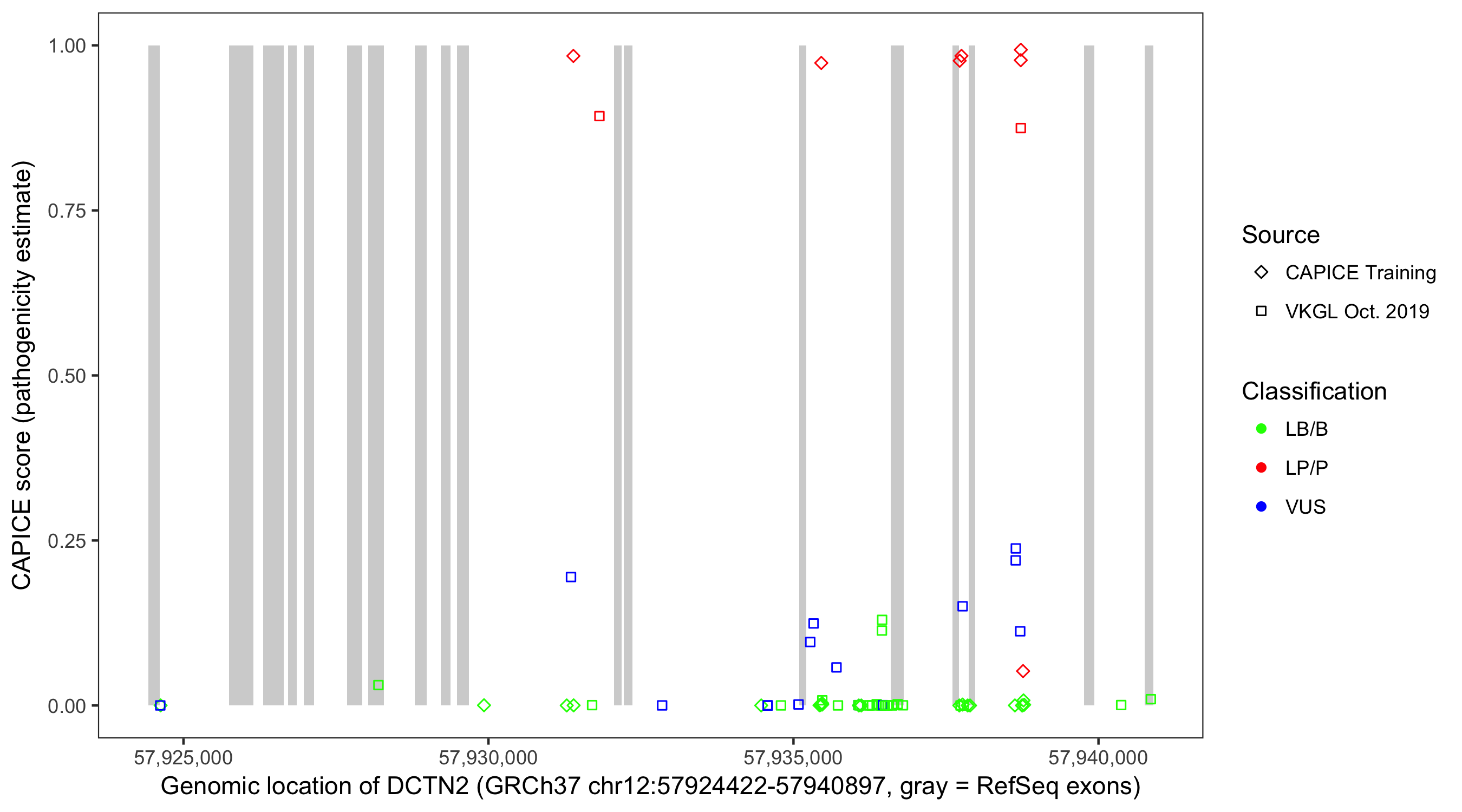Shown are CAPICE train/test variants plus VKGL Oct 2019.