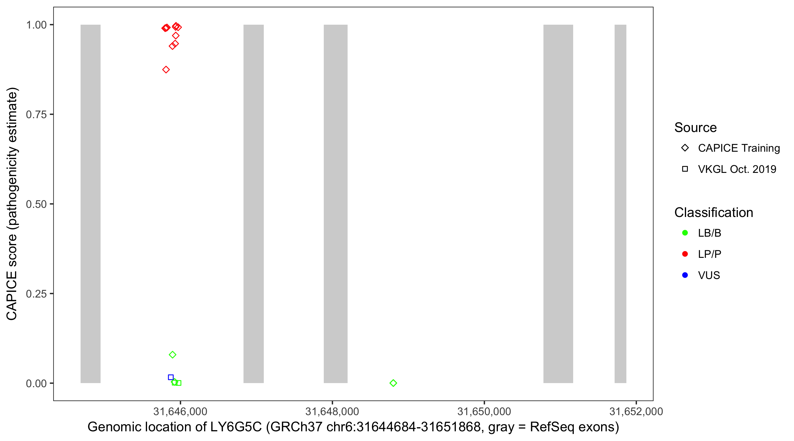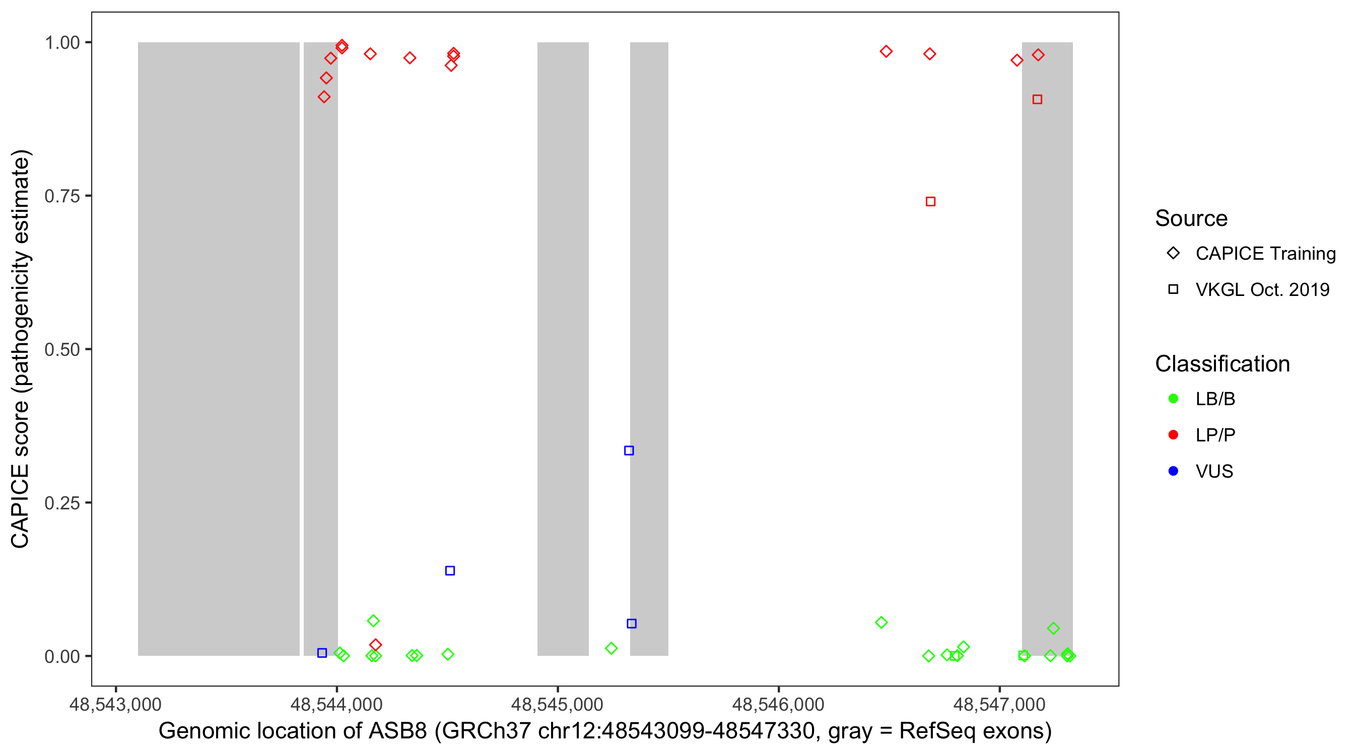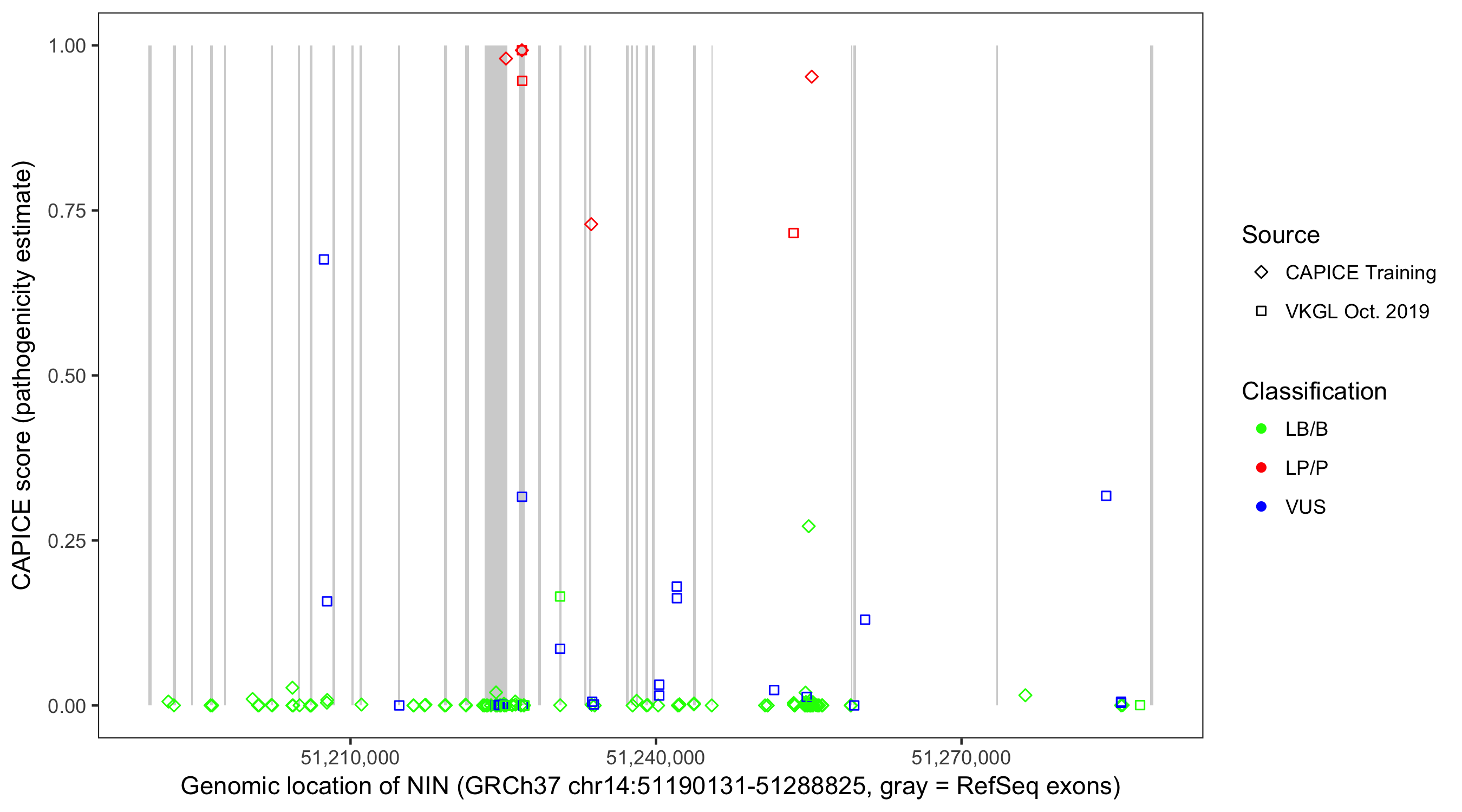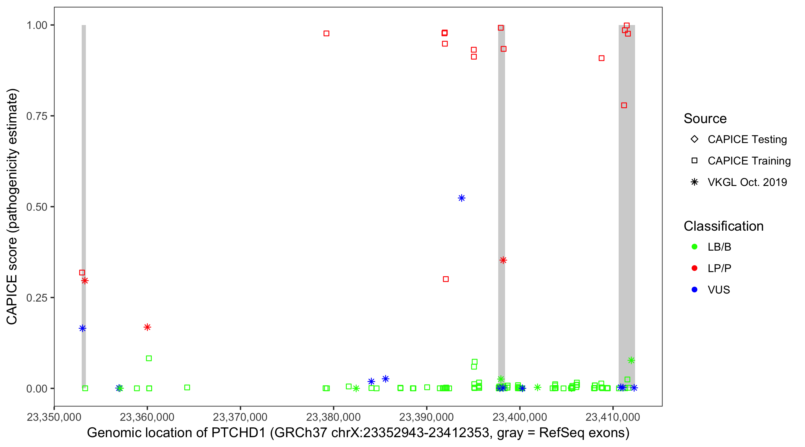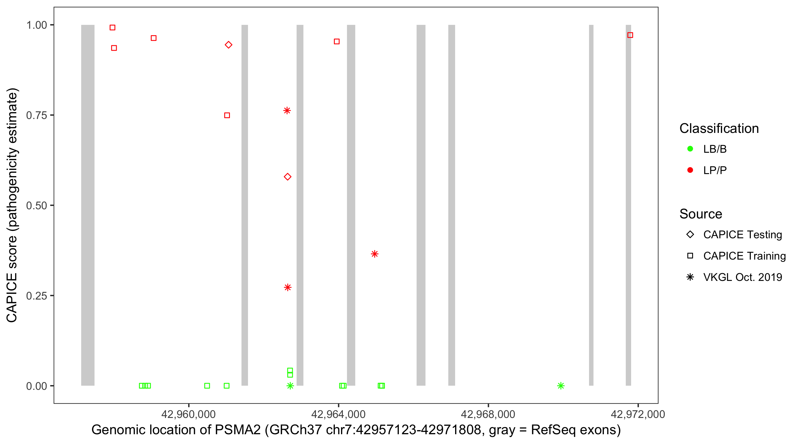 Shown are CAPICE train/test variants plus VKGL Oct 2019.