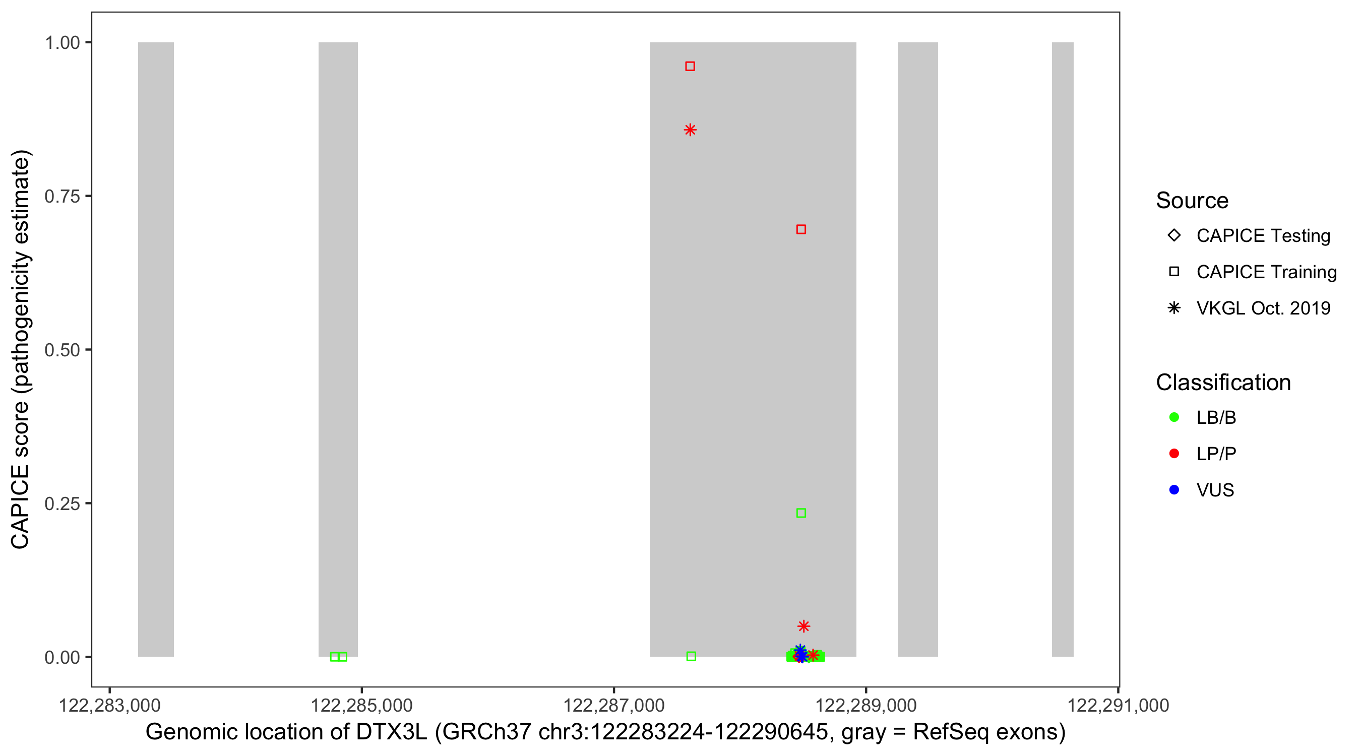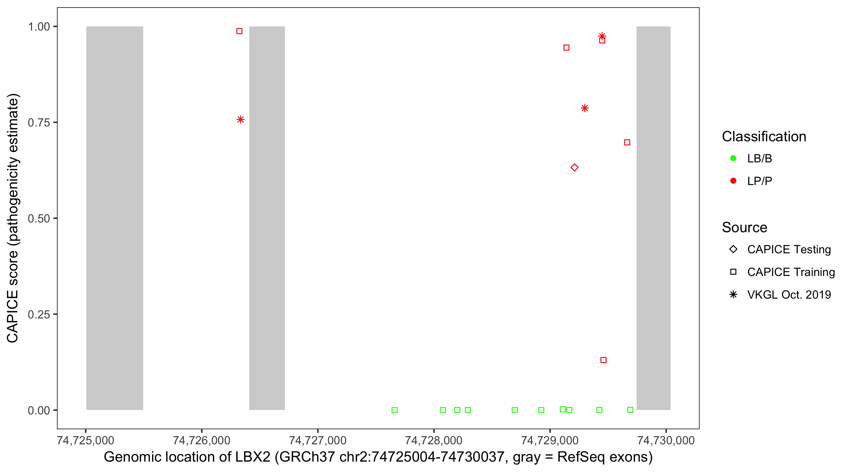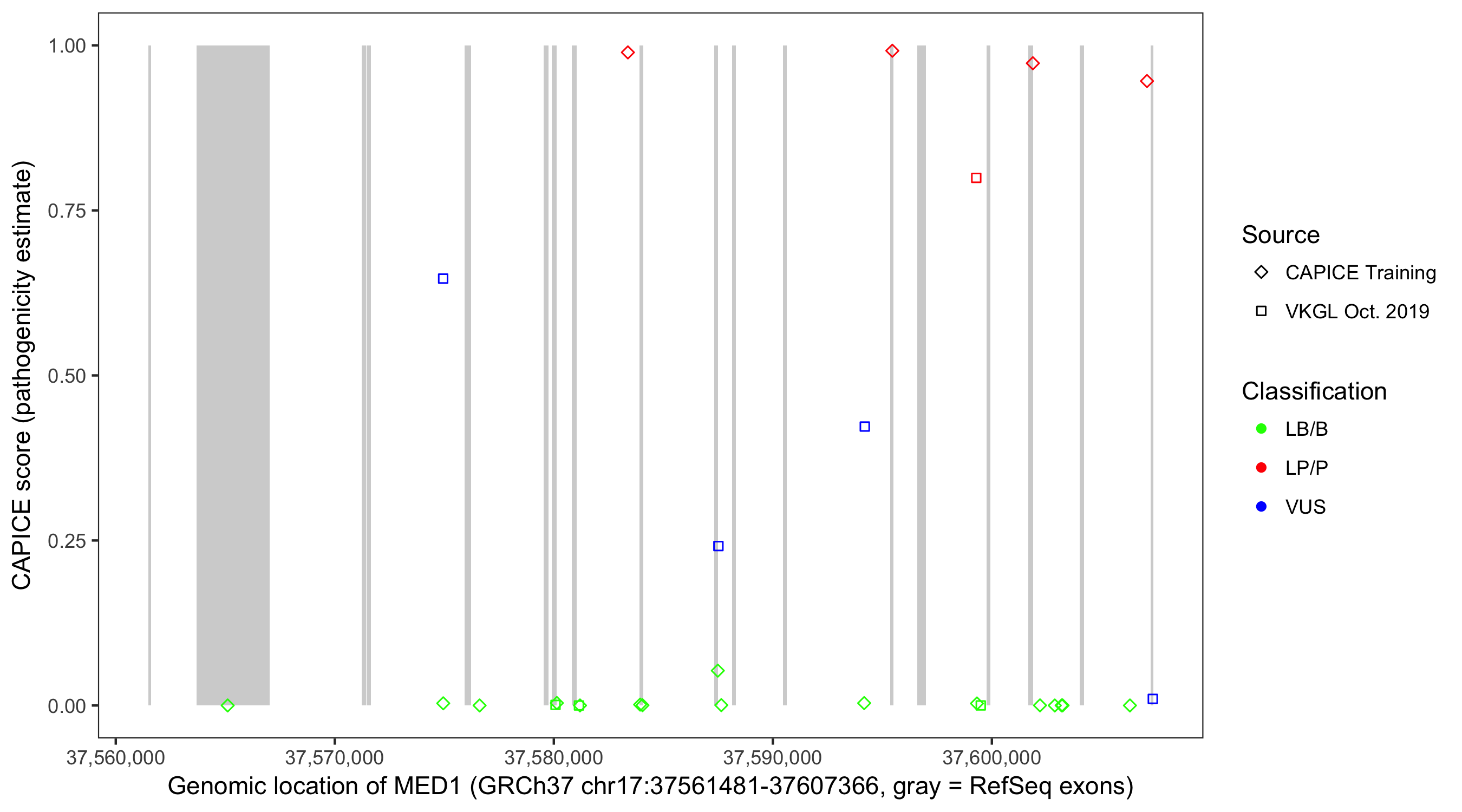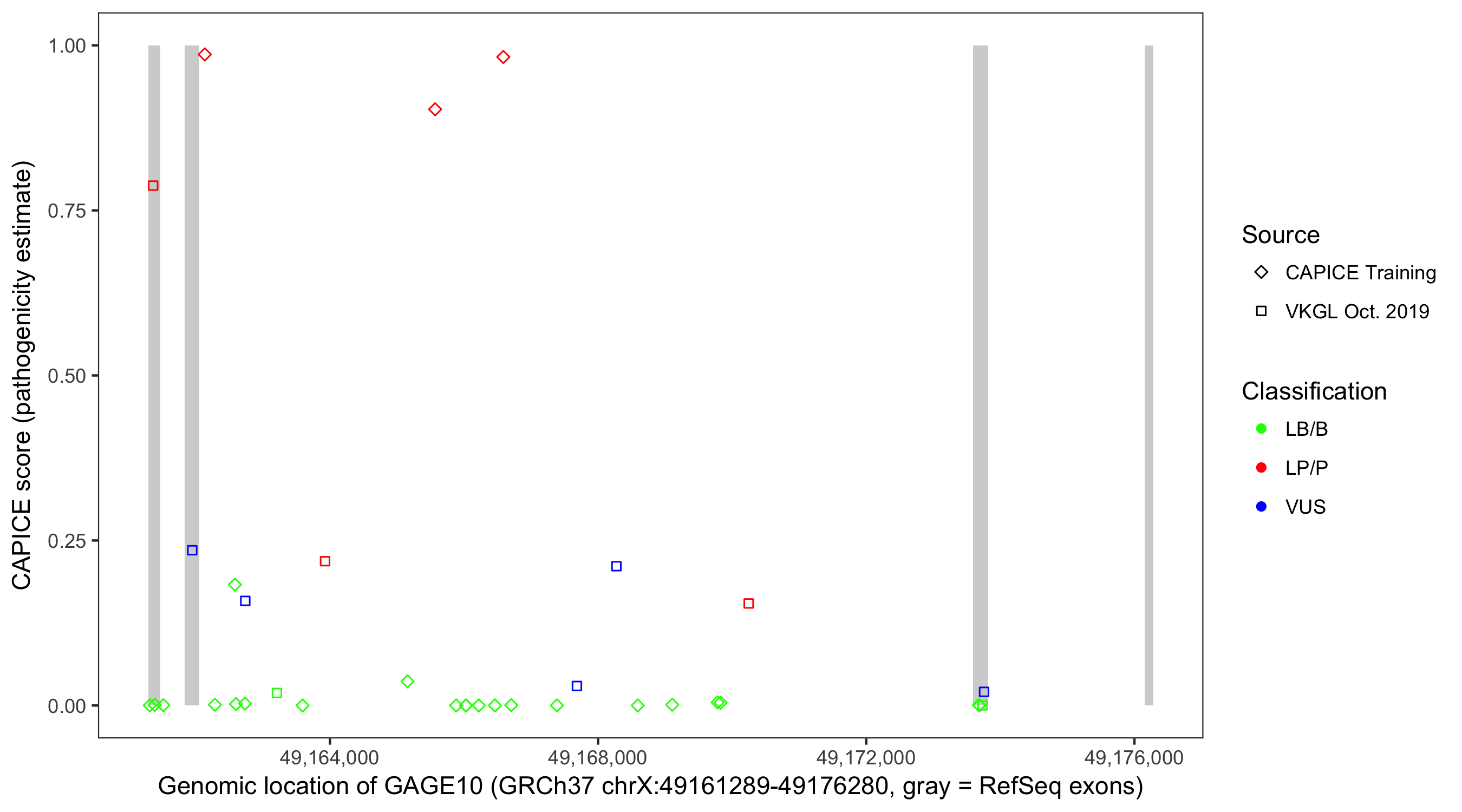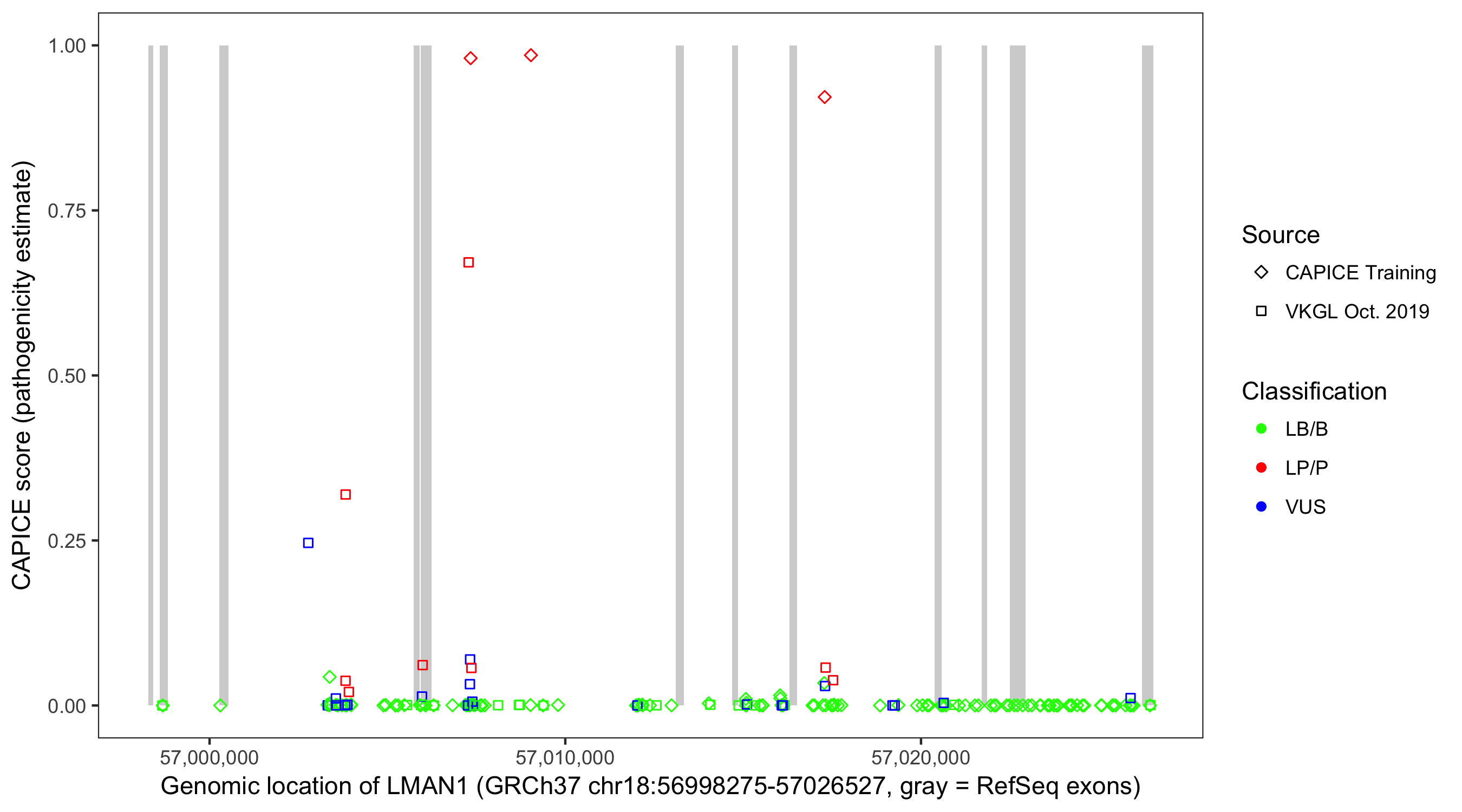Shown are CAPICE train/test variants plus VKGL Oct 2019.