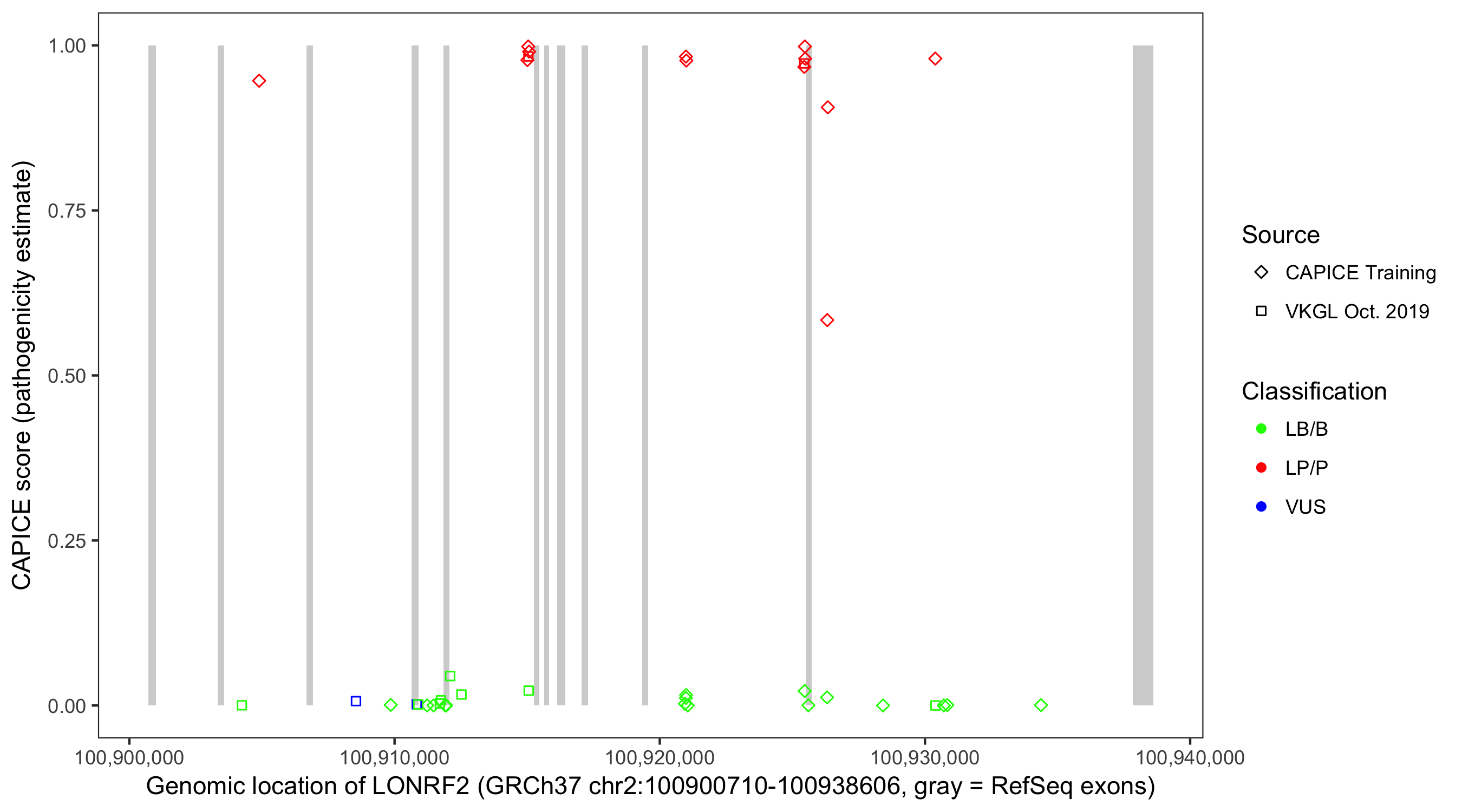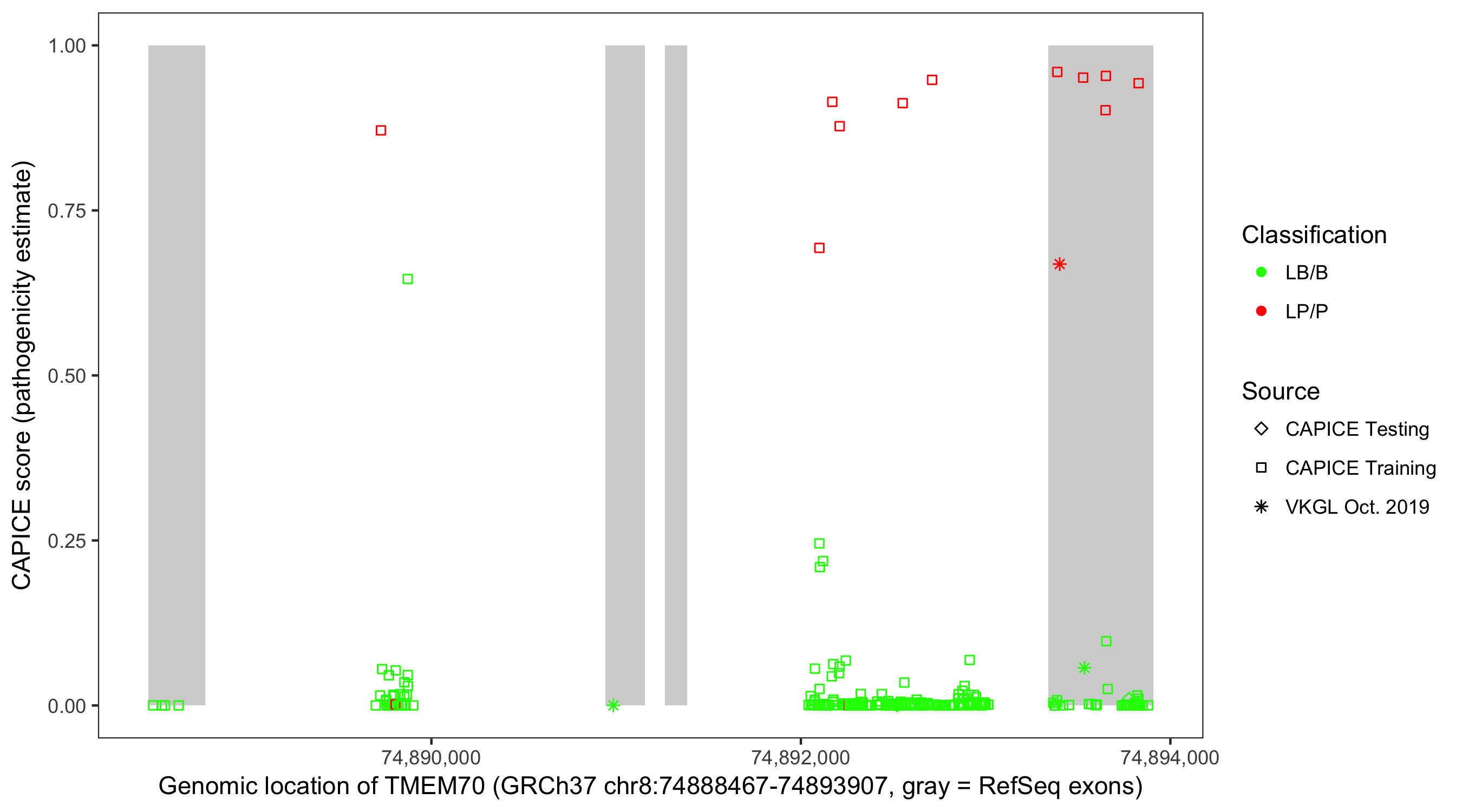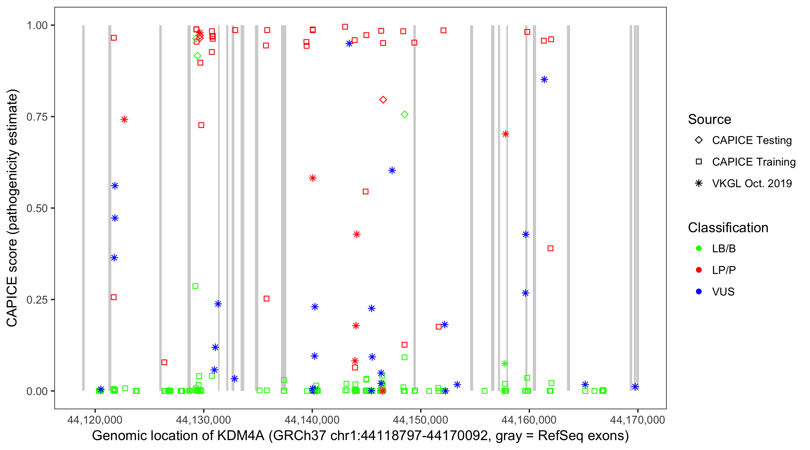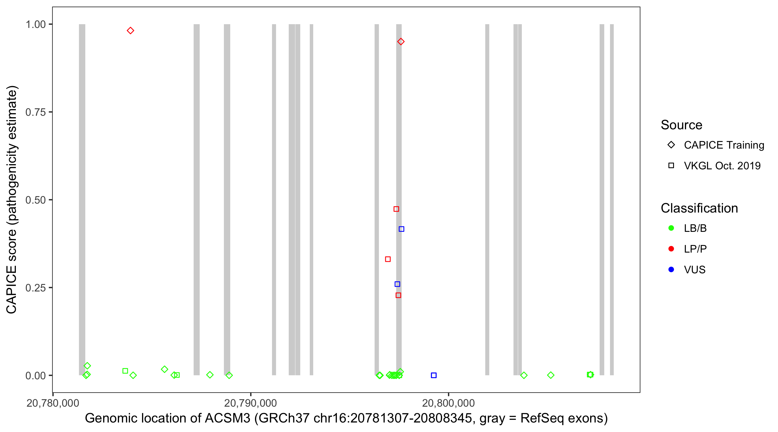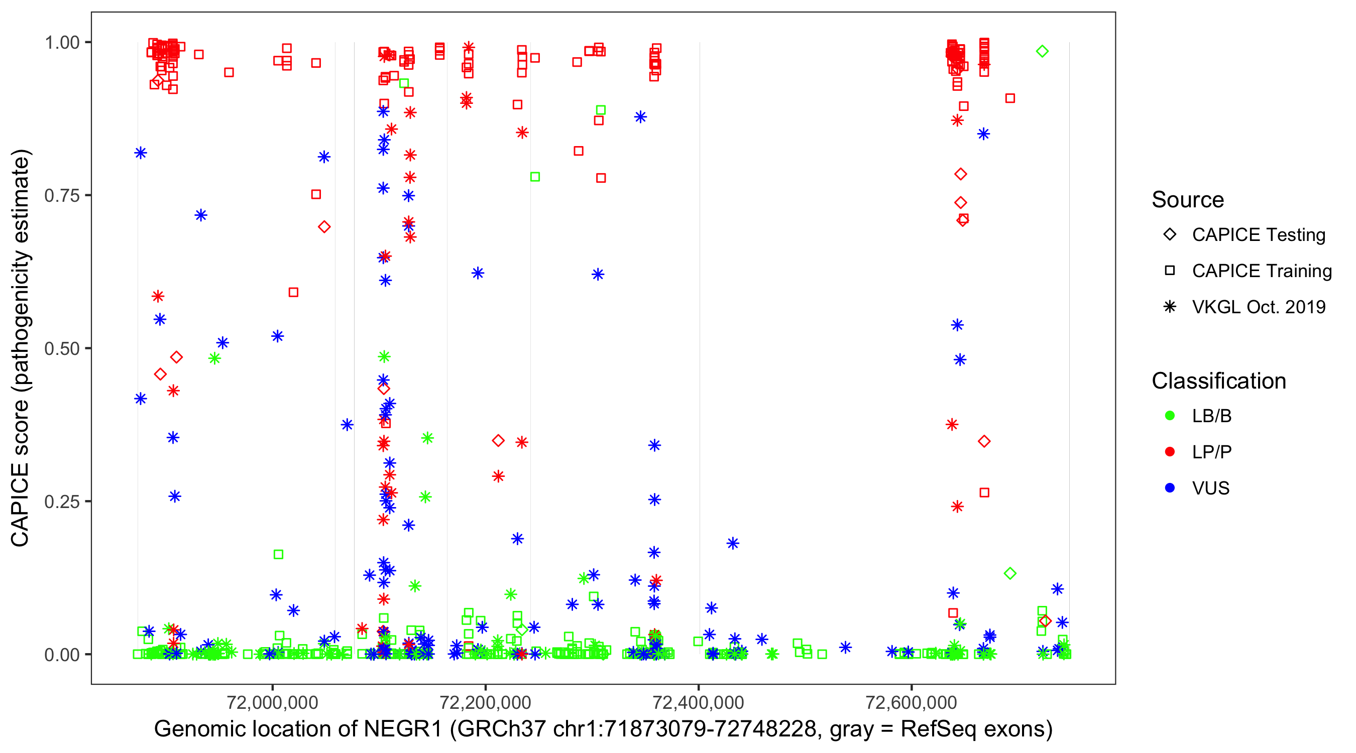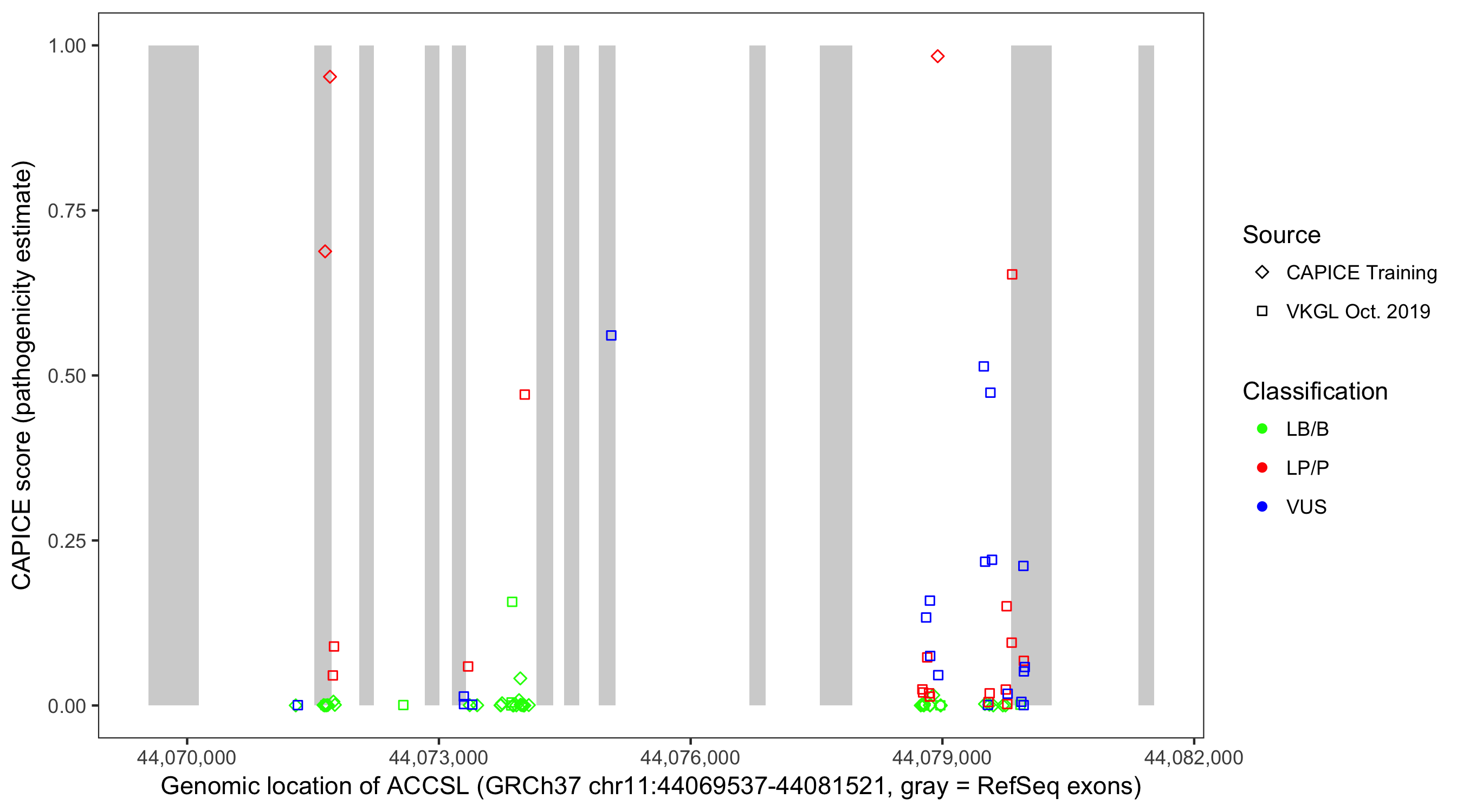 Shown are CAPICE train/test variants plus VKGL Oct 2019.