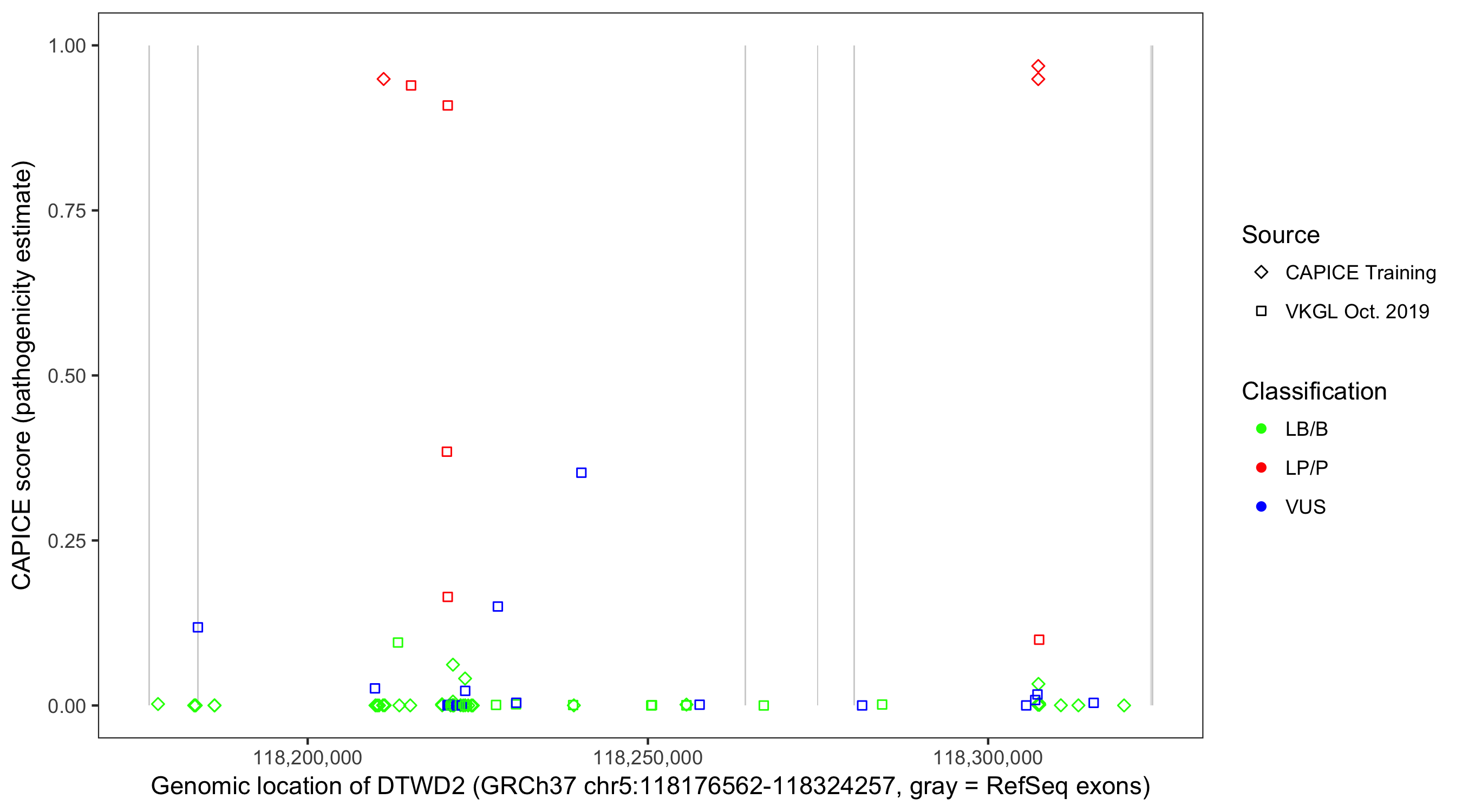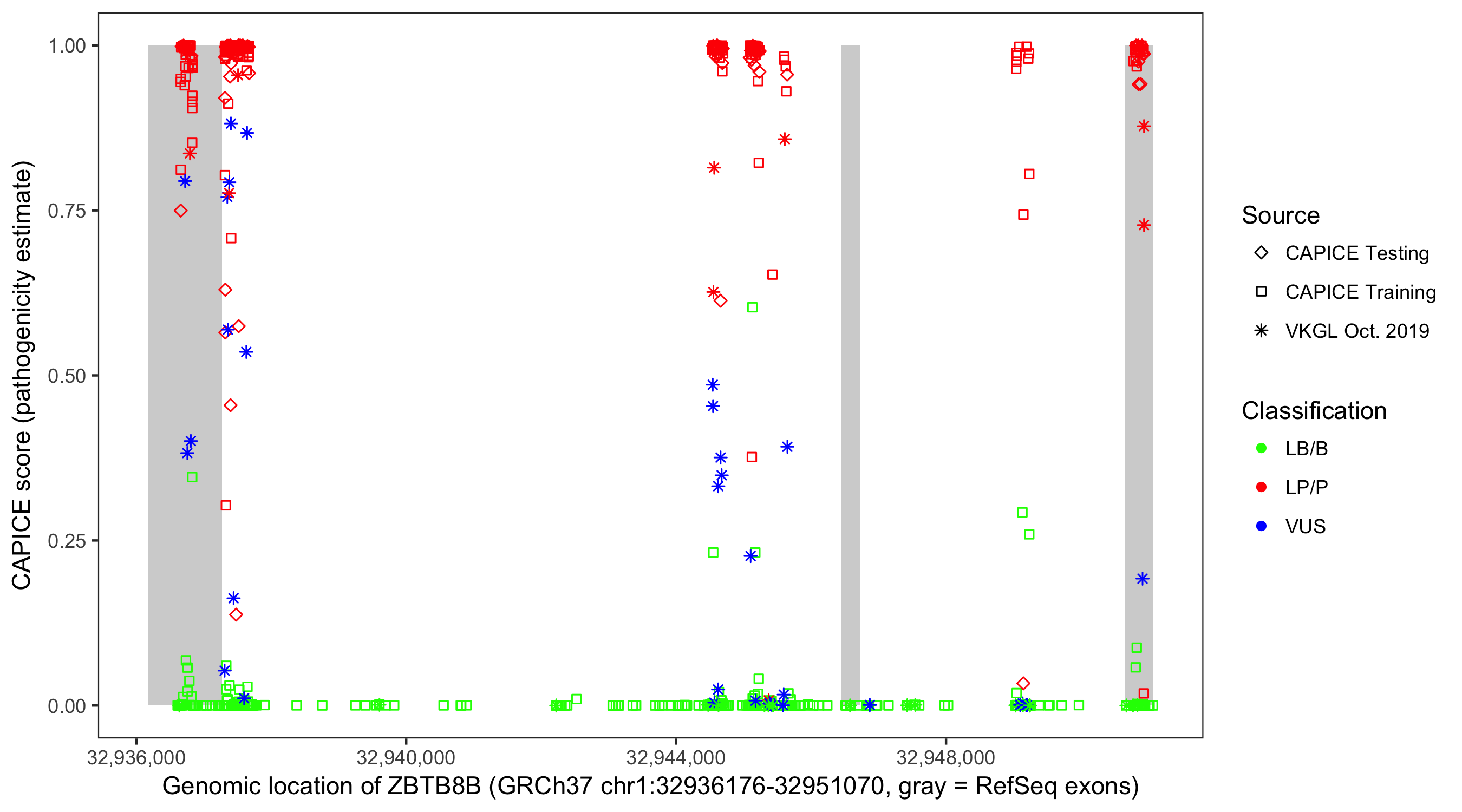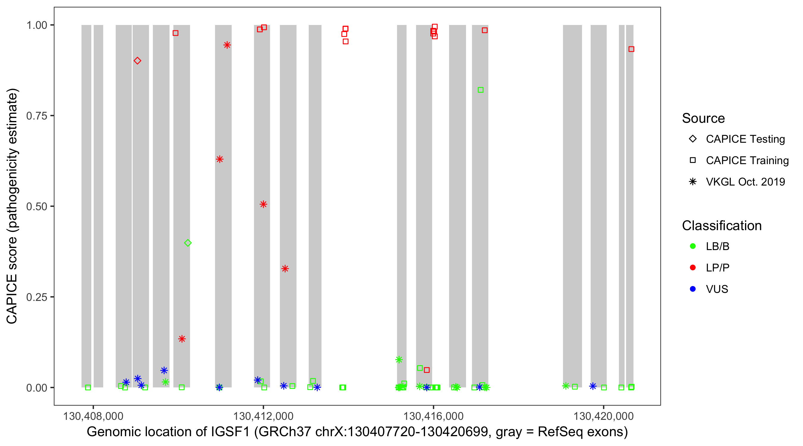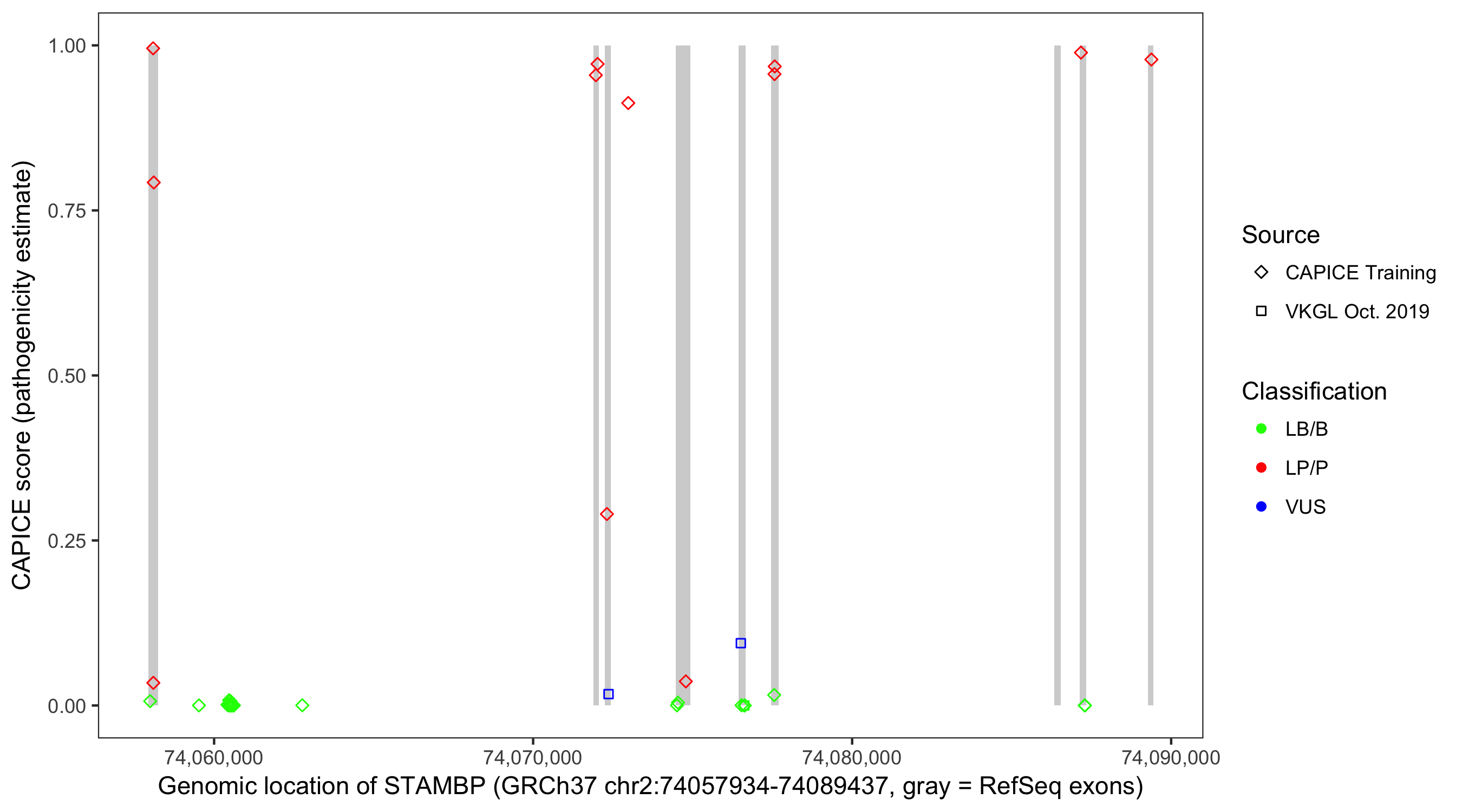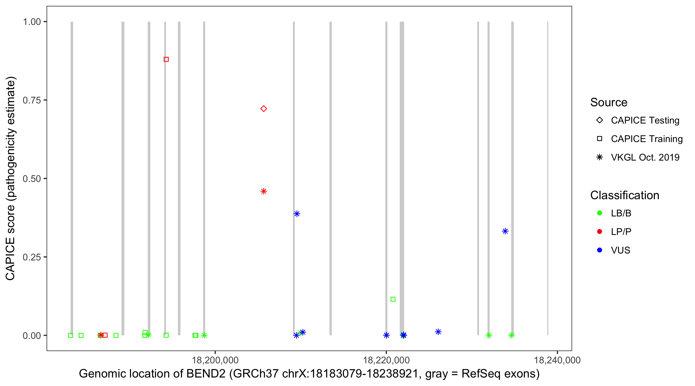 Shown are CAPICE train/test variants plus VKGL Oct 2019.