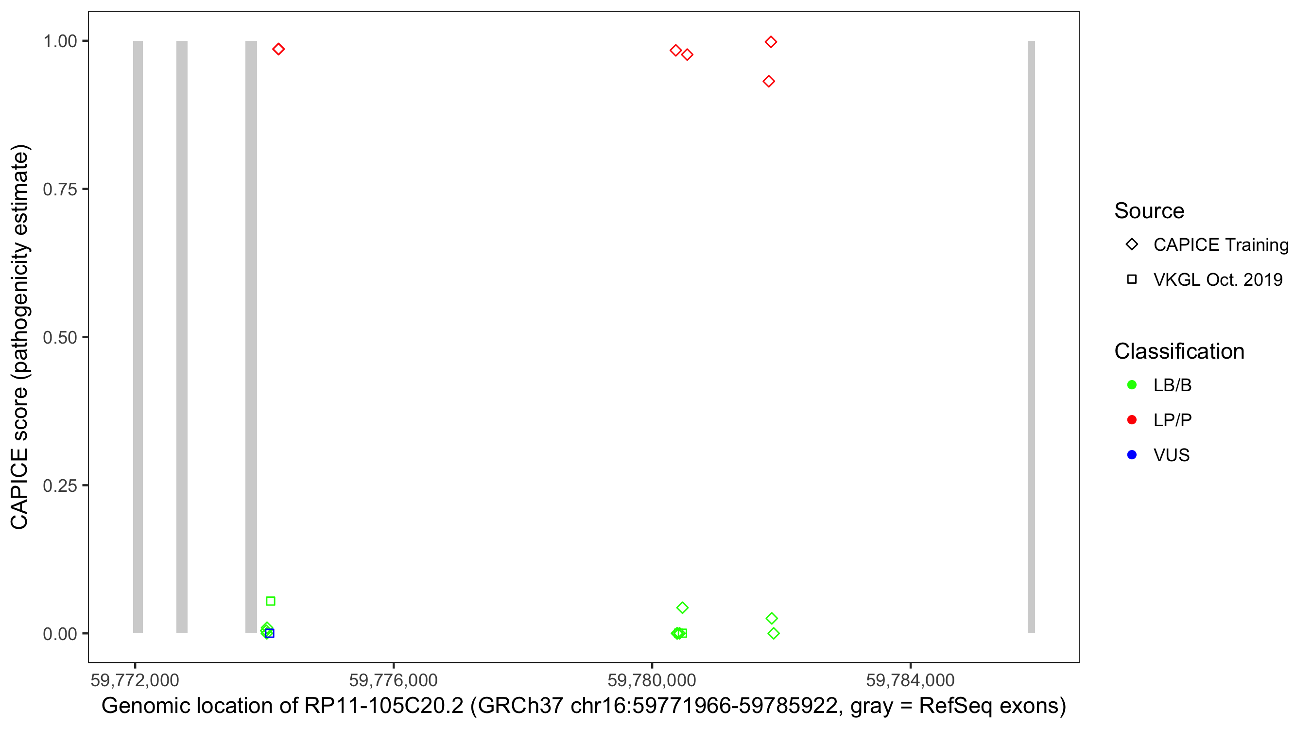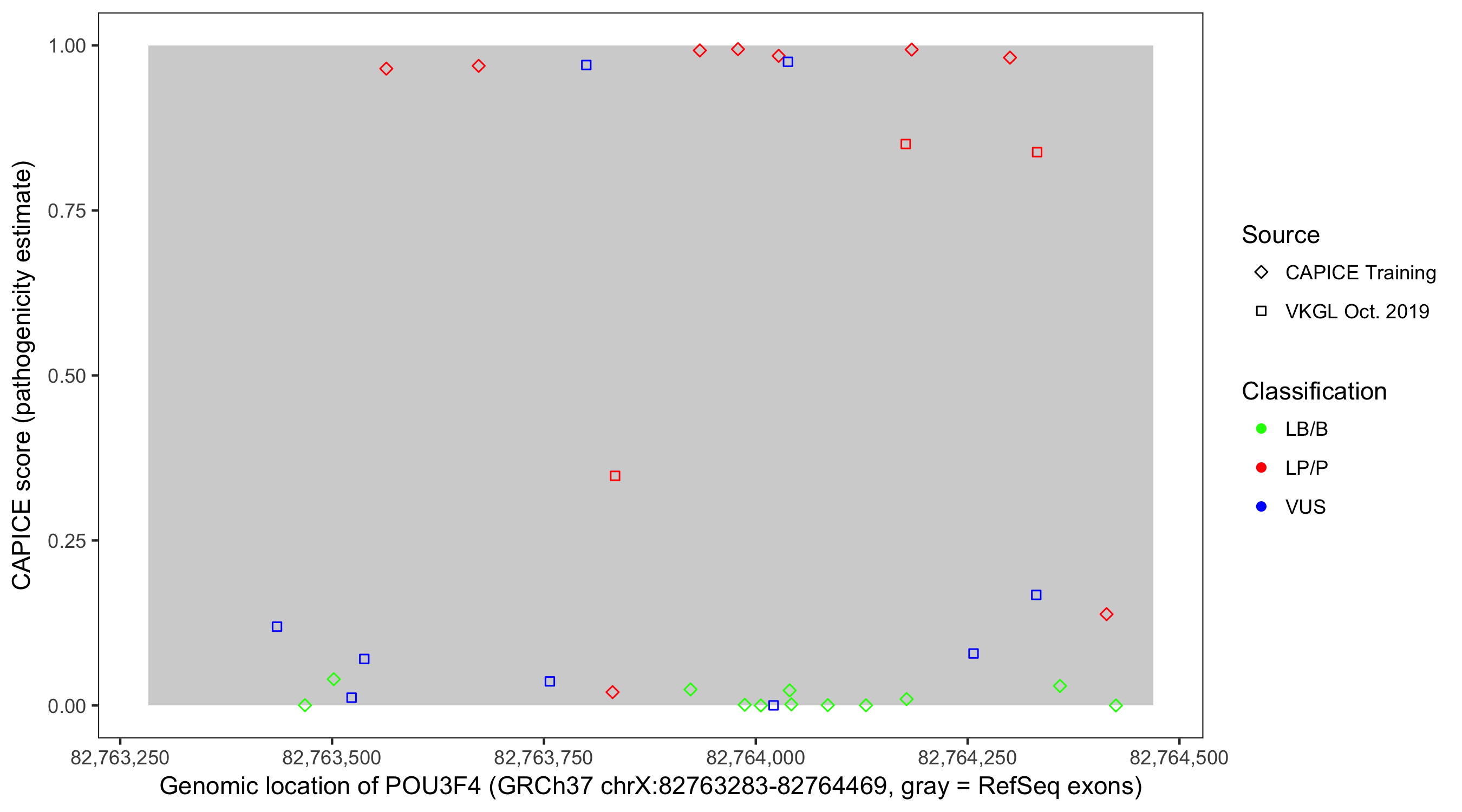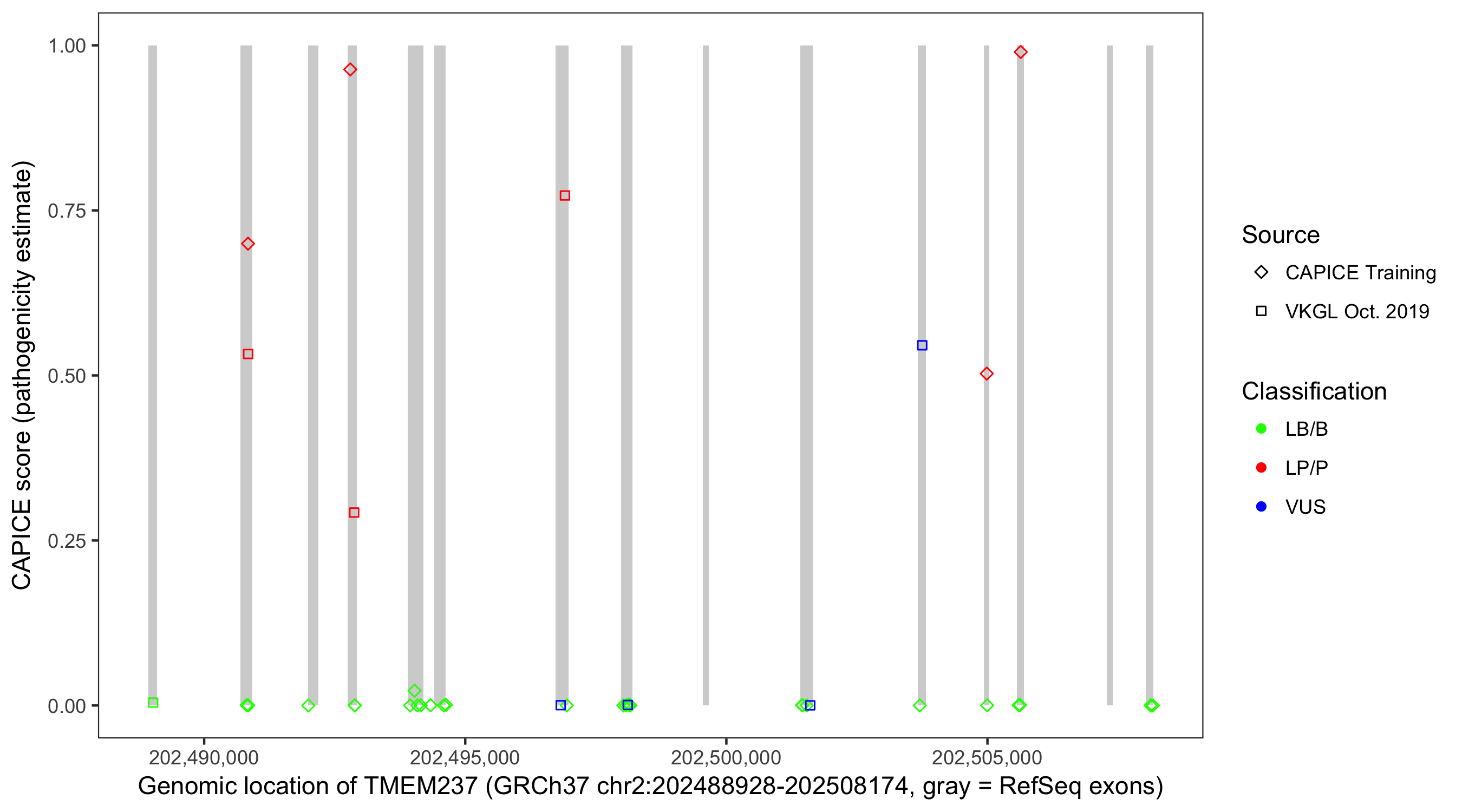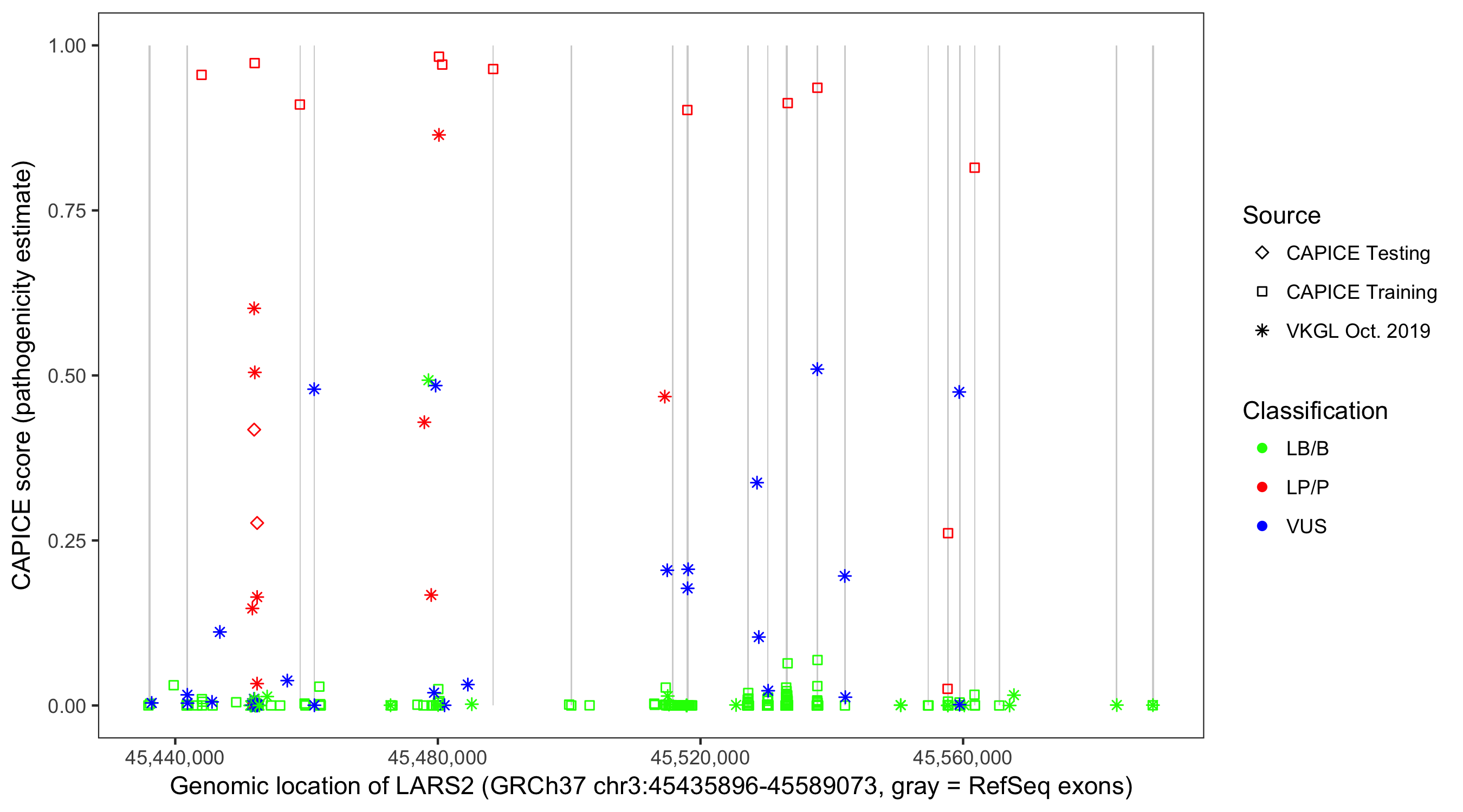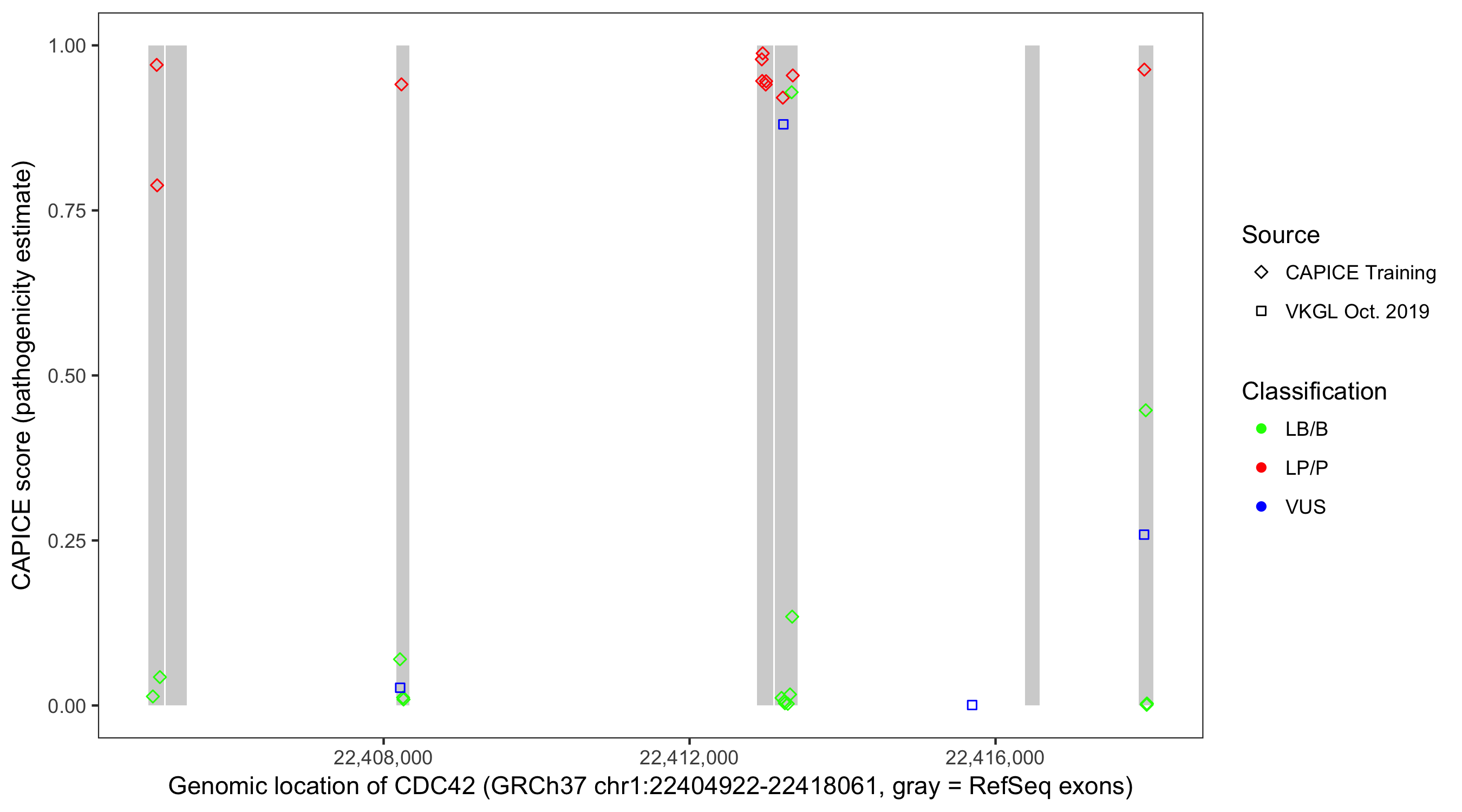 Shown are CAPICE train/test variants plus VKGL Oct 2019.