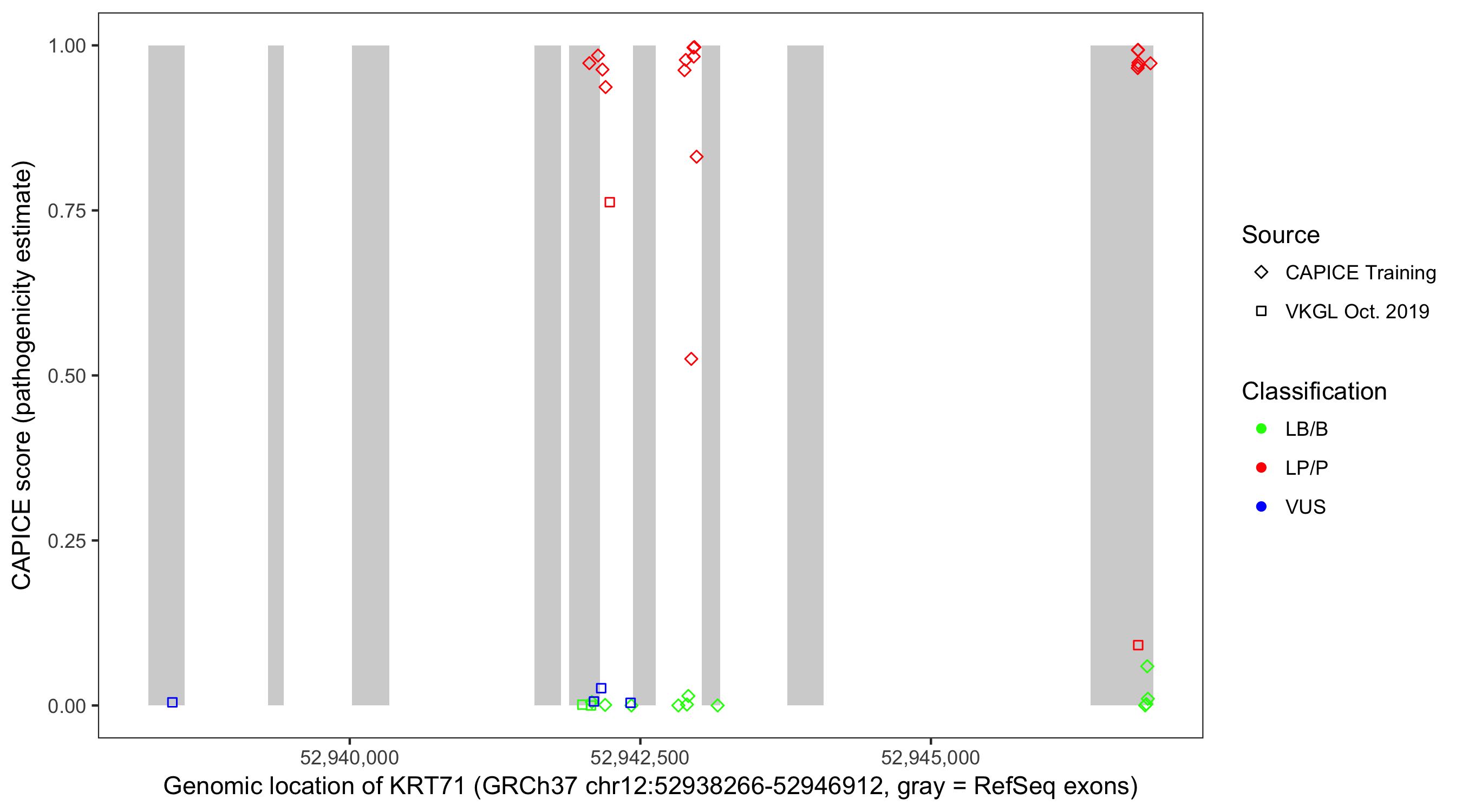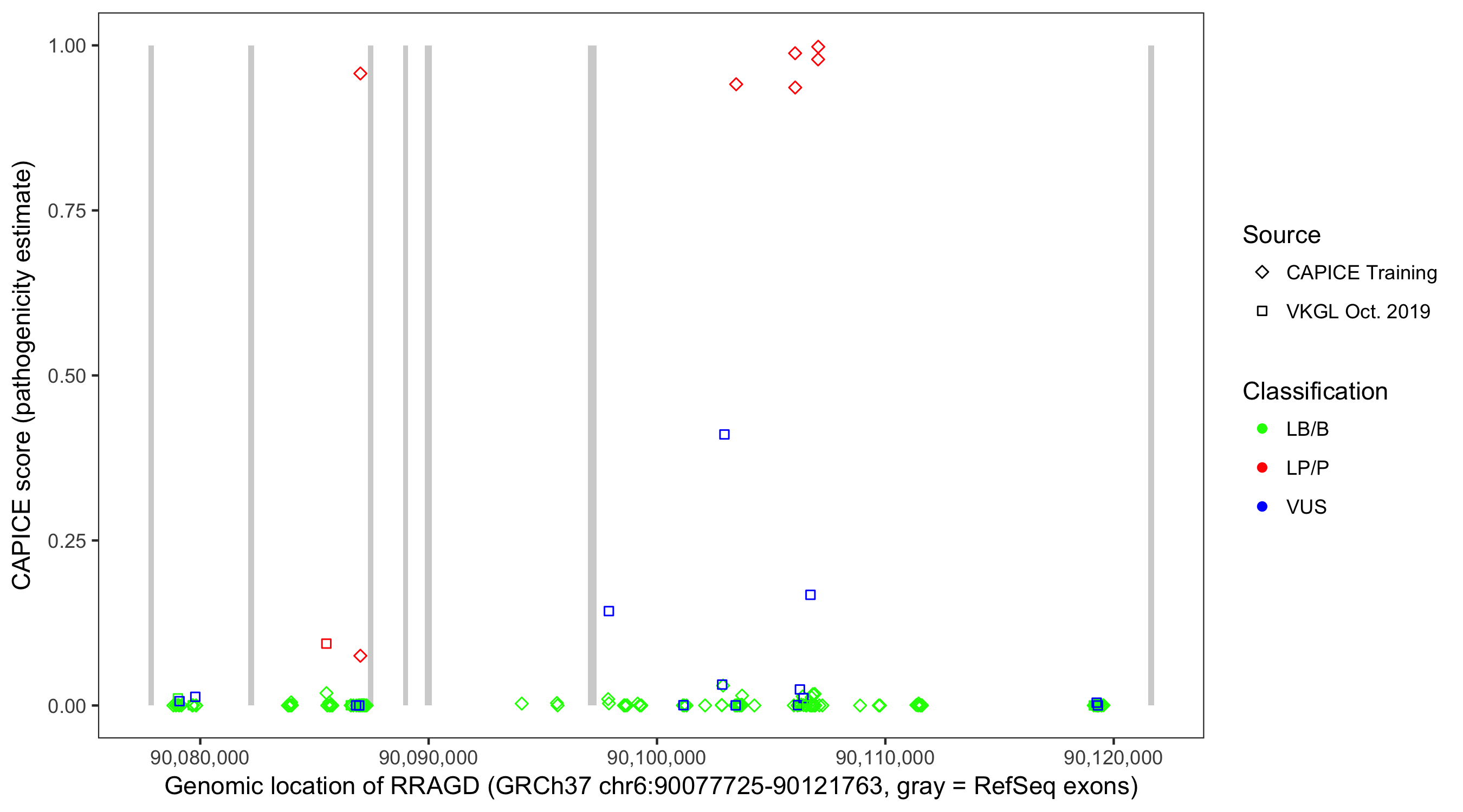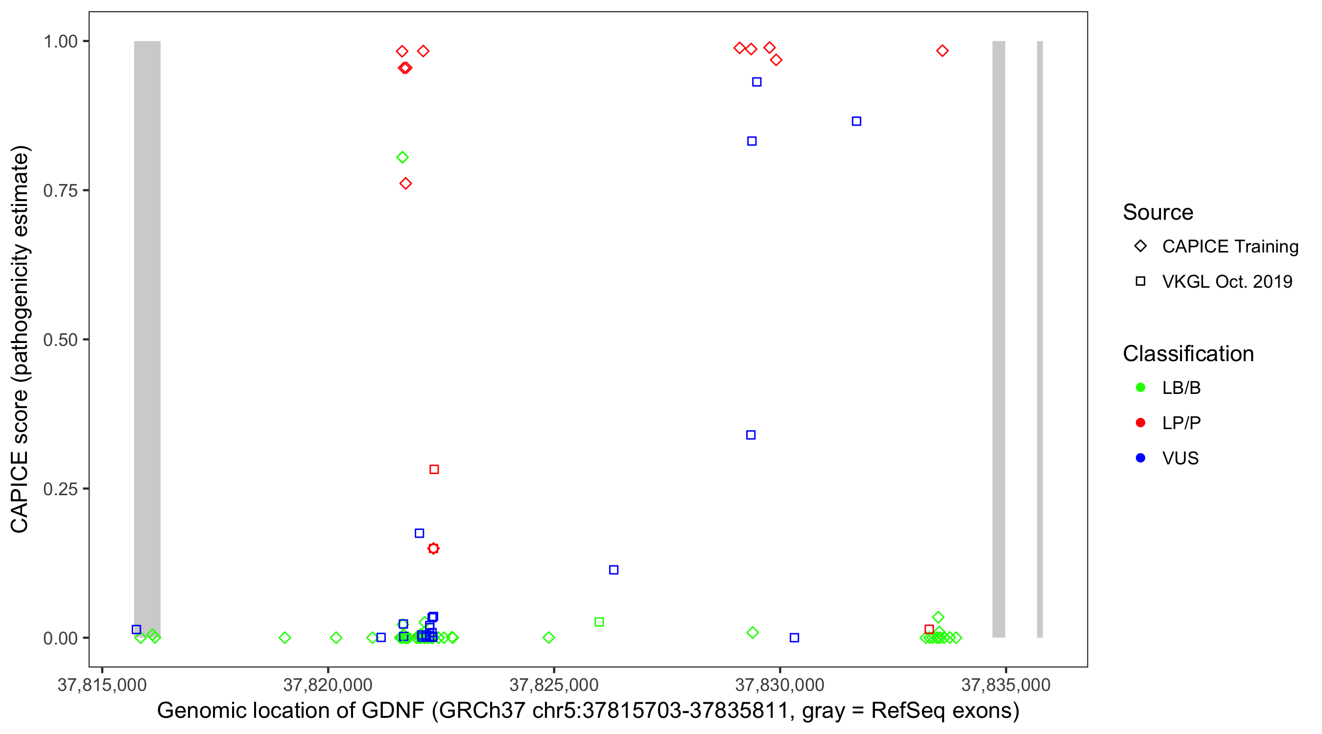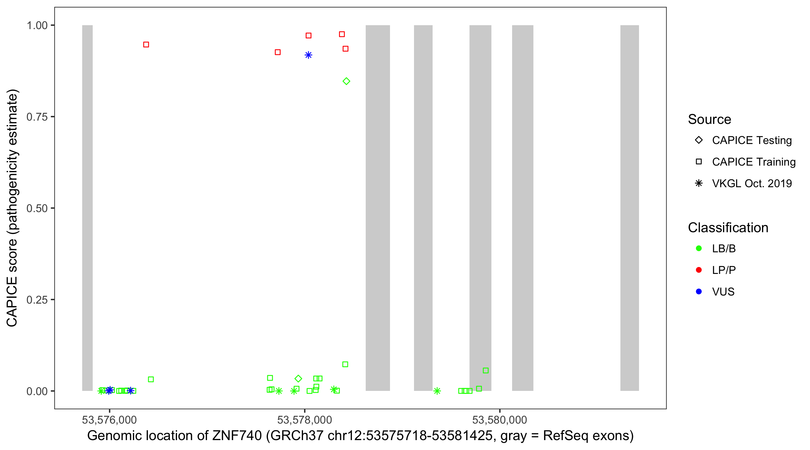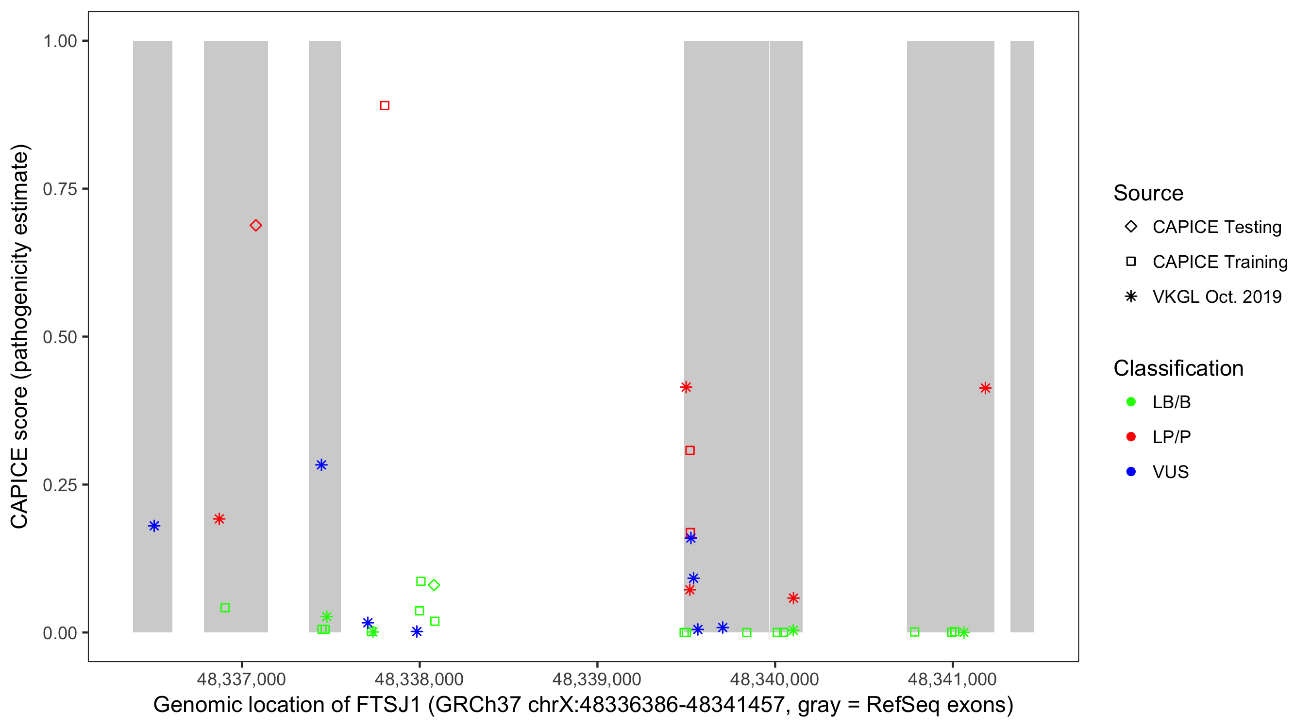 Shown are CAPICE train/test variants plus VKGL Oct 2019.