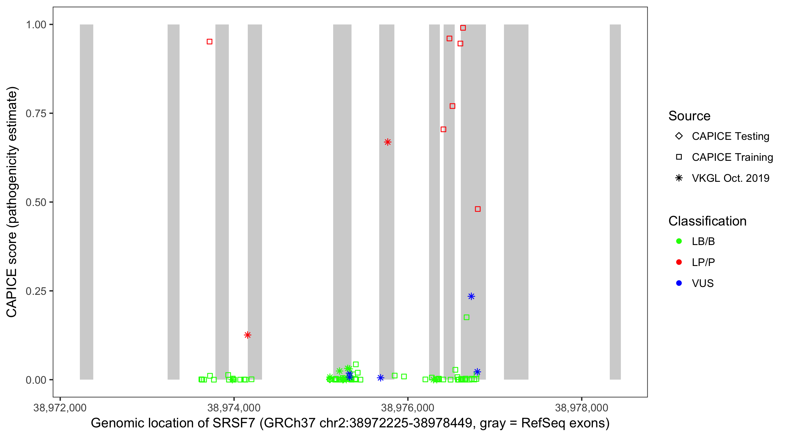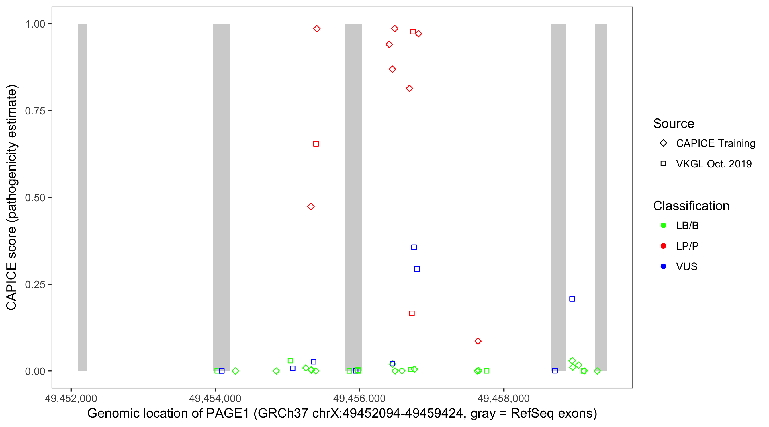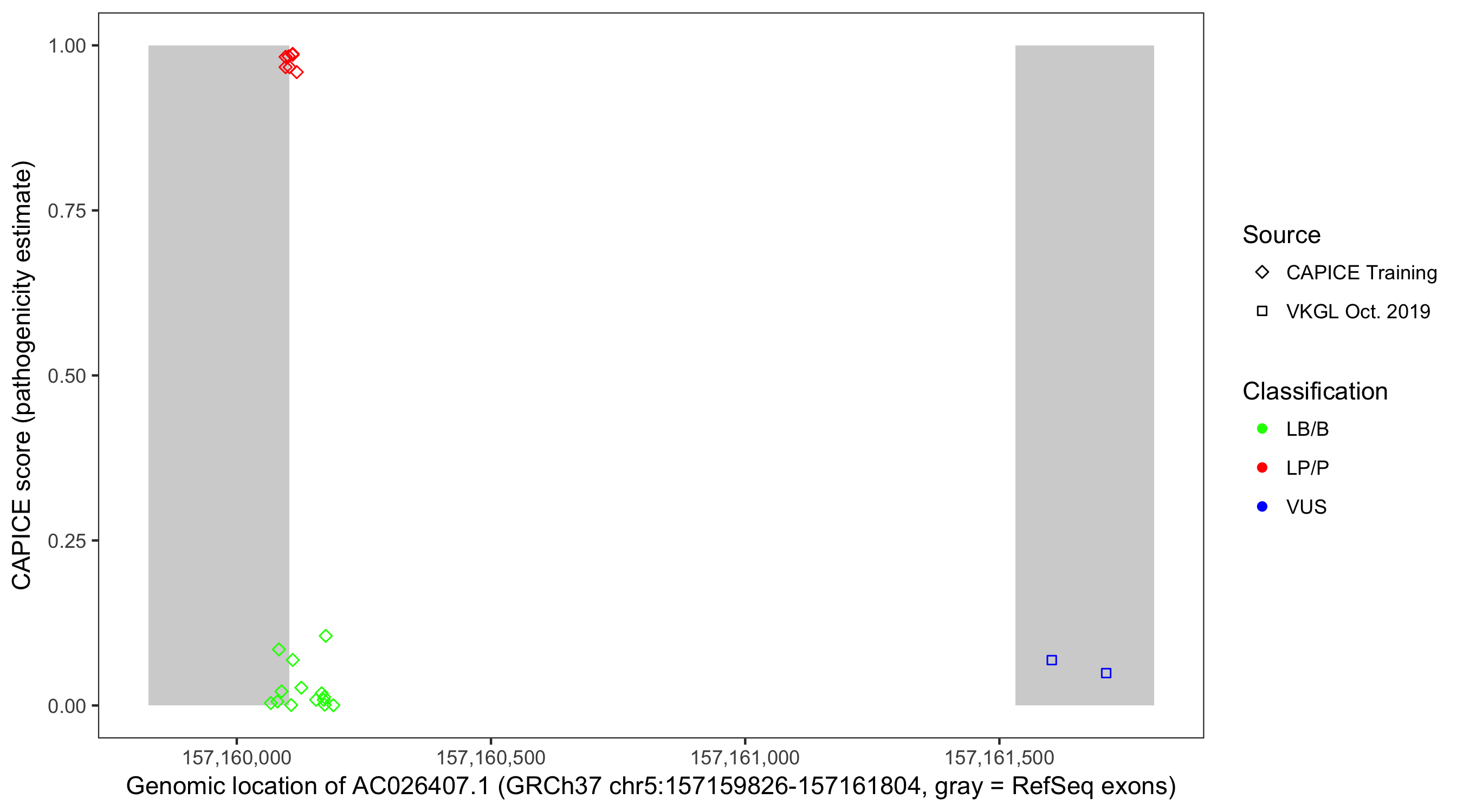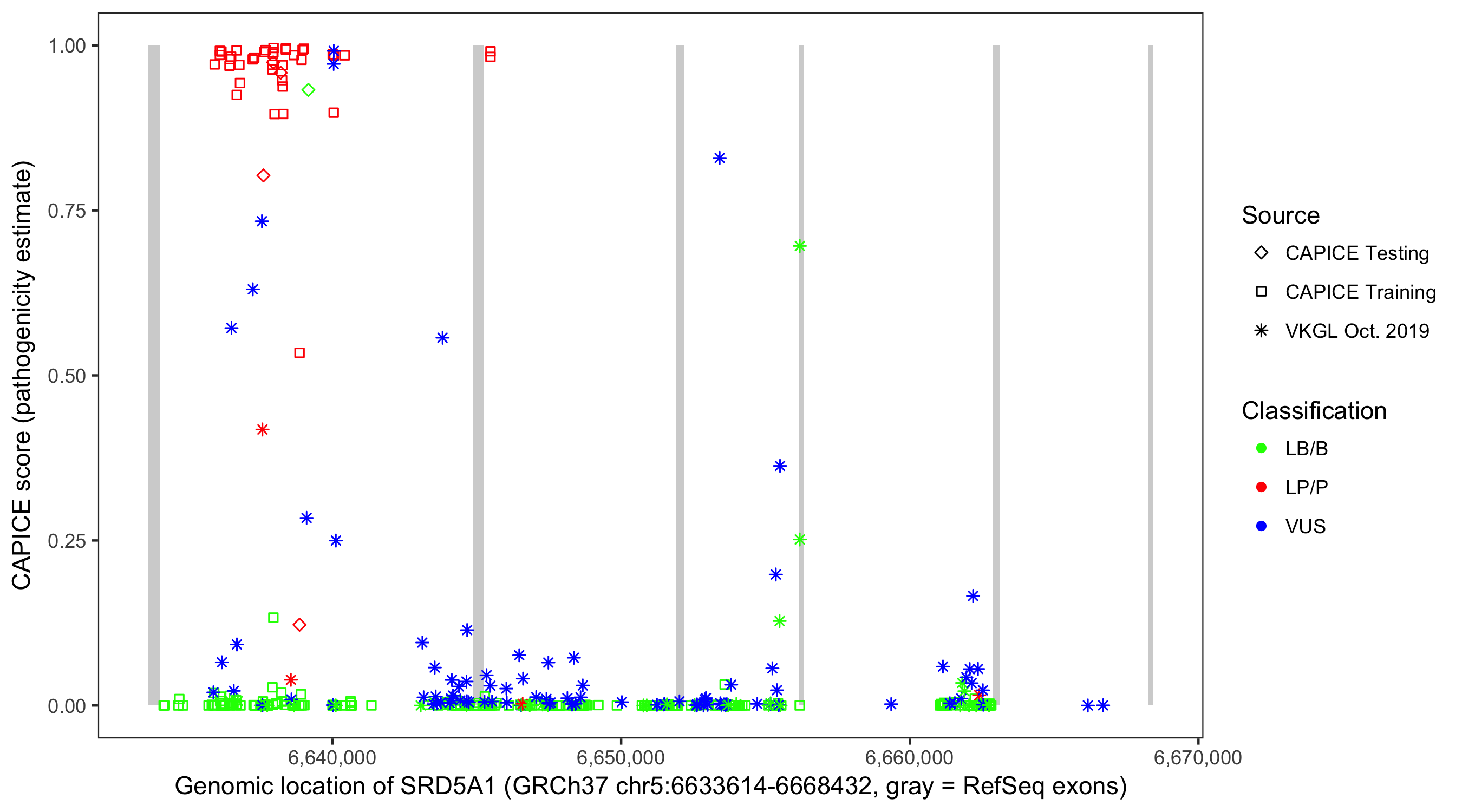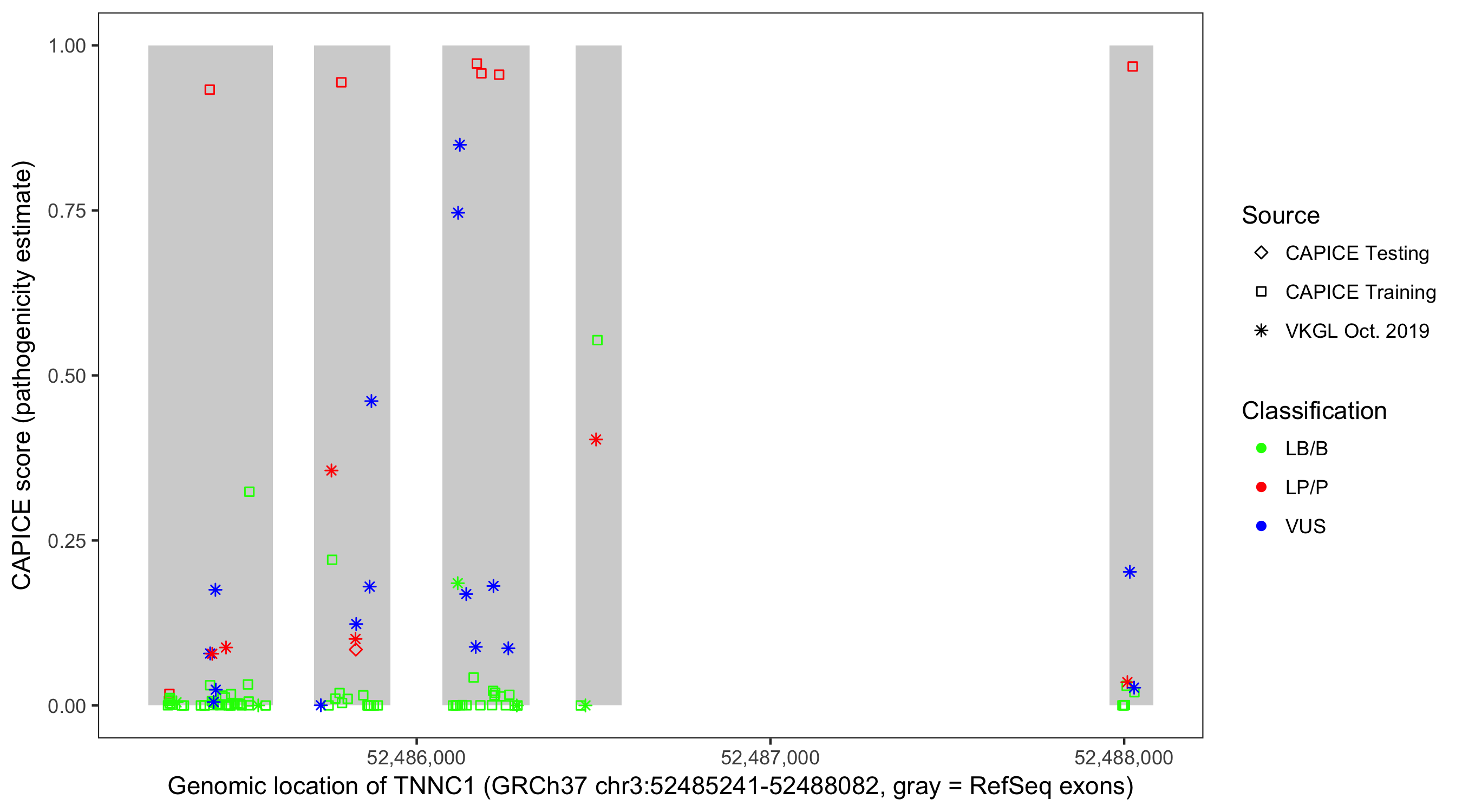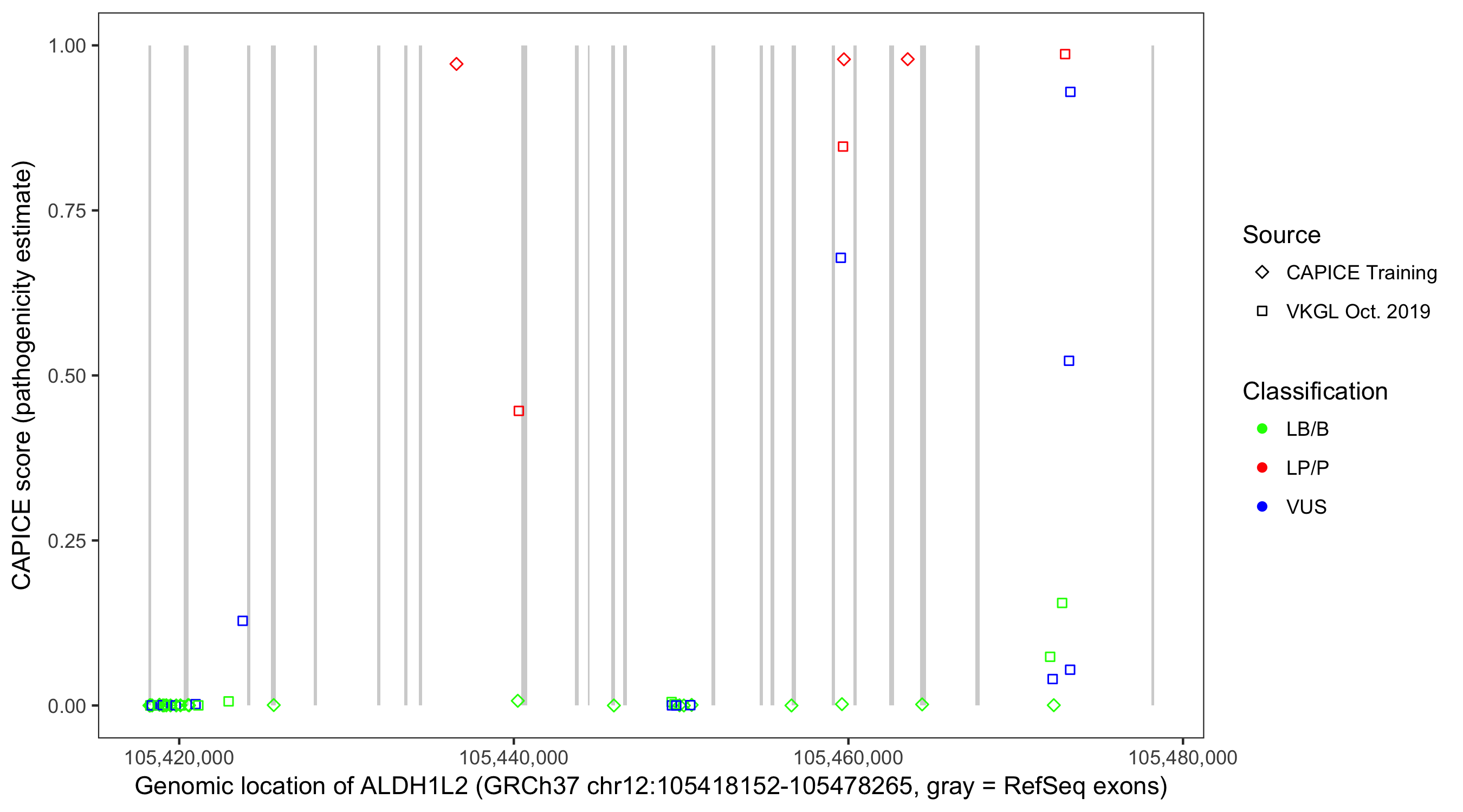 Shown are CAPICE train/test variants plus VKGL Oct 2019.