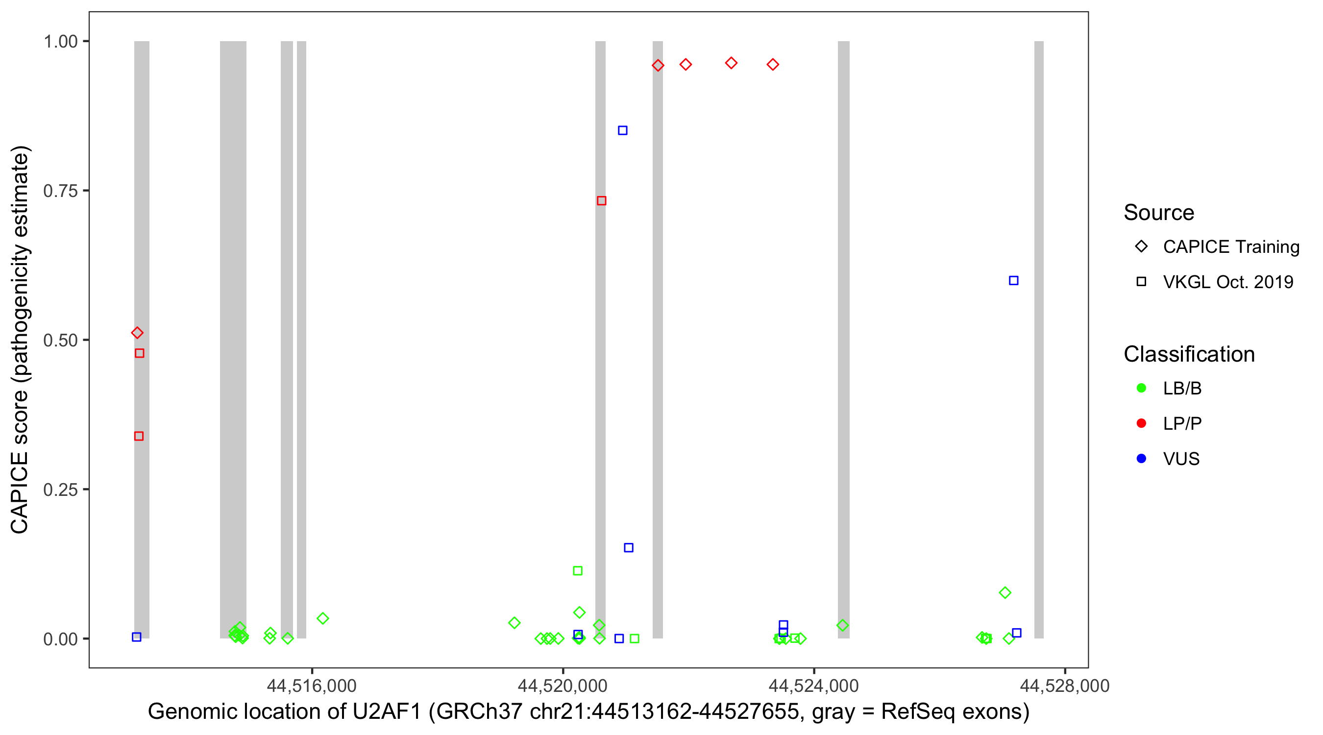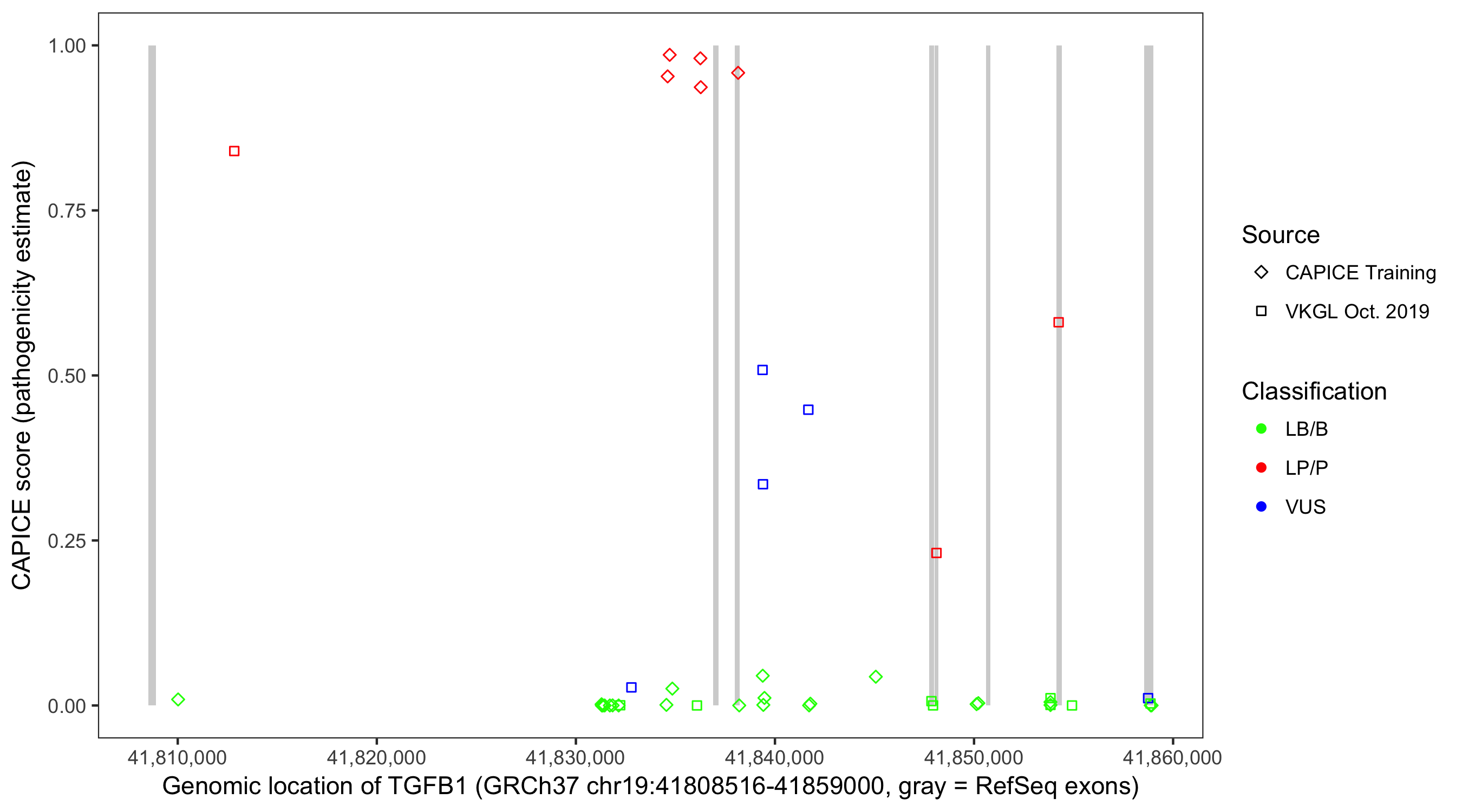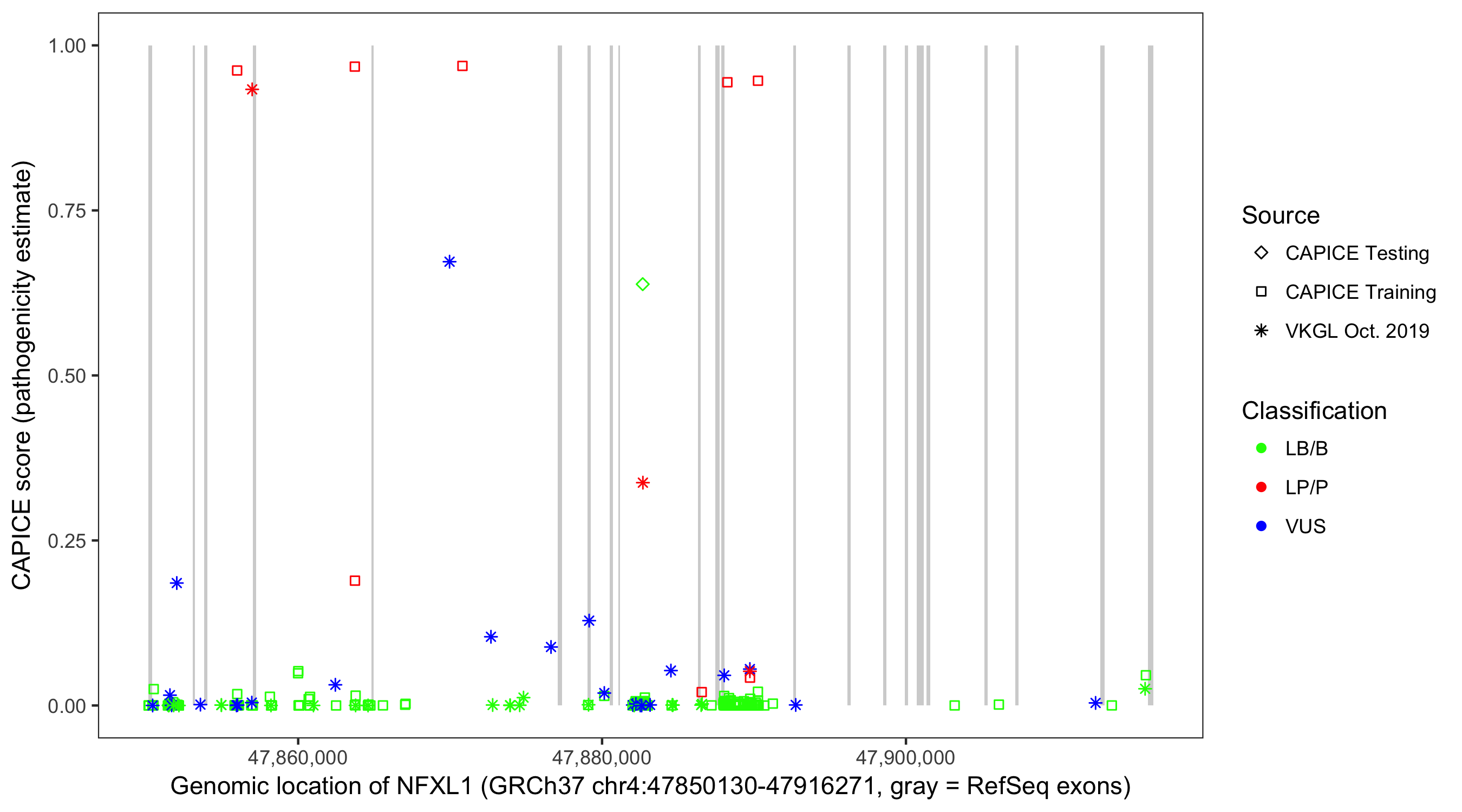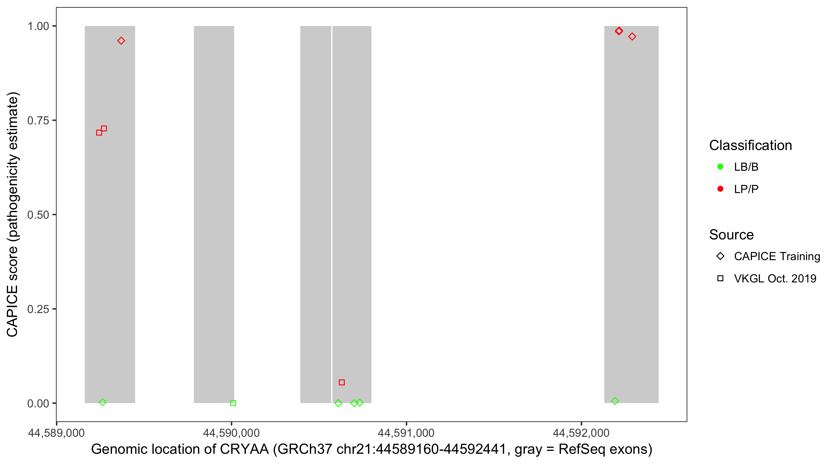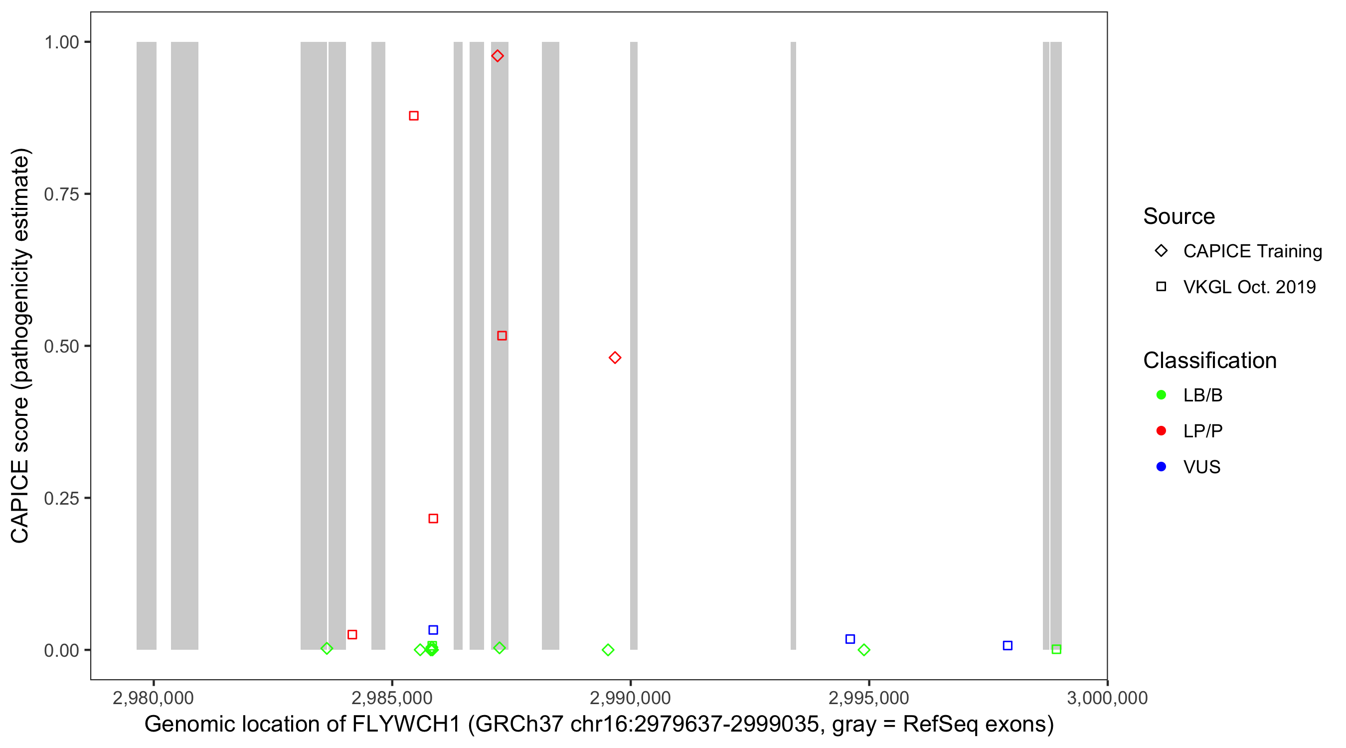 Shown are CAPICE train/test variants plus VKGL Oct 2019.