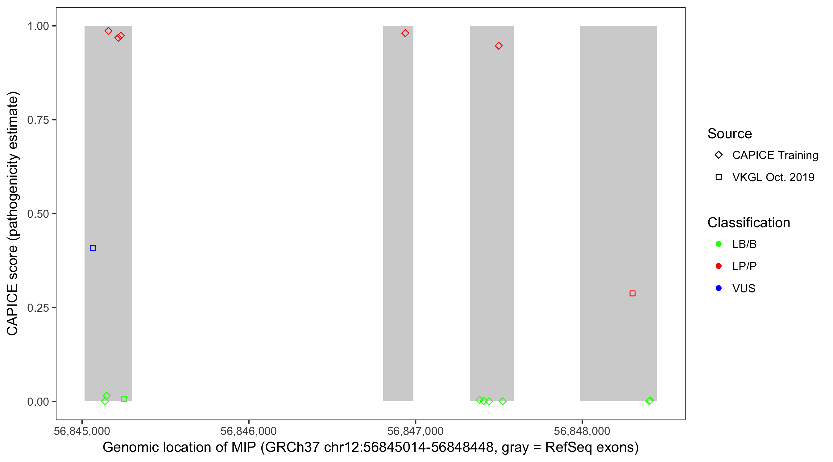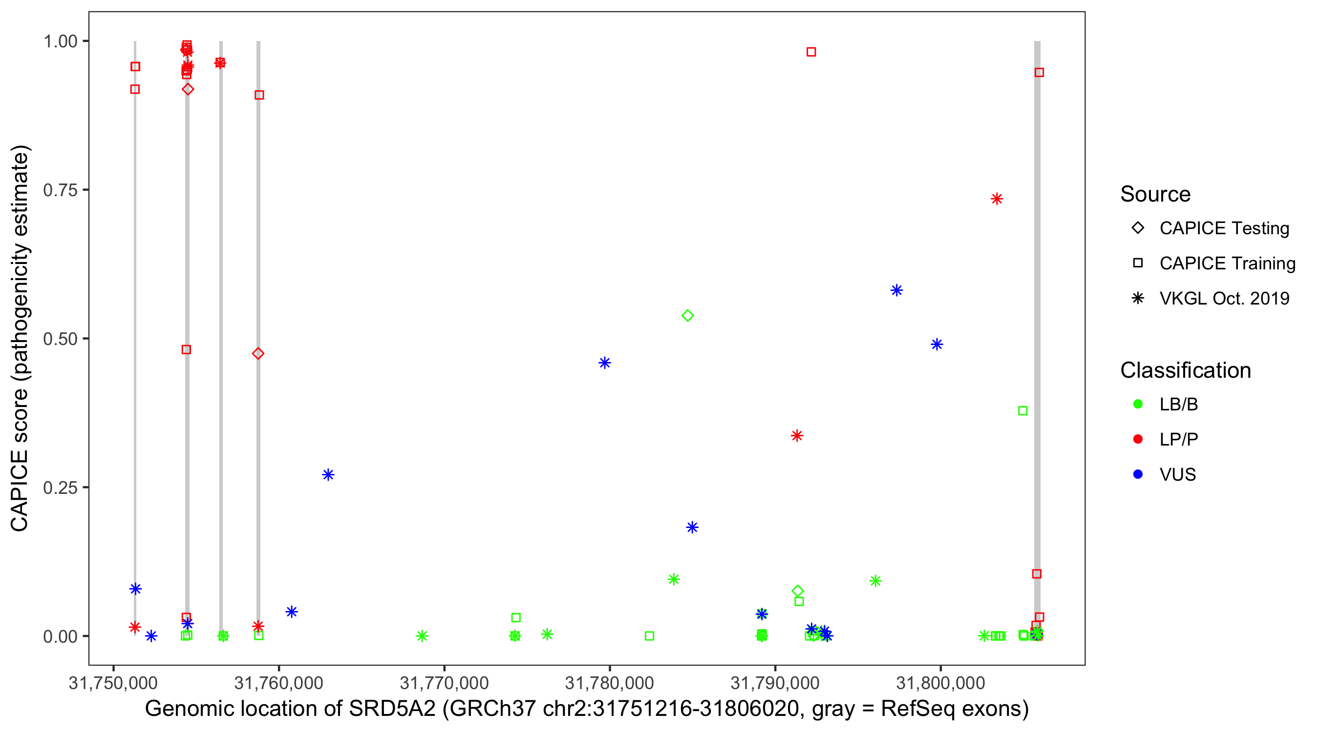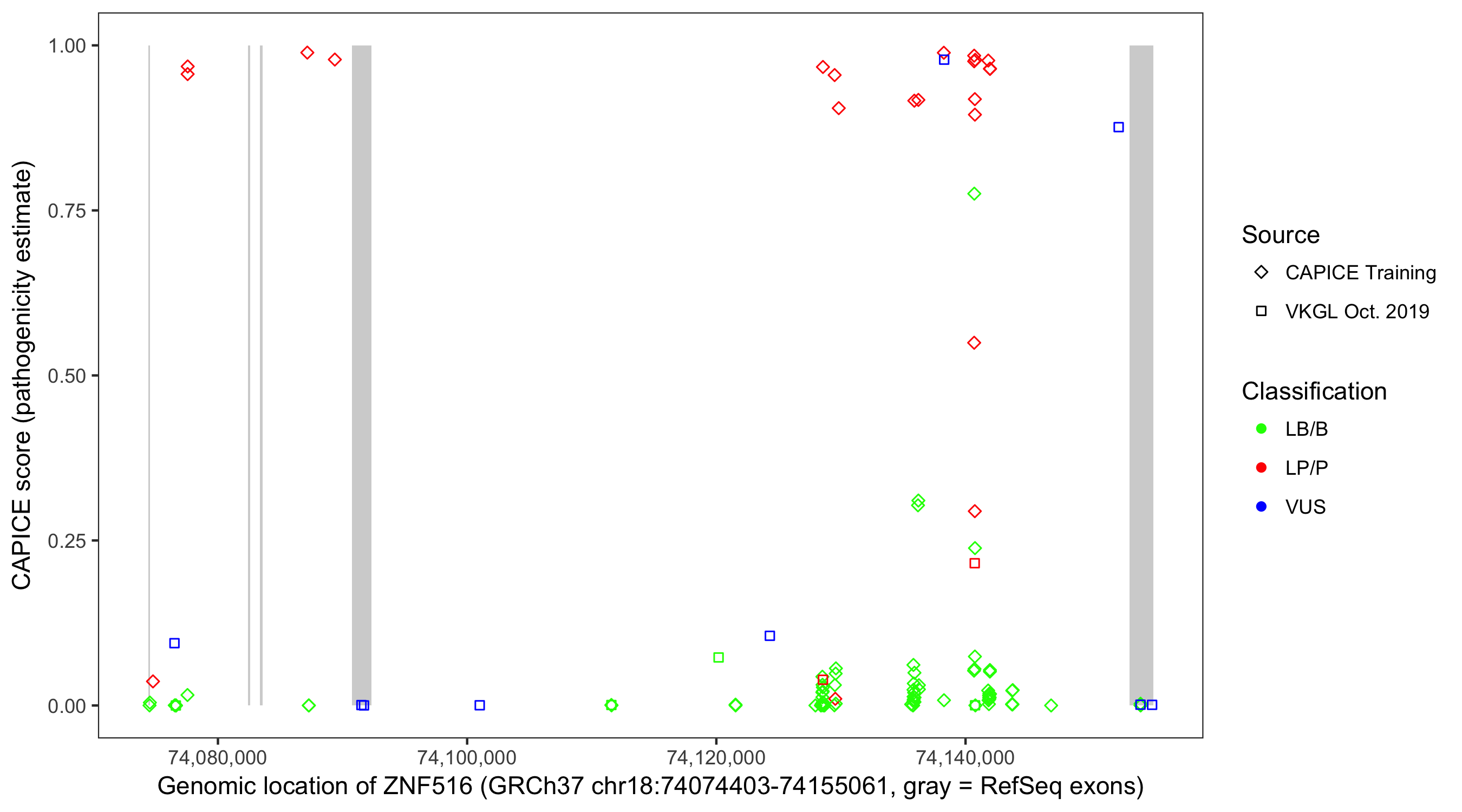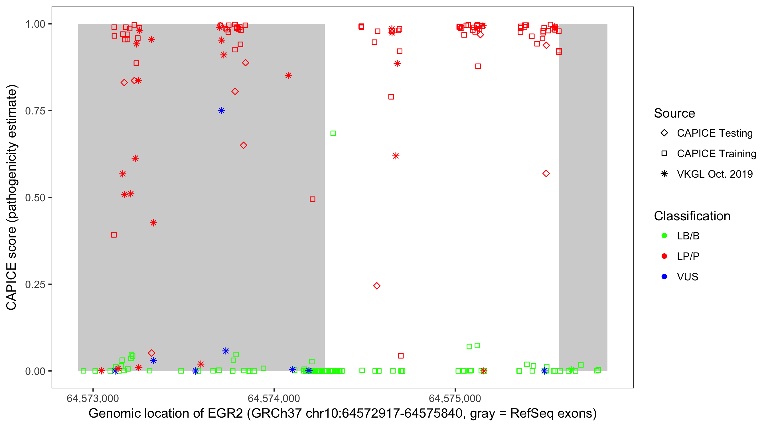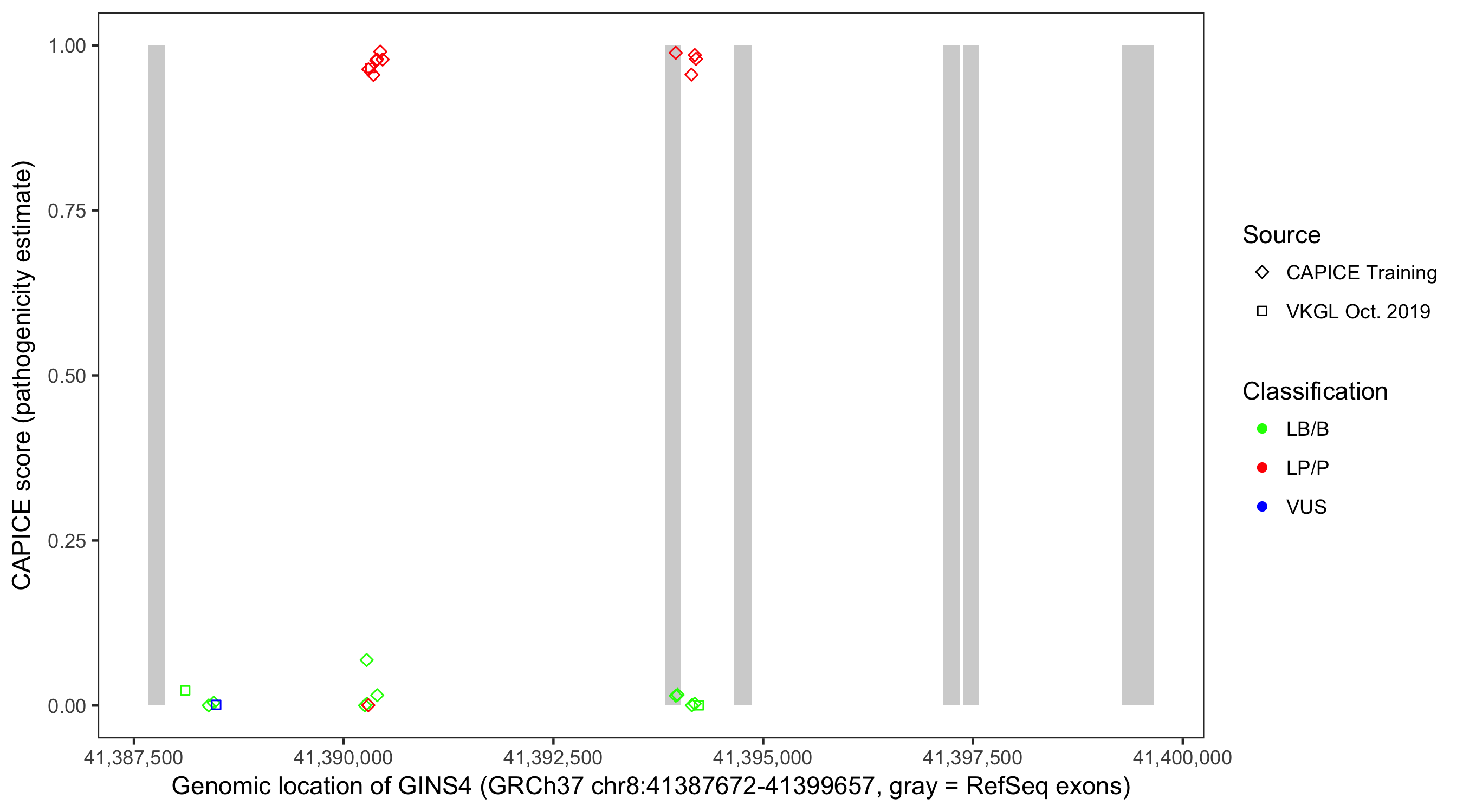 Shown are CAPICE train/test variants plus VKGL Oct 2019.