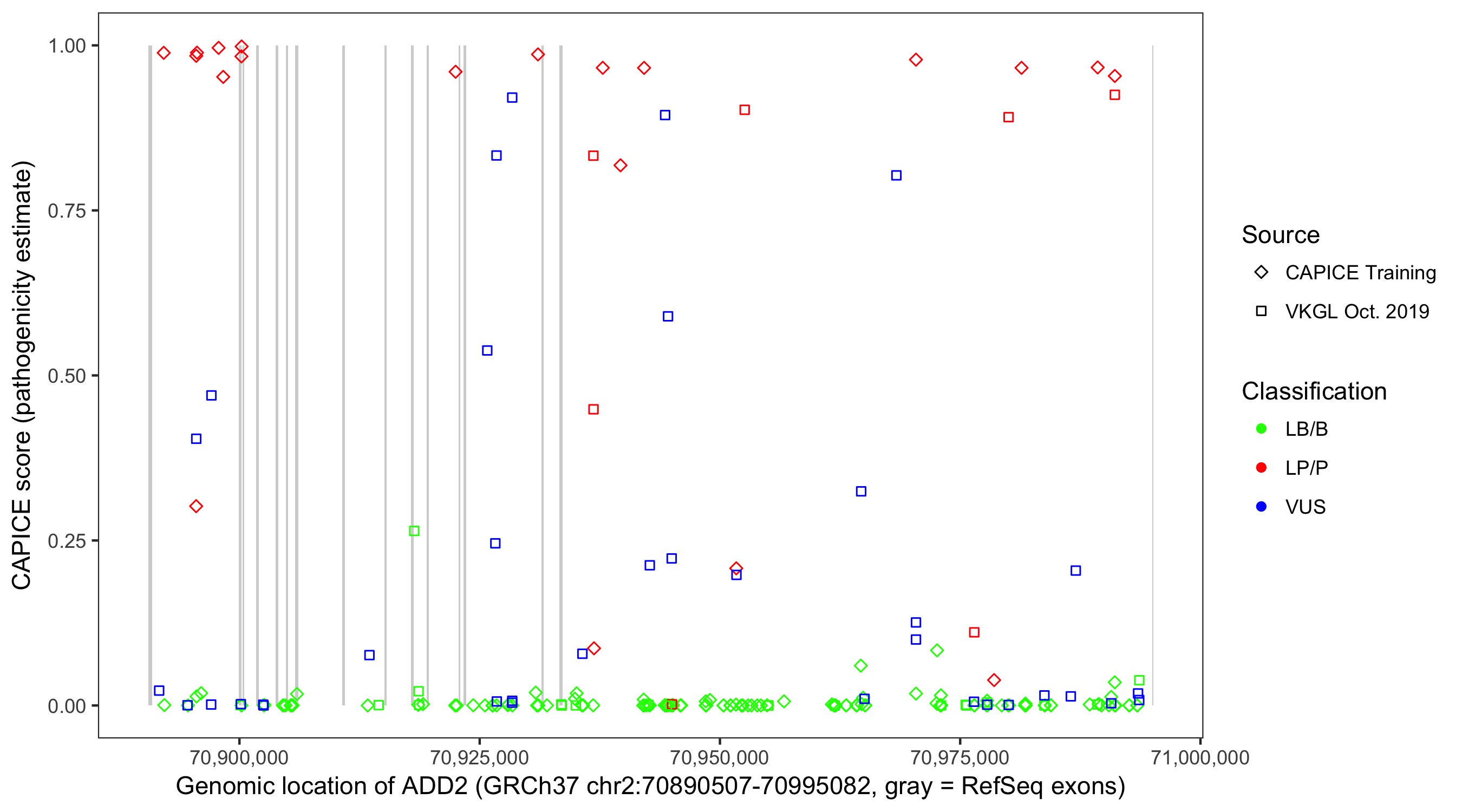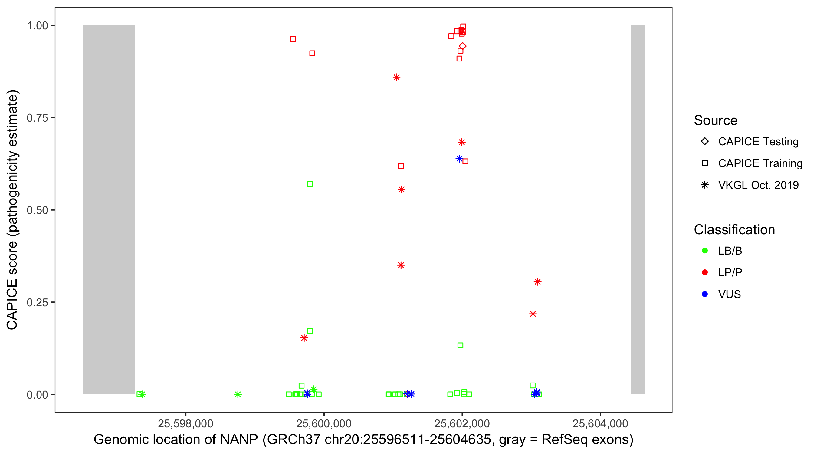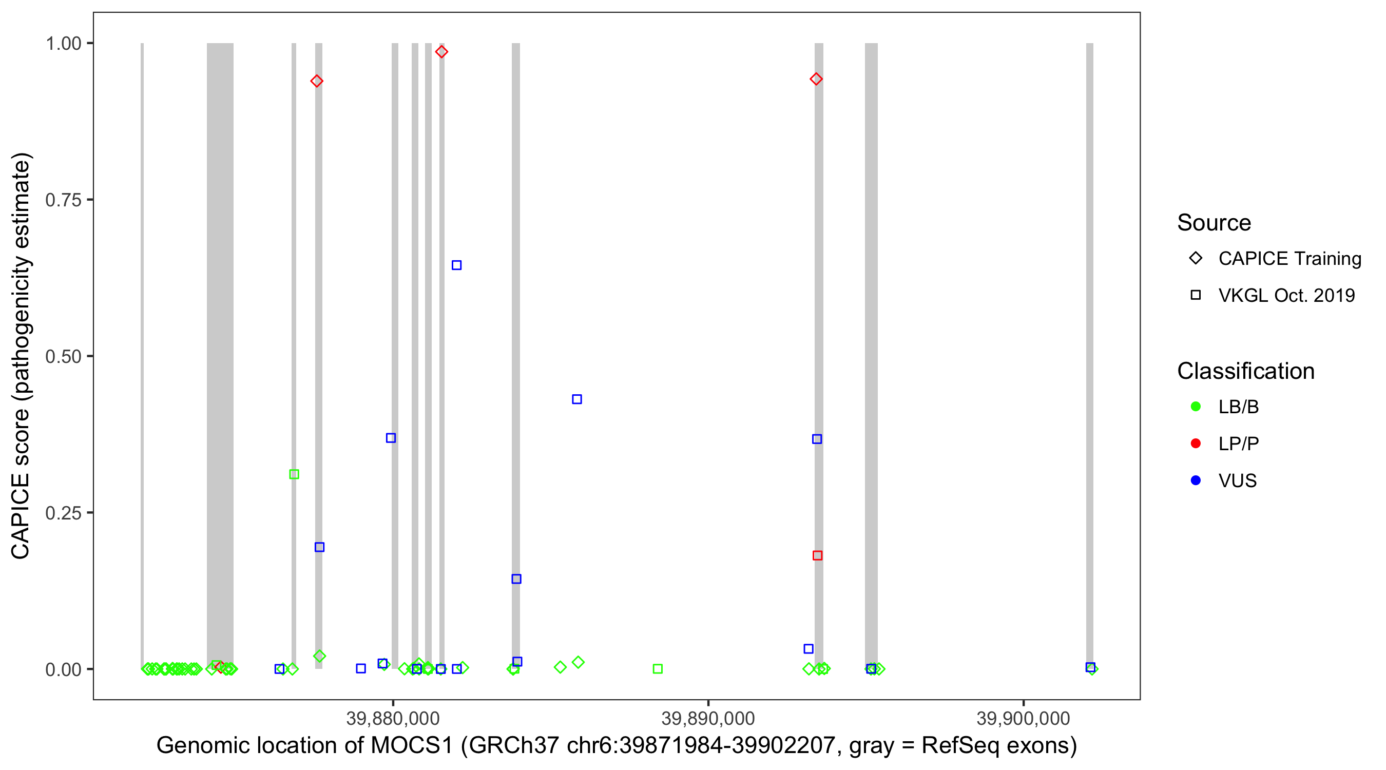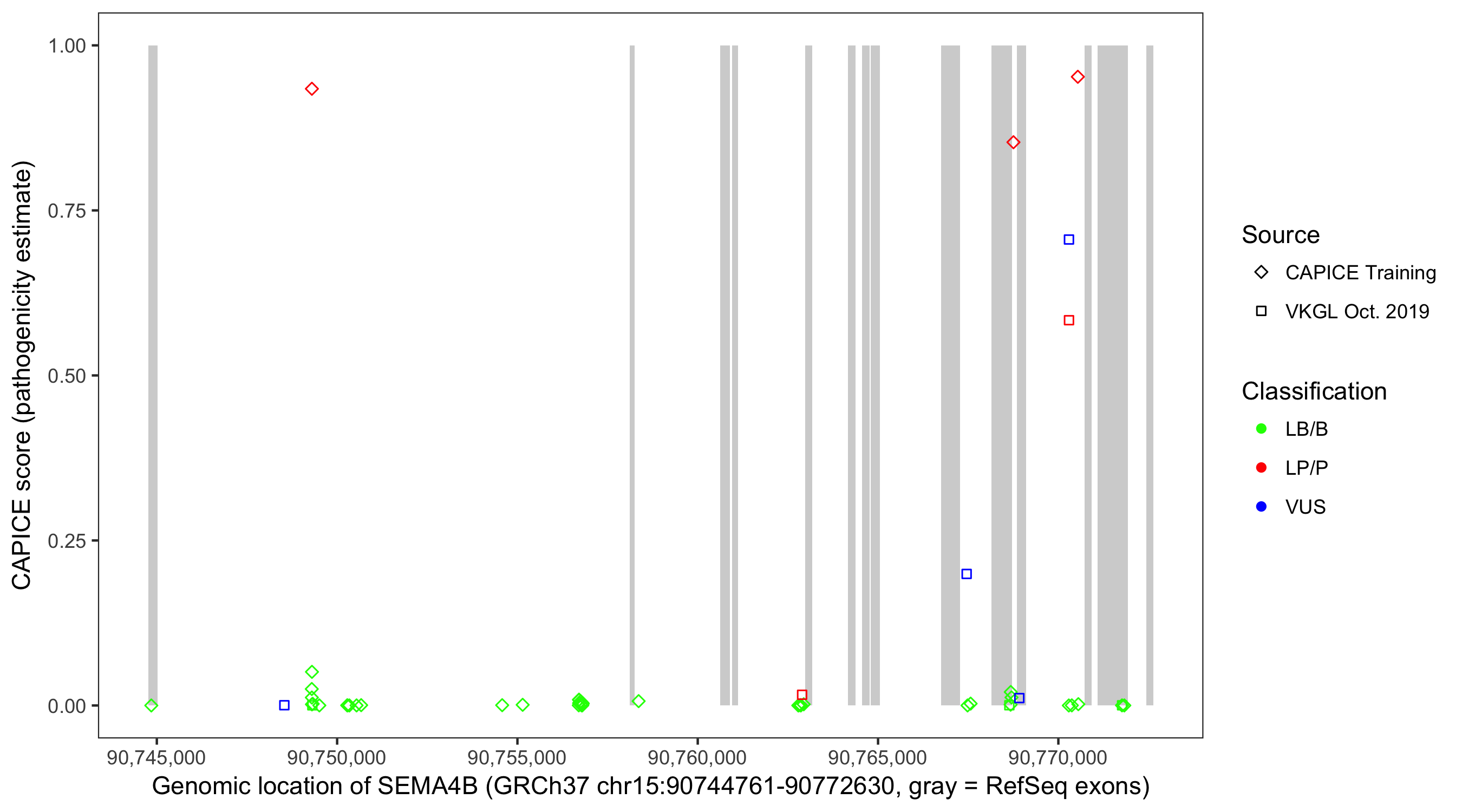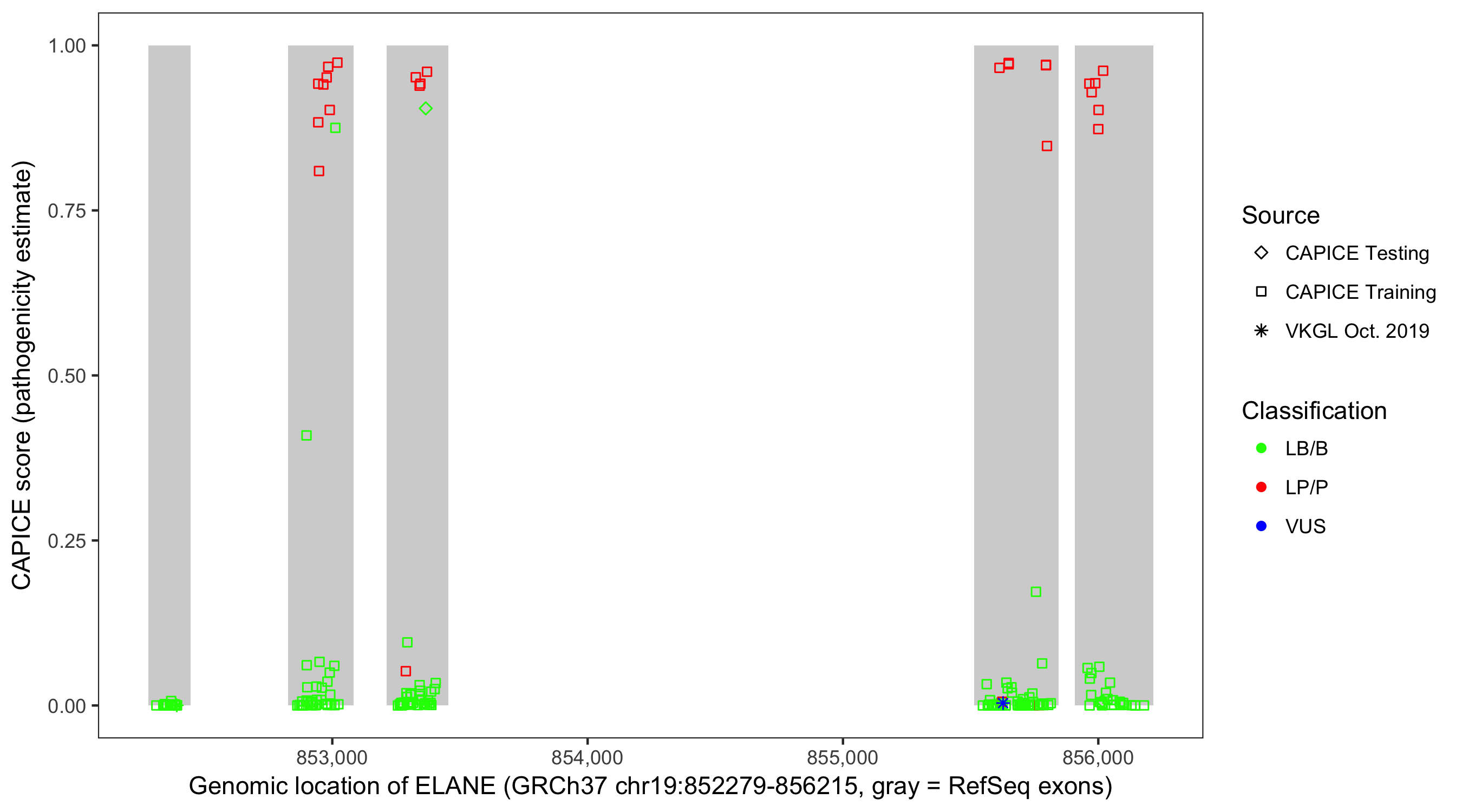 Shown are CAPICE train/test variants plus VKGL Oct 2019.
