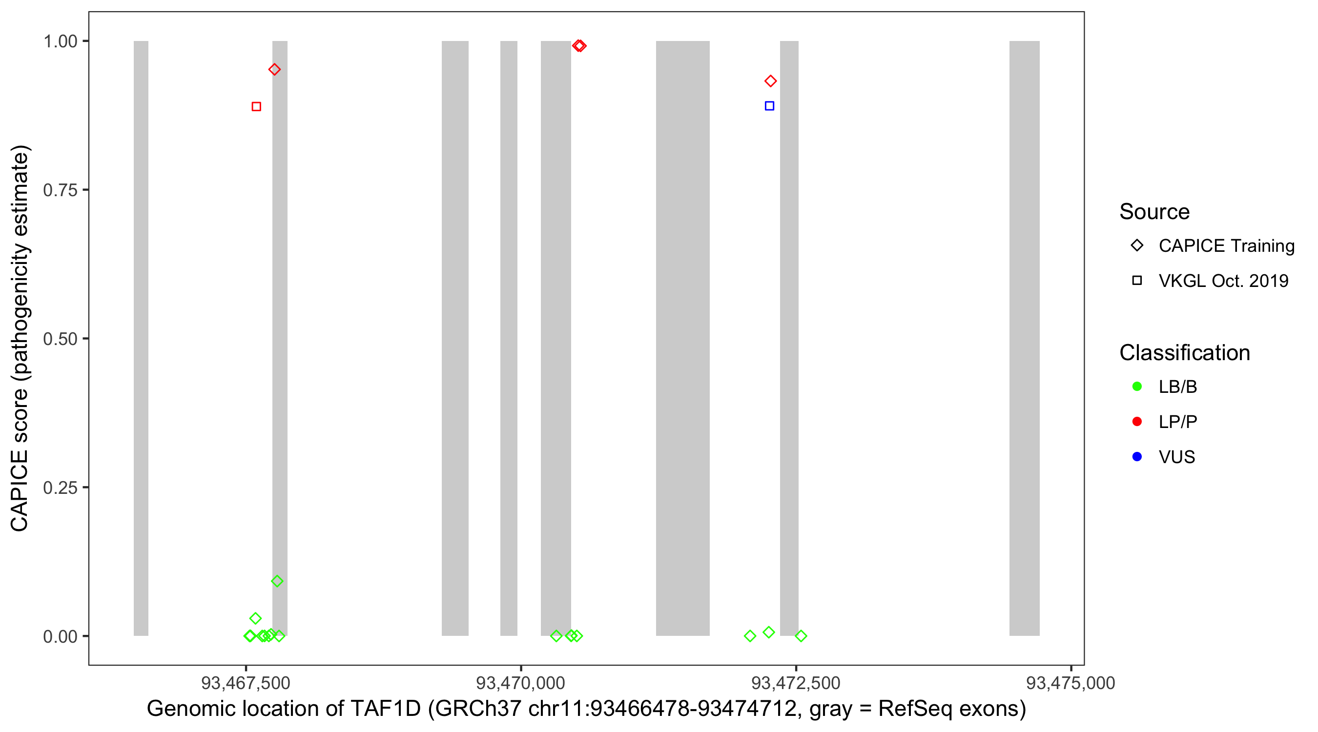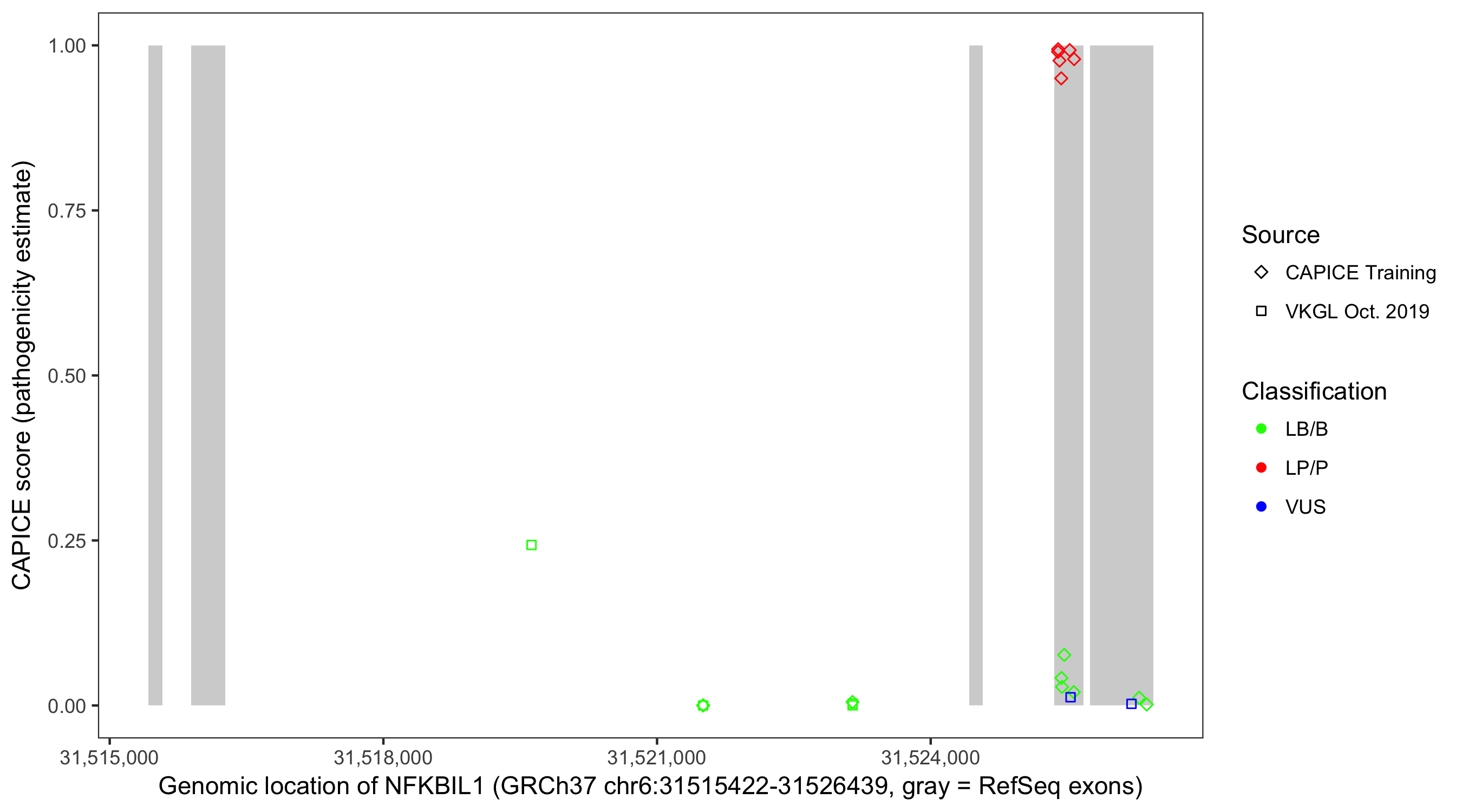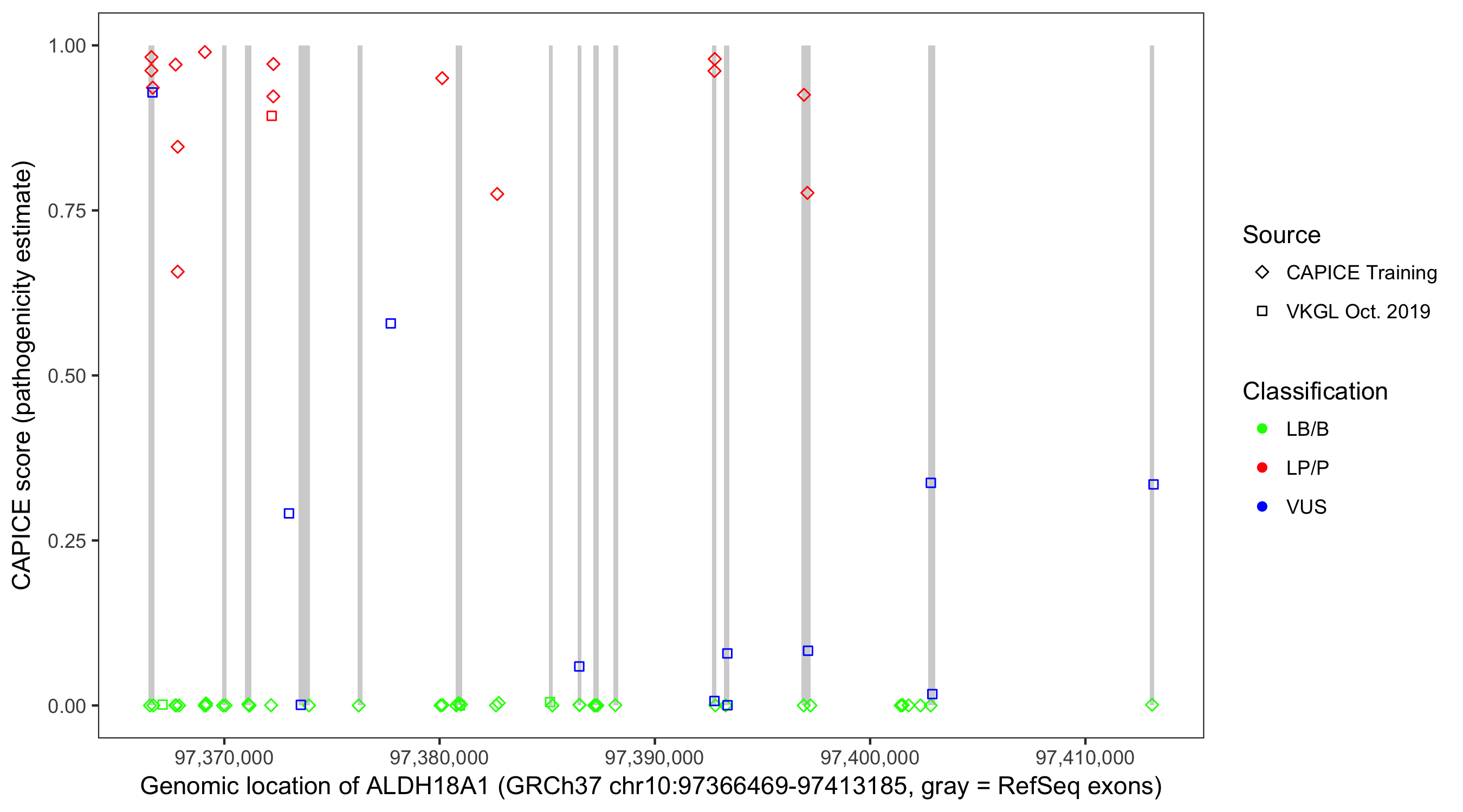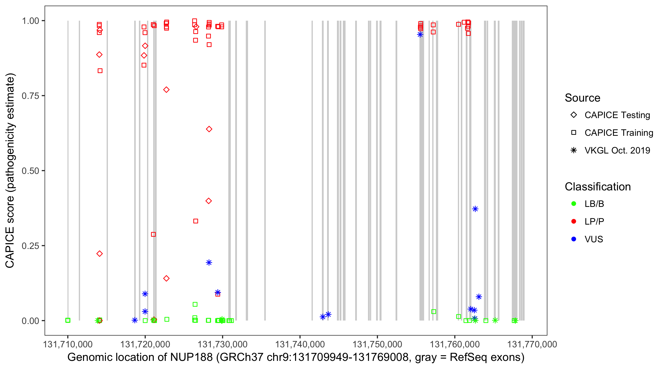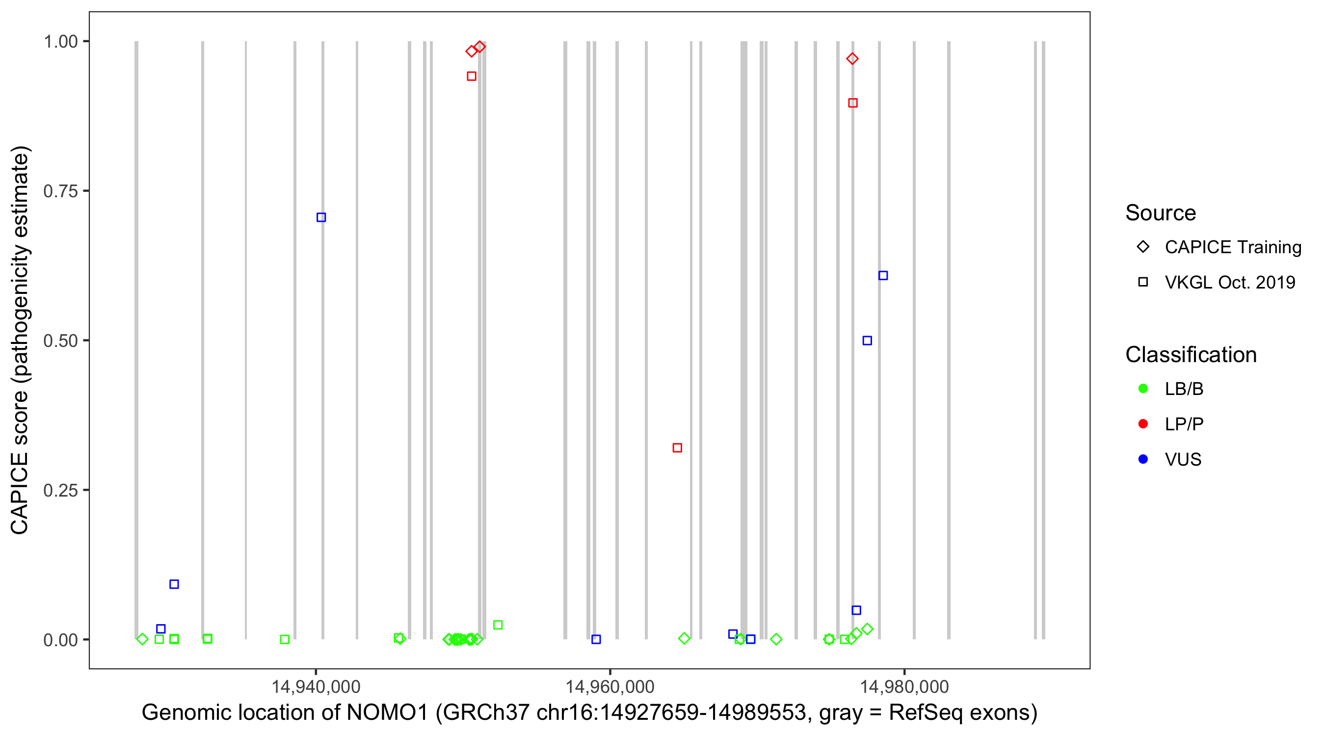 Shown are CAPICE train/test variants plus VKGL Oct 2019.