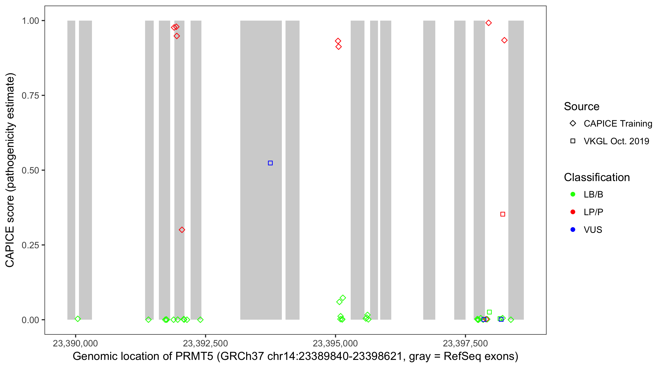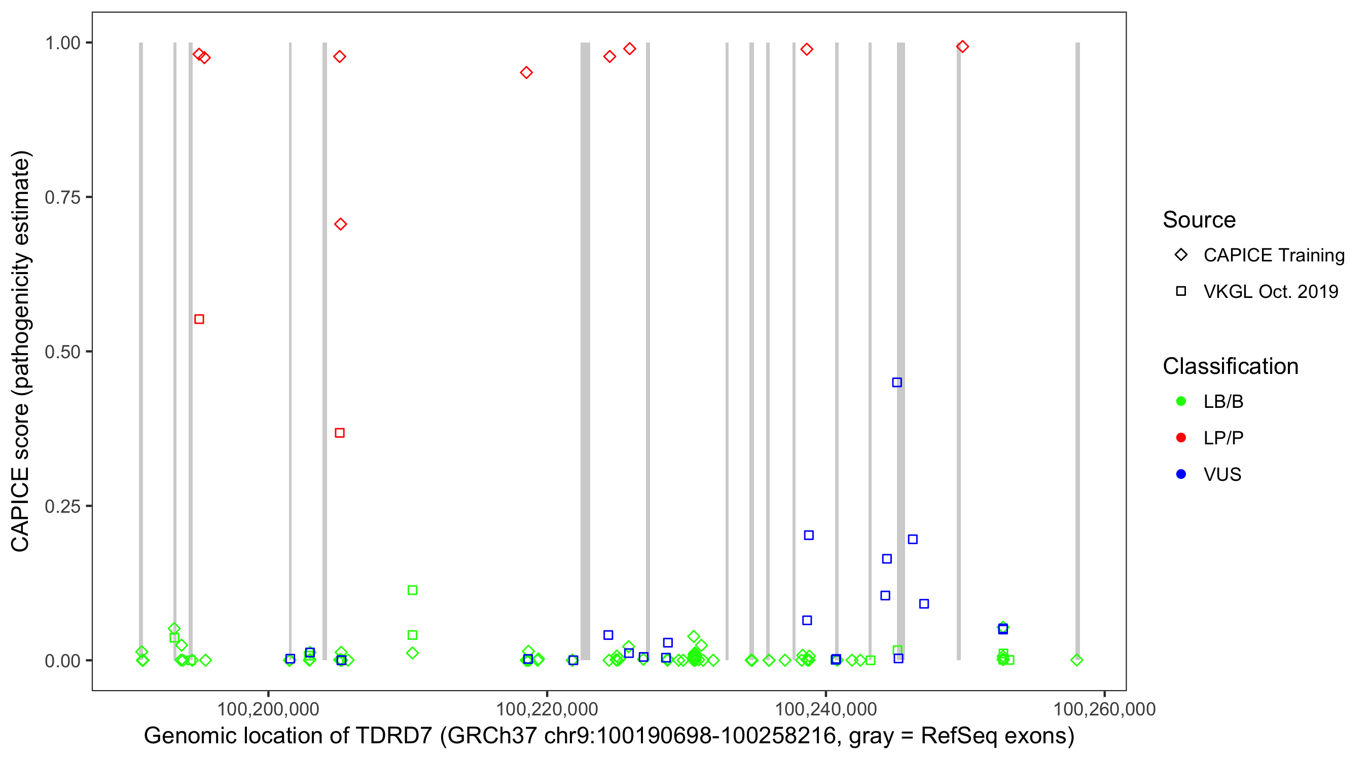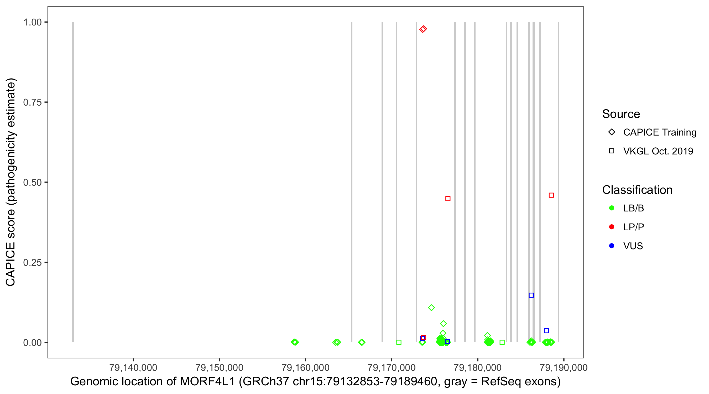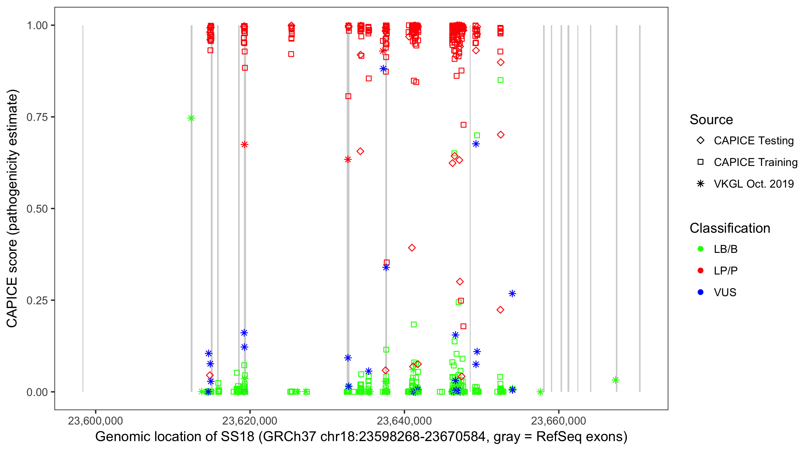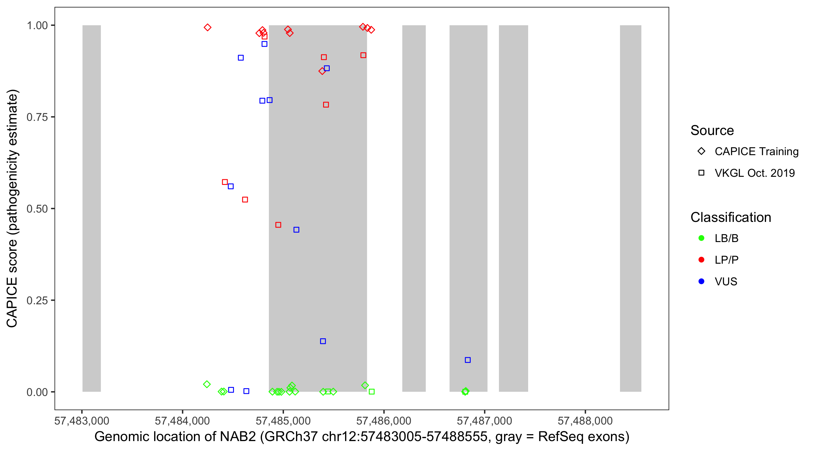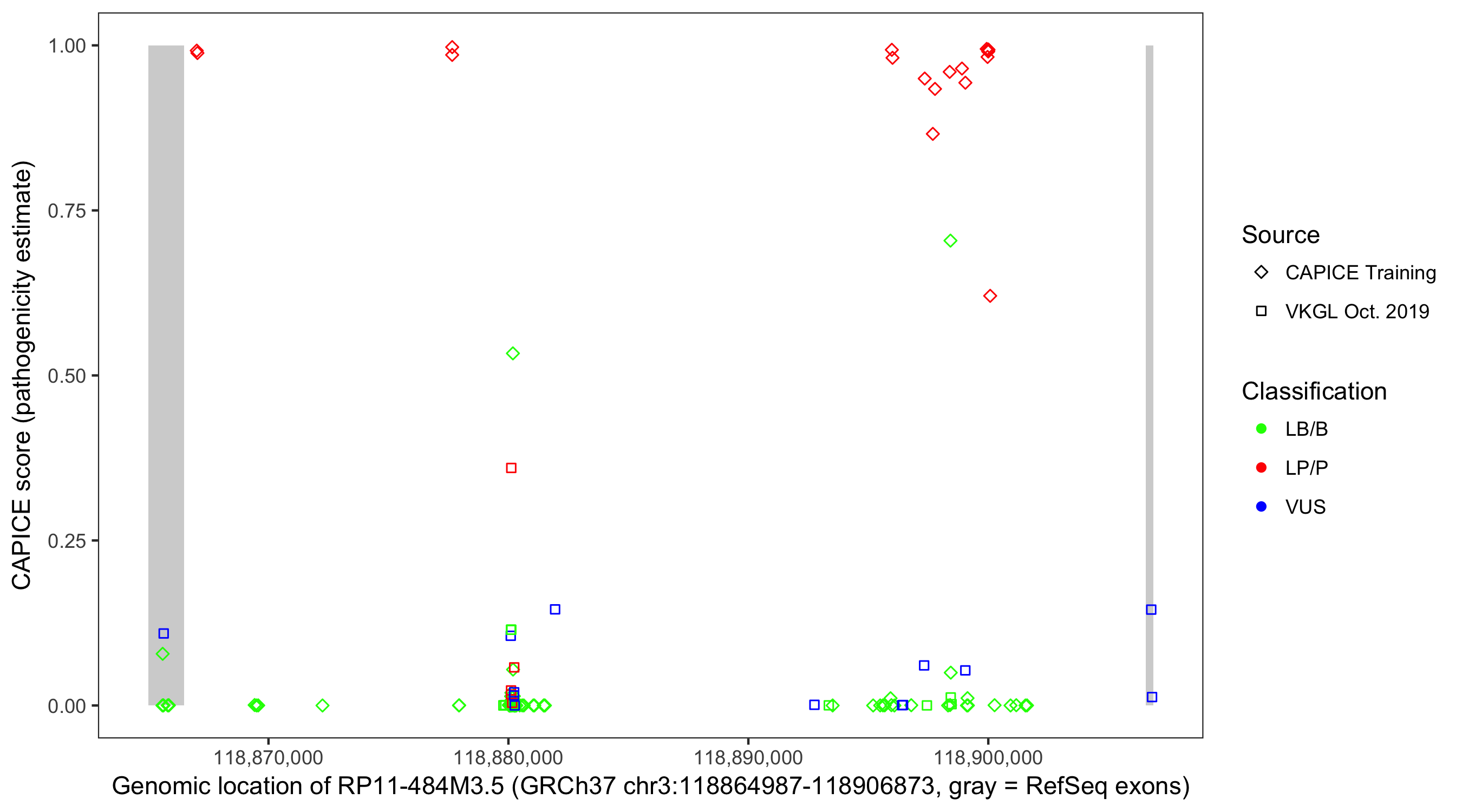 Shown are CAPICE train/test variants plus VKGL Oct 2019.