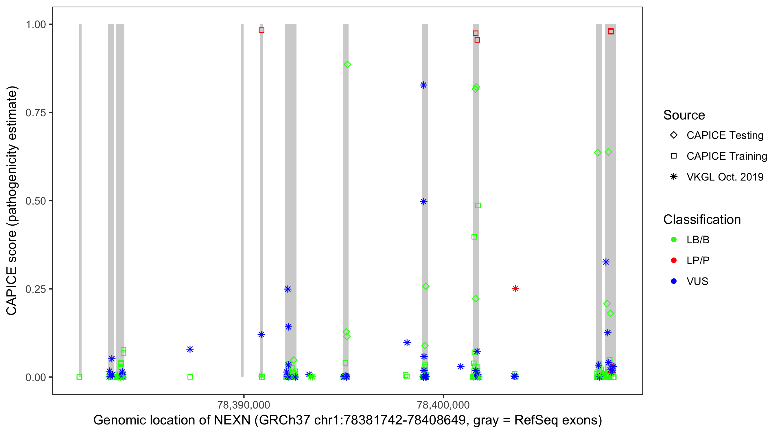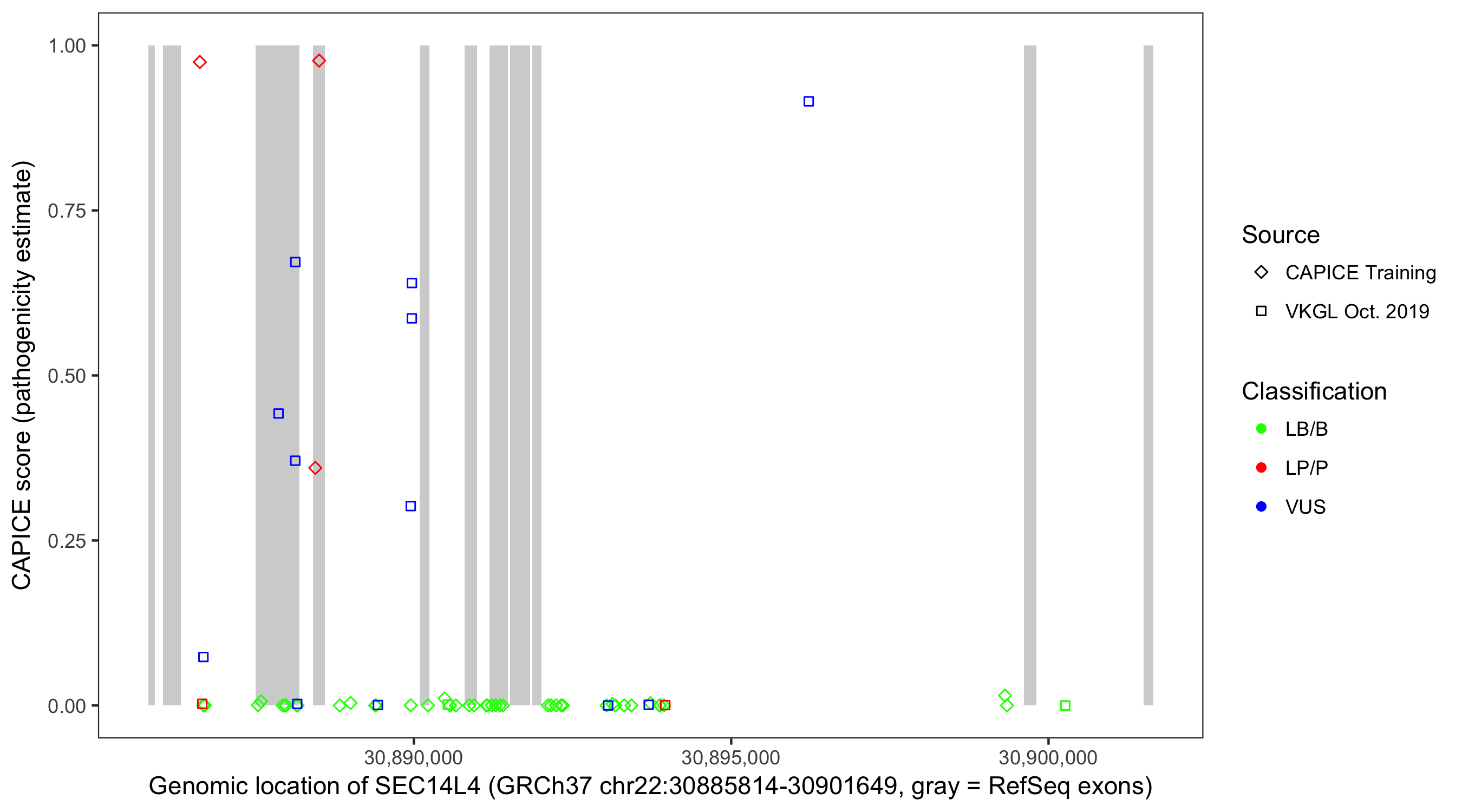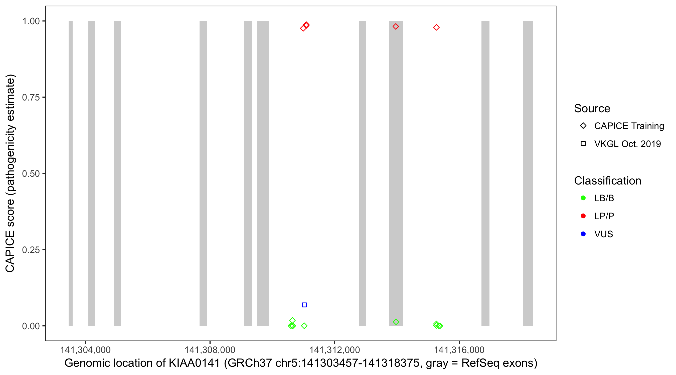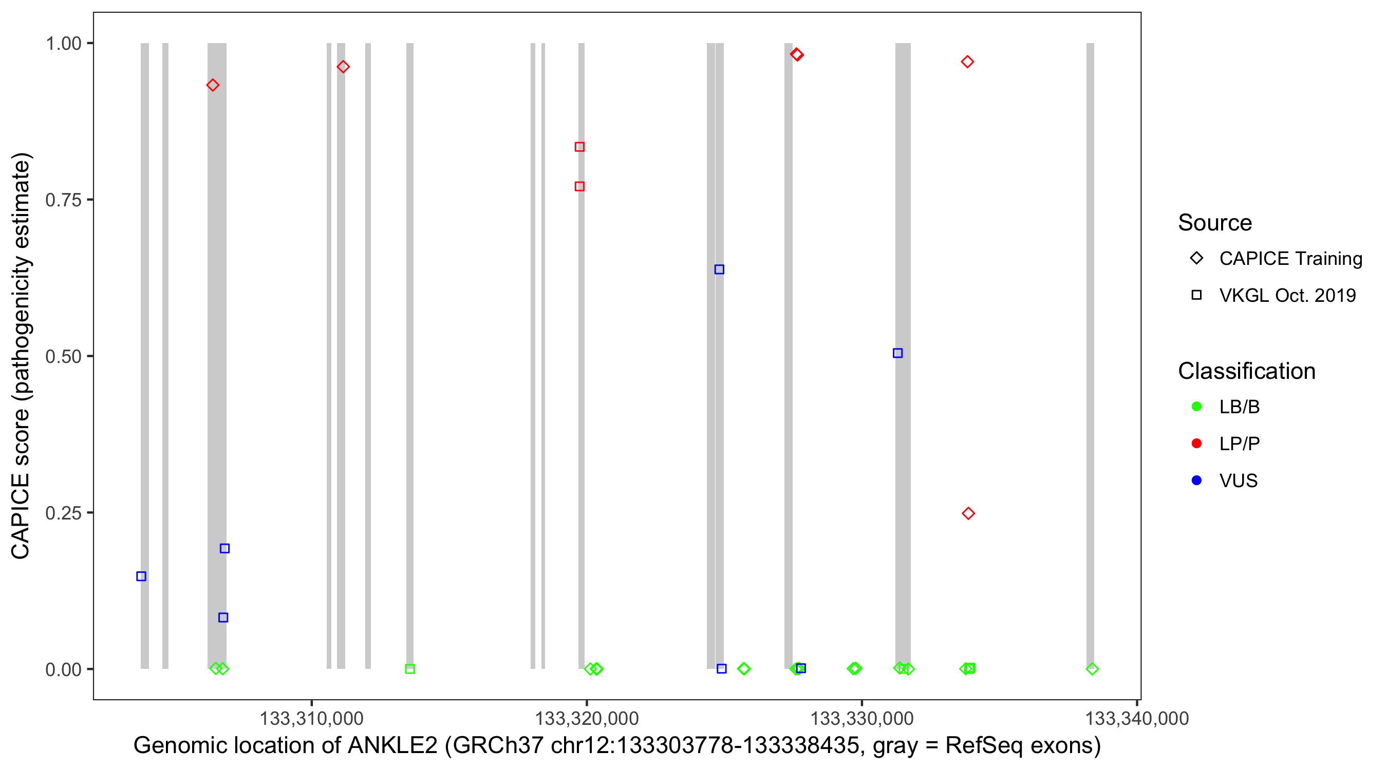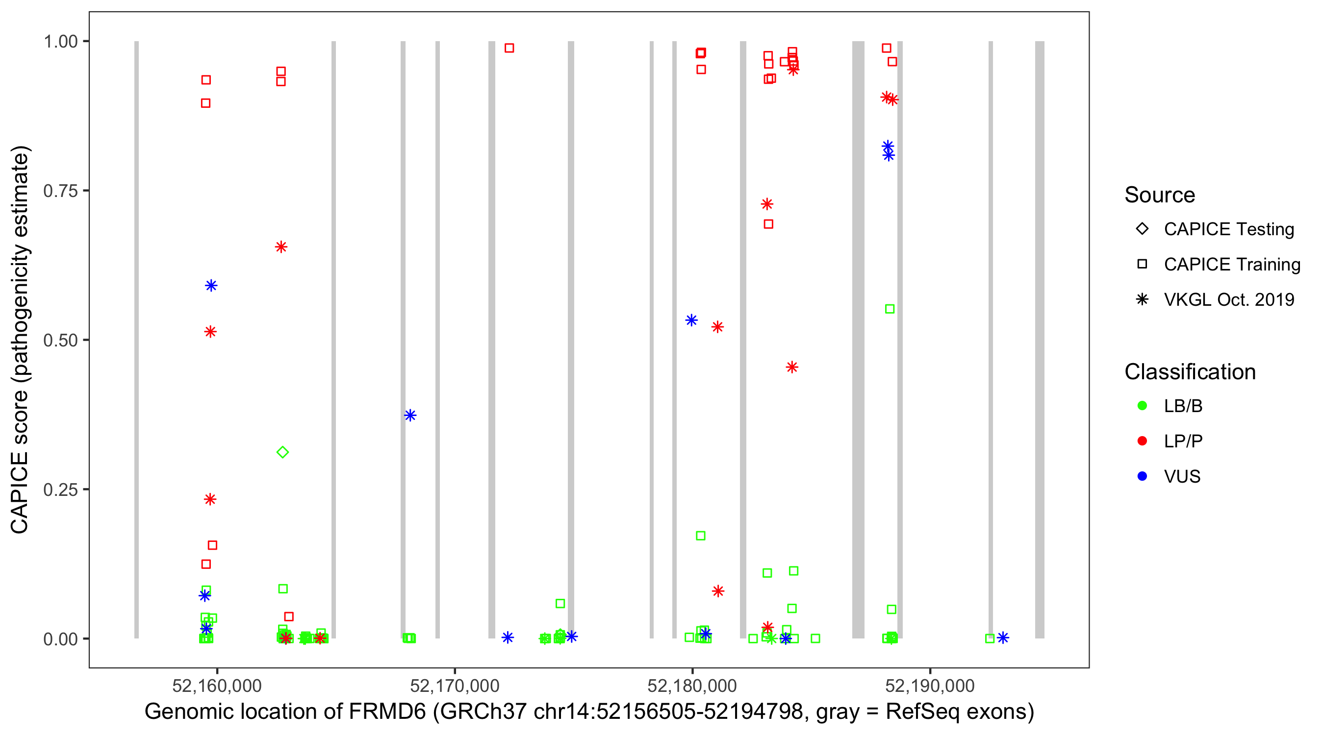 Shown are CAPICE train/test variants plus VKGL Oct 2019.