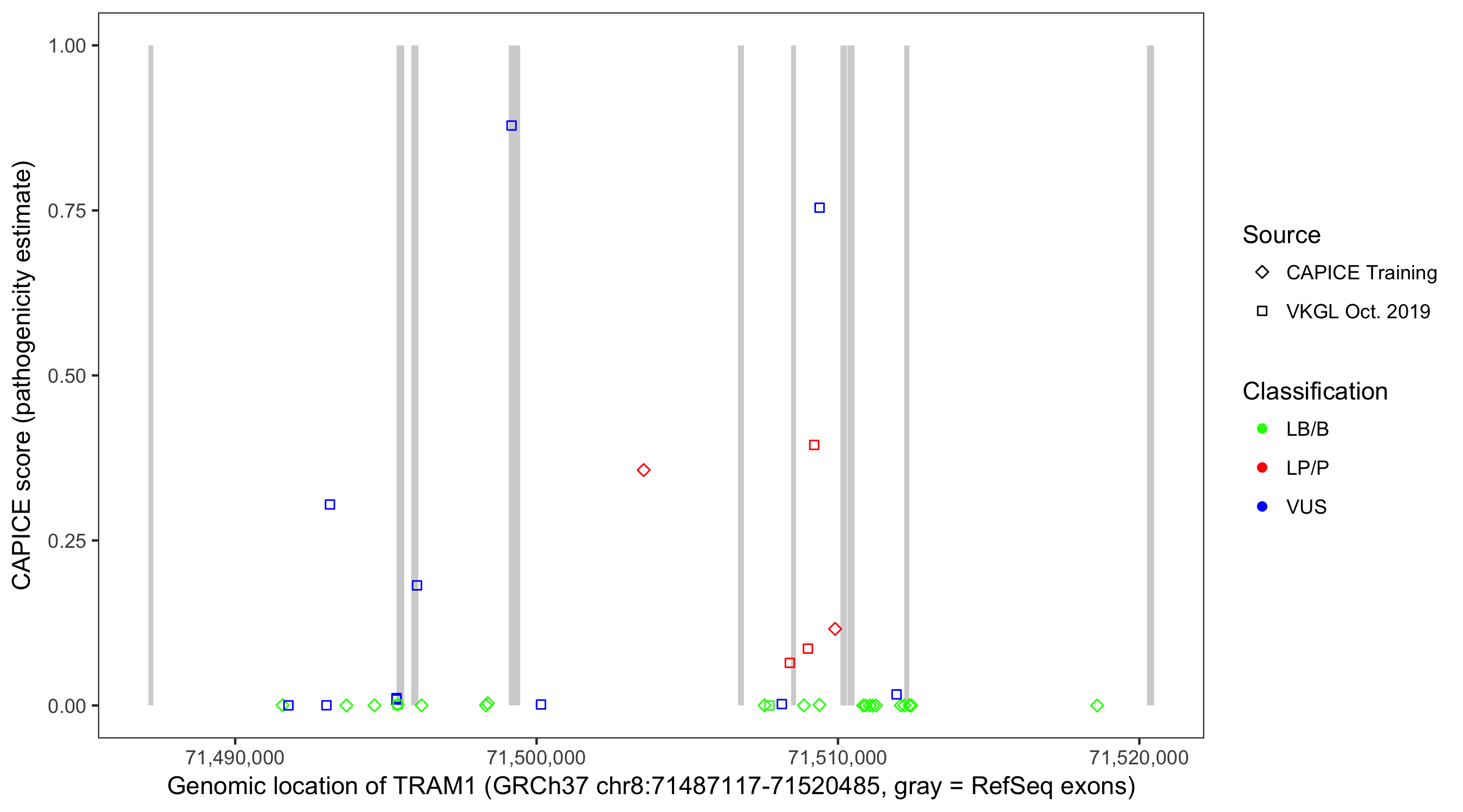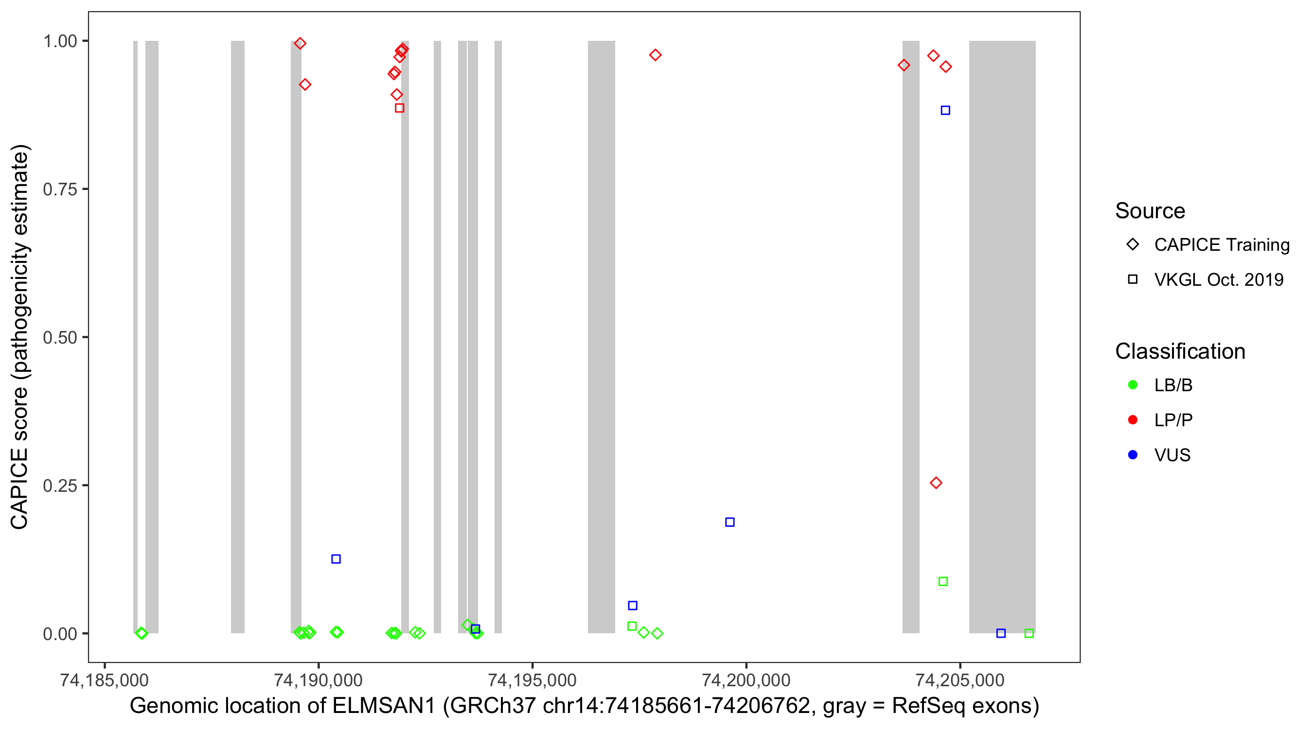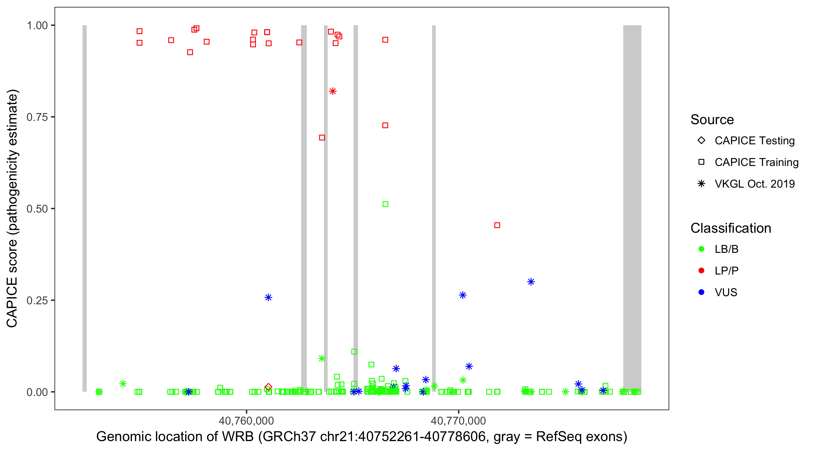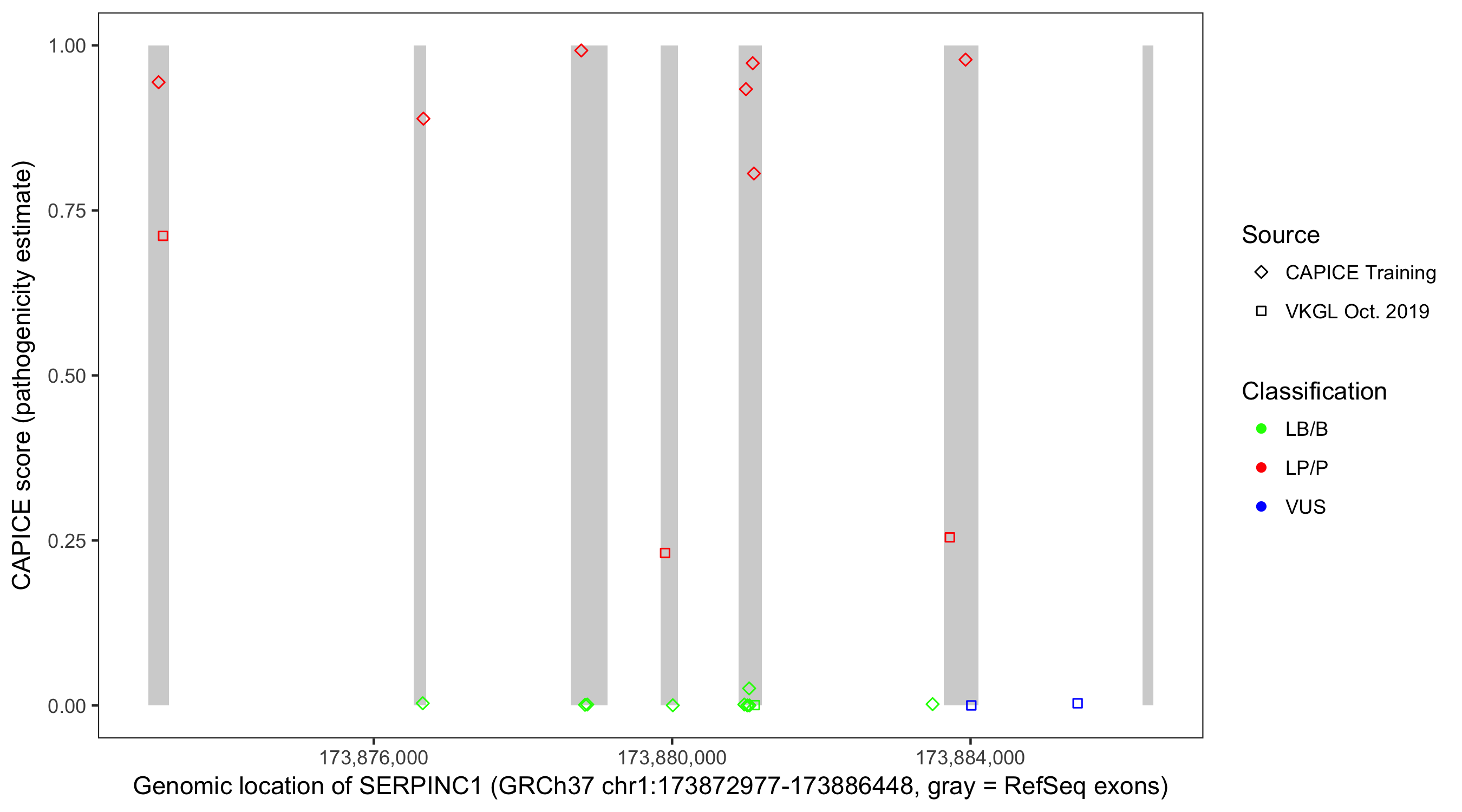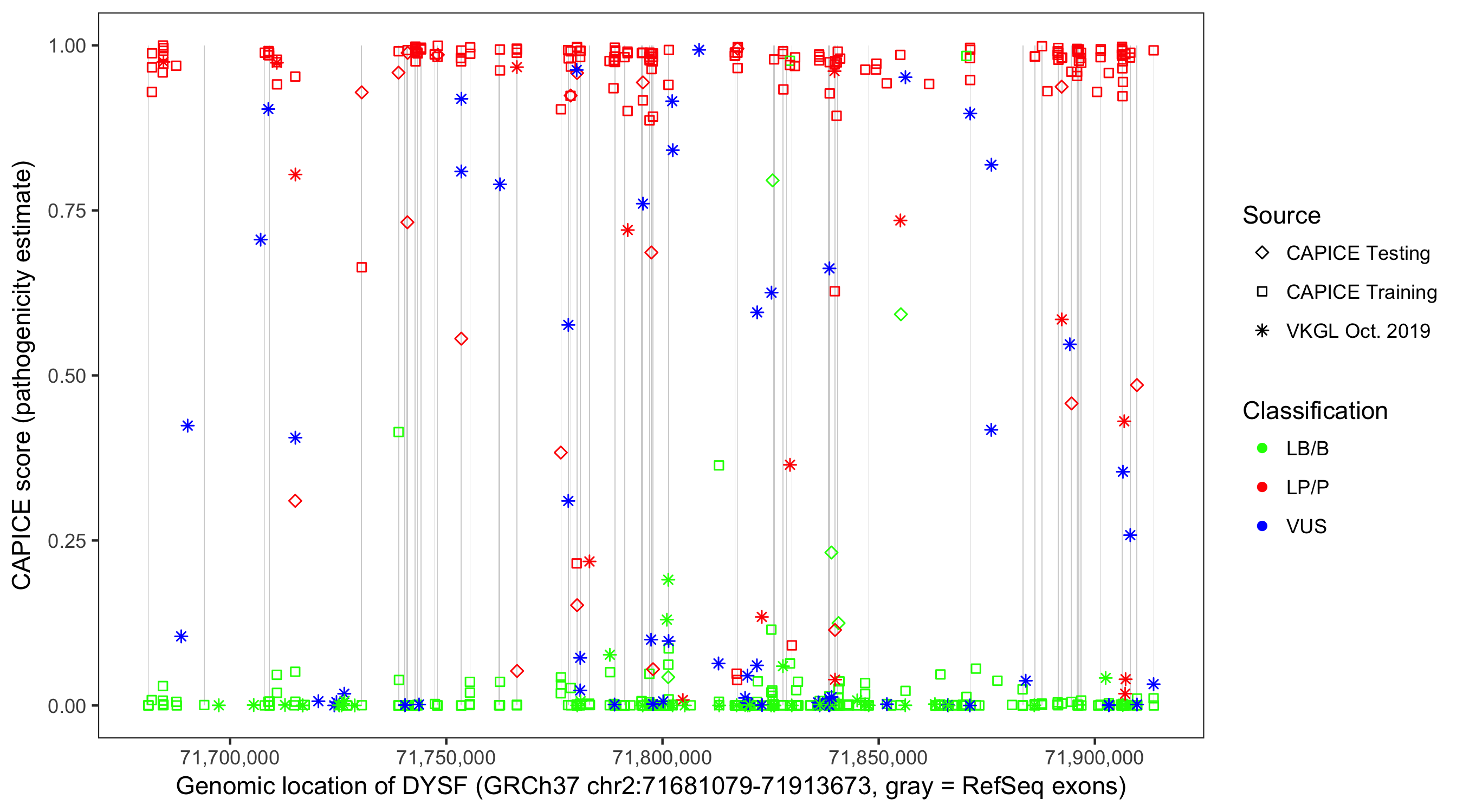 Shown are CAPICE train/test variants plus VKGL Oct 2019.