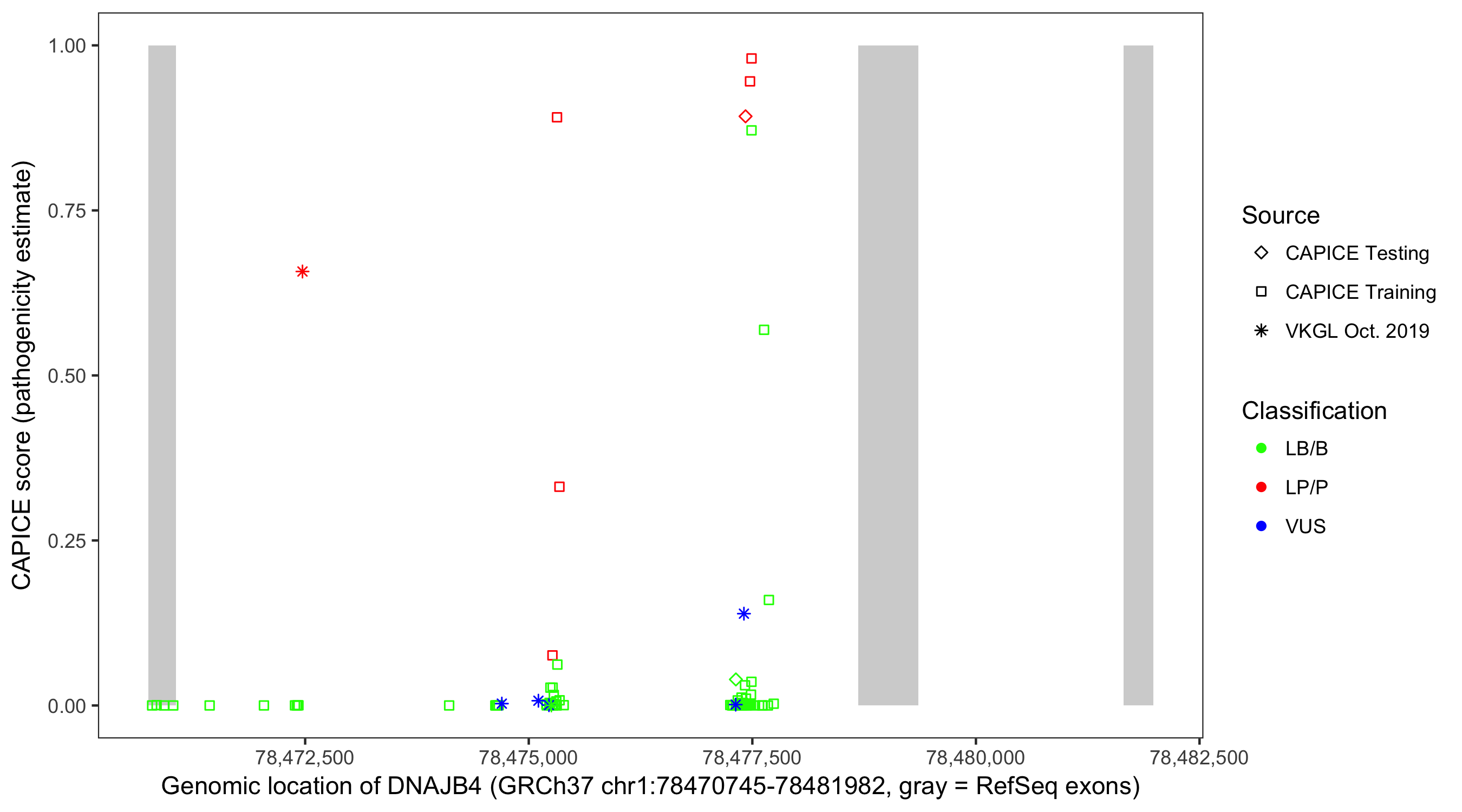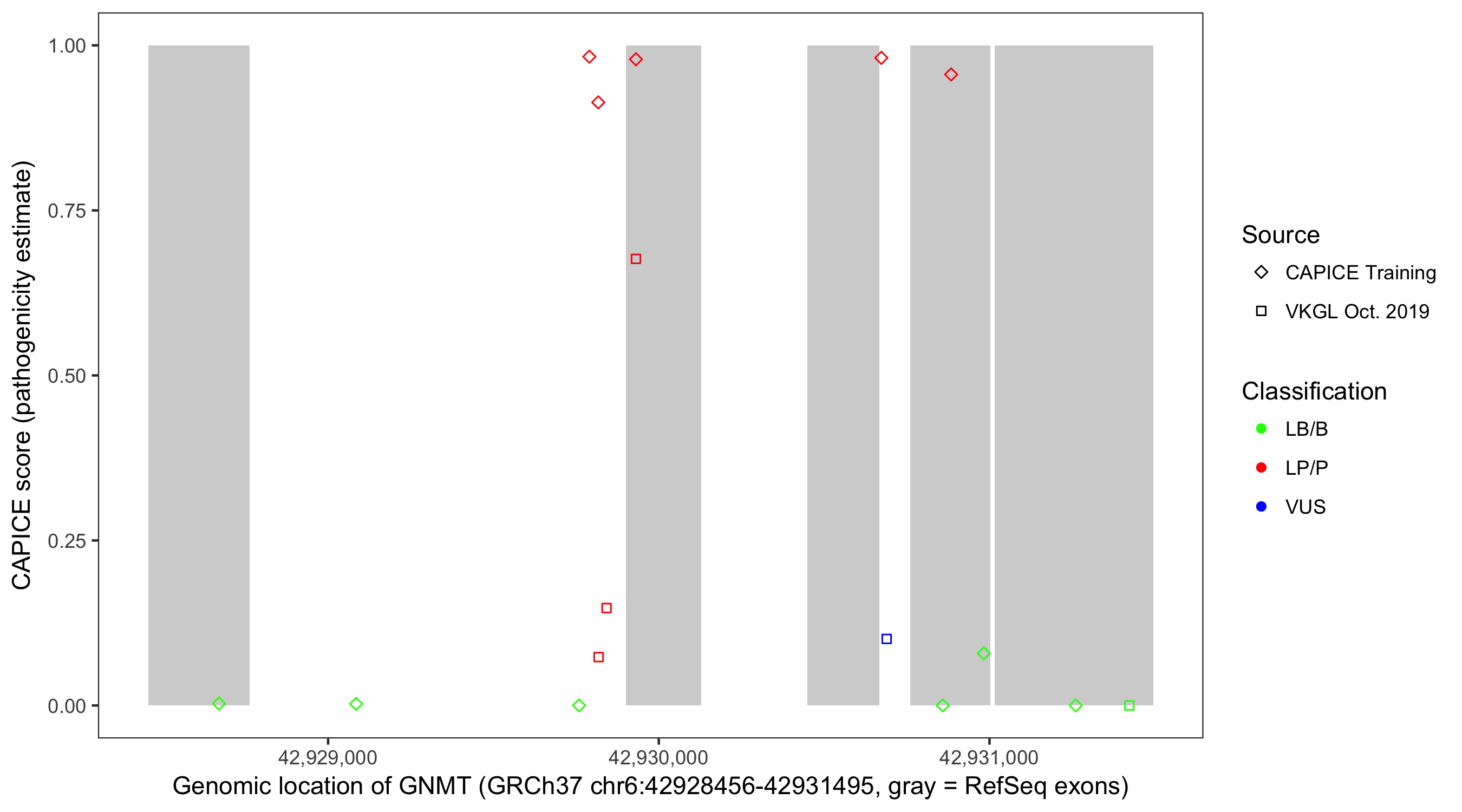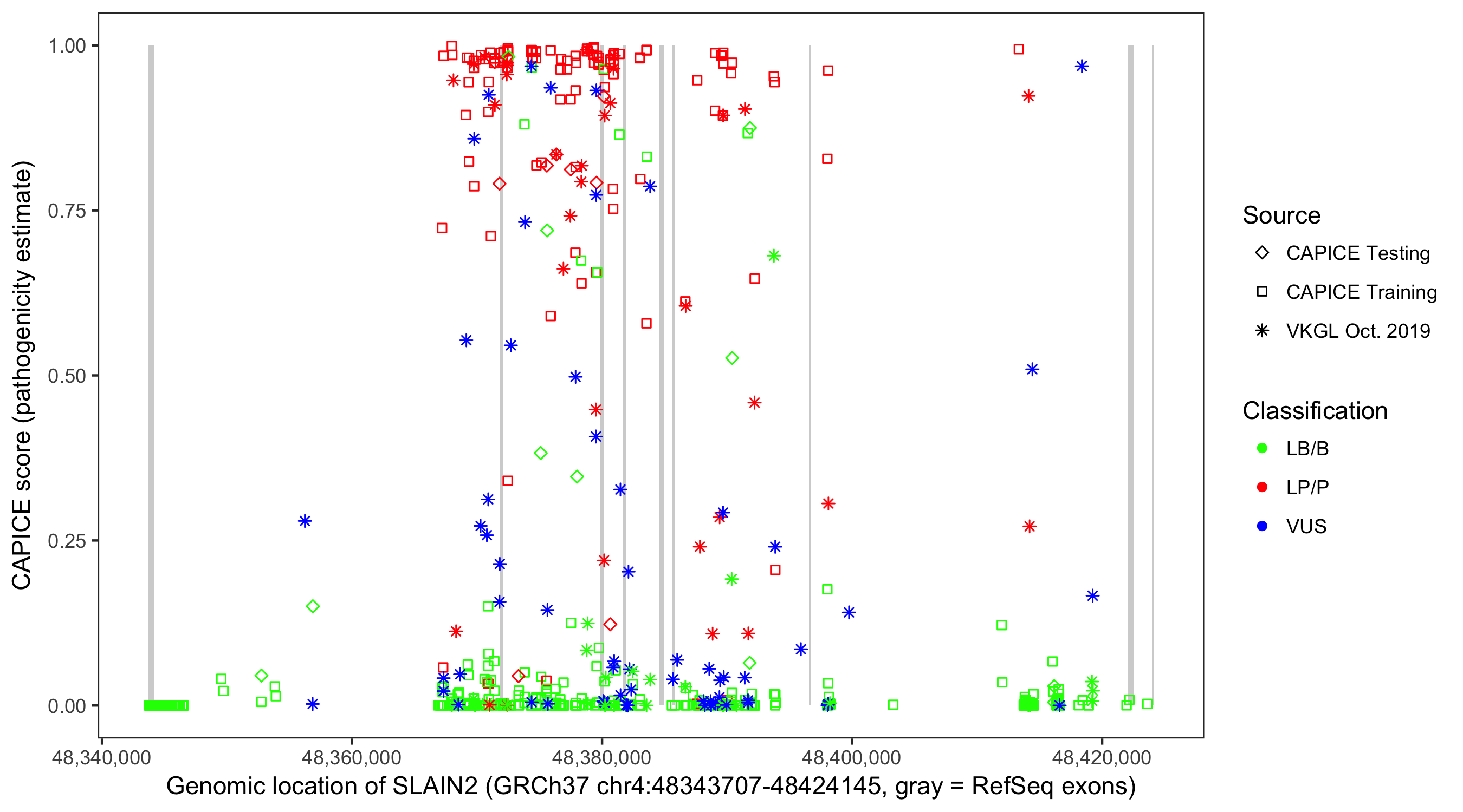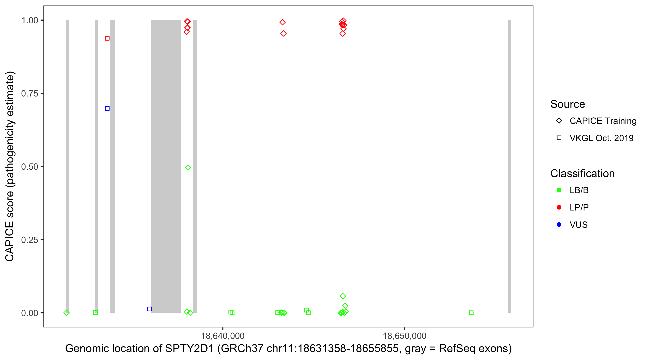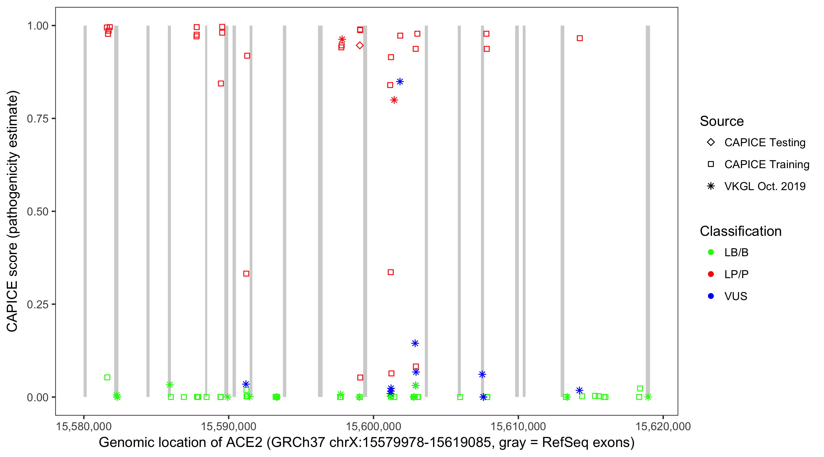 Shown are CAPICE train/test variants plus VKGL Oct 2019.