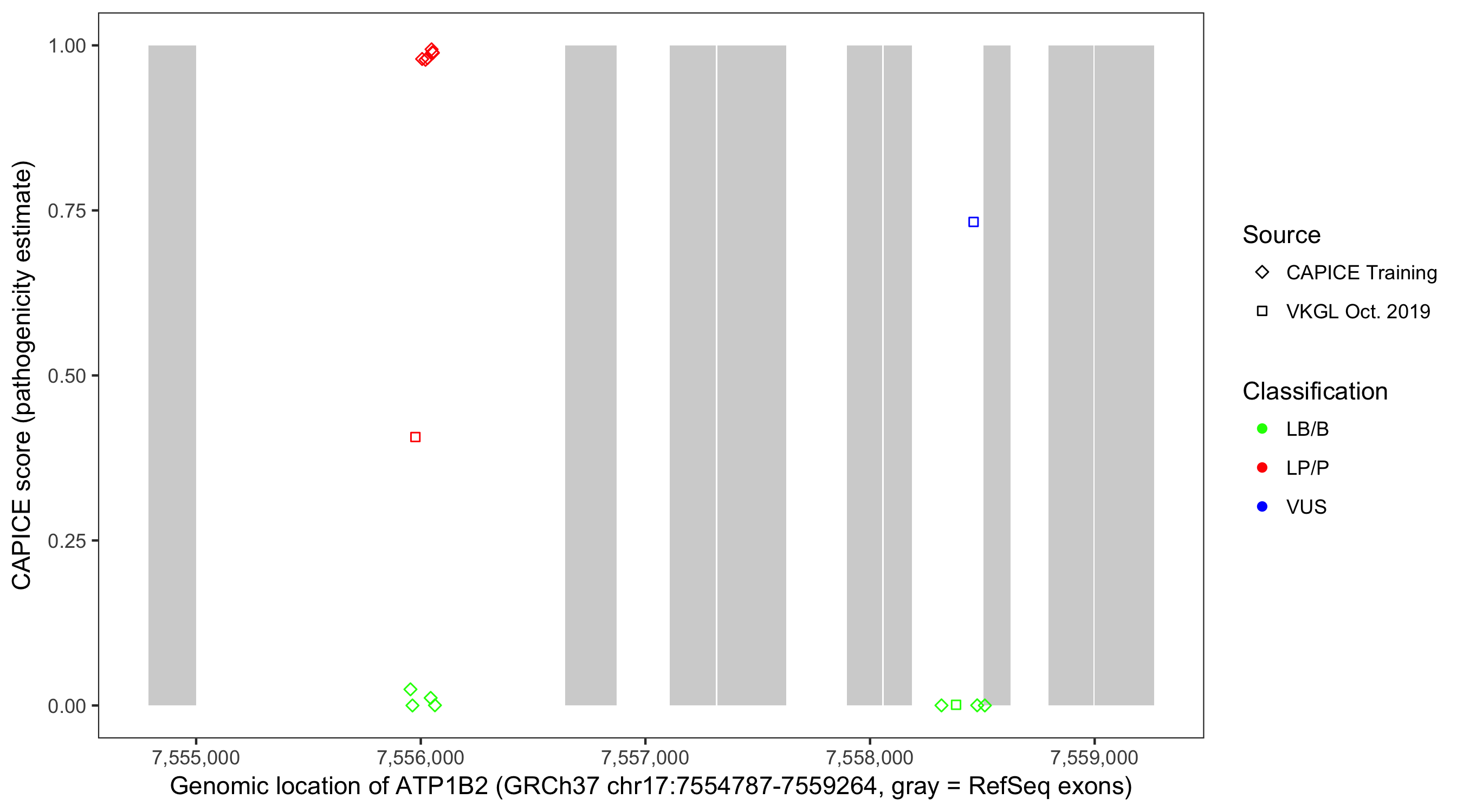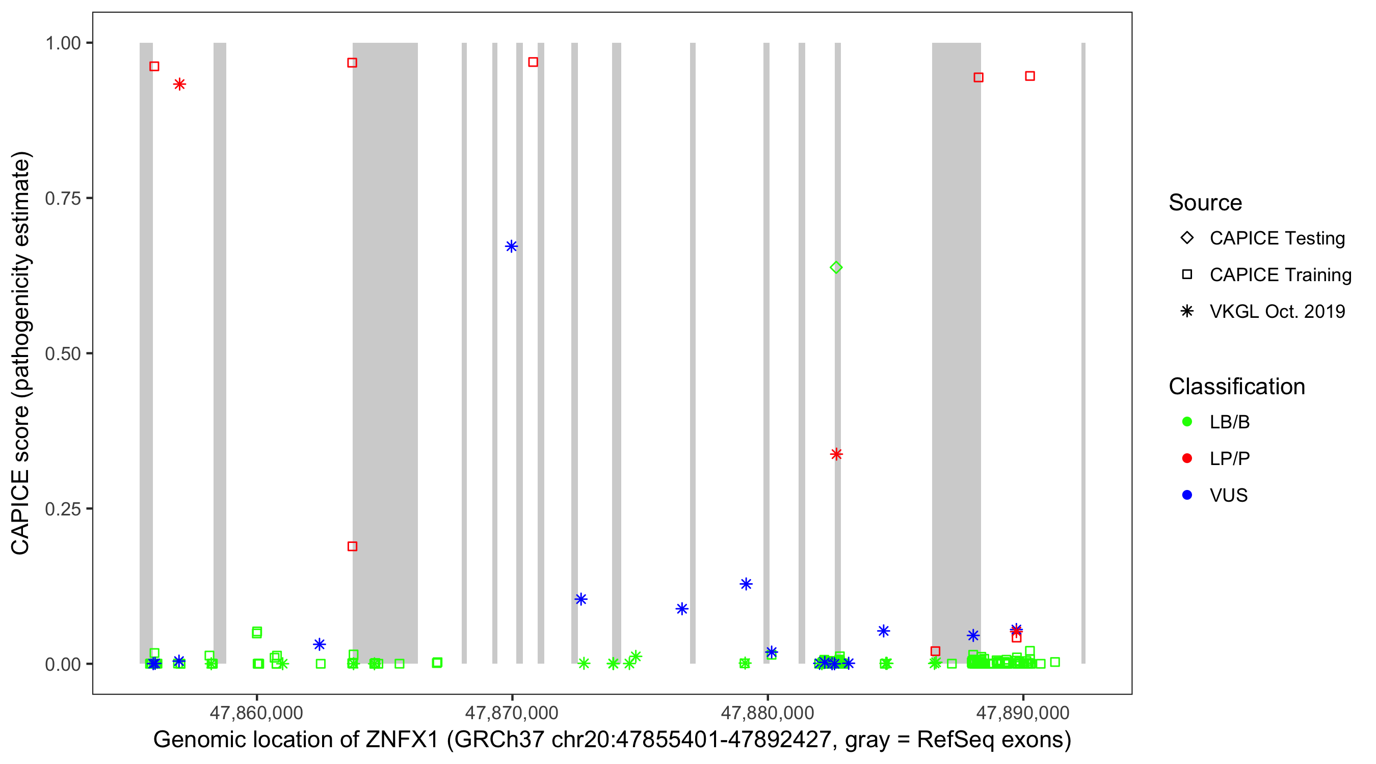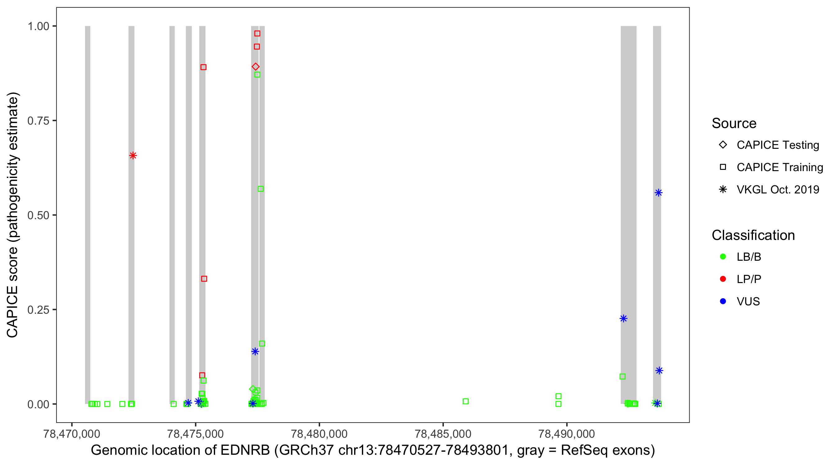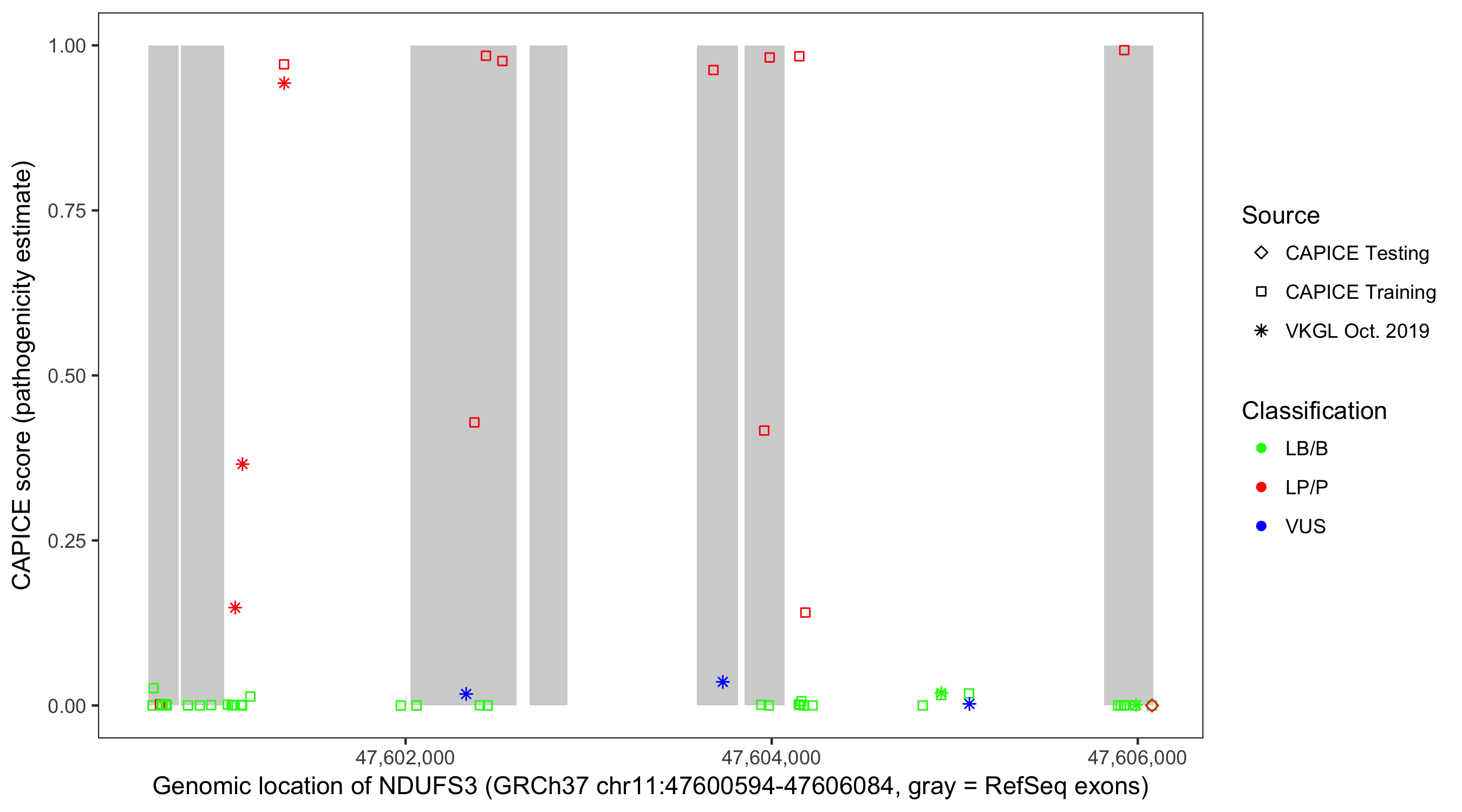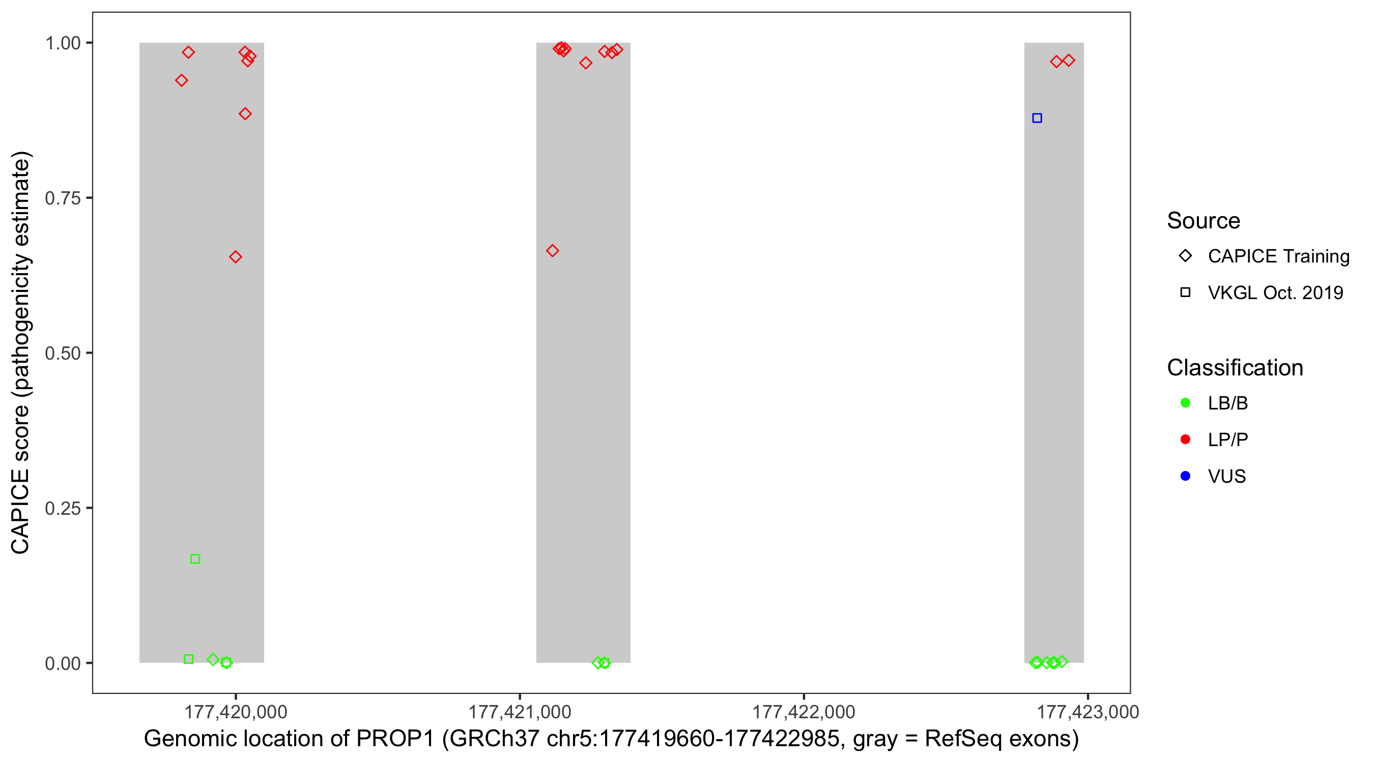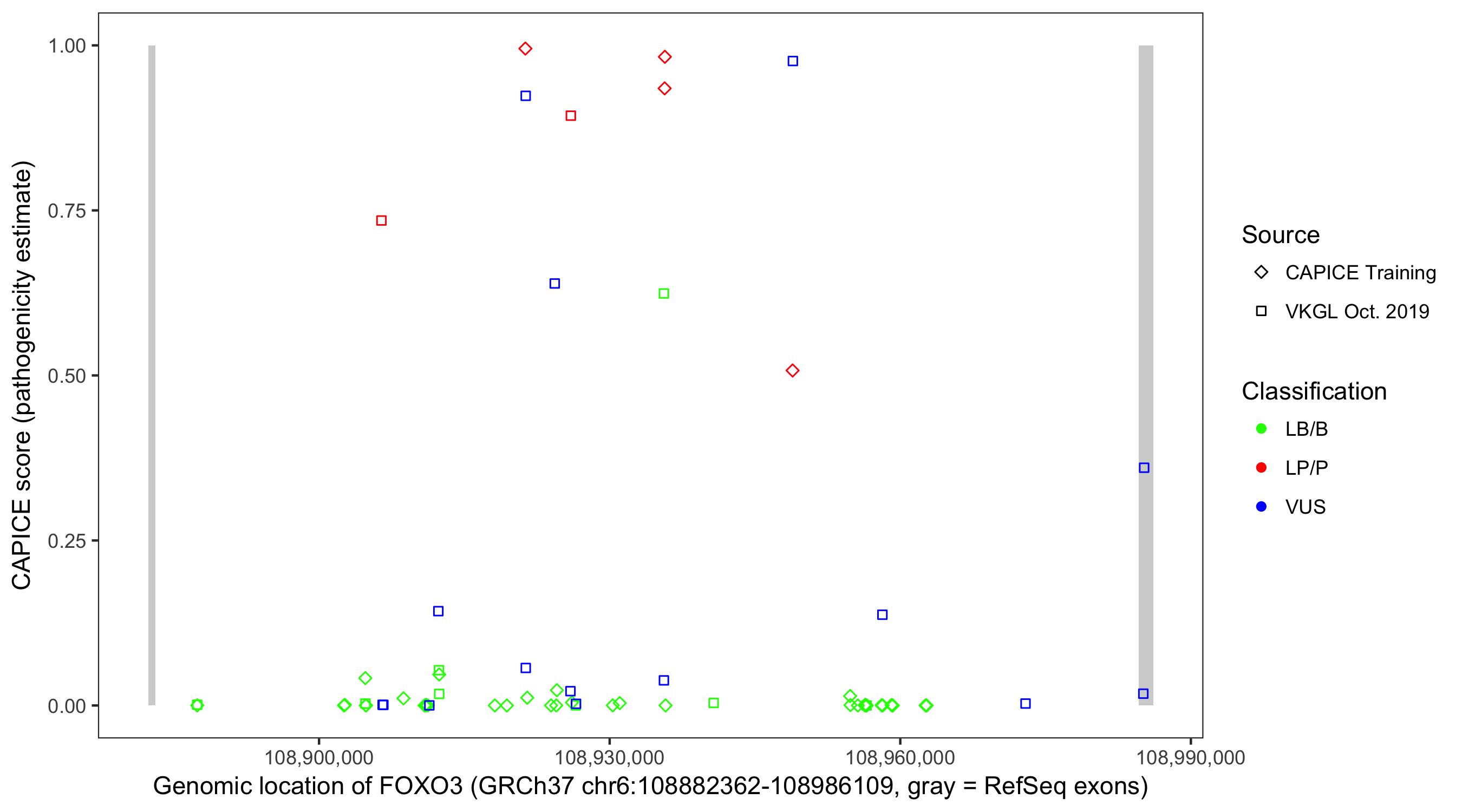 Shown are CAPICE train/test variants plus VKGL Oct 2019.