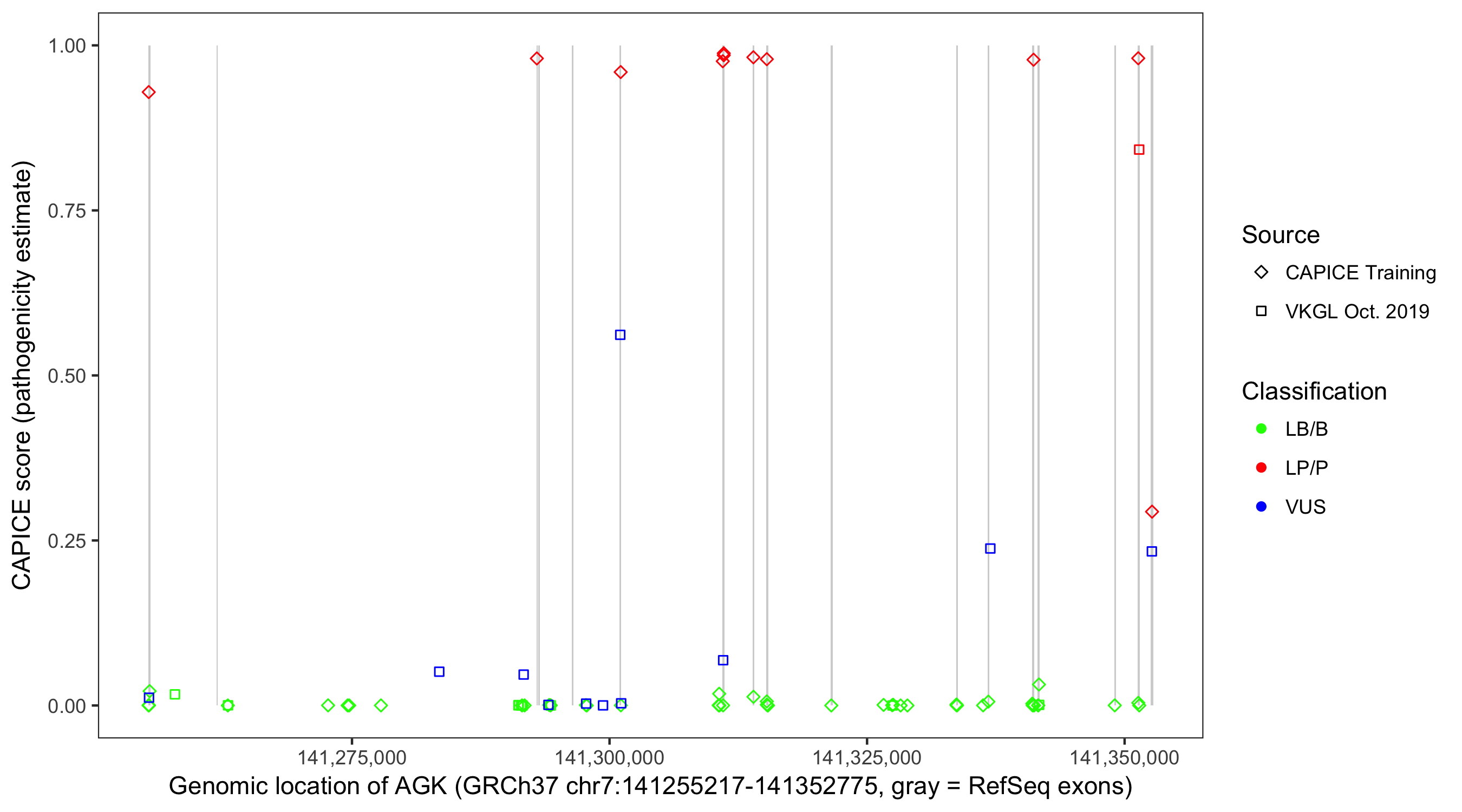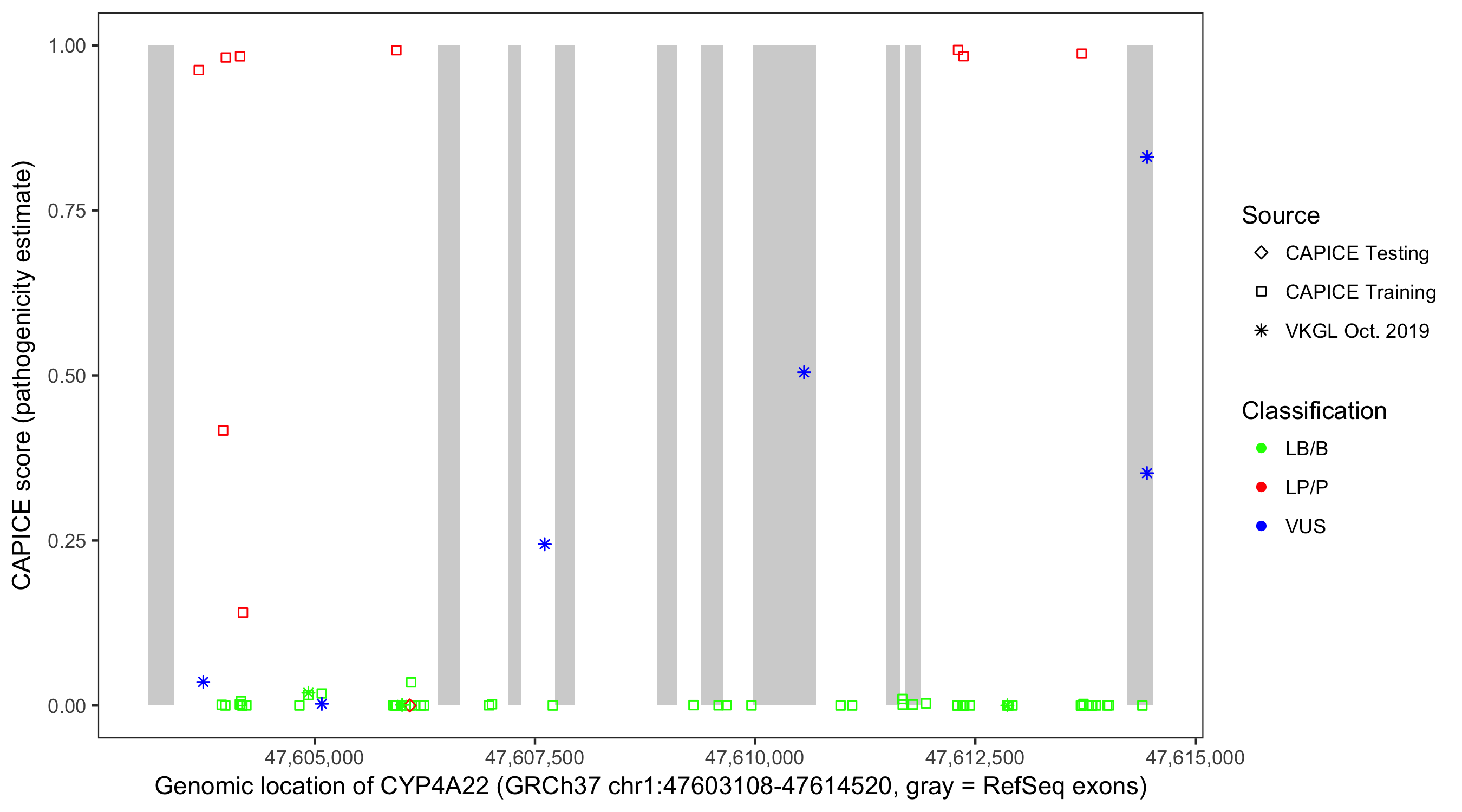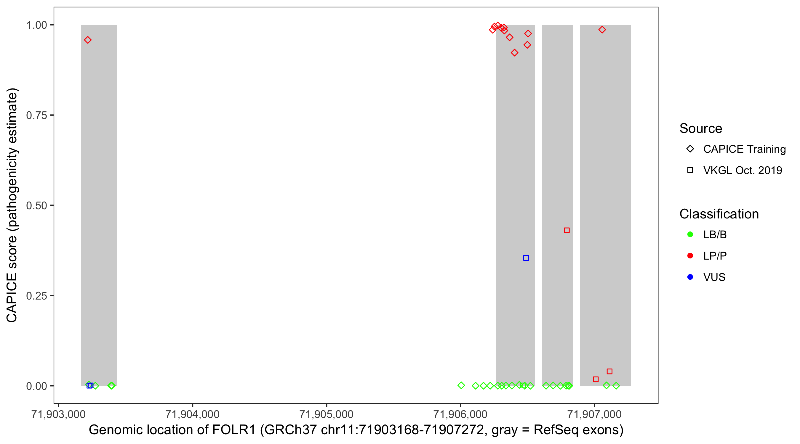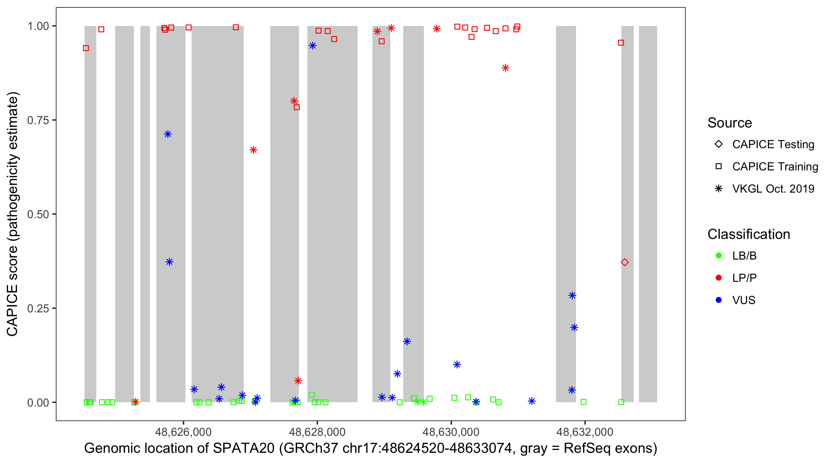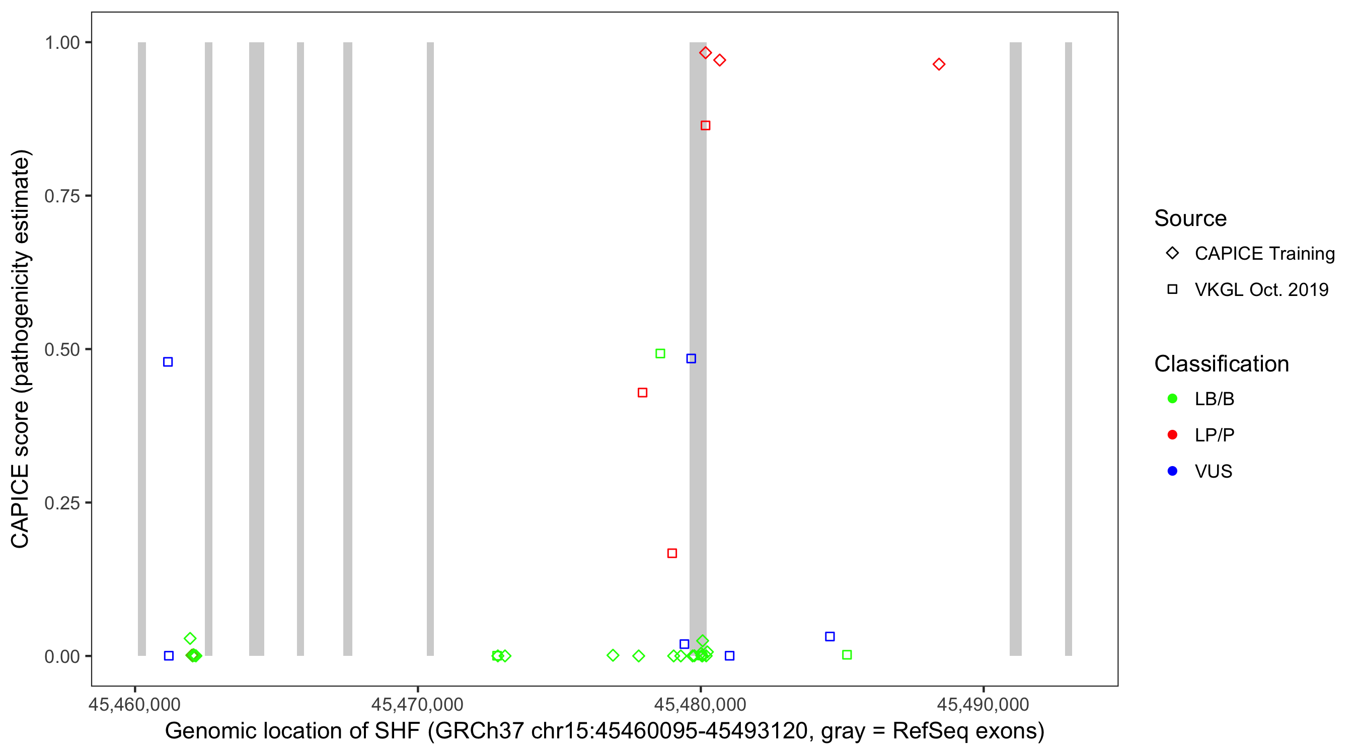 Shown are CAPICE train/test variants plus VKGL Oct 2019.