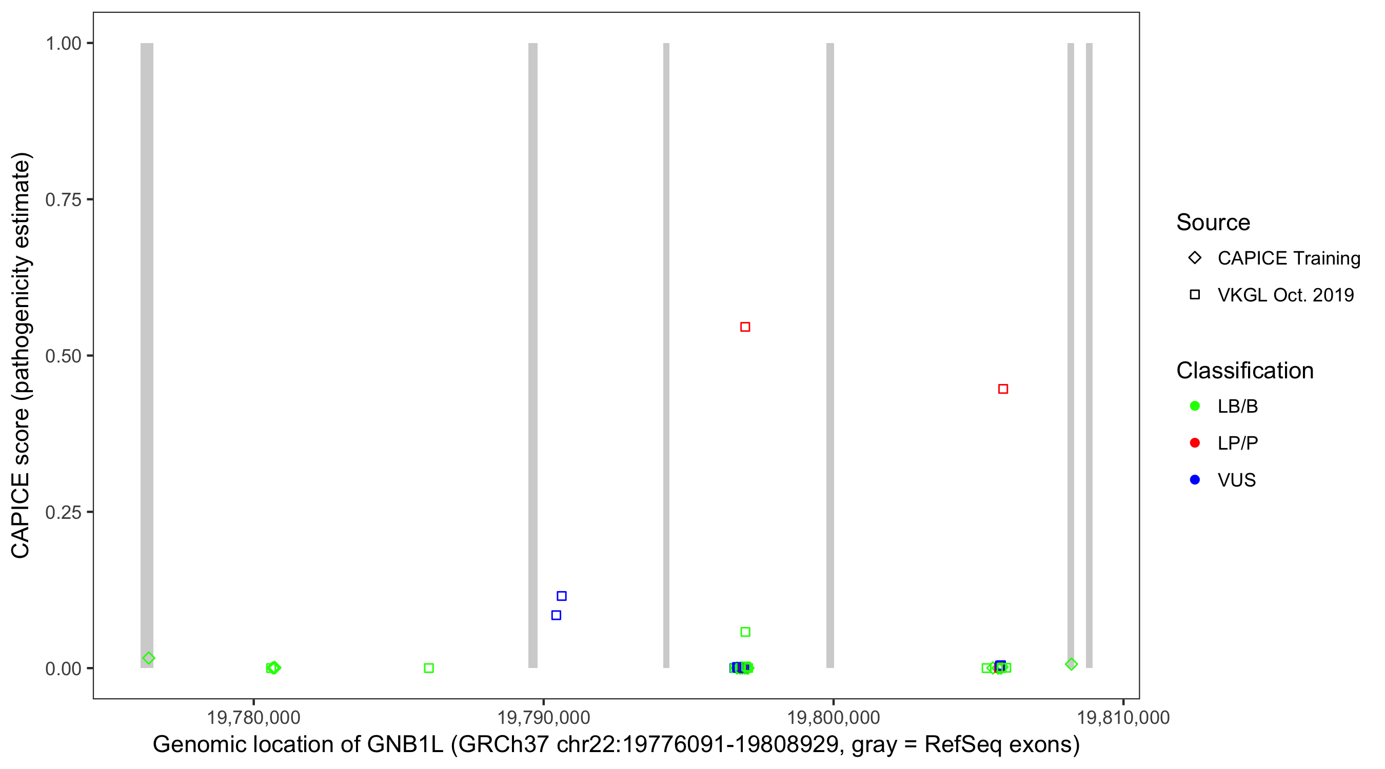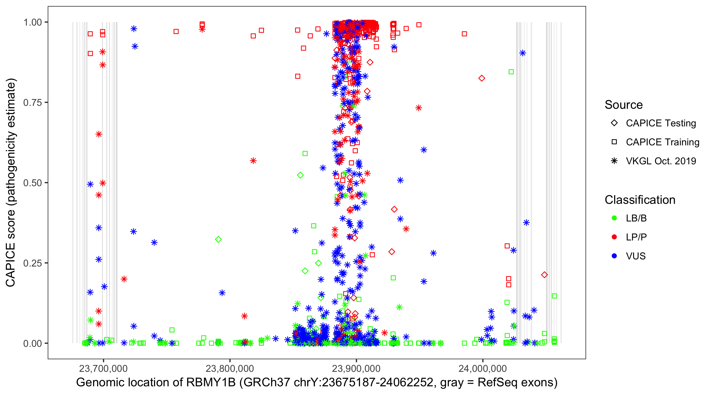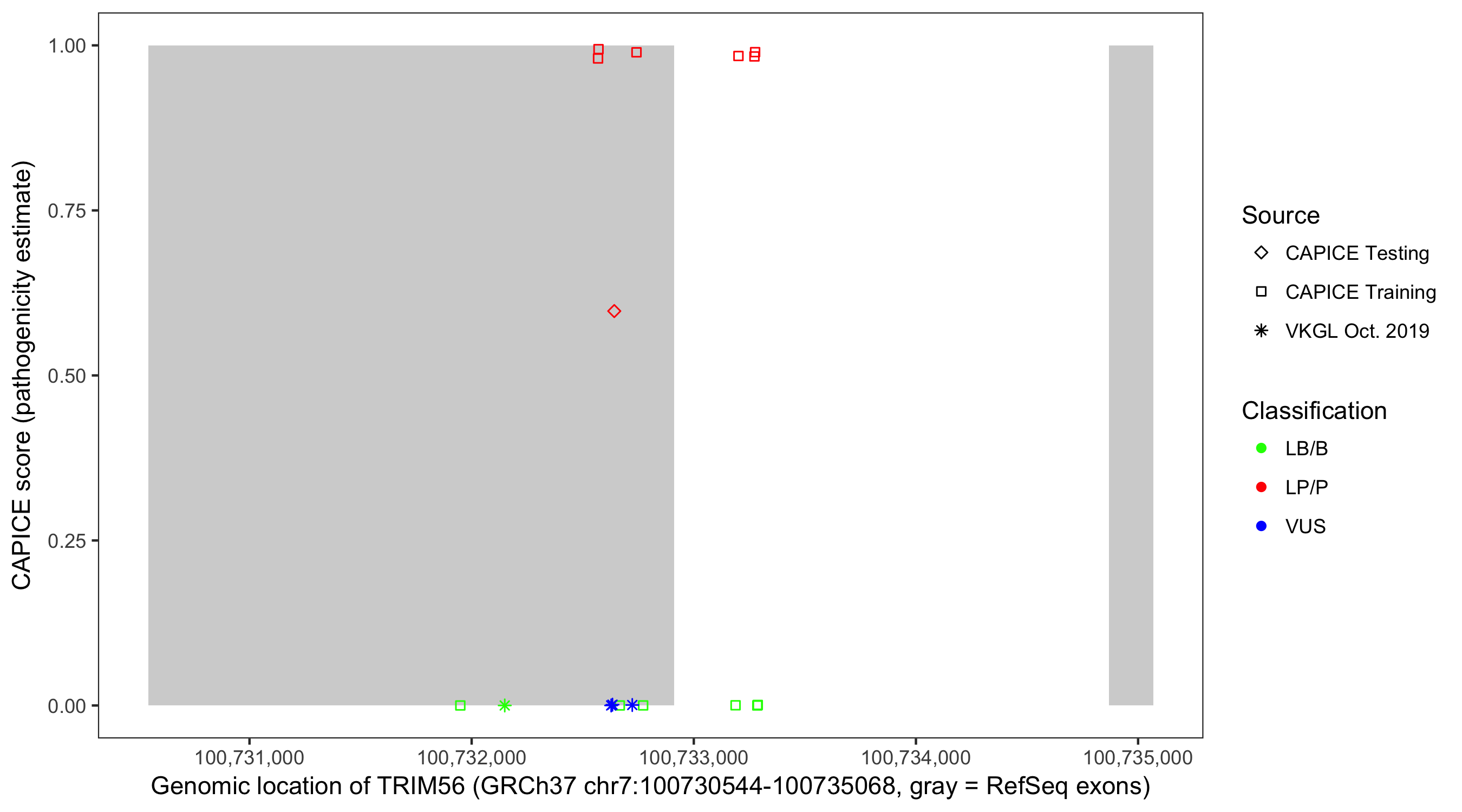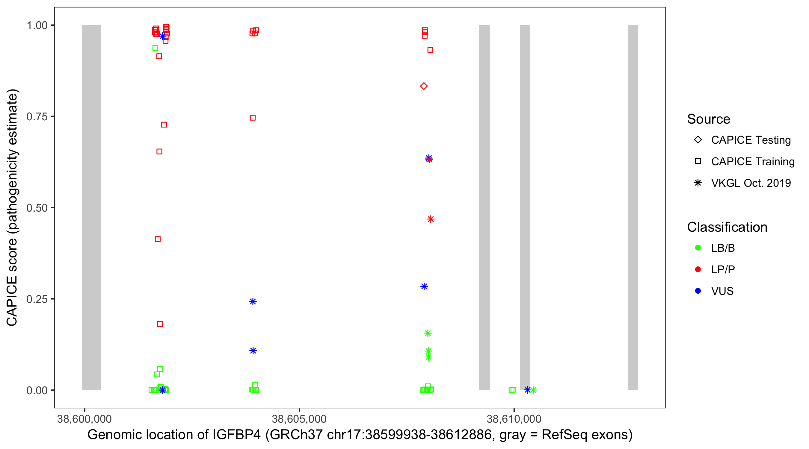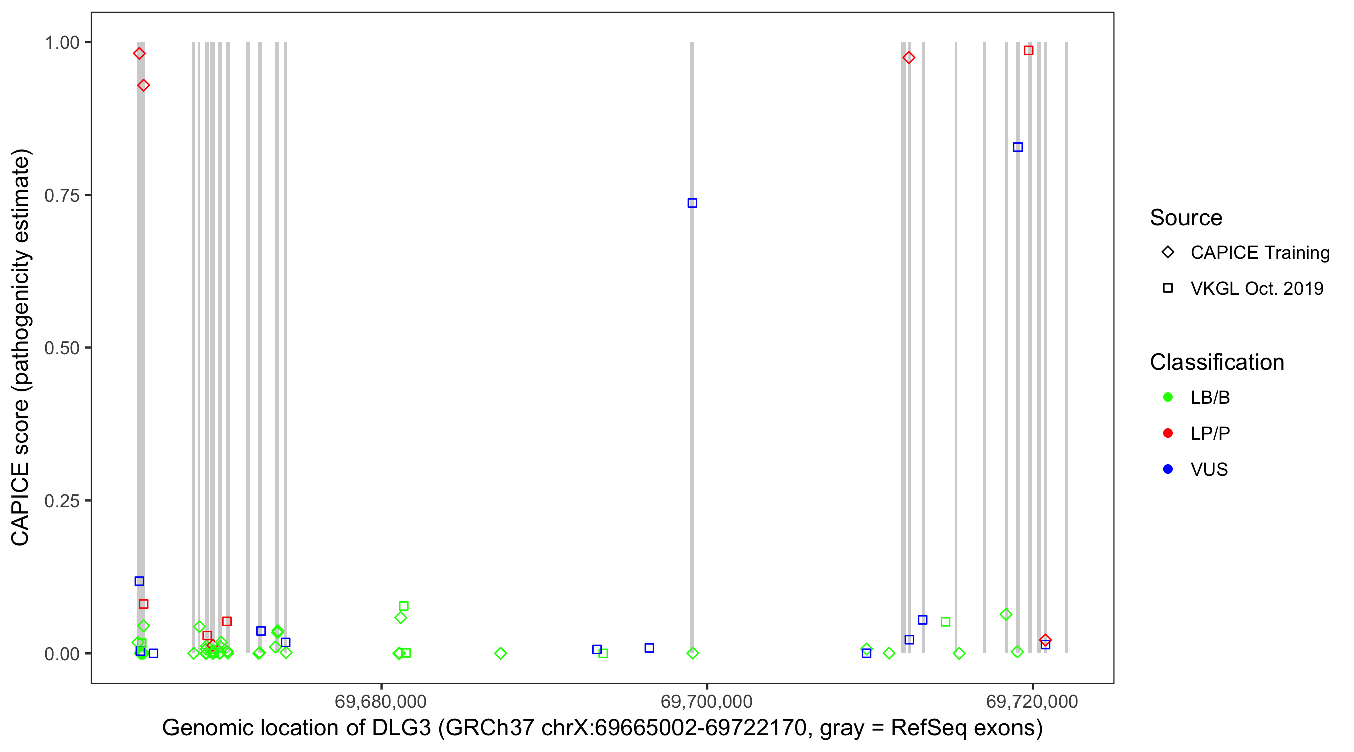 Shown are CAPICE train/test variants plus VKGL Oct 2019.