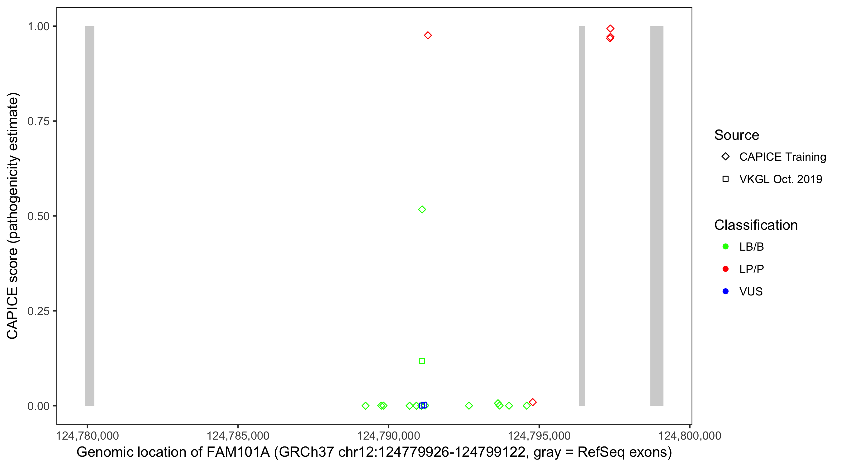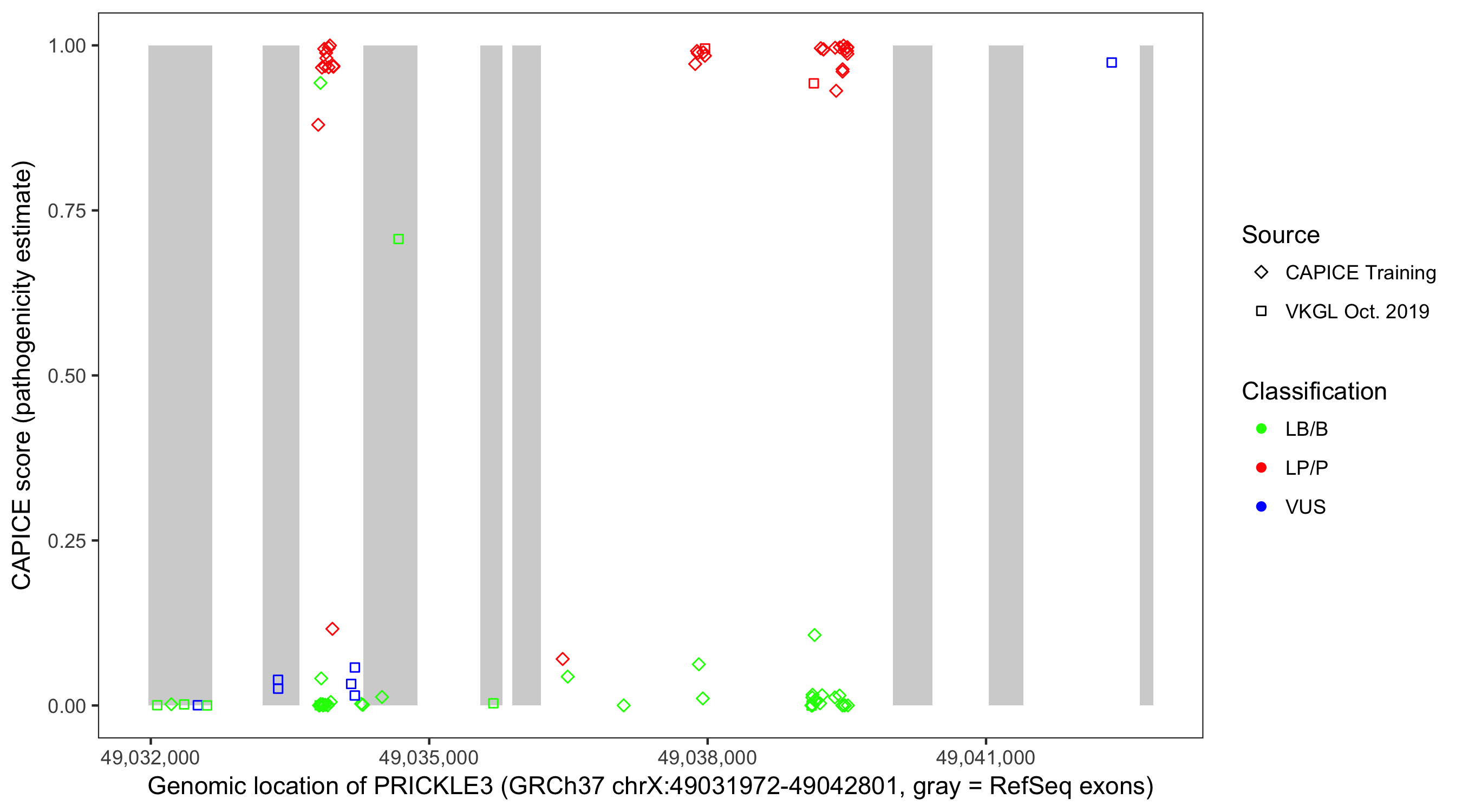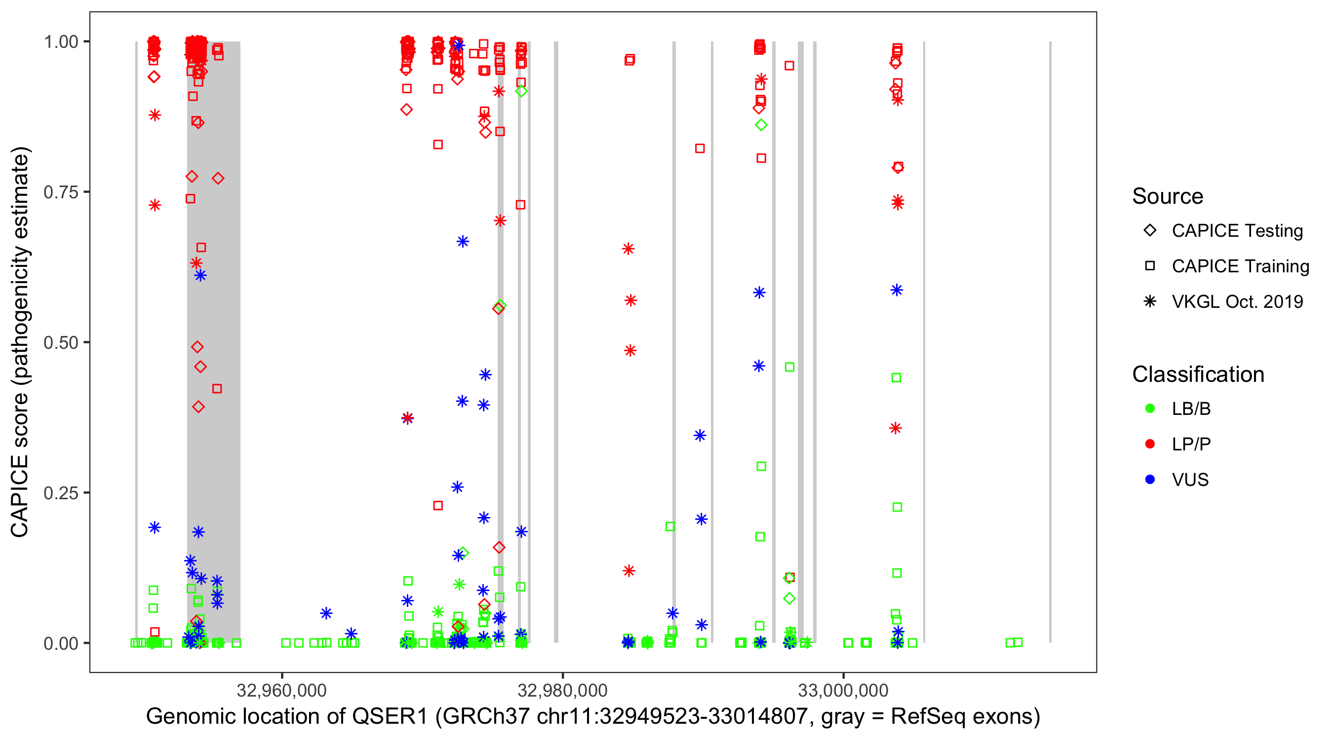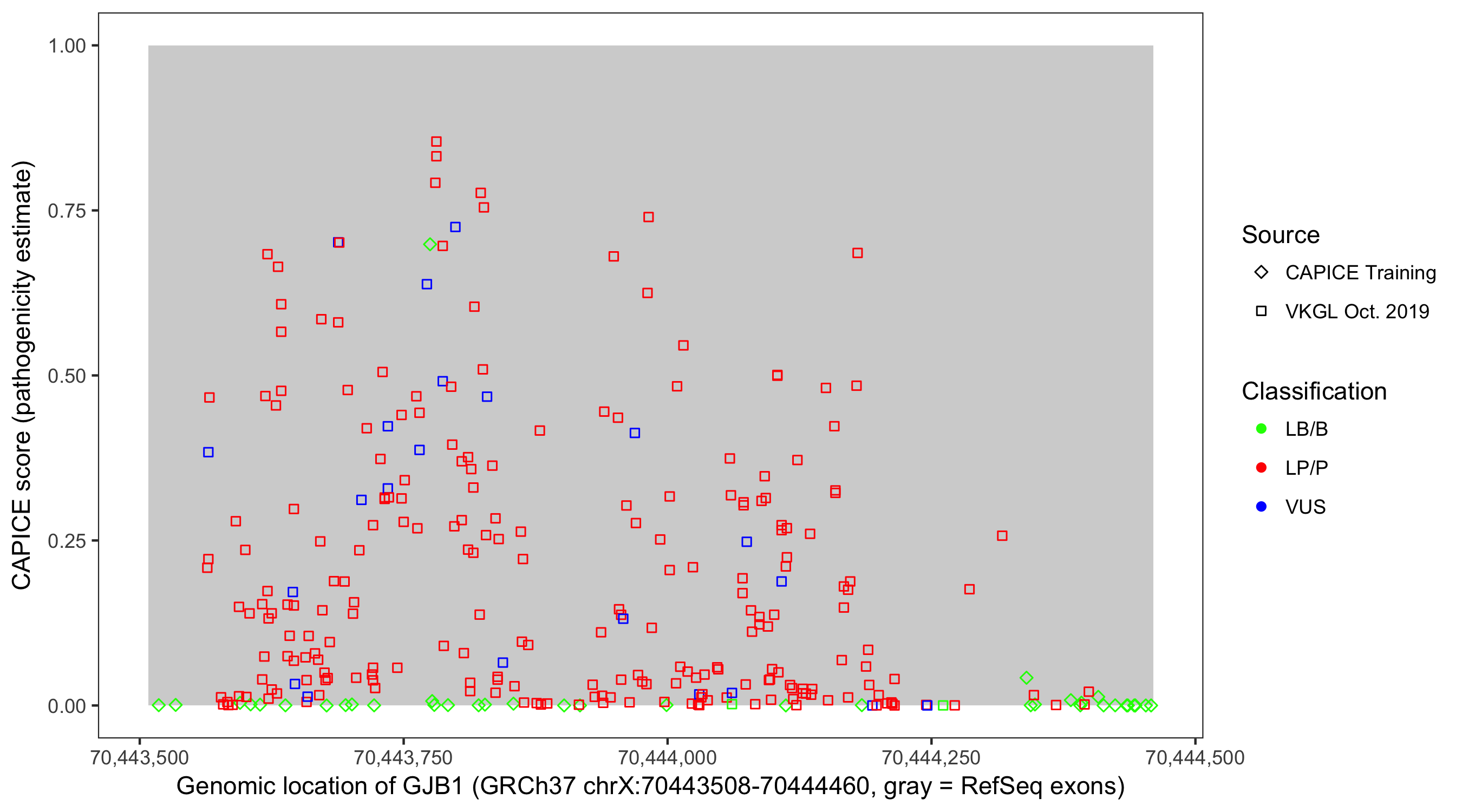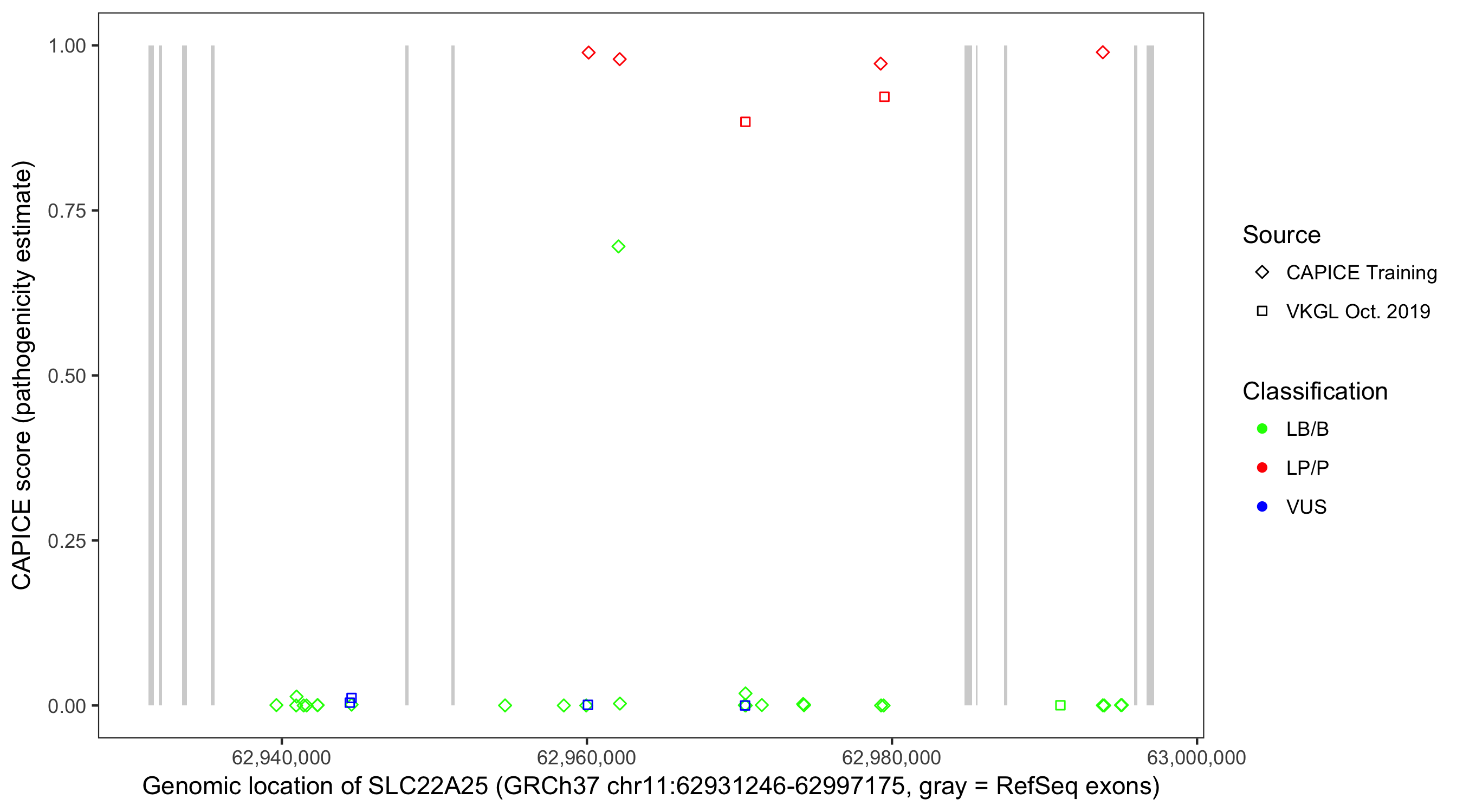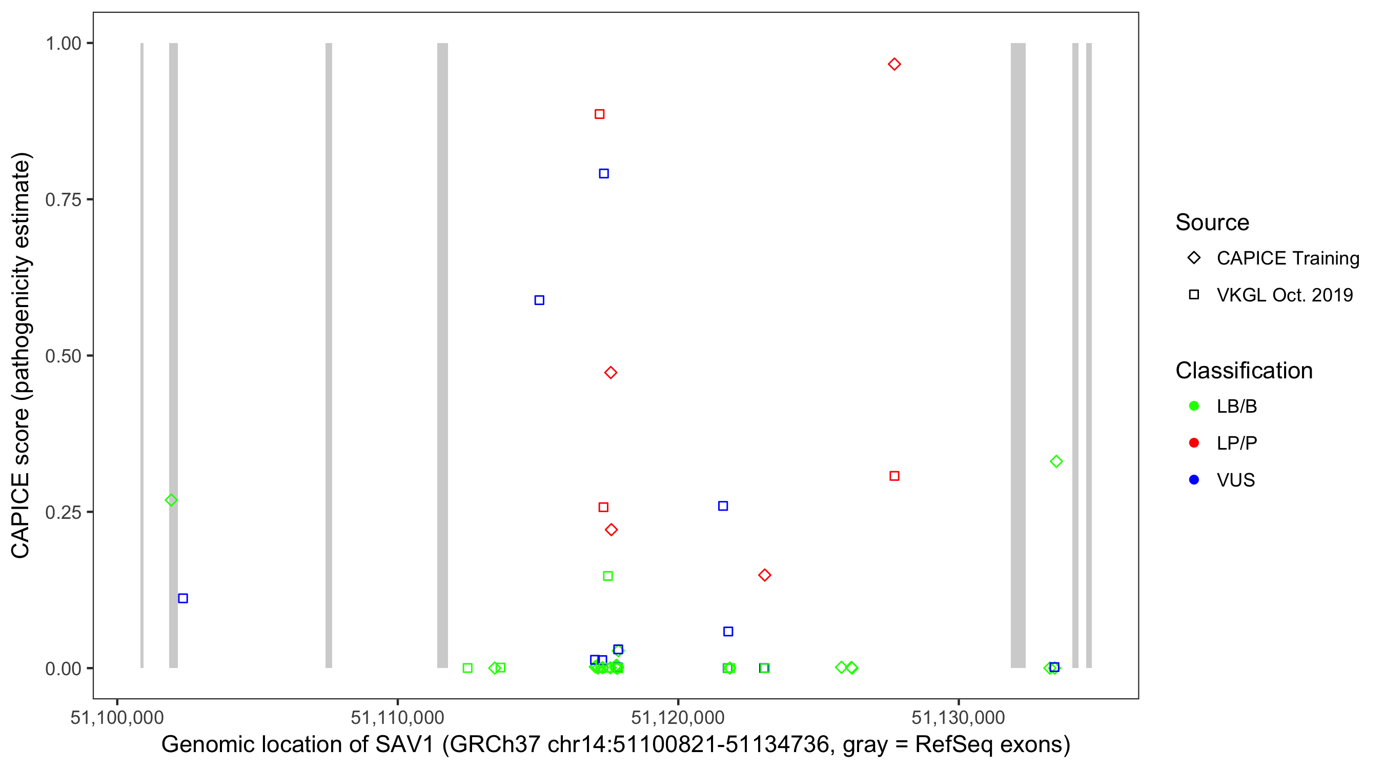 Shown are CAPICE train/test variants plus VKGL Oct 2019.
