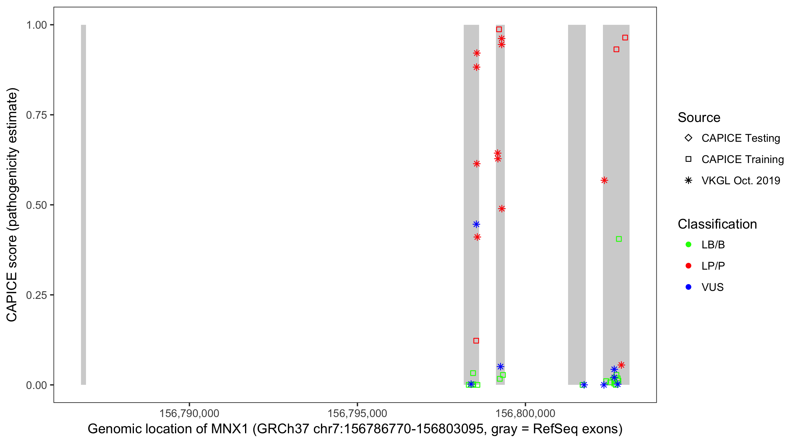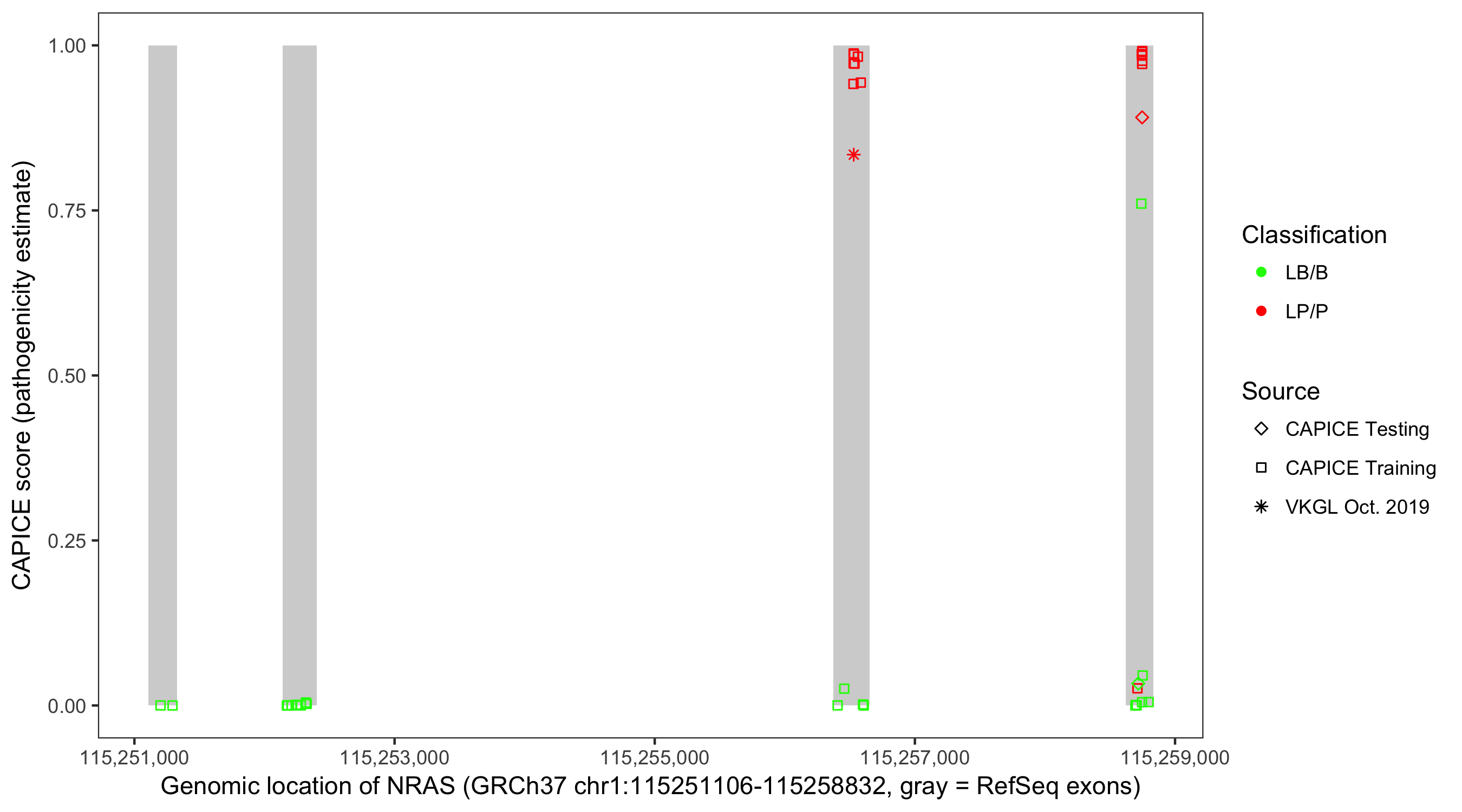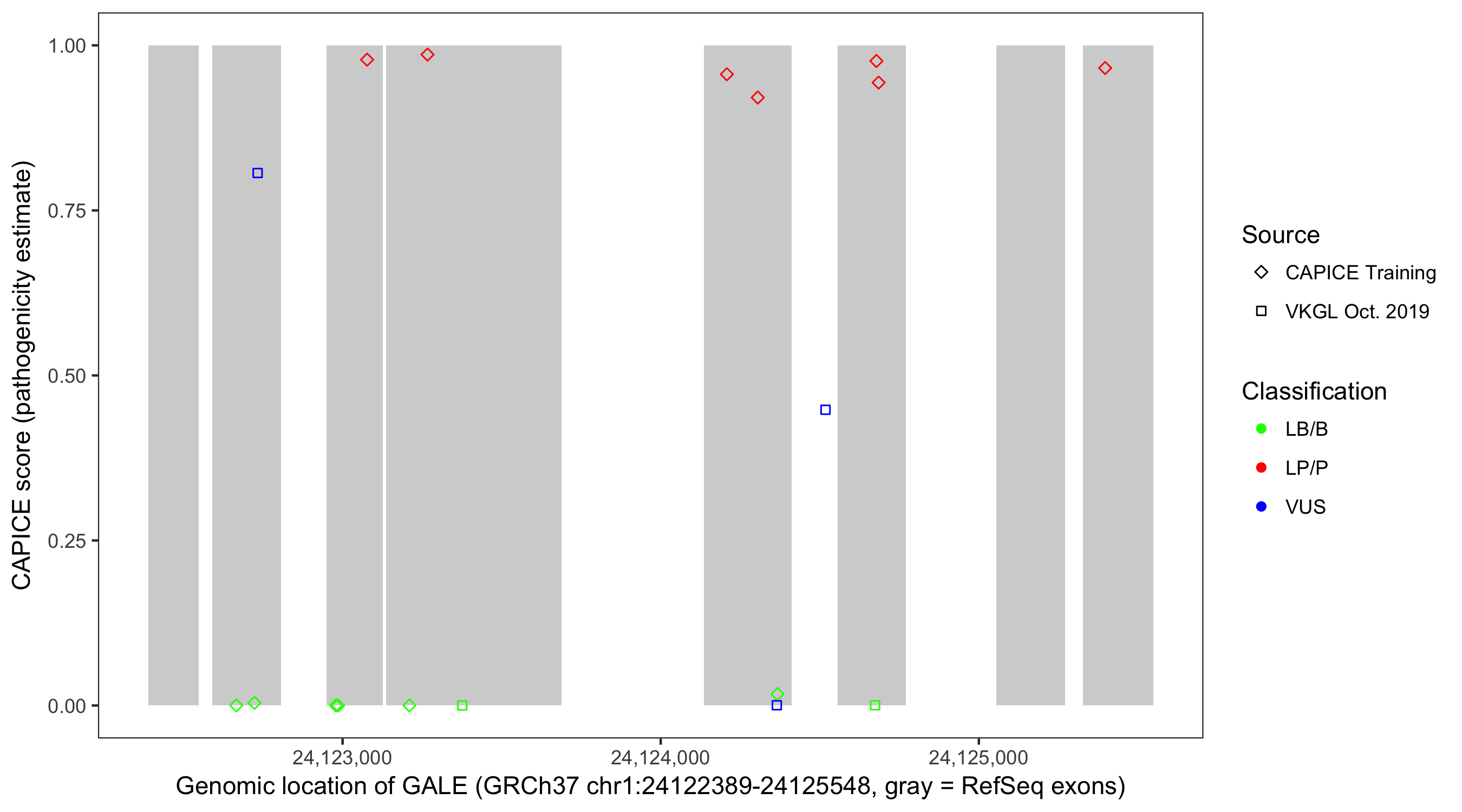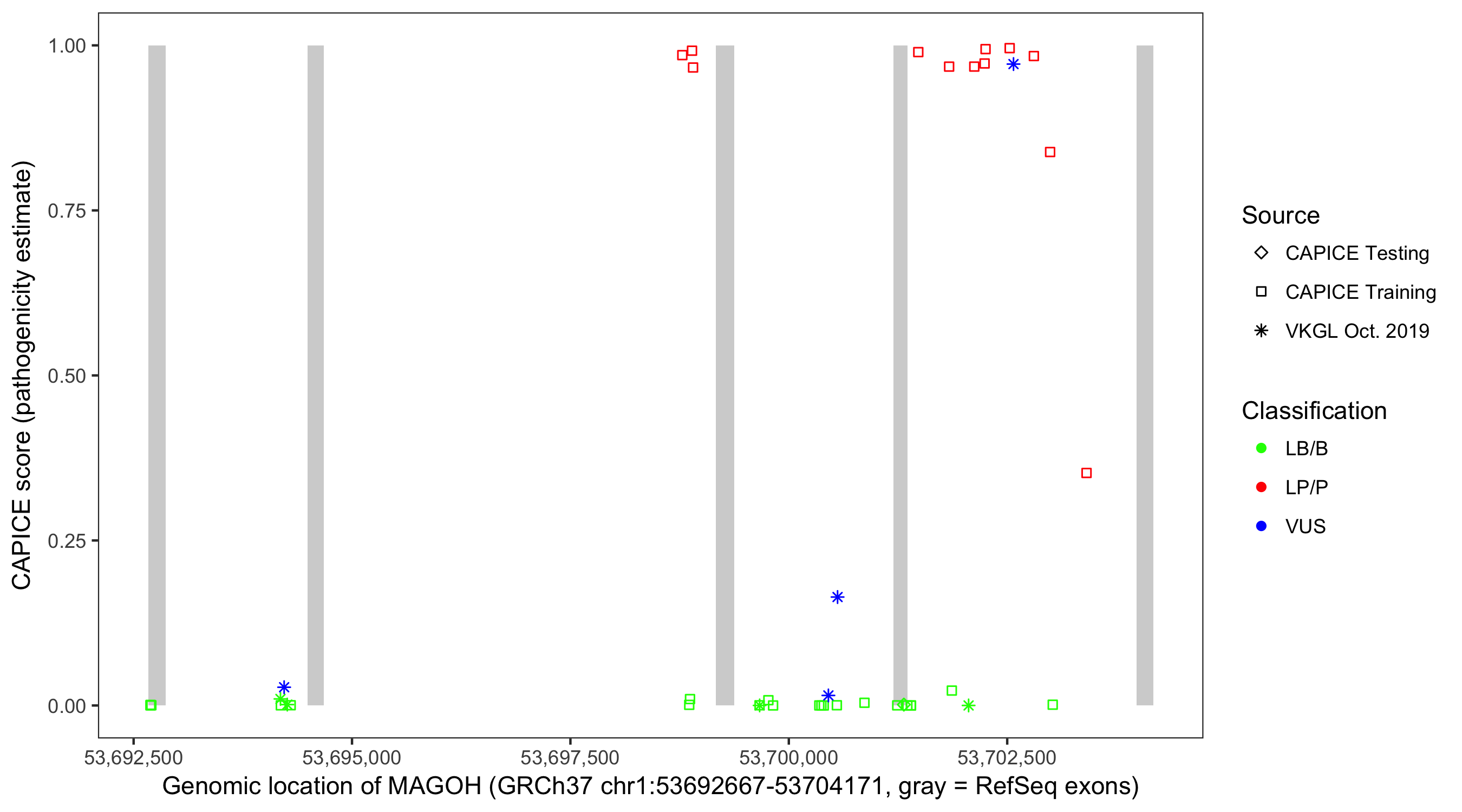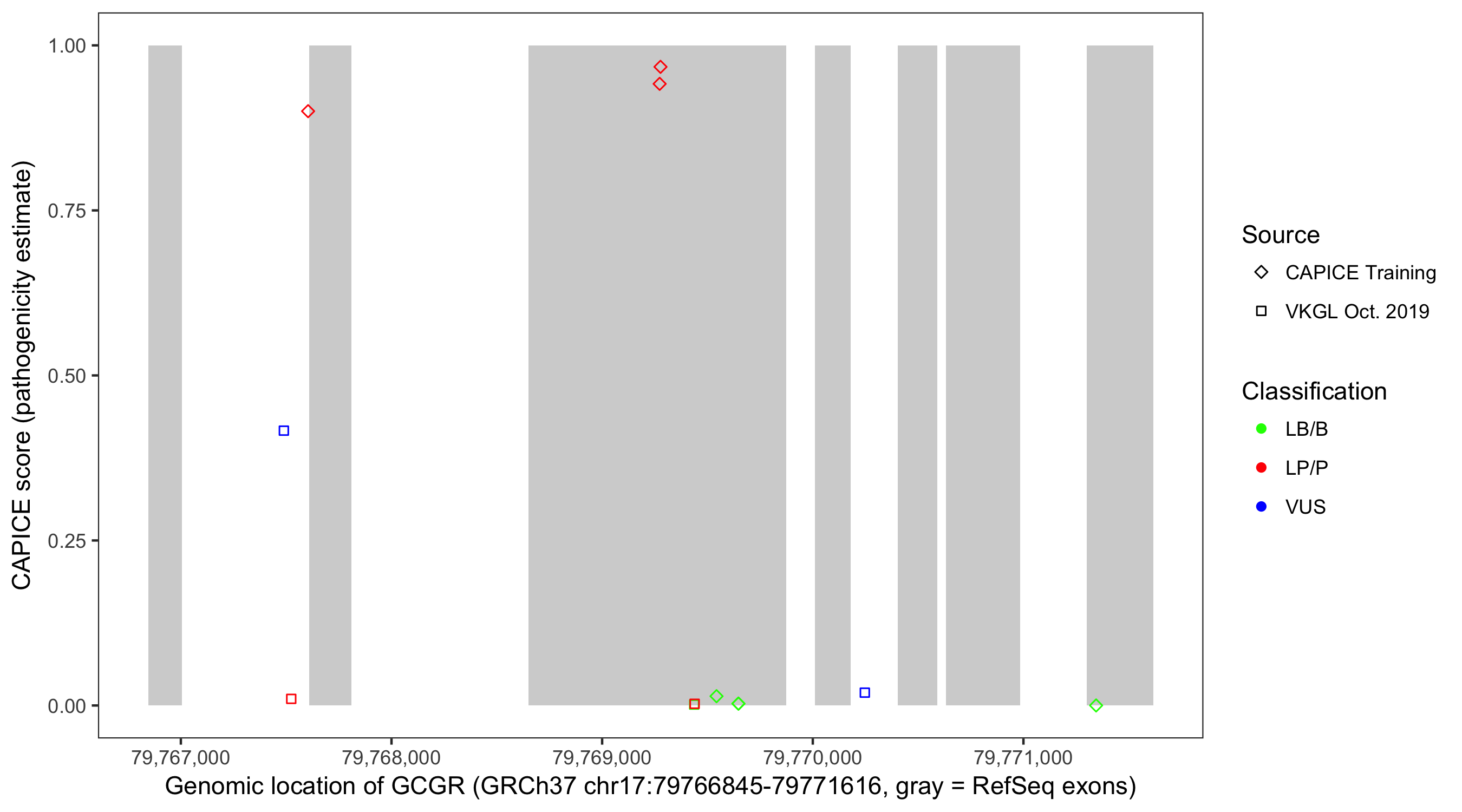 Shown are CAPICE train/test variants plus VKGL Oct 2019.