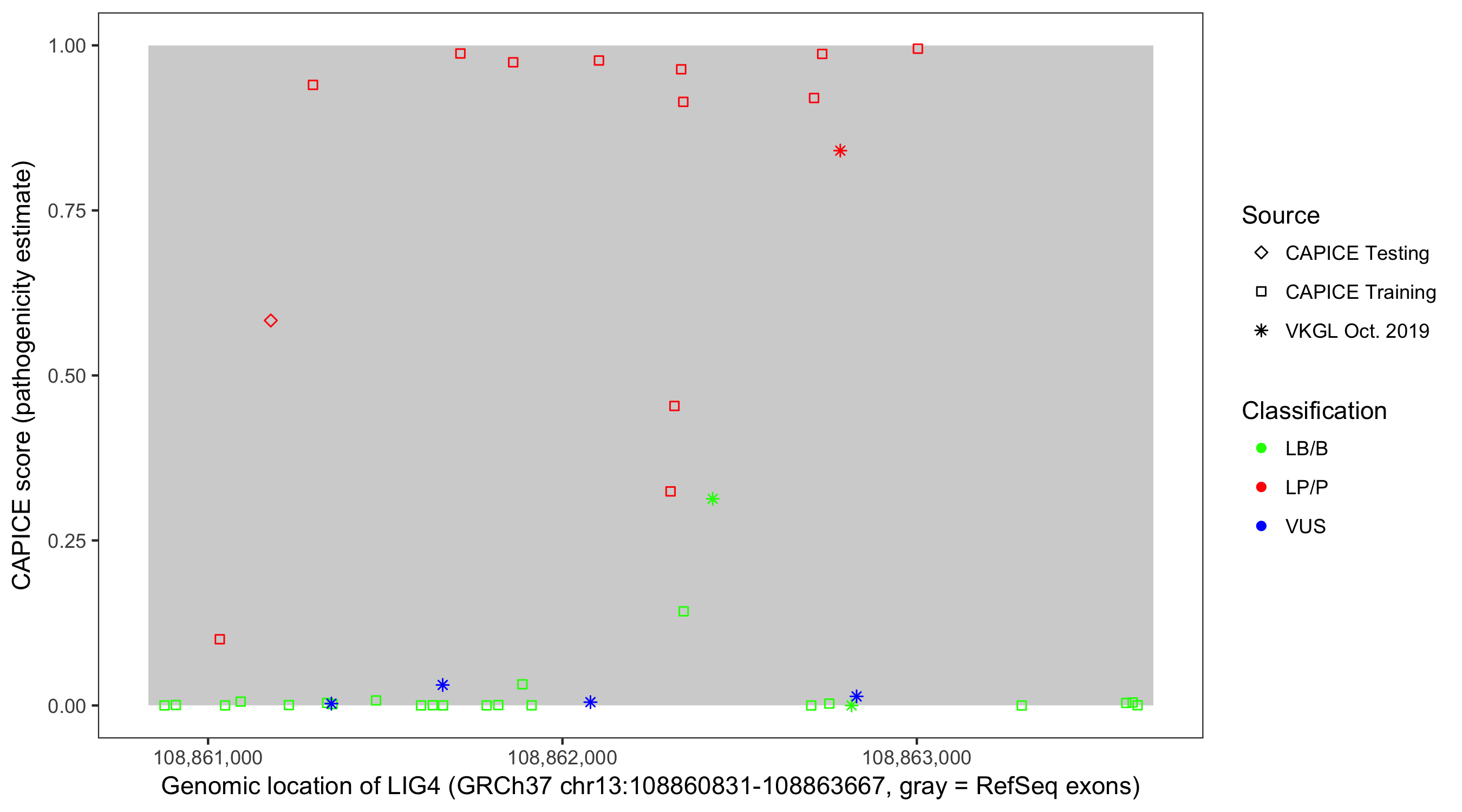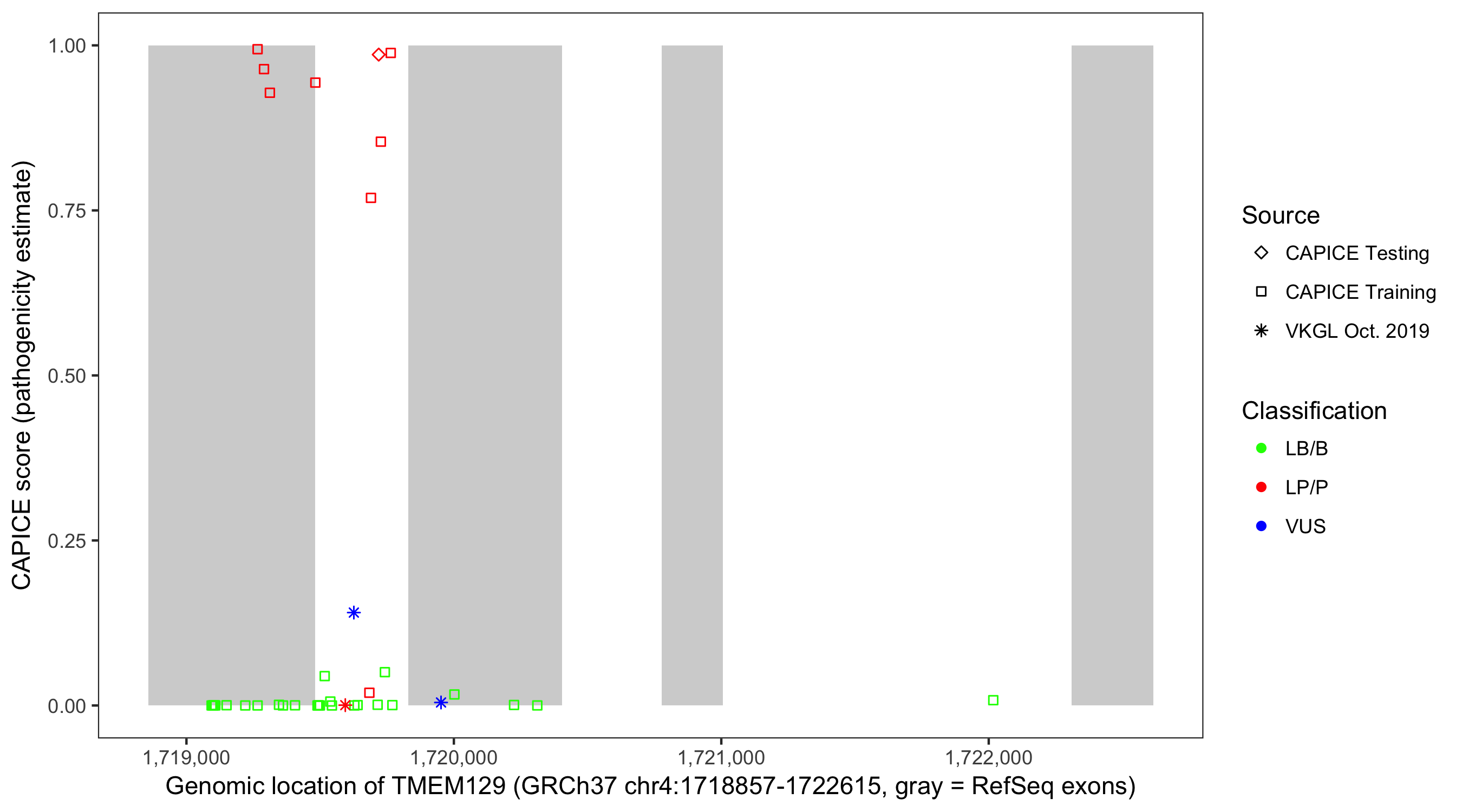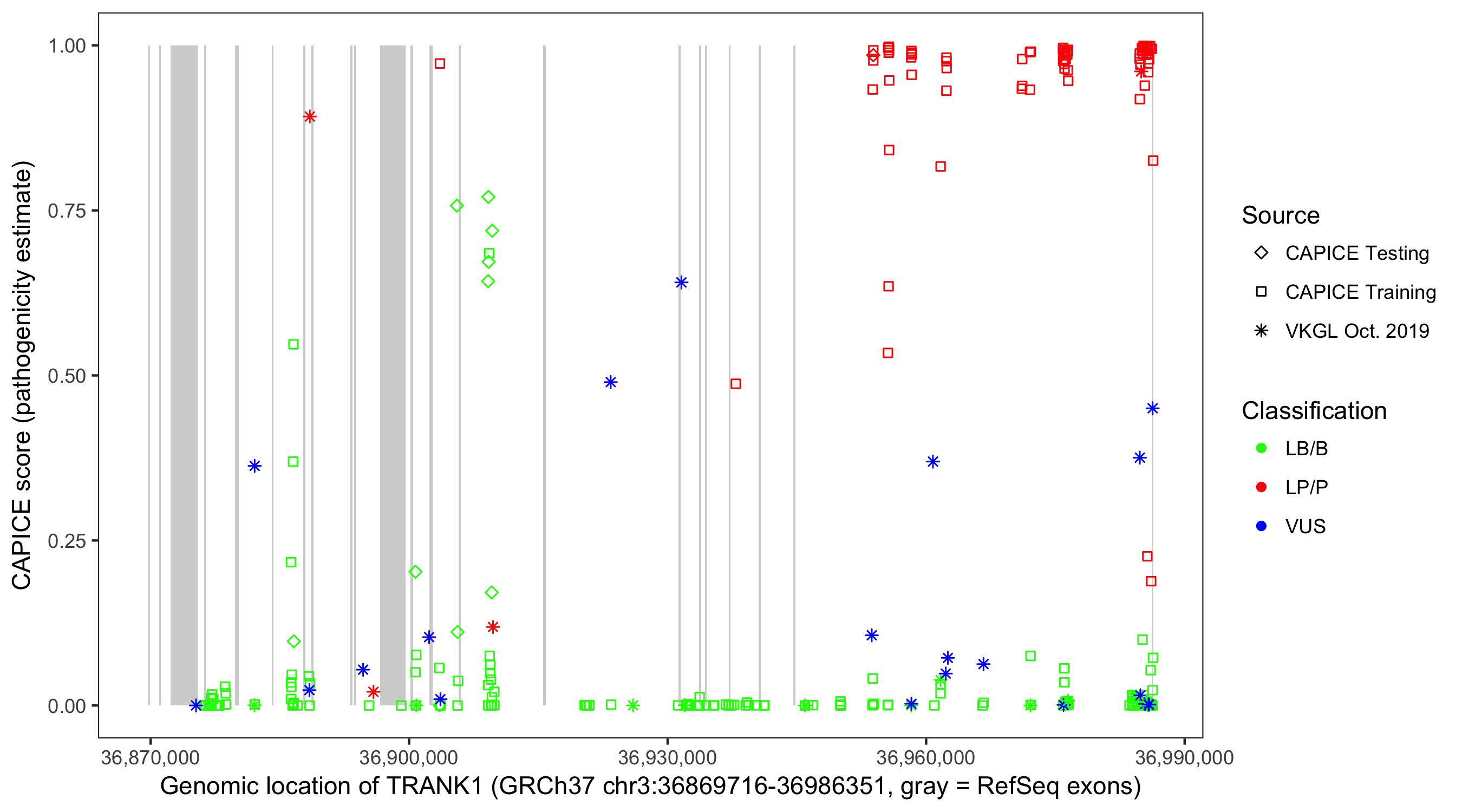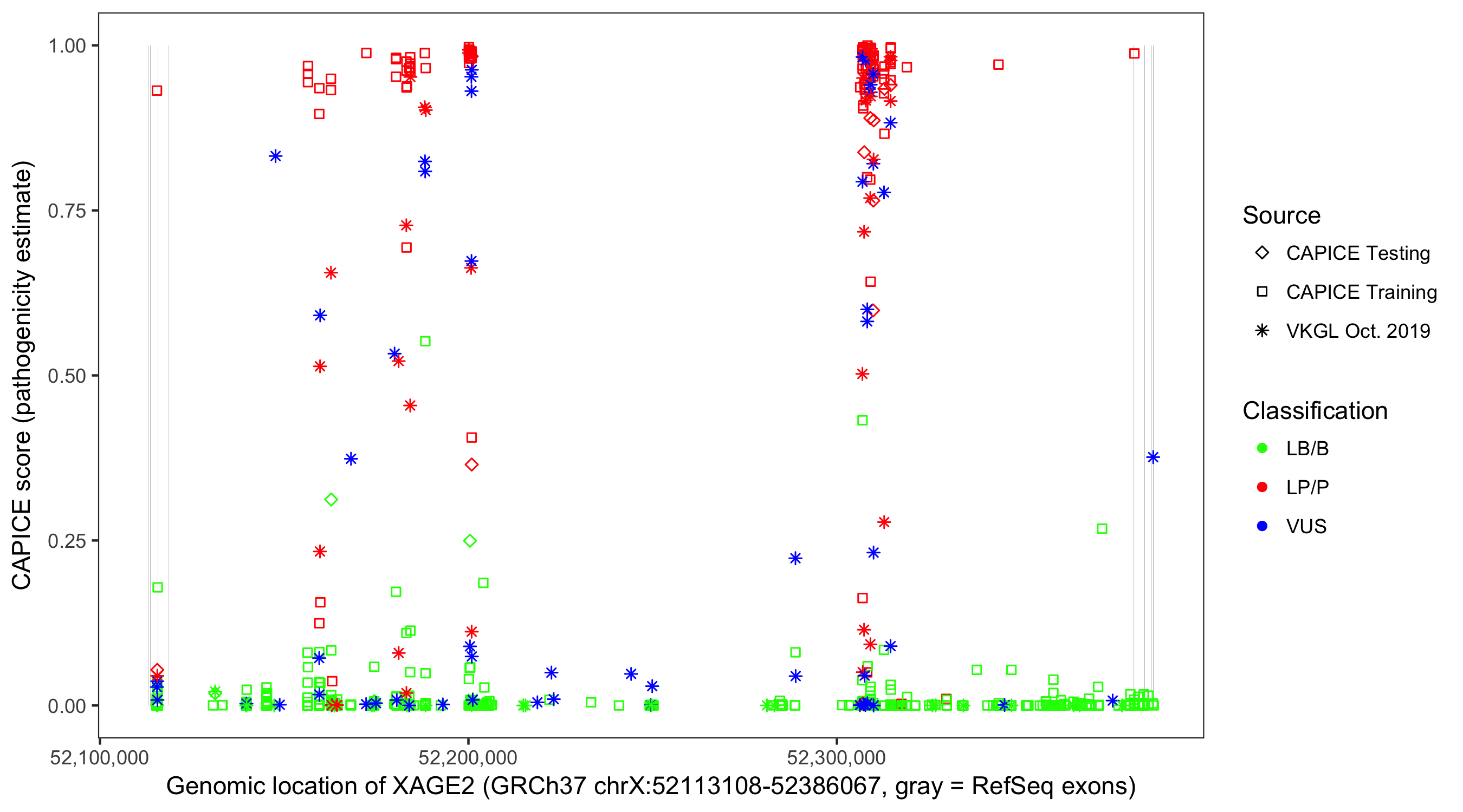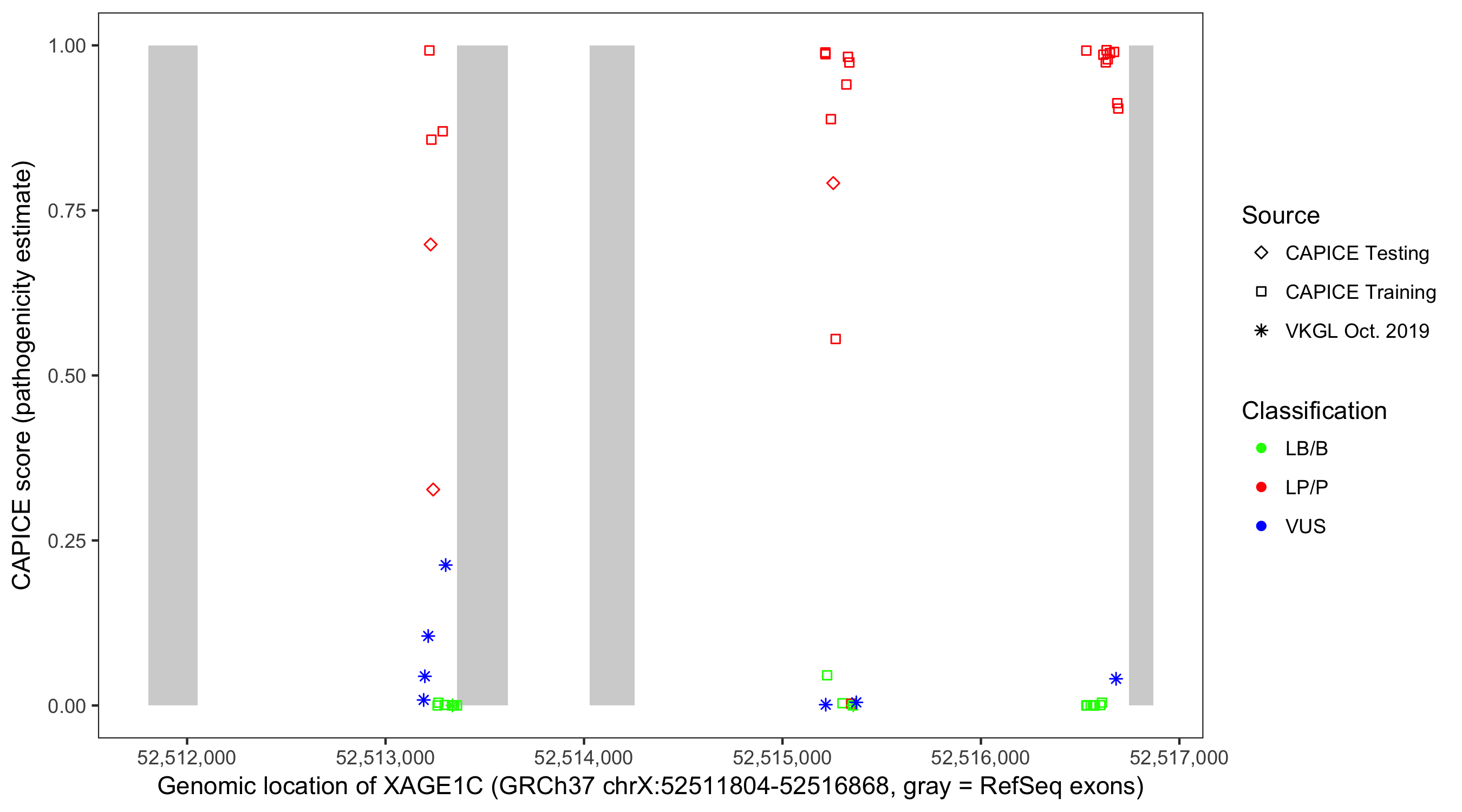 Shown are CAPICE train/test variants plus VKGL Oct 2019.