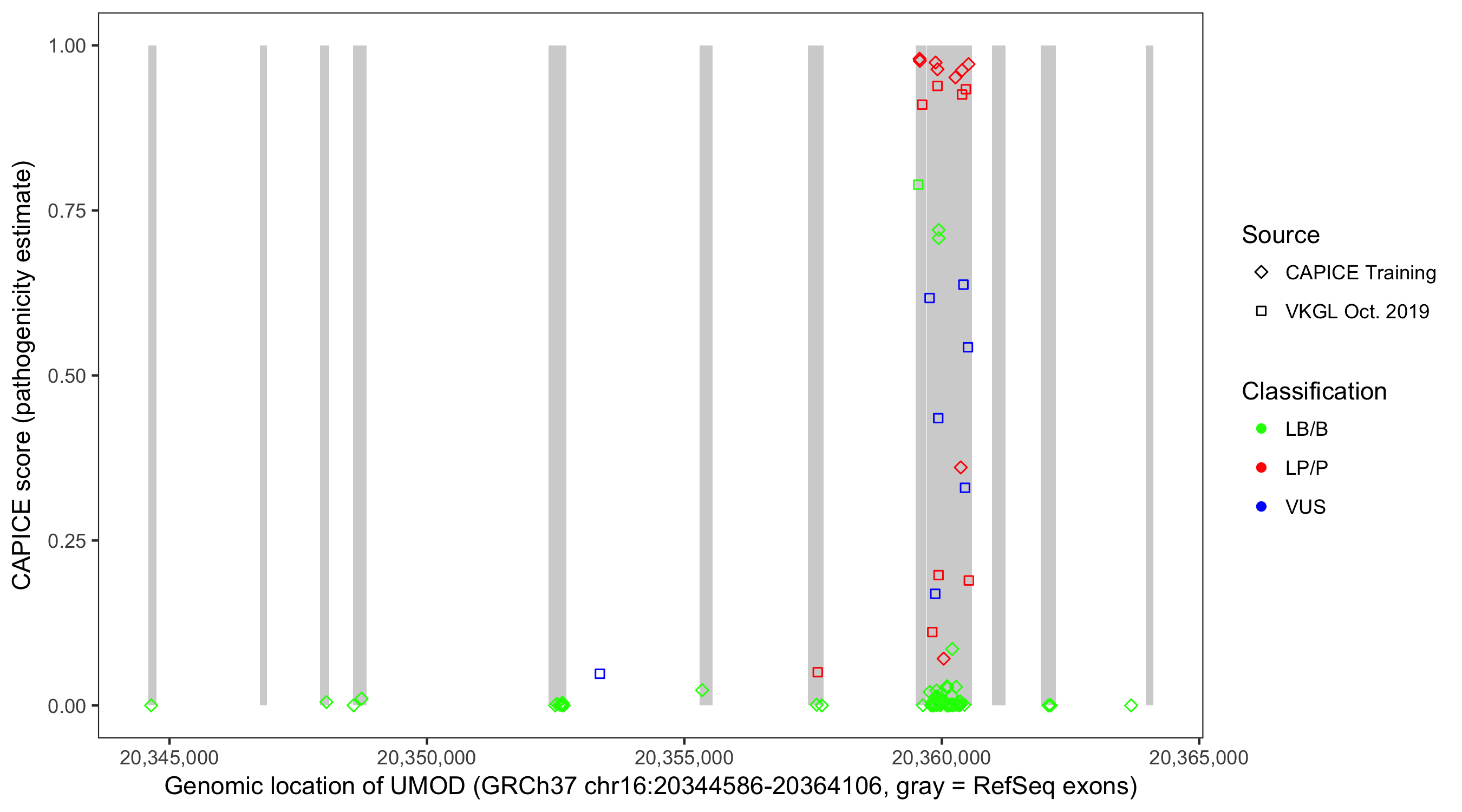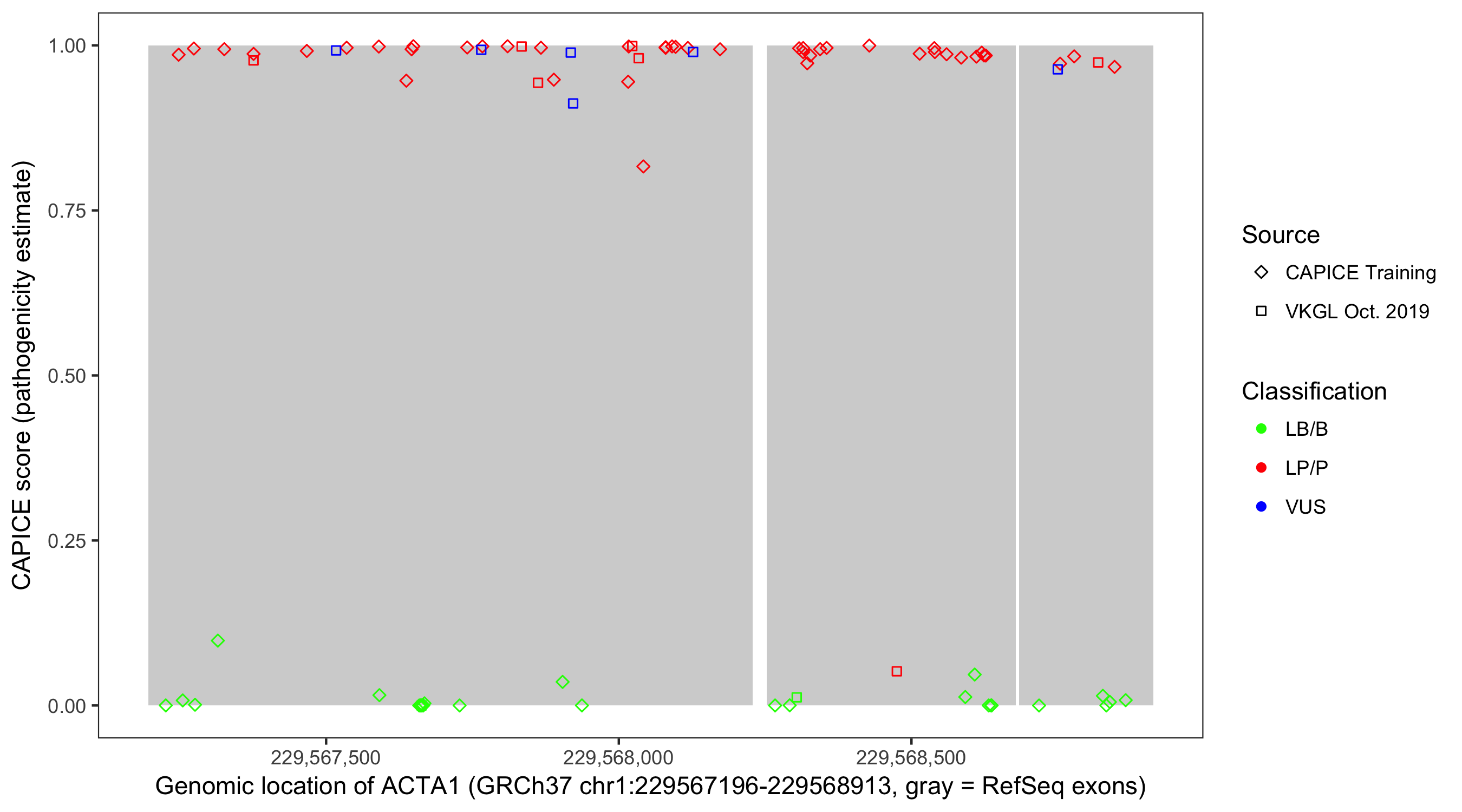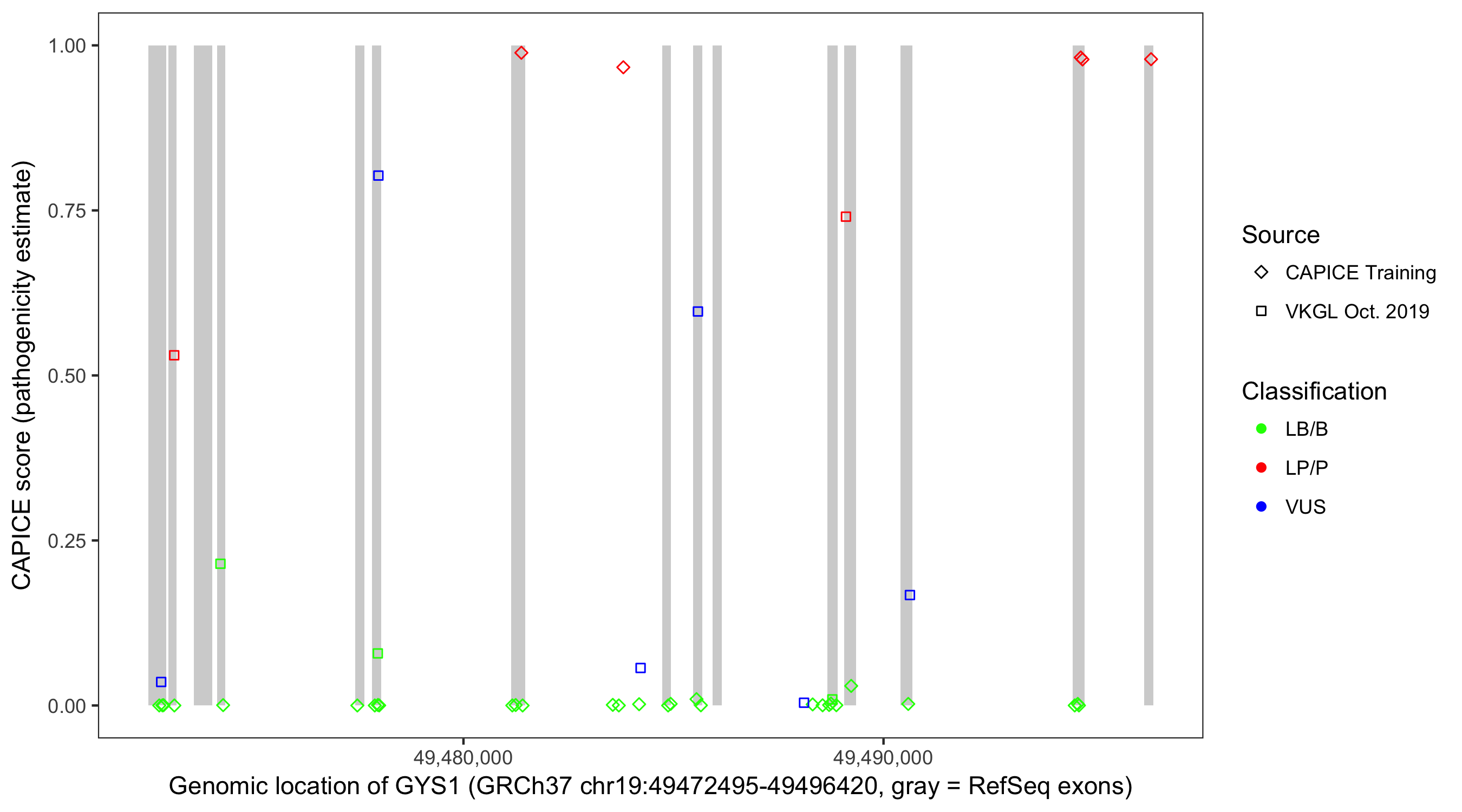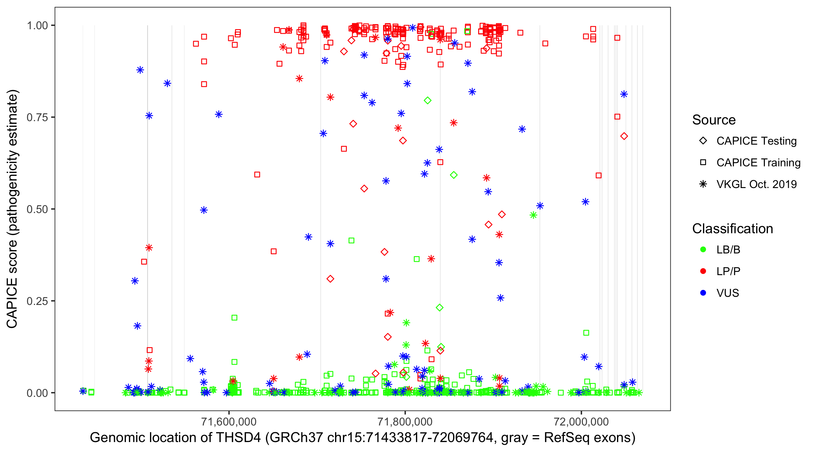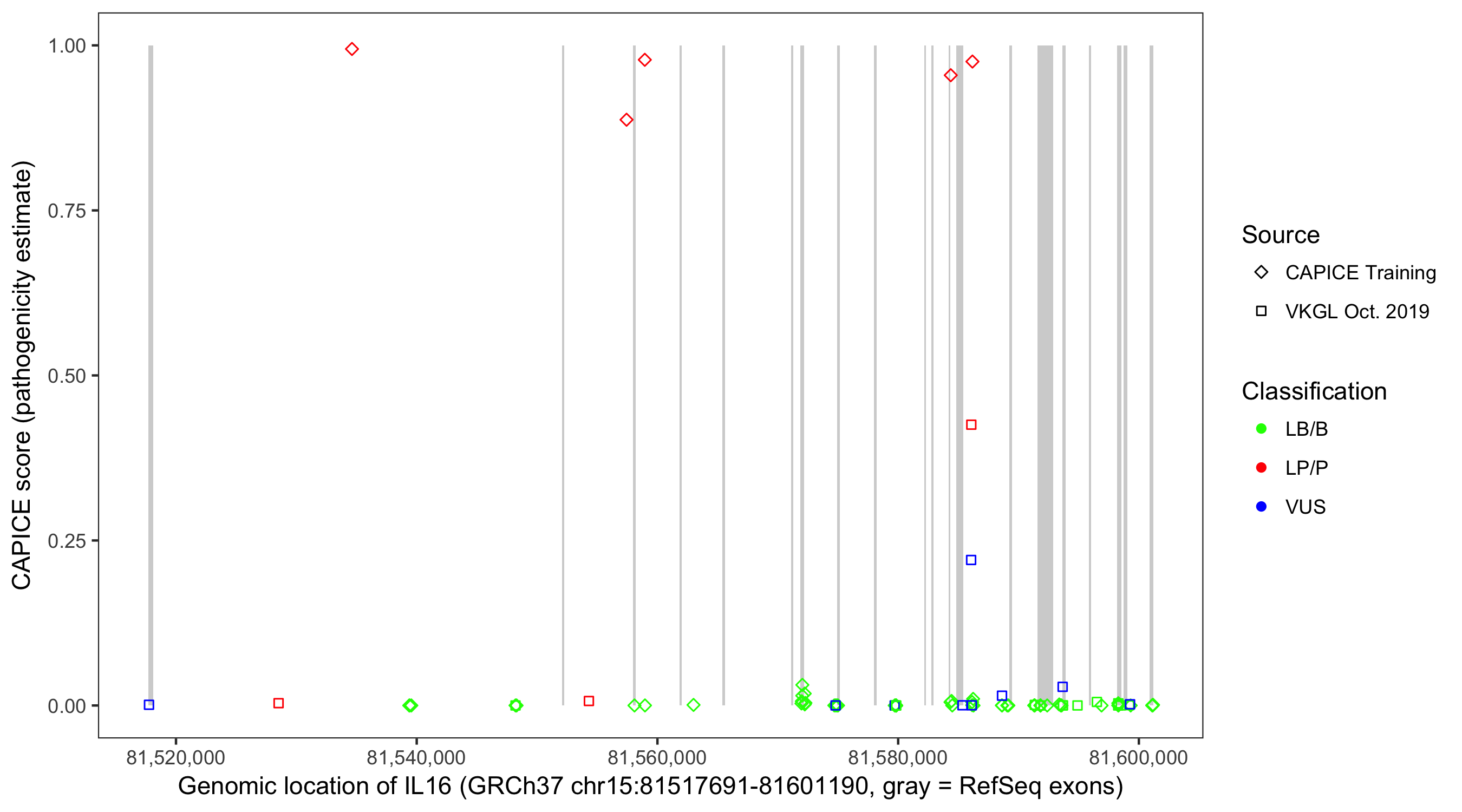 Shown are CAPICE train/test variants plus VKGL Oct 2019.