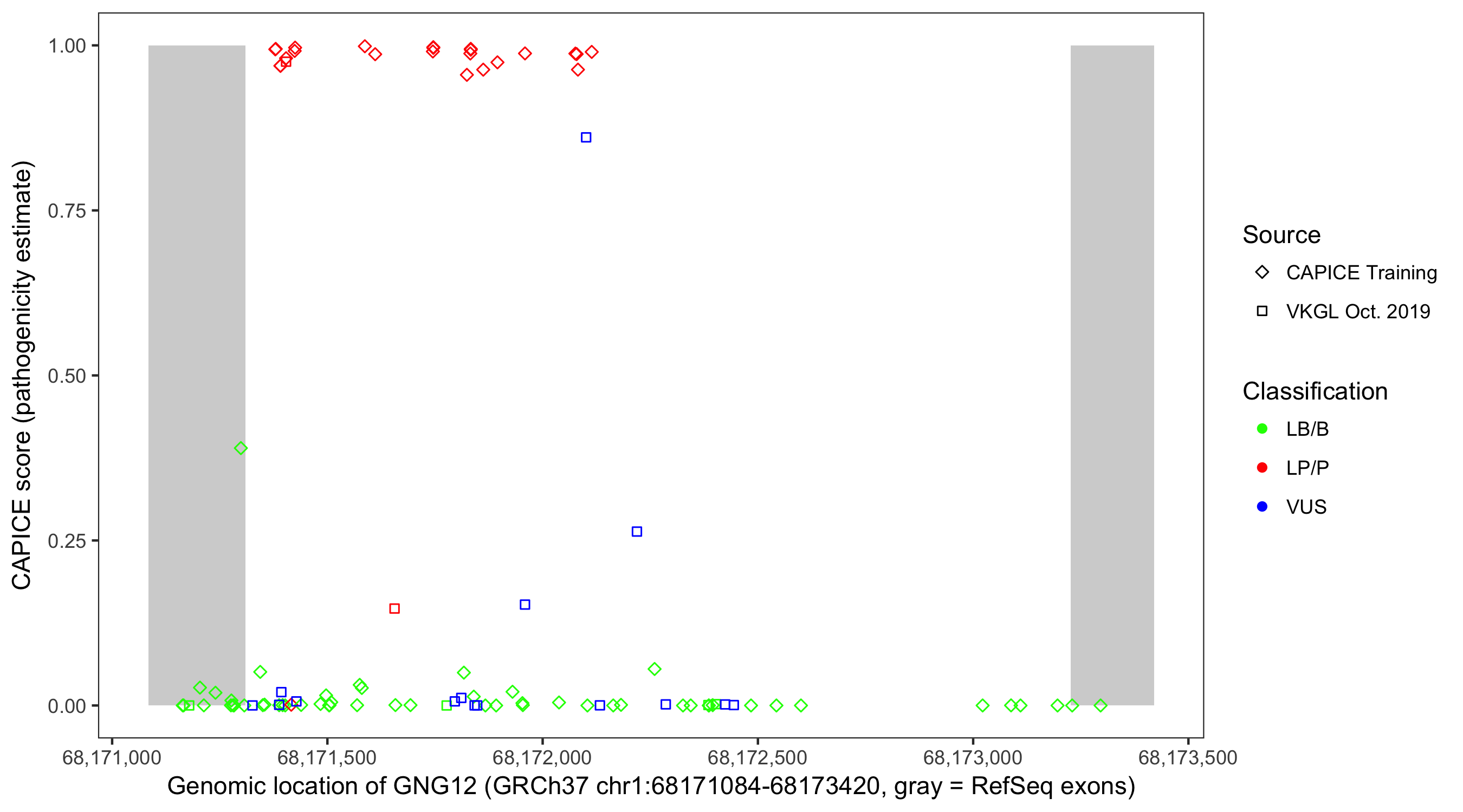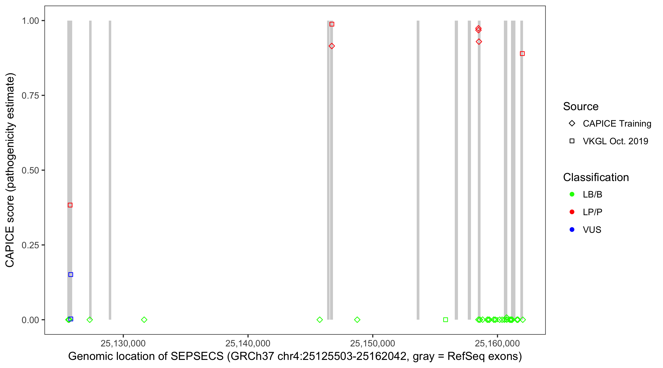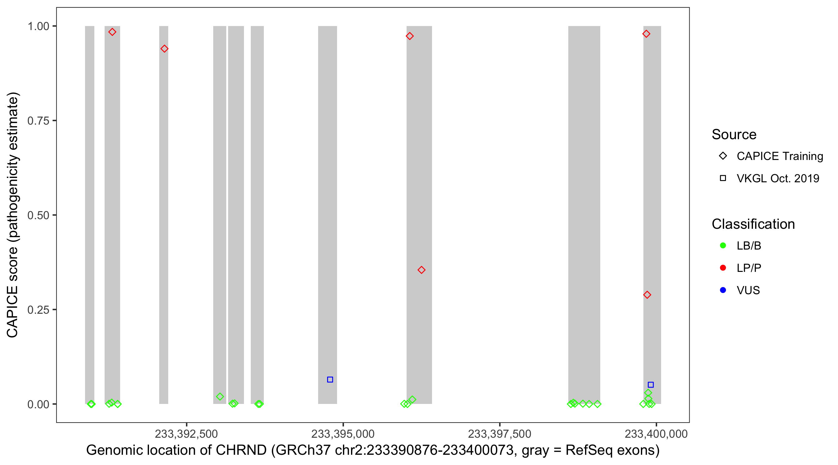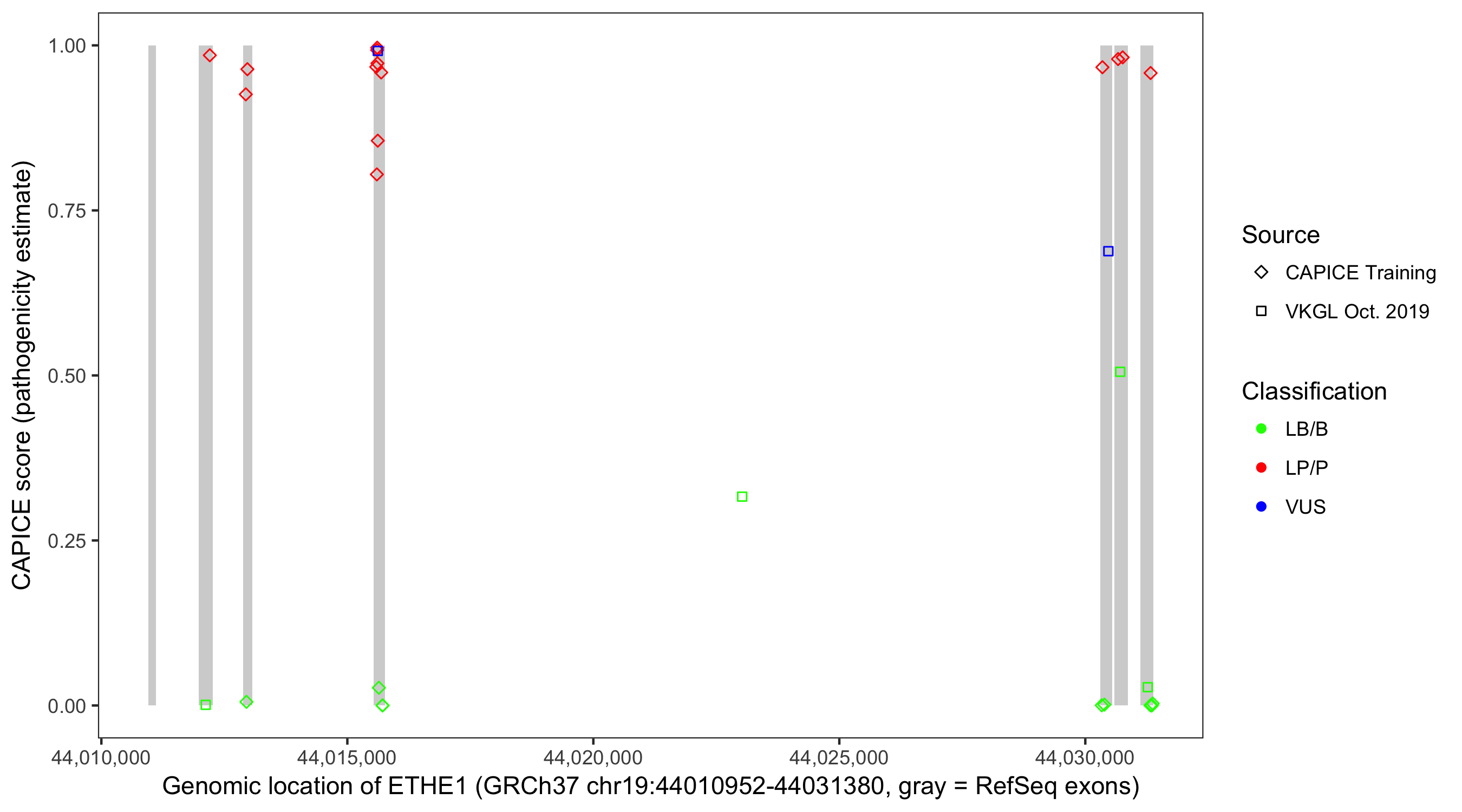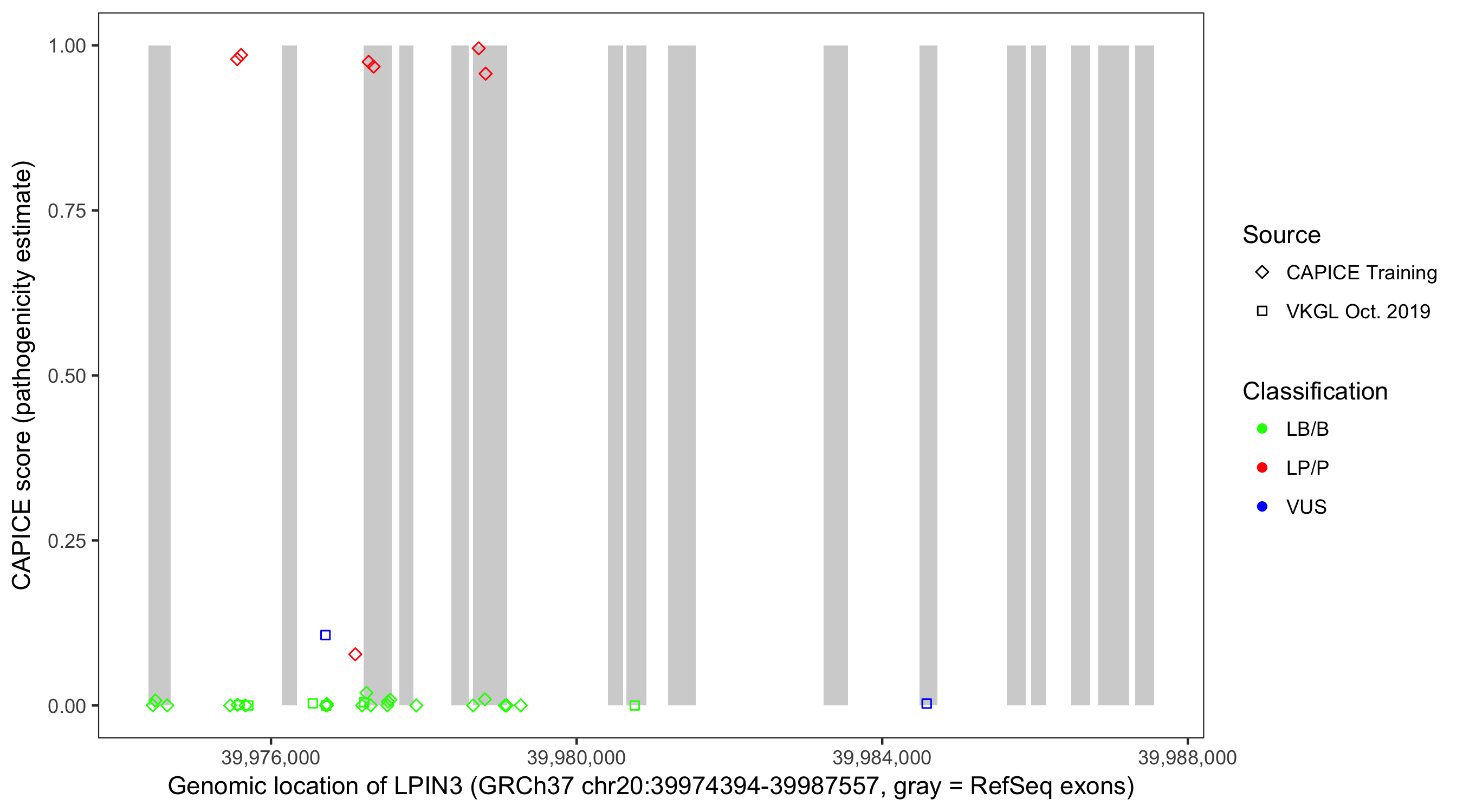 Shown are CAPICE train/test variants plus VKGL Oct 2019.