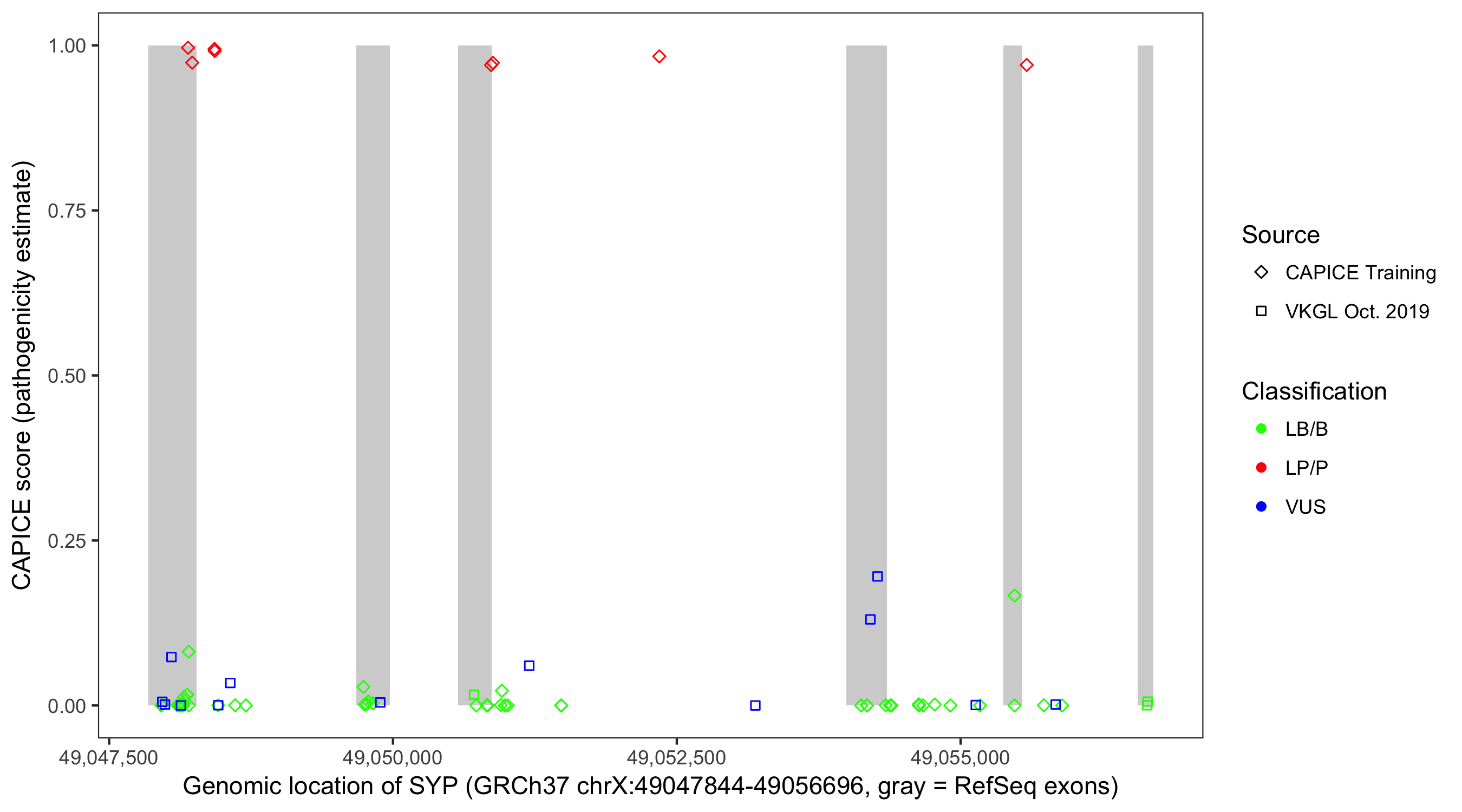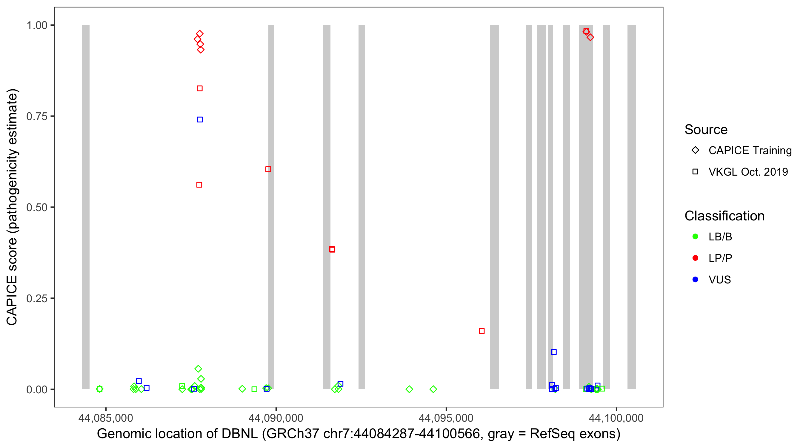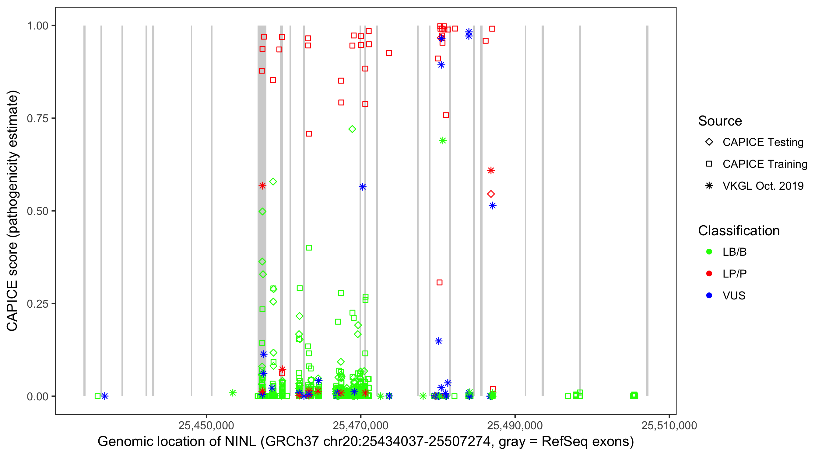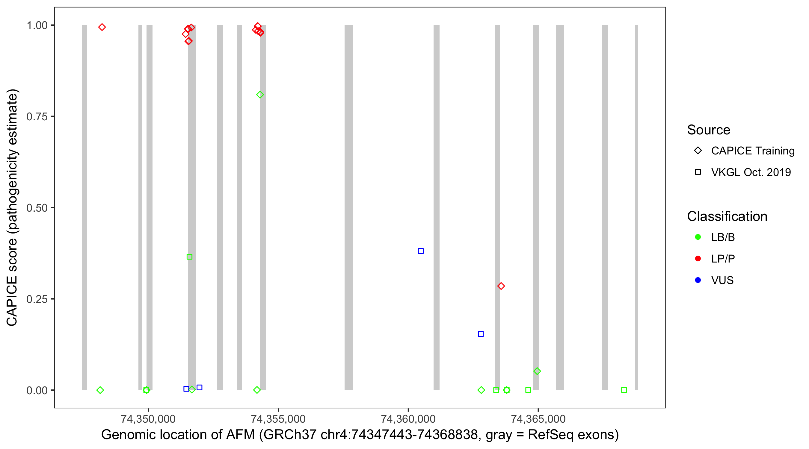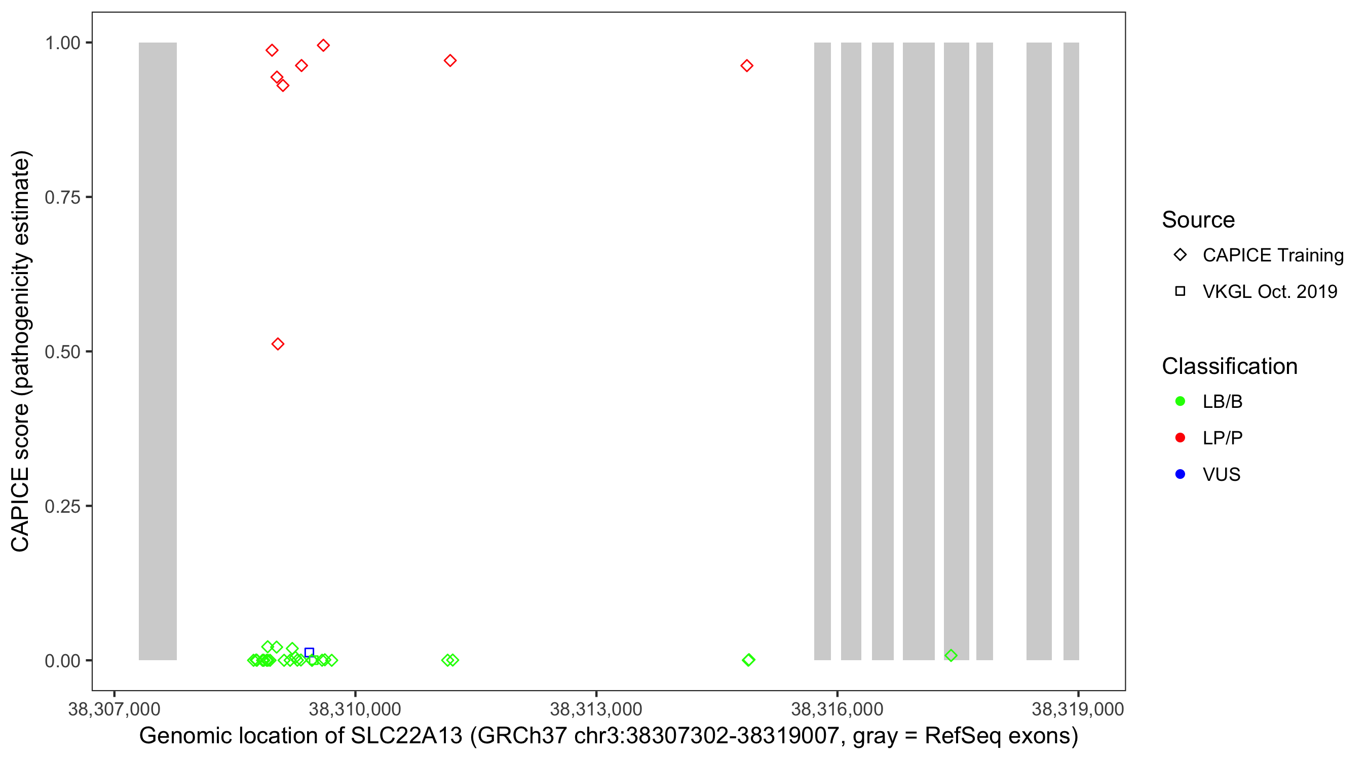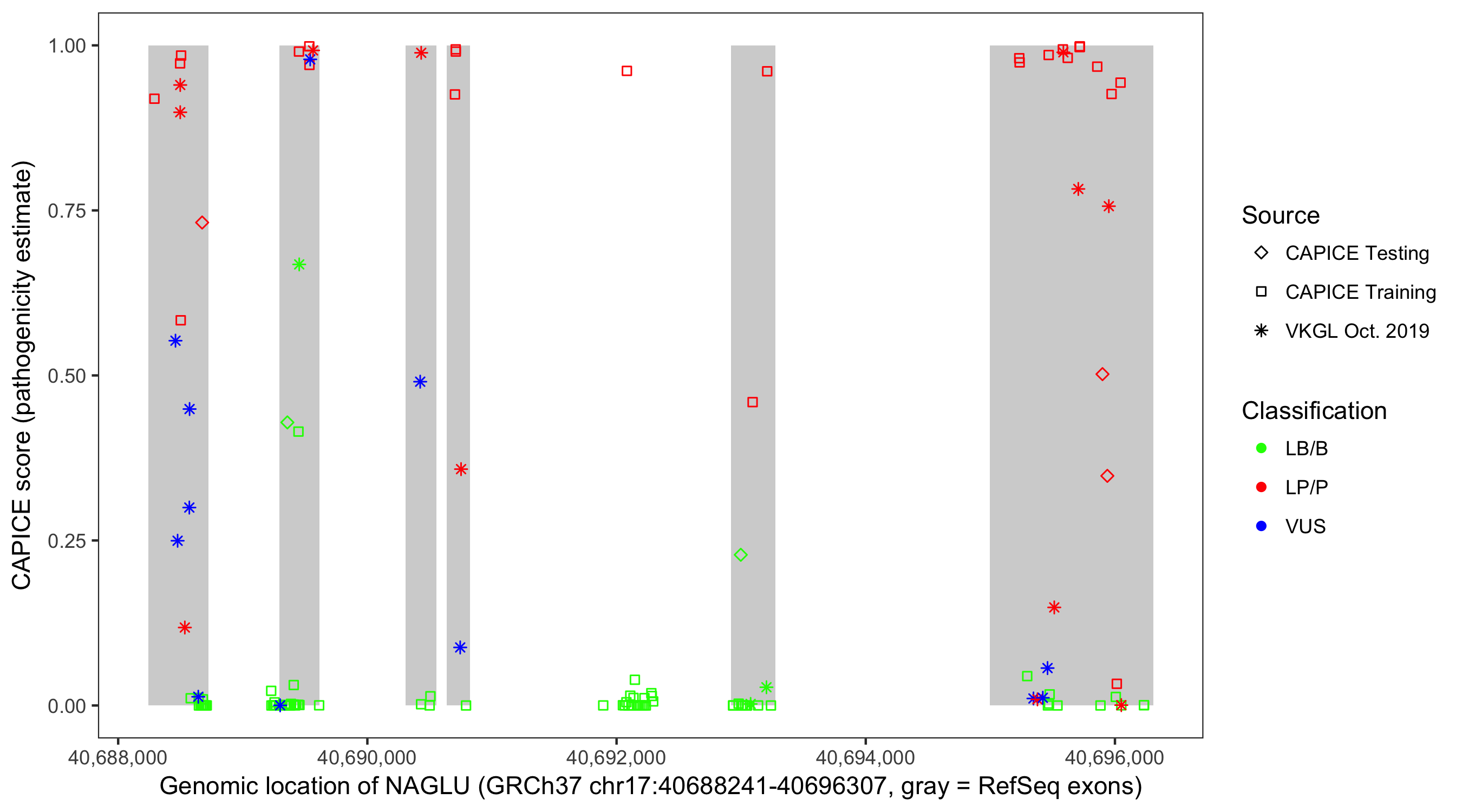 Shown are CAPICE train/test variants plus VKGL Oct 2019.