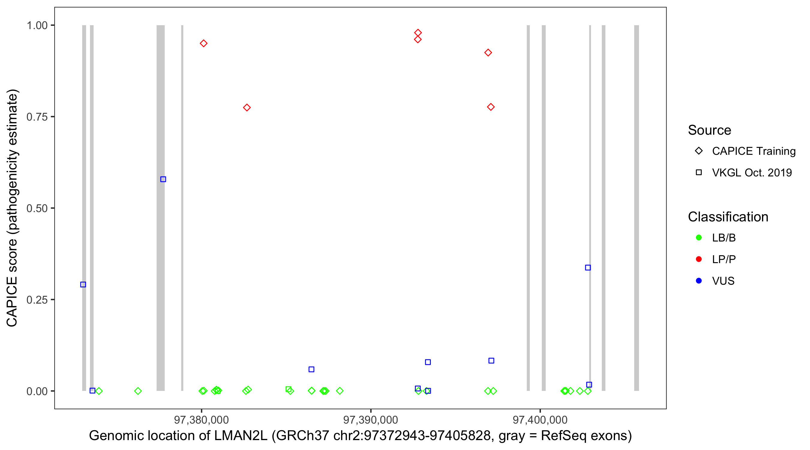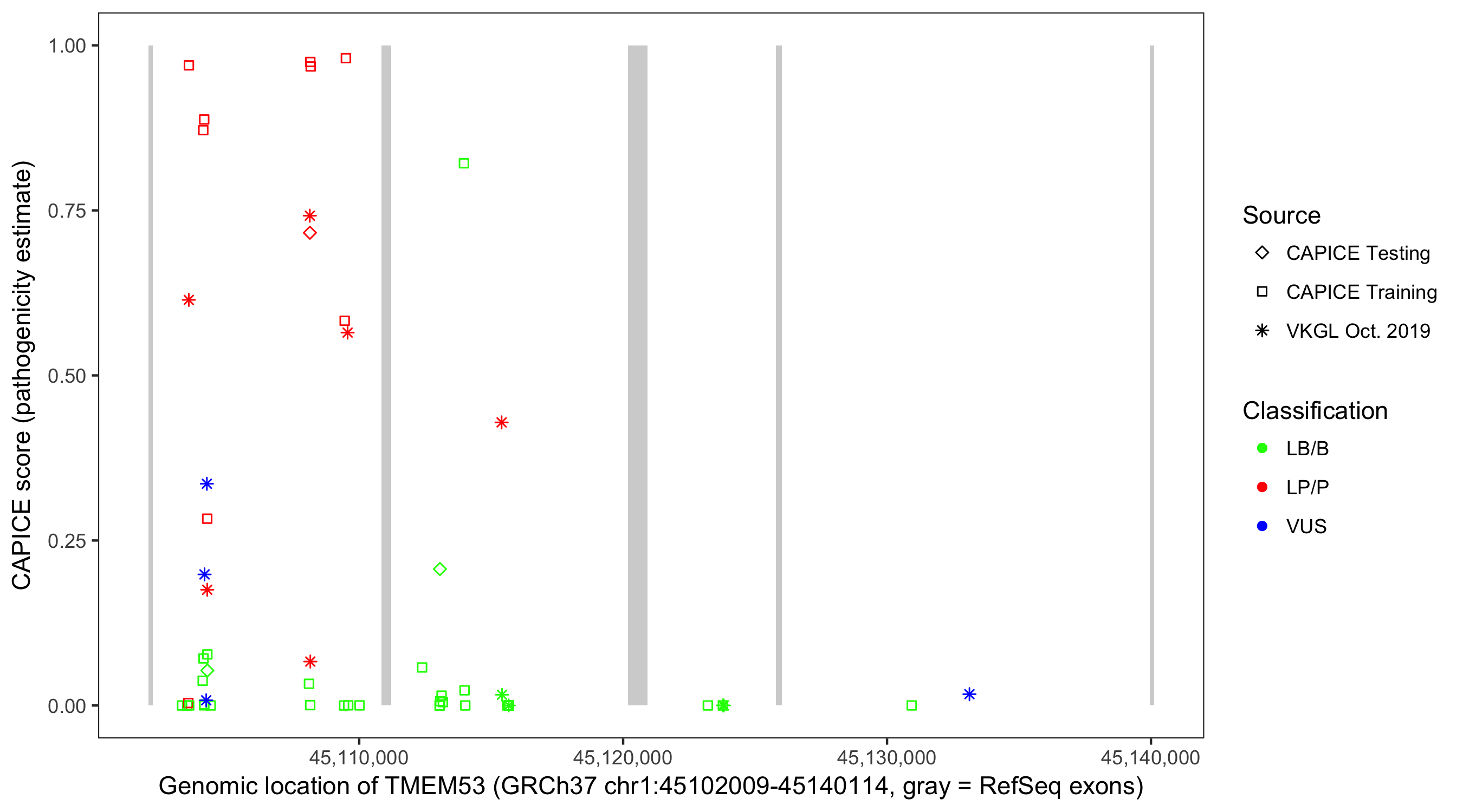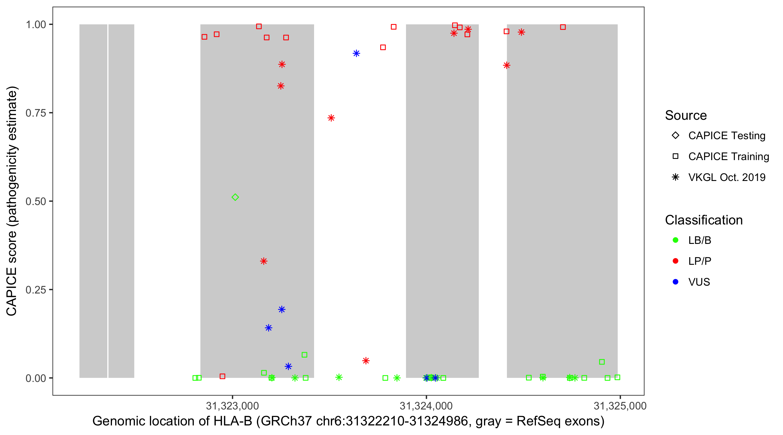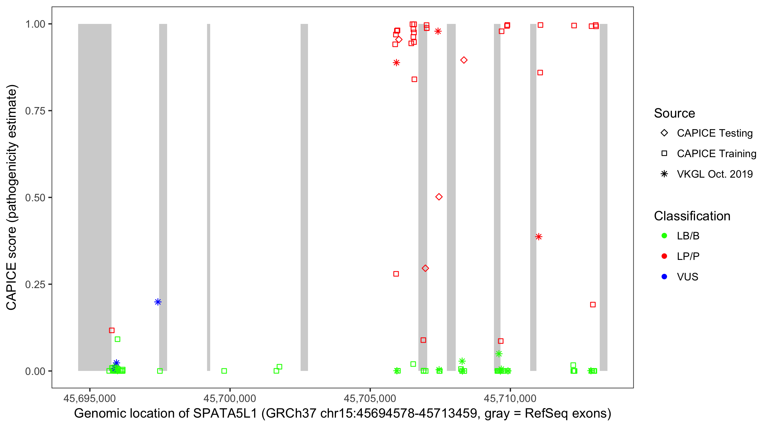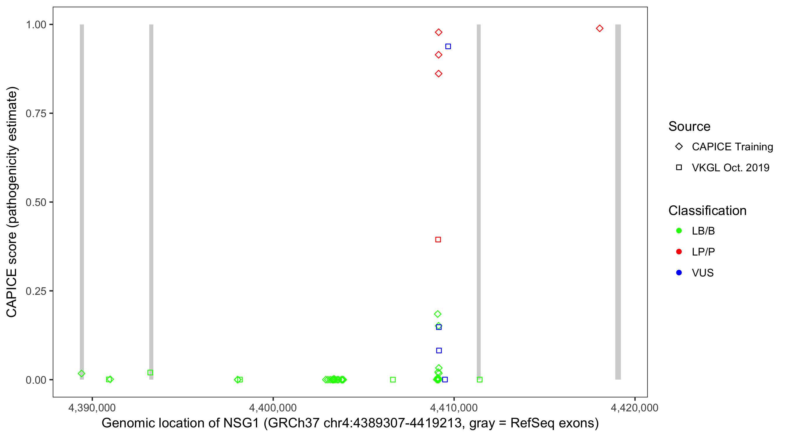 Shown are CAPICE train/test variants plus VKGL Oct 2019.
