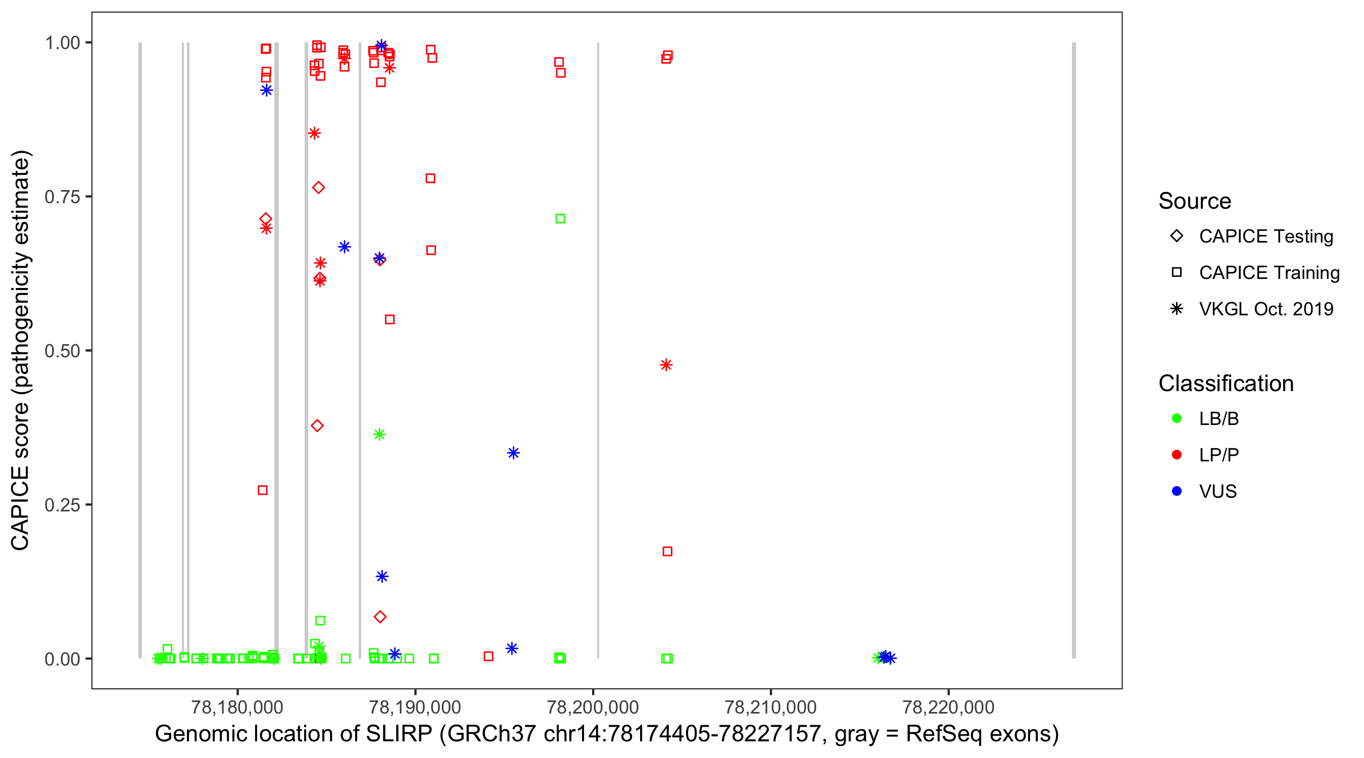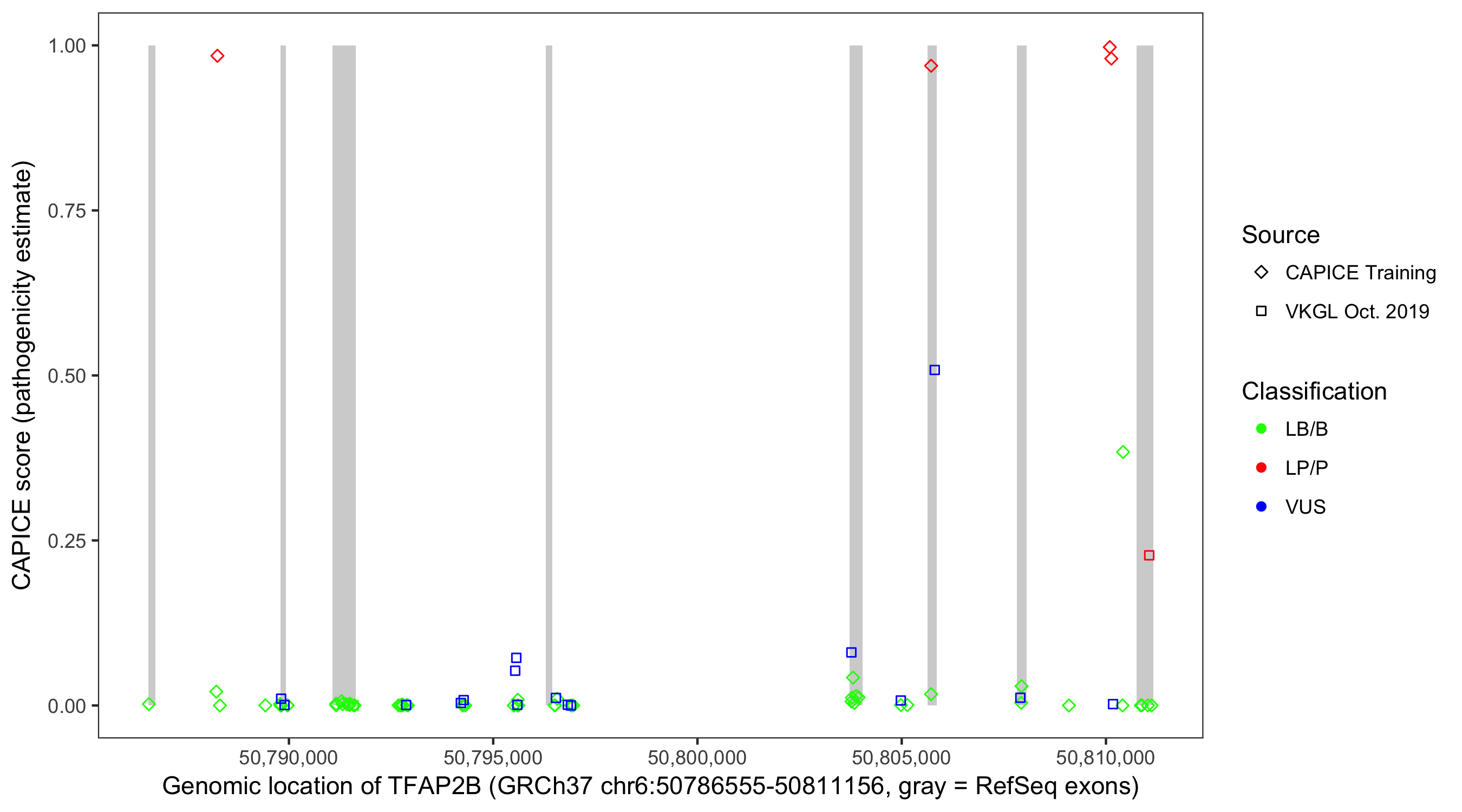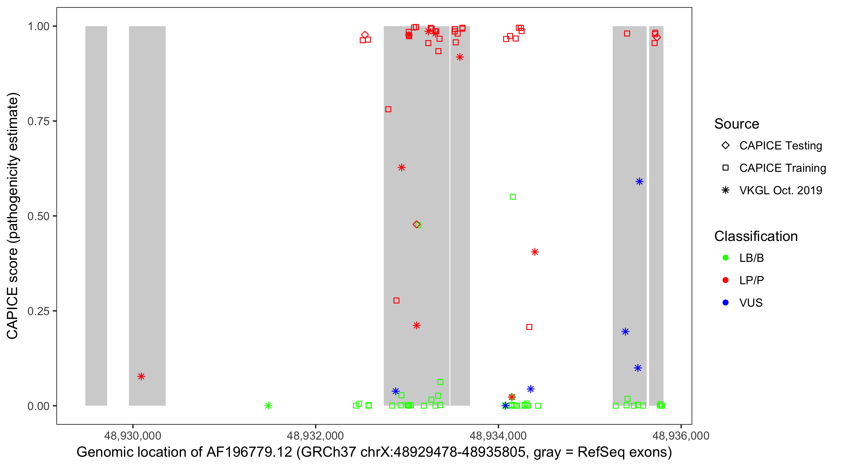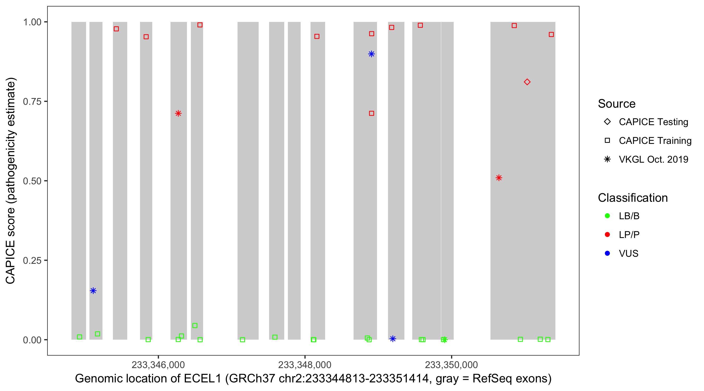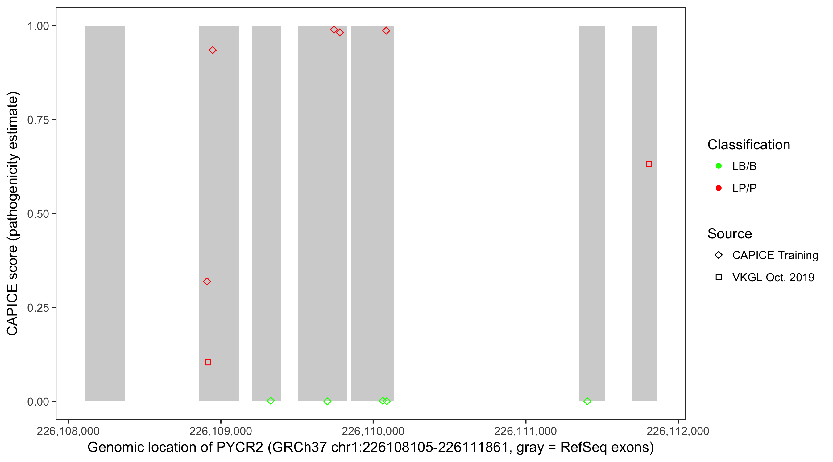Shown are CAPICE train/test variants plus VKGL Oct 2019.