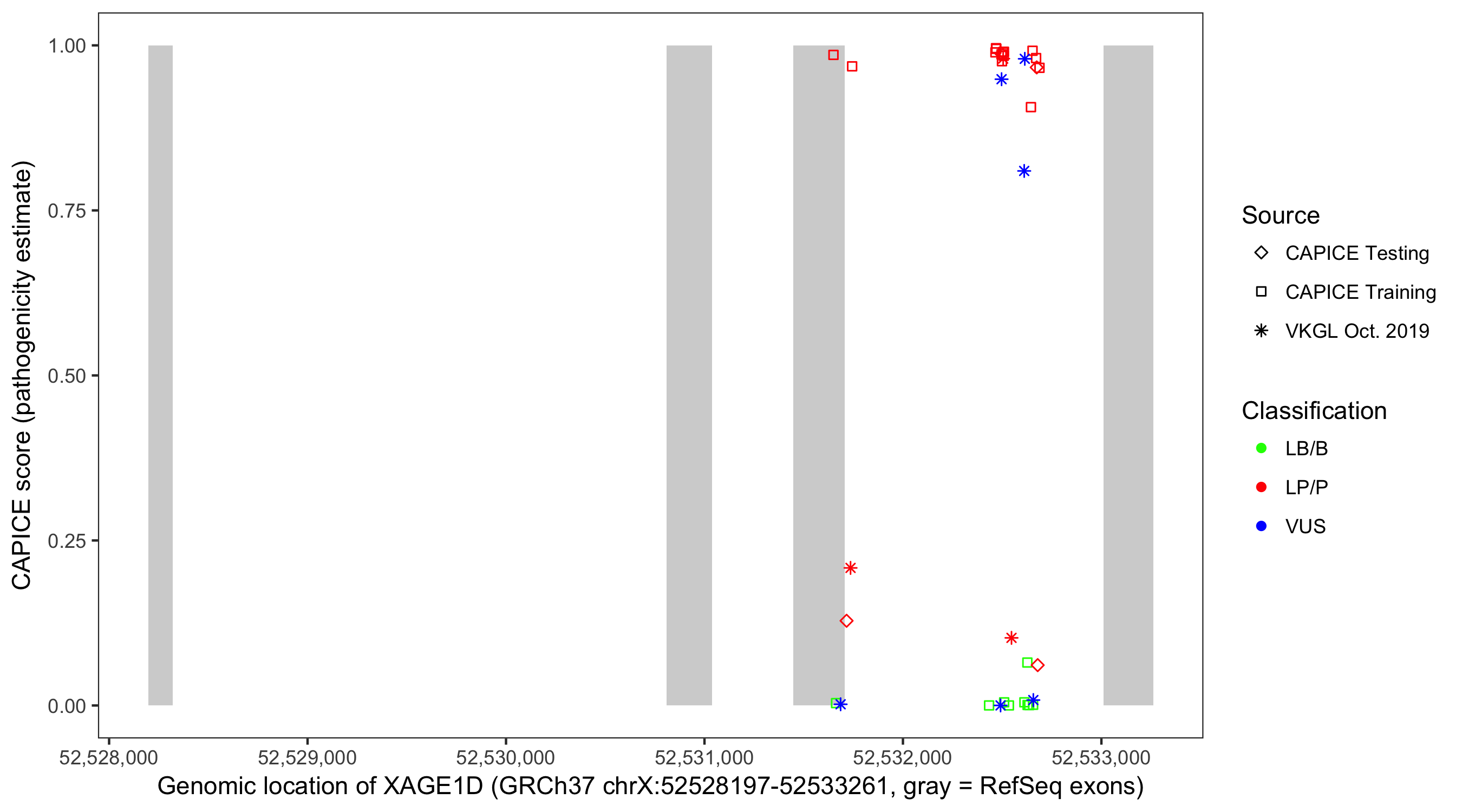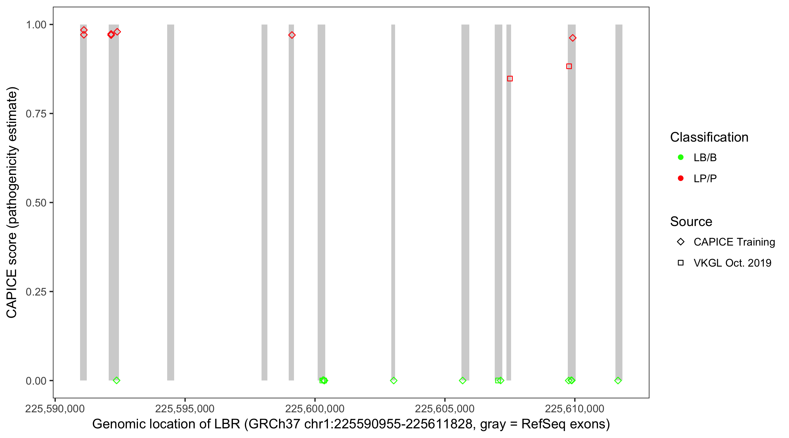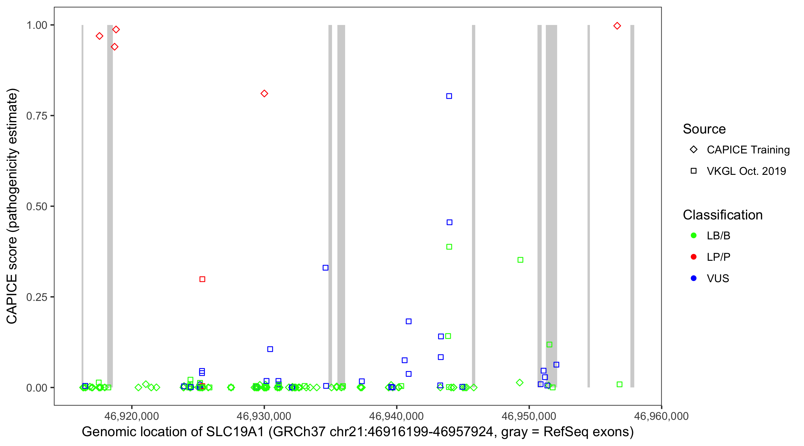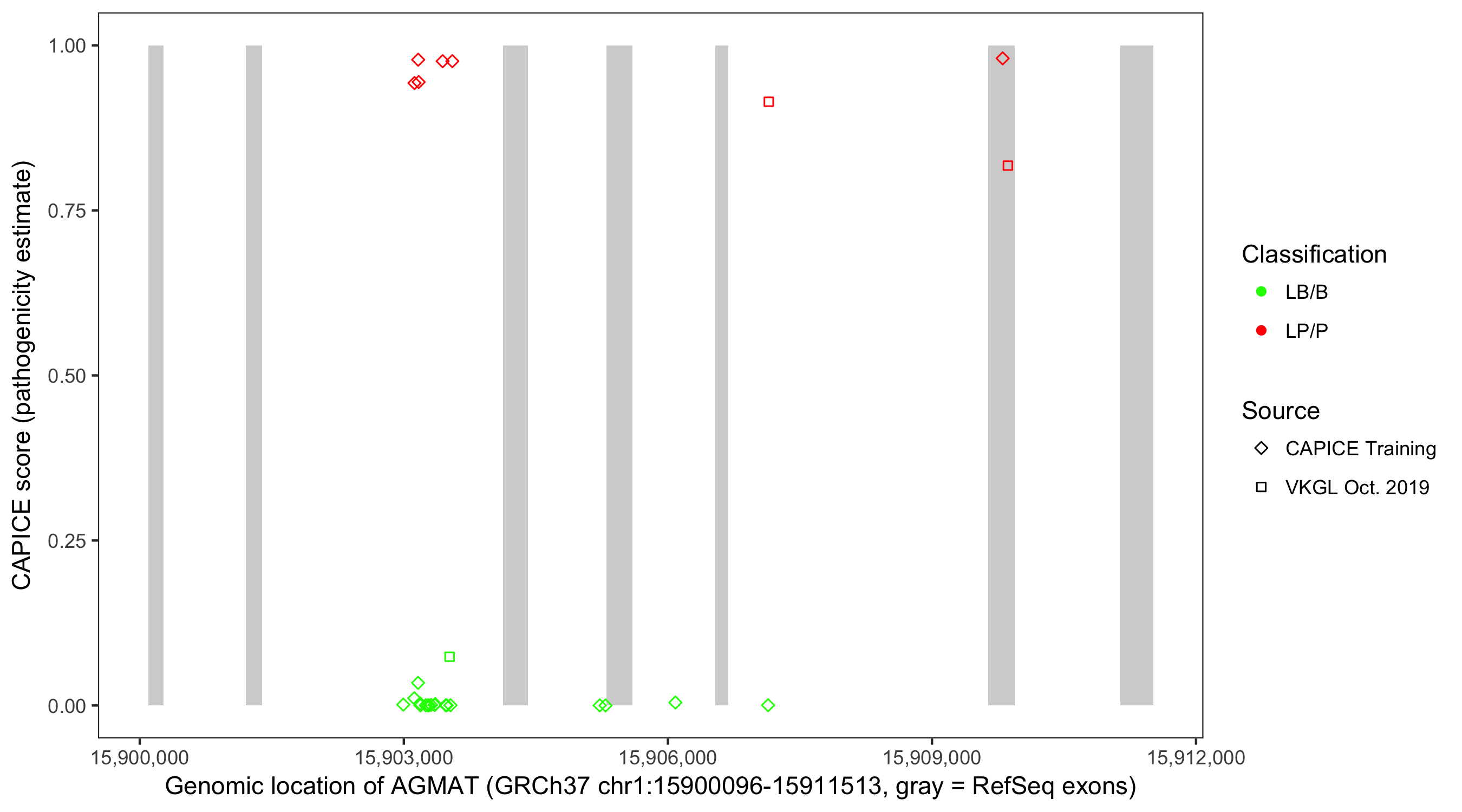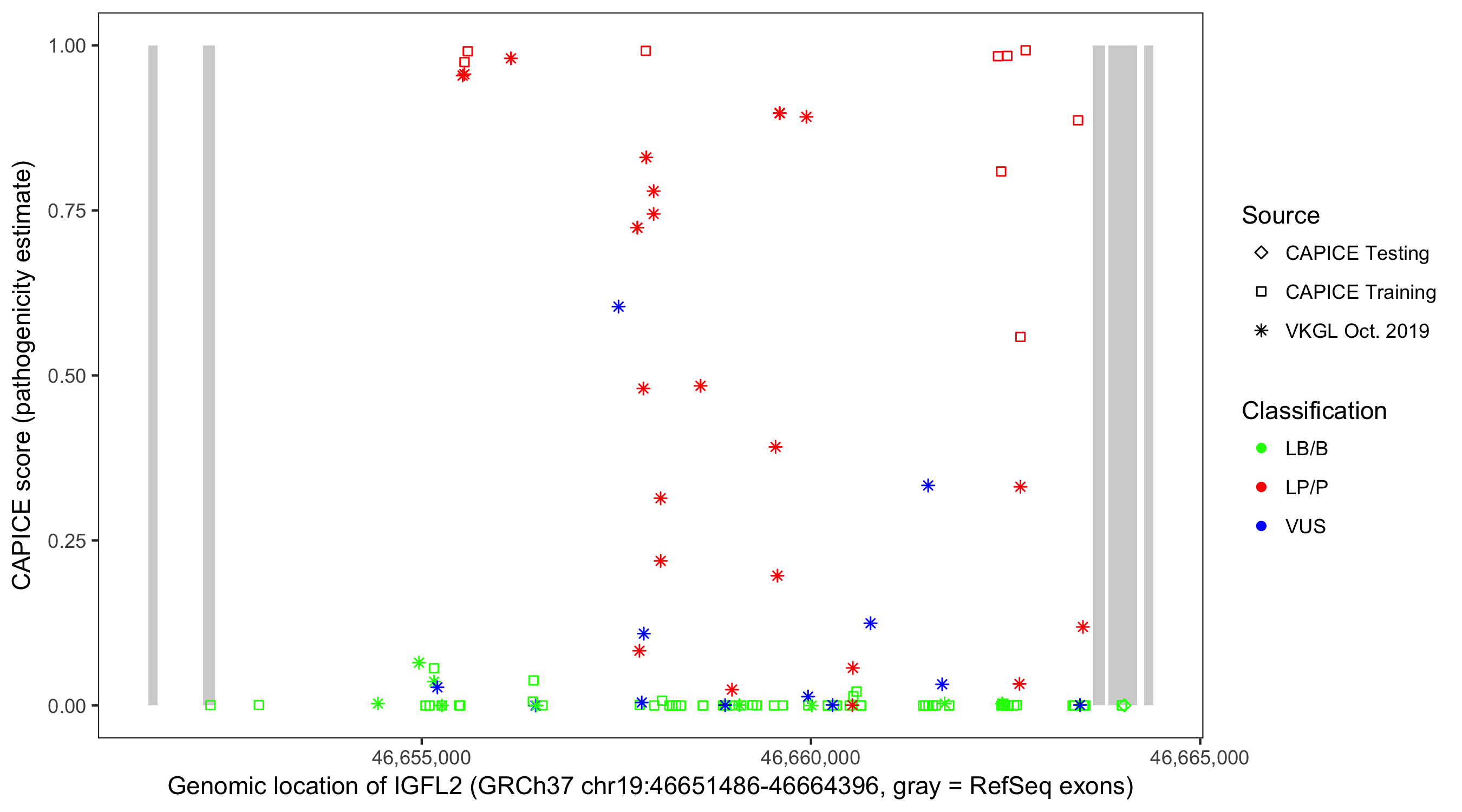 Shown are CAPICE train/test variants plus VKGL Oct 2019.