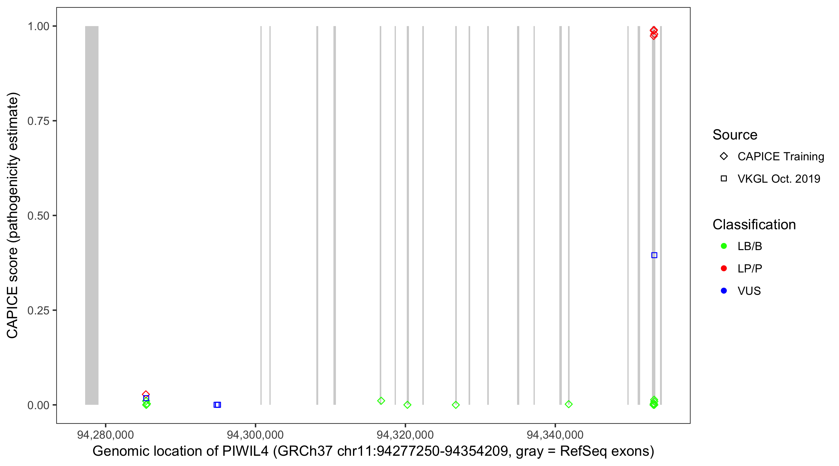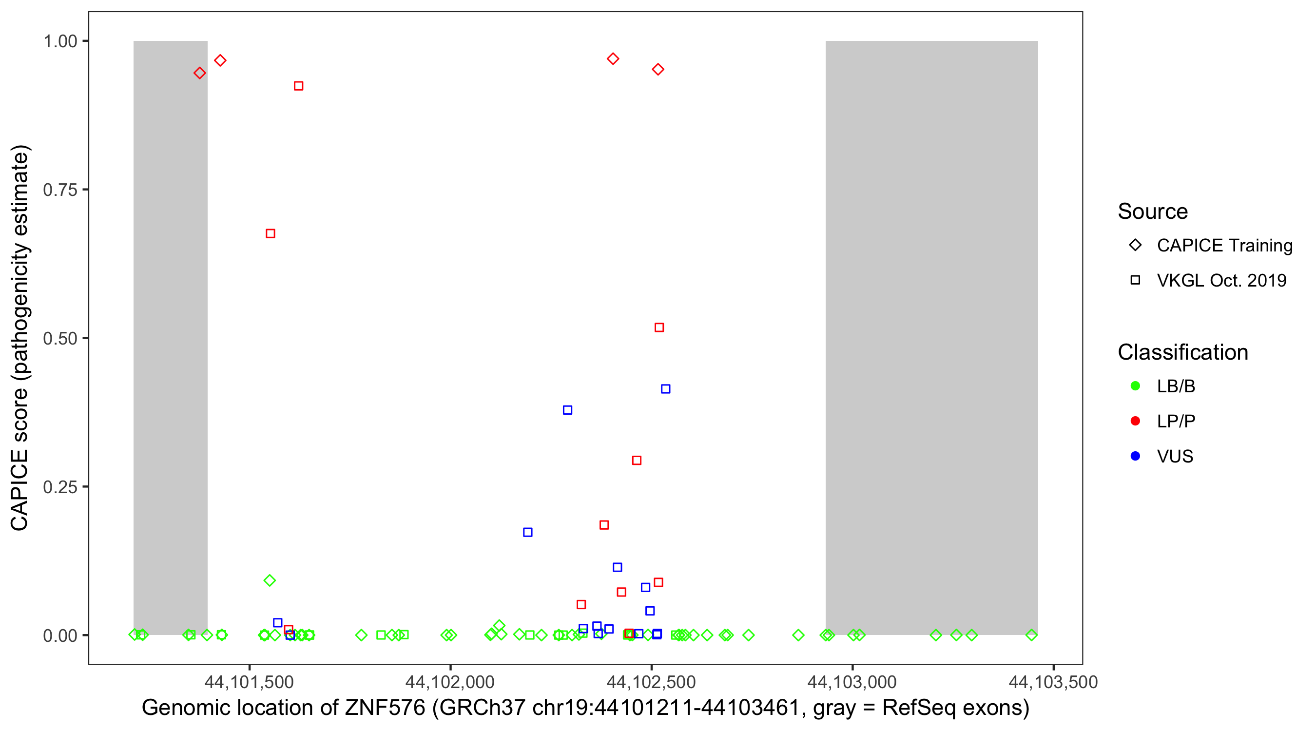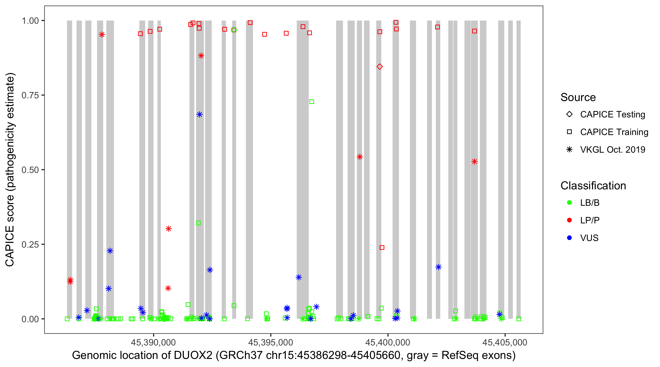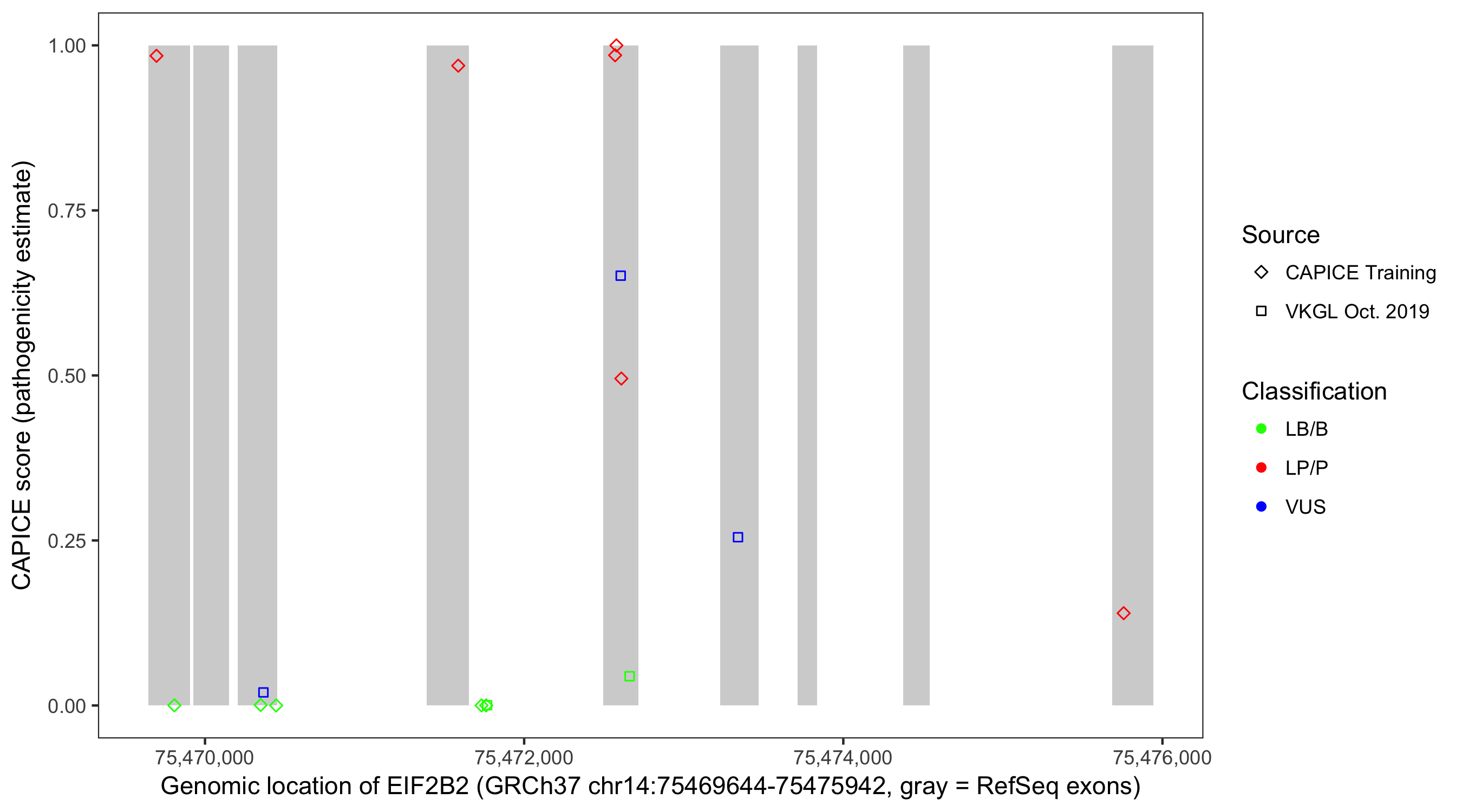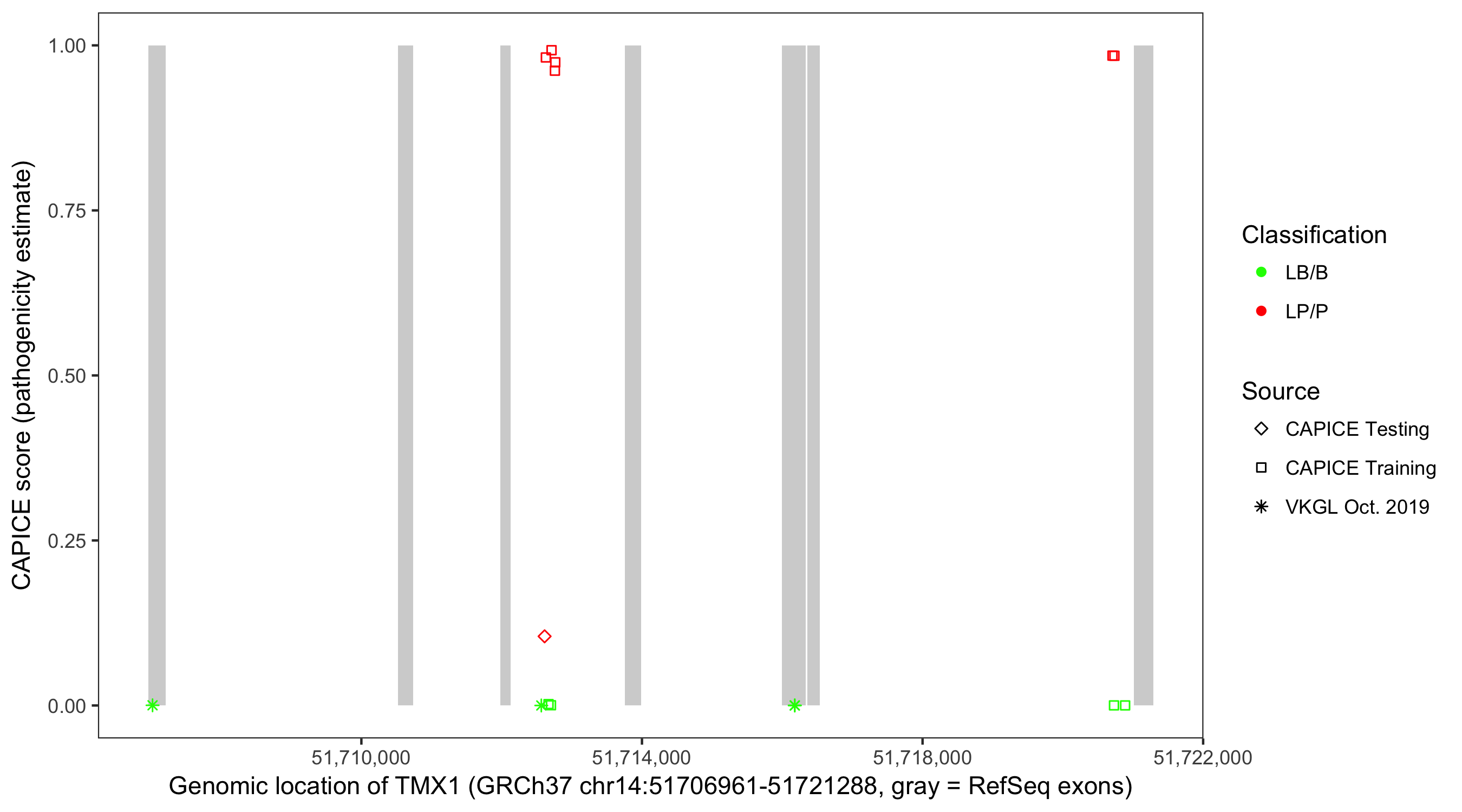 Shown are CAPICE train/test variants plus VKGL Oct 2019.