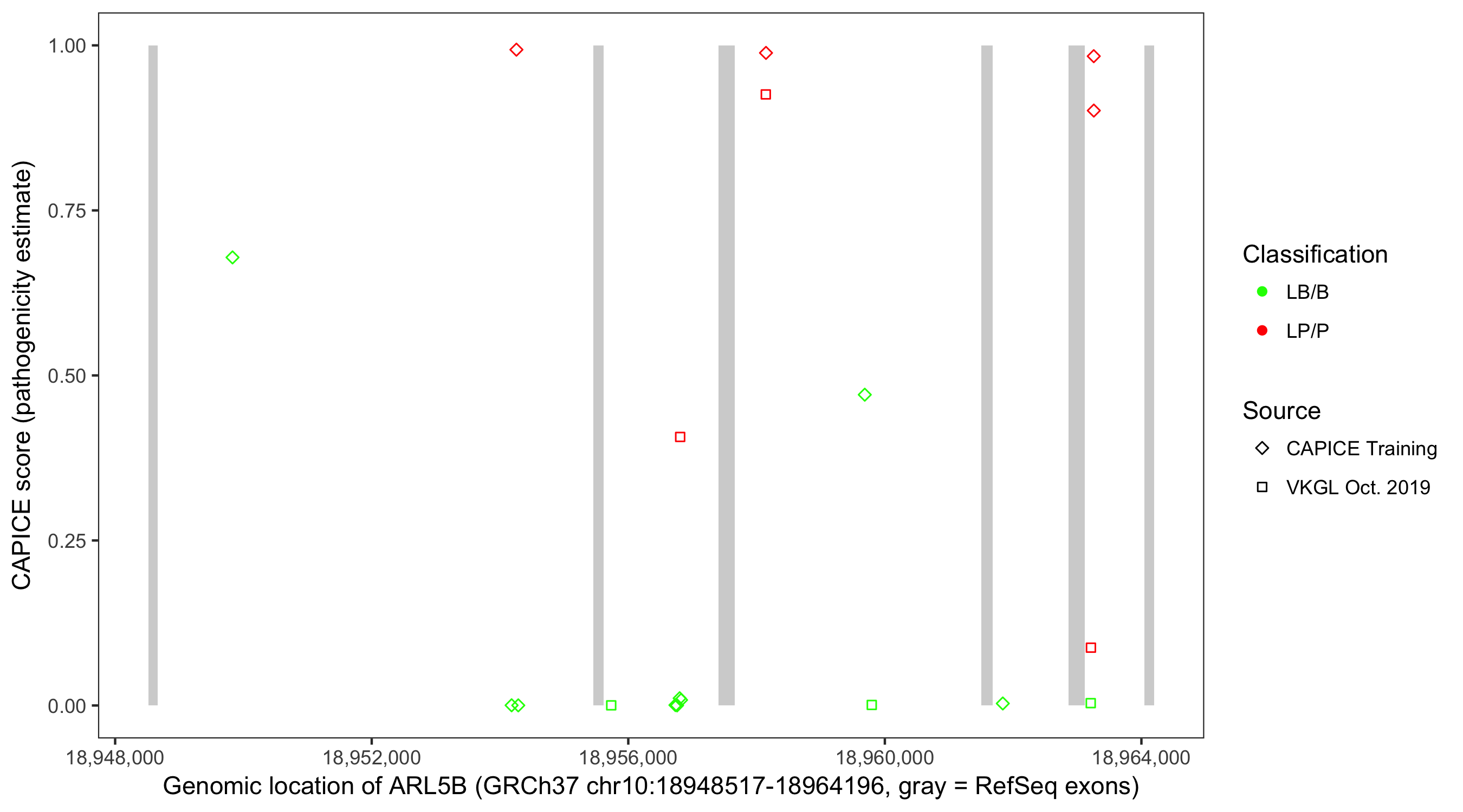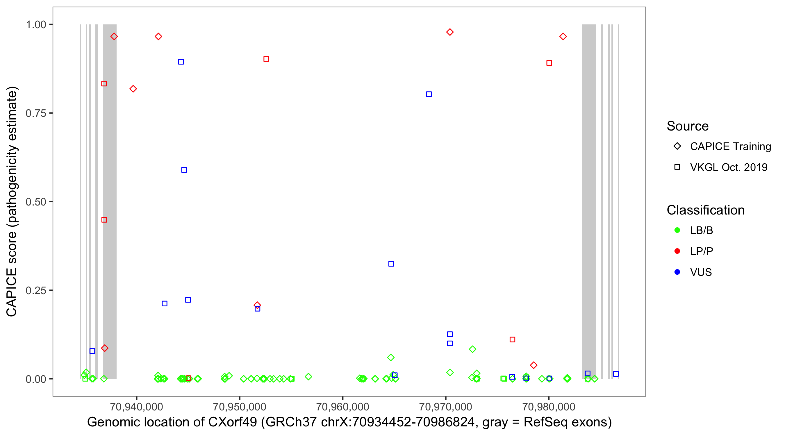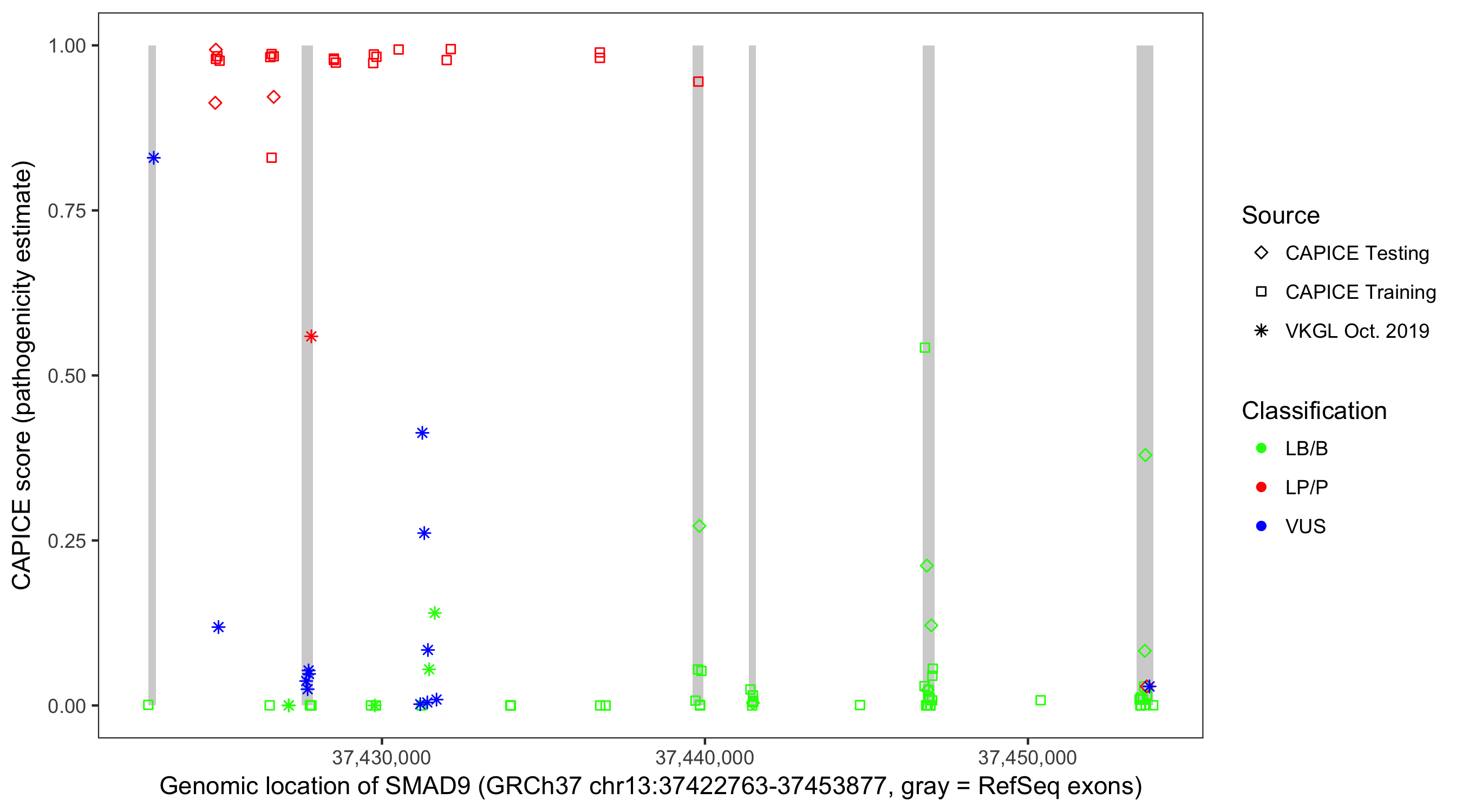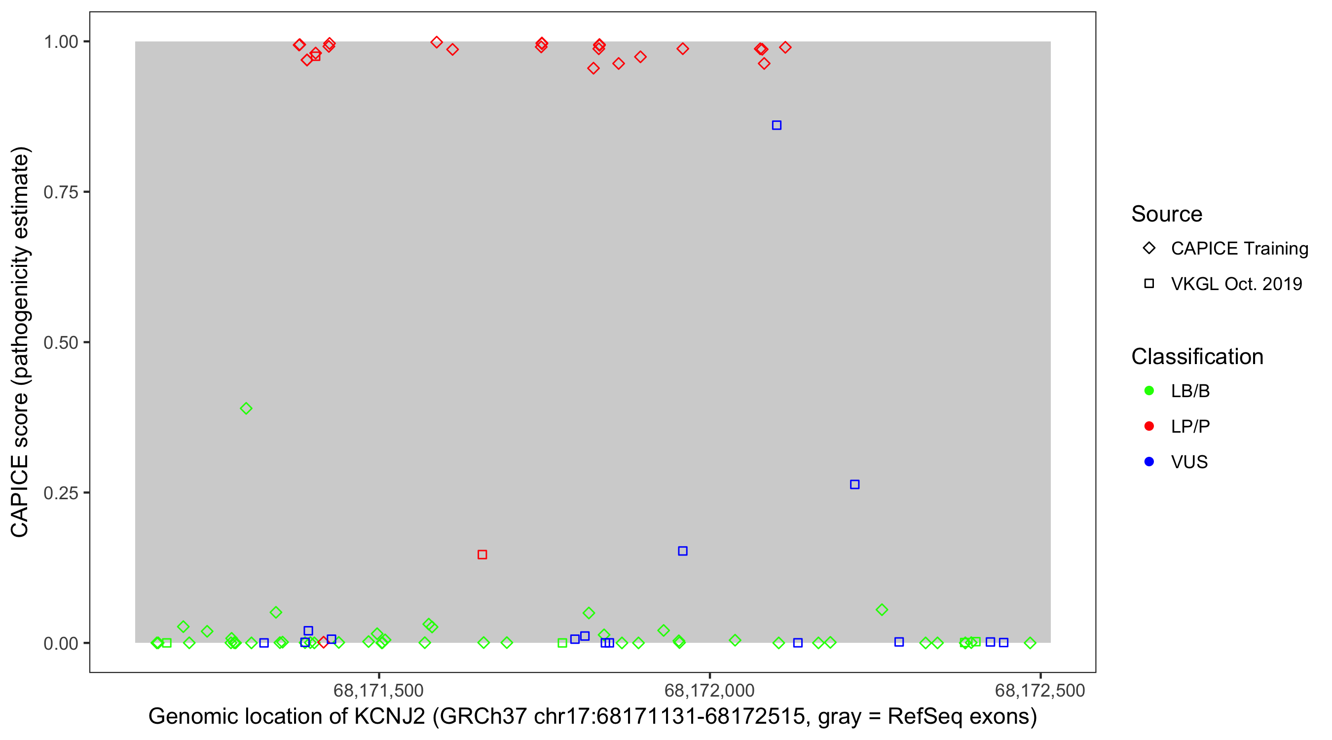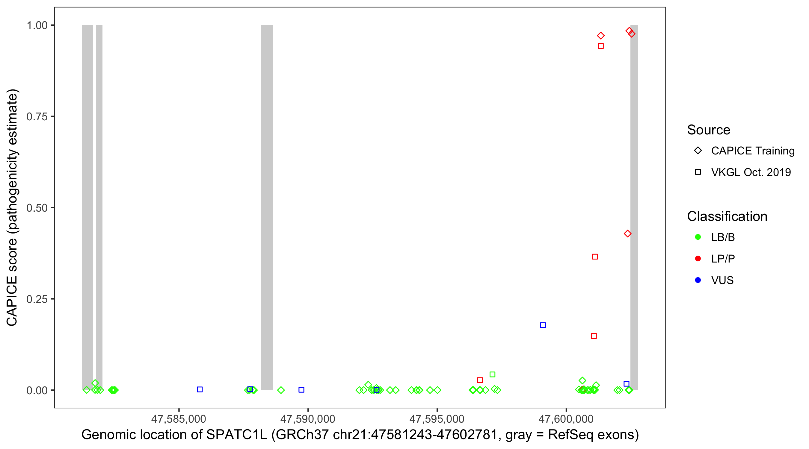 Shown are CAPICE train/test variants plus VKGL Oct 2019.