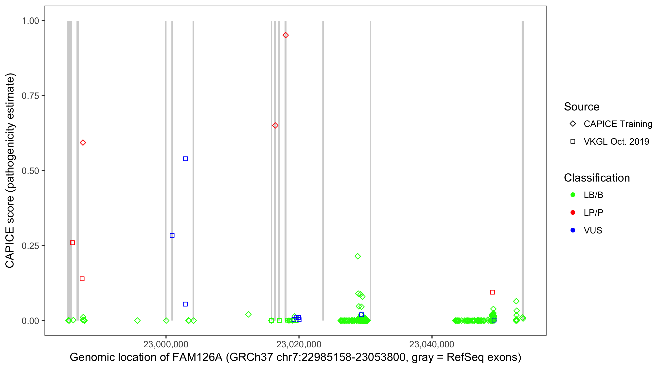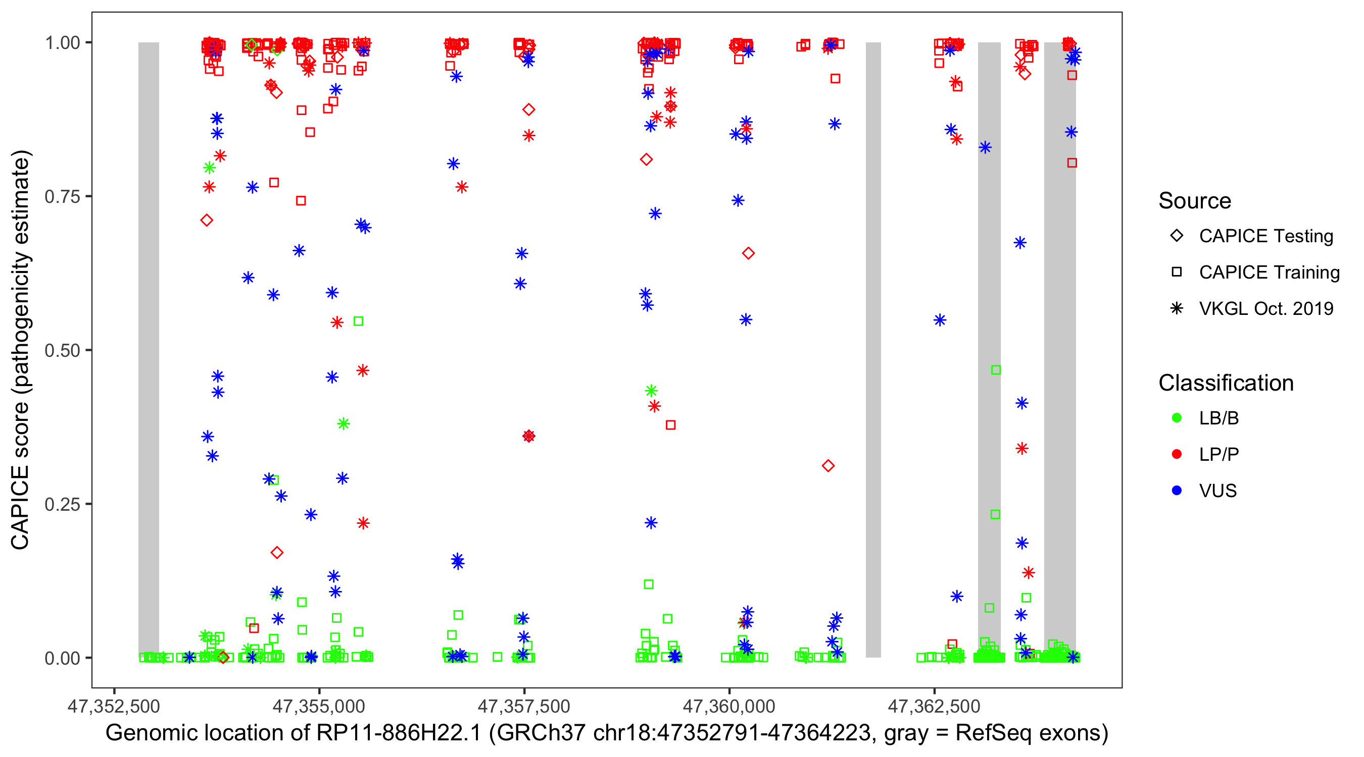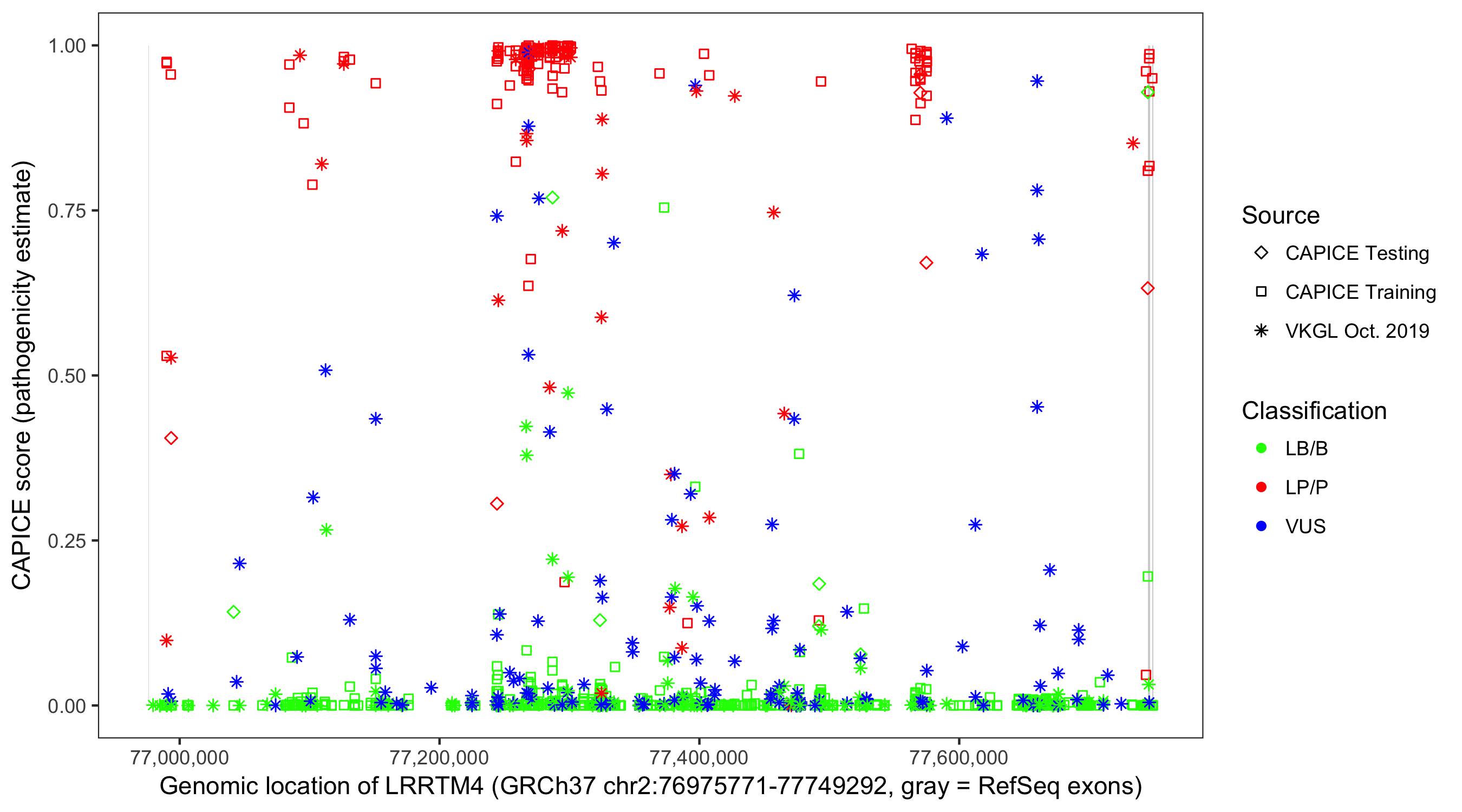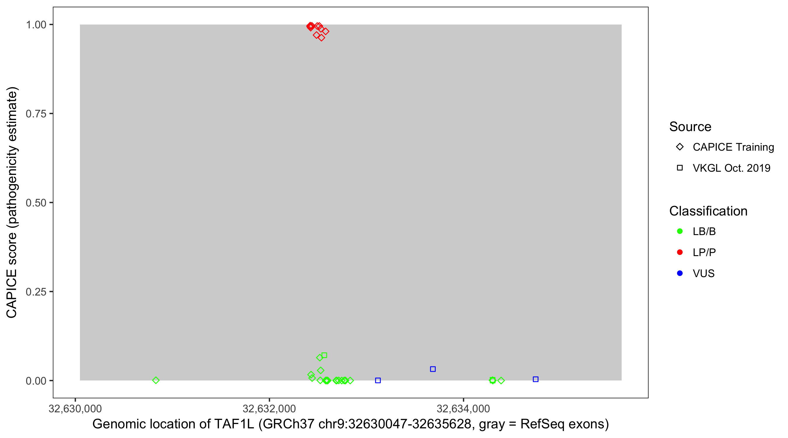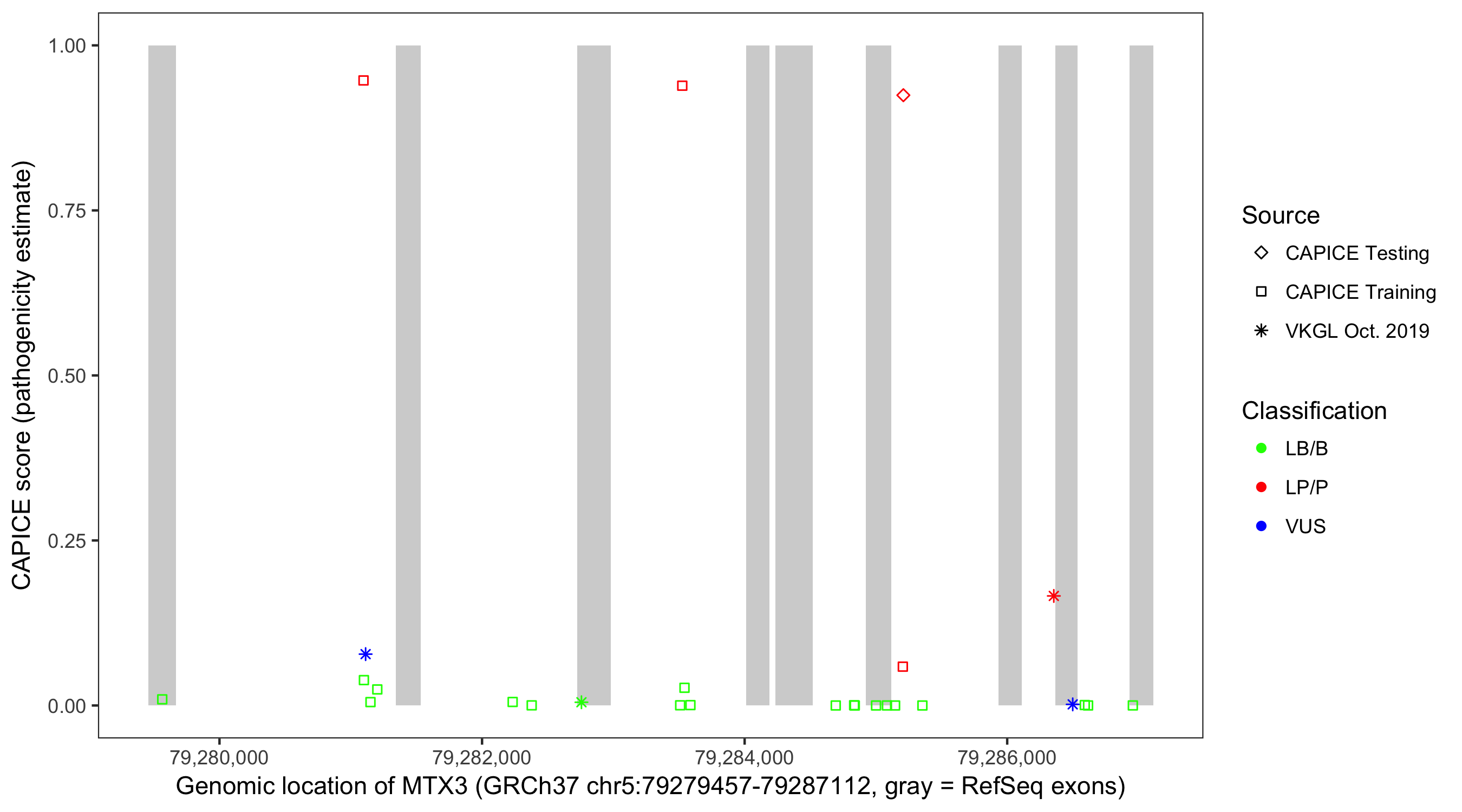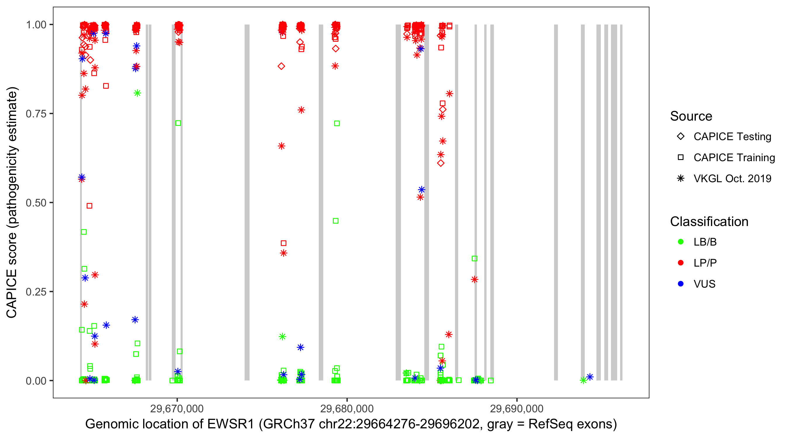 Shown are CAPICE train/test variants plus VKGL Oct 2019.
