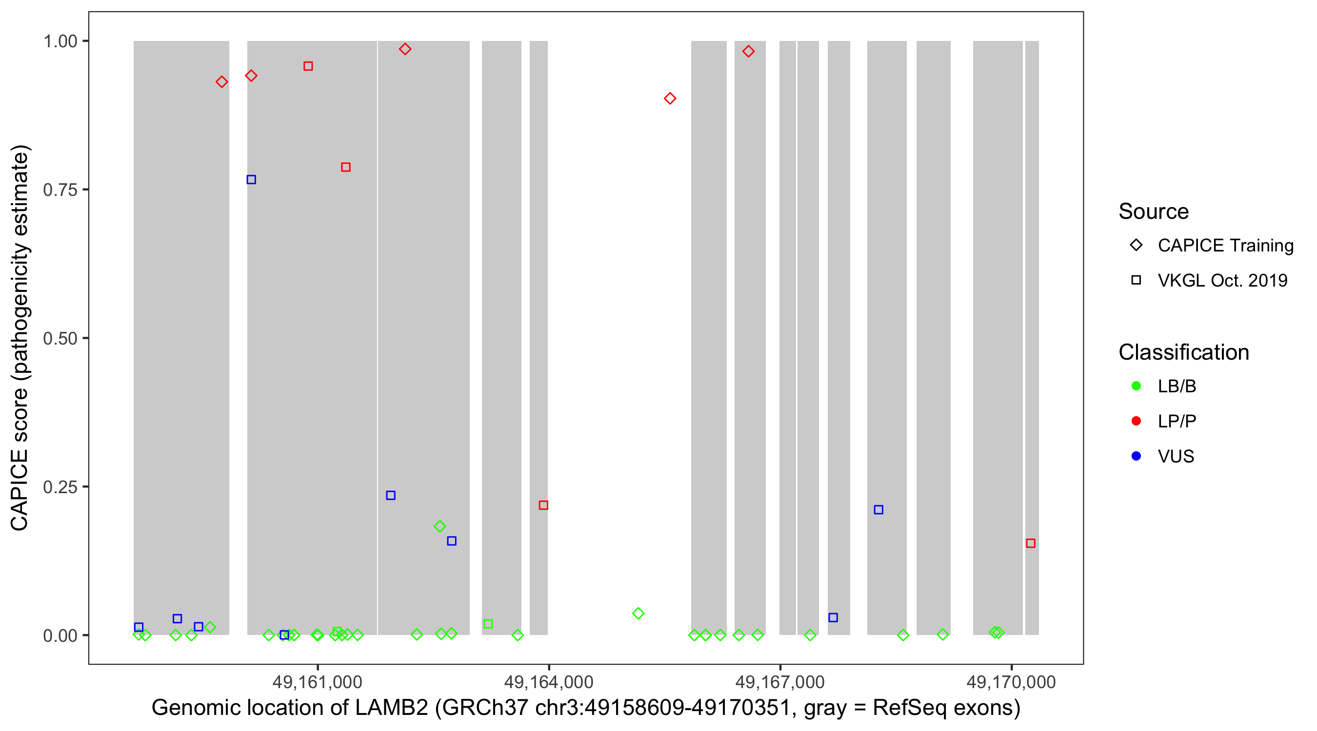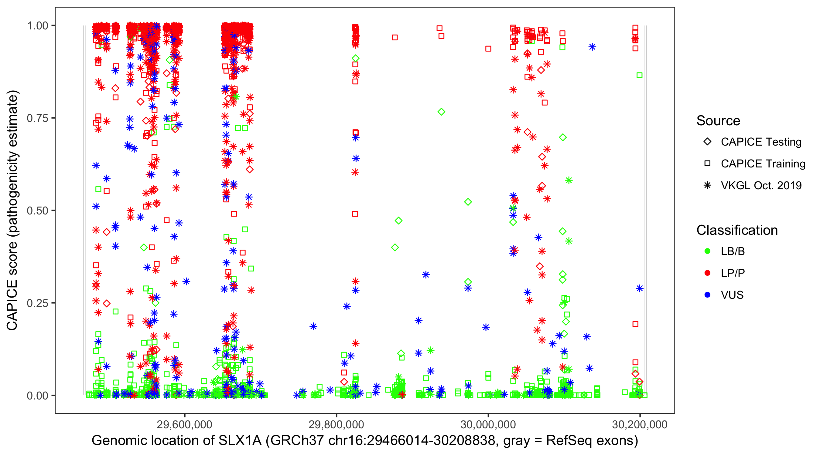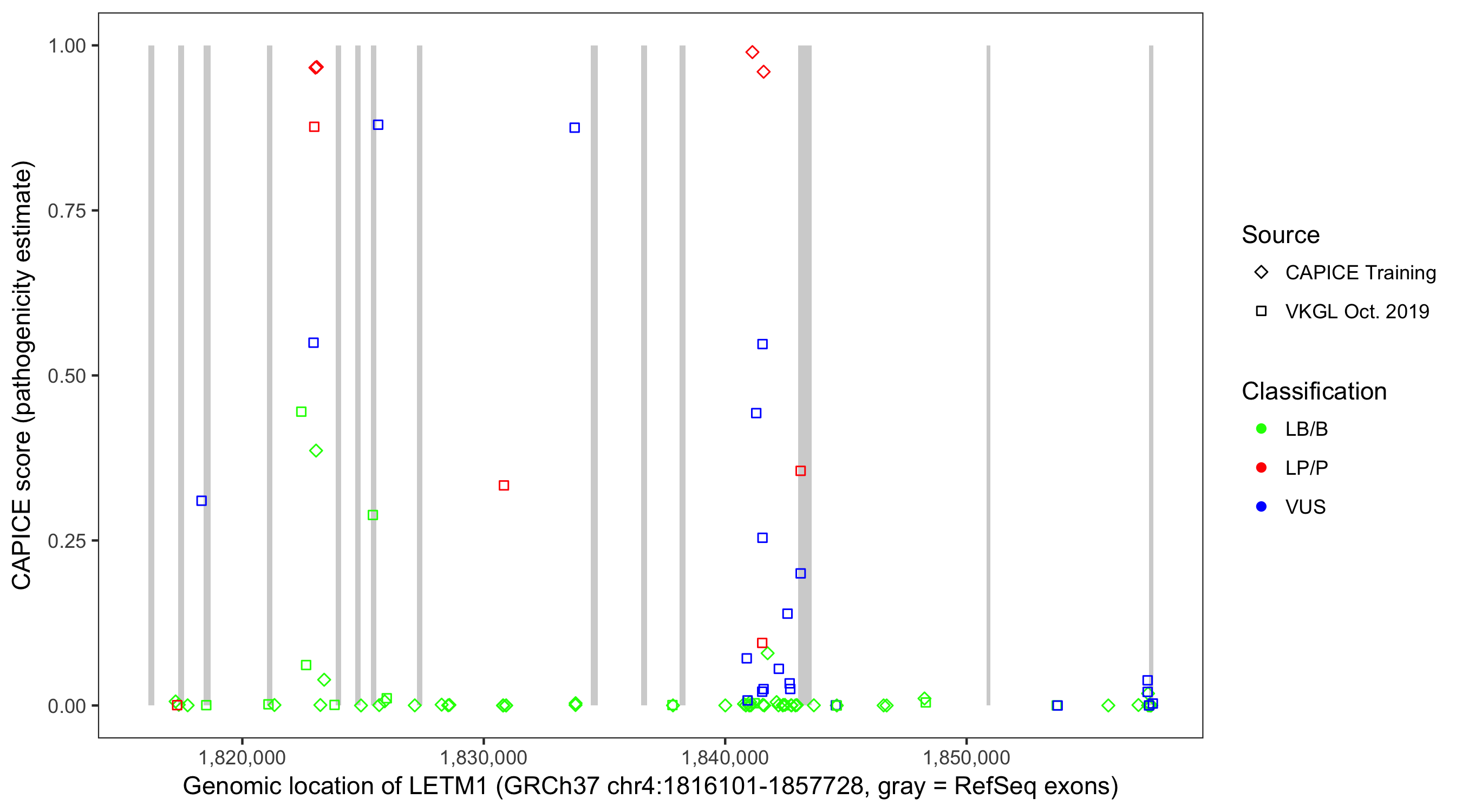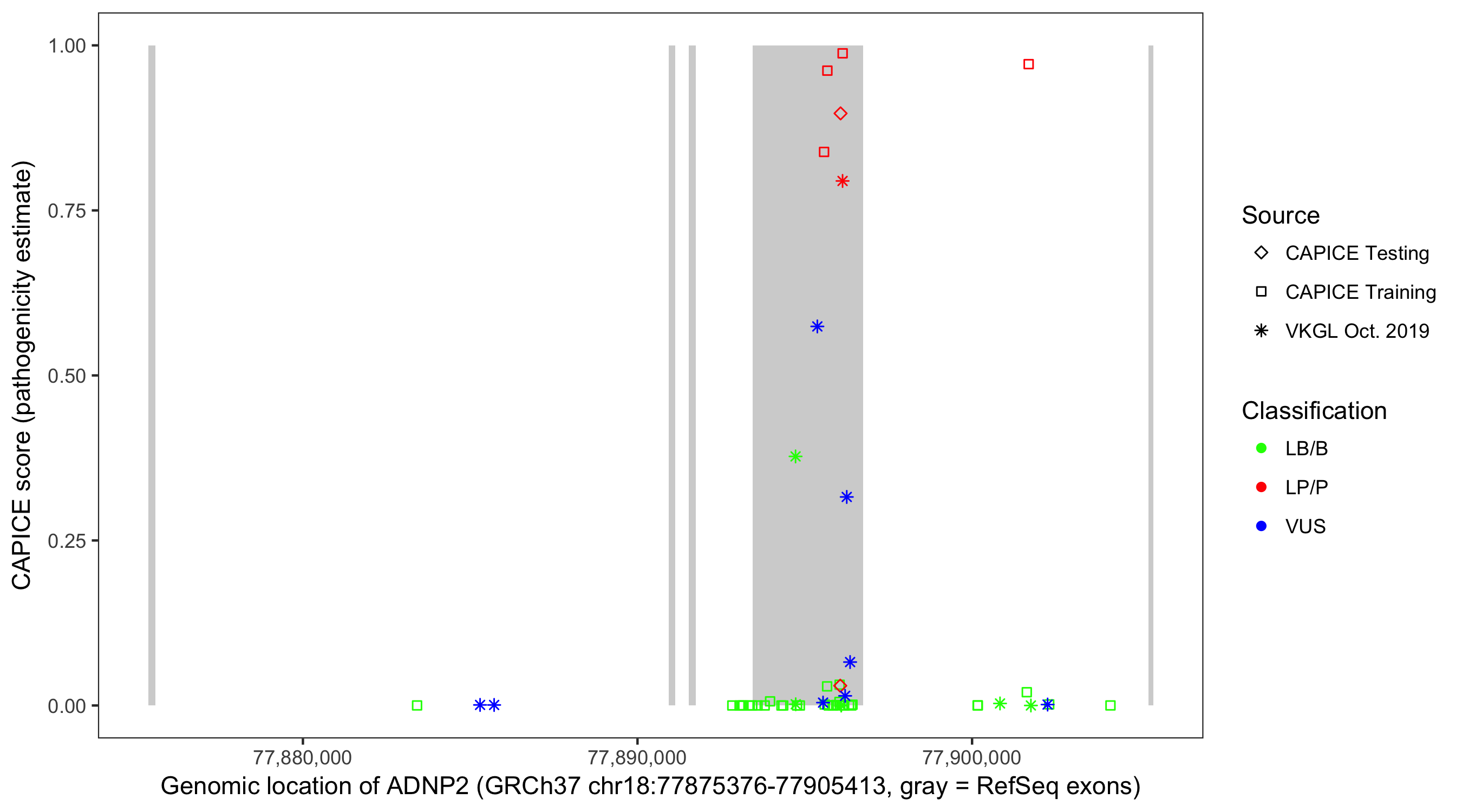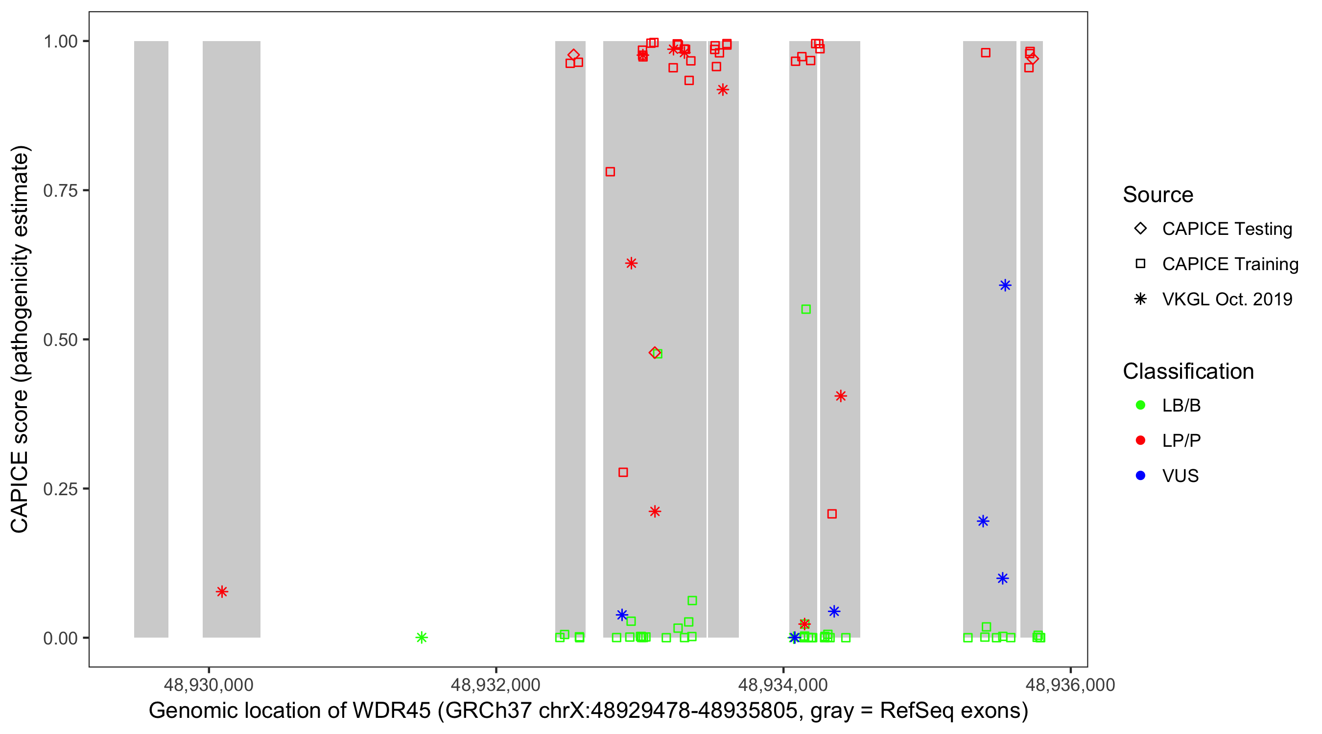 Shown are CAPICE train/test variants plus VKGL Oct 2019.
