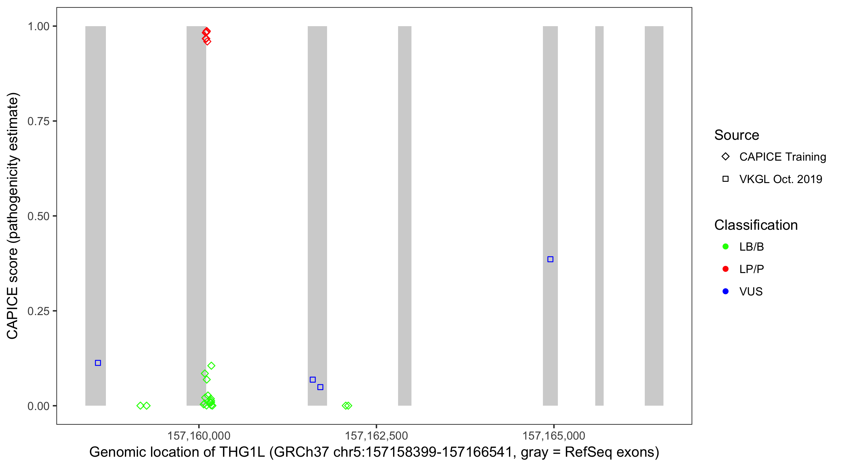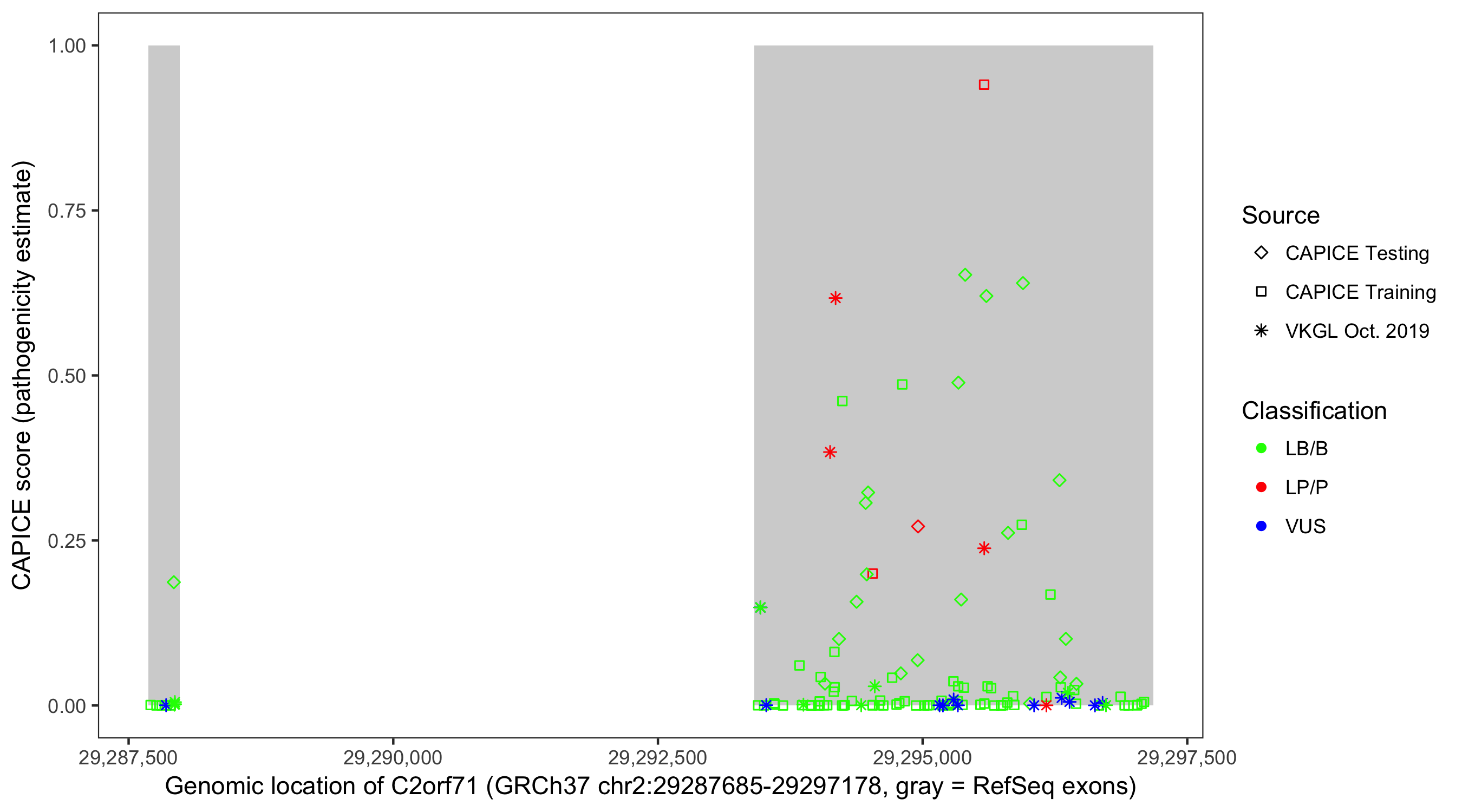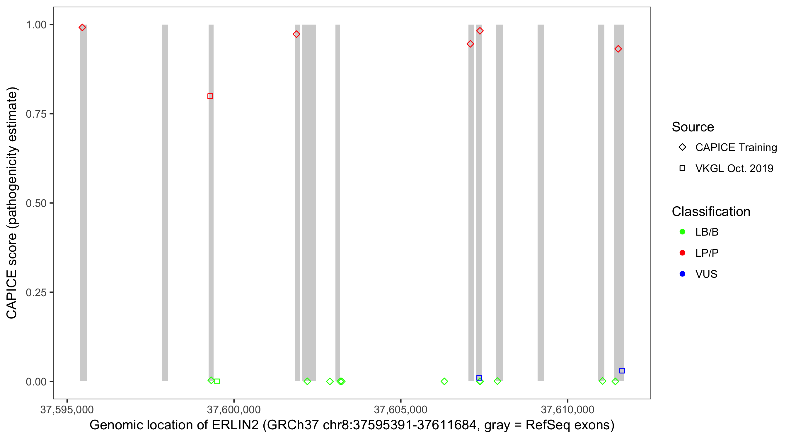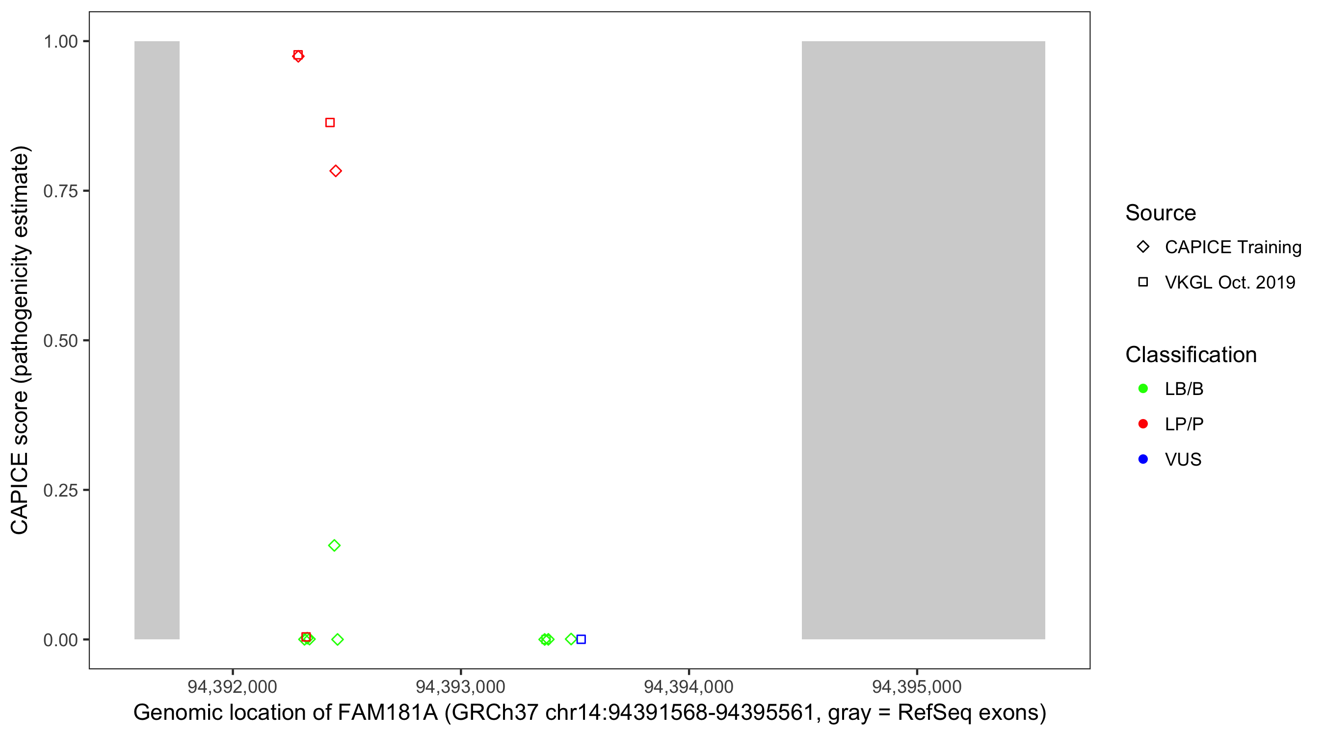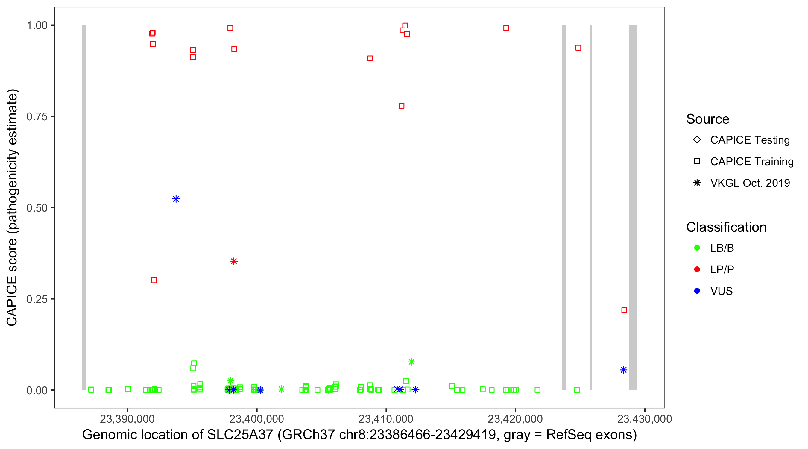 Shown are CAPICE train/test variants plus VKGL Oct 2019.