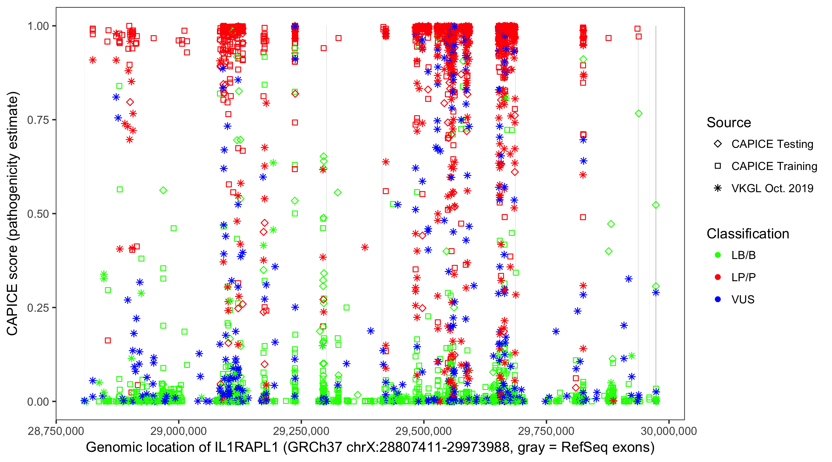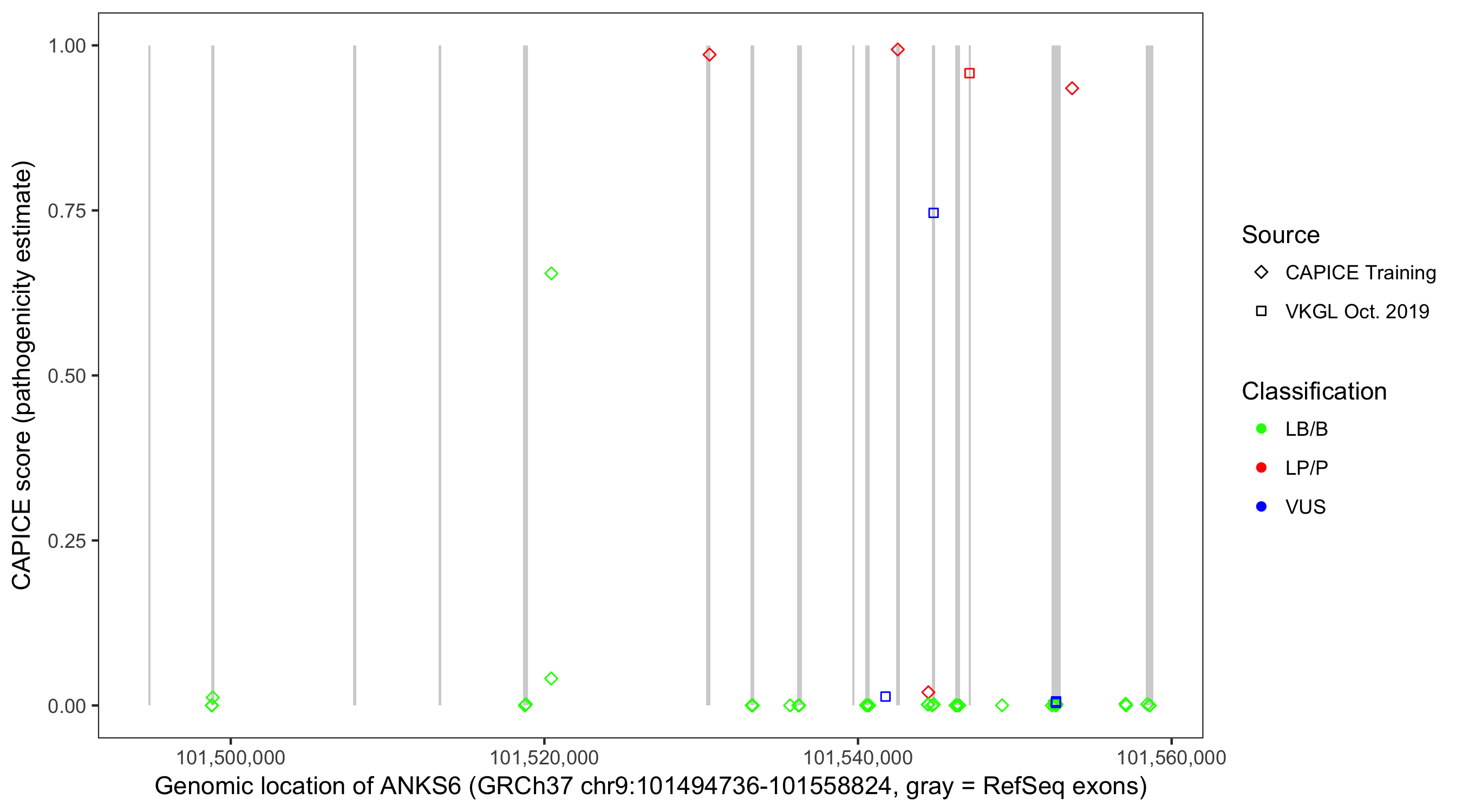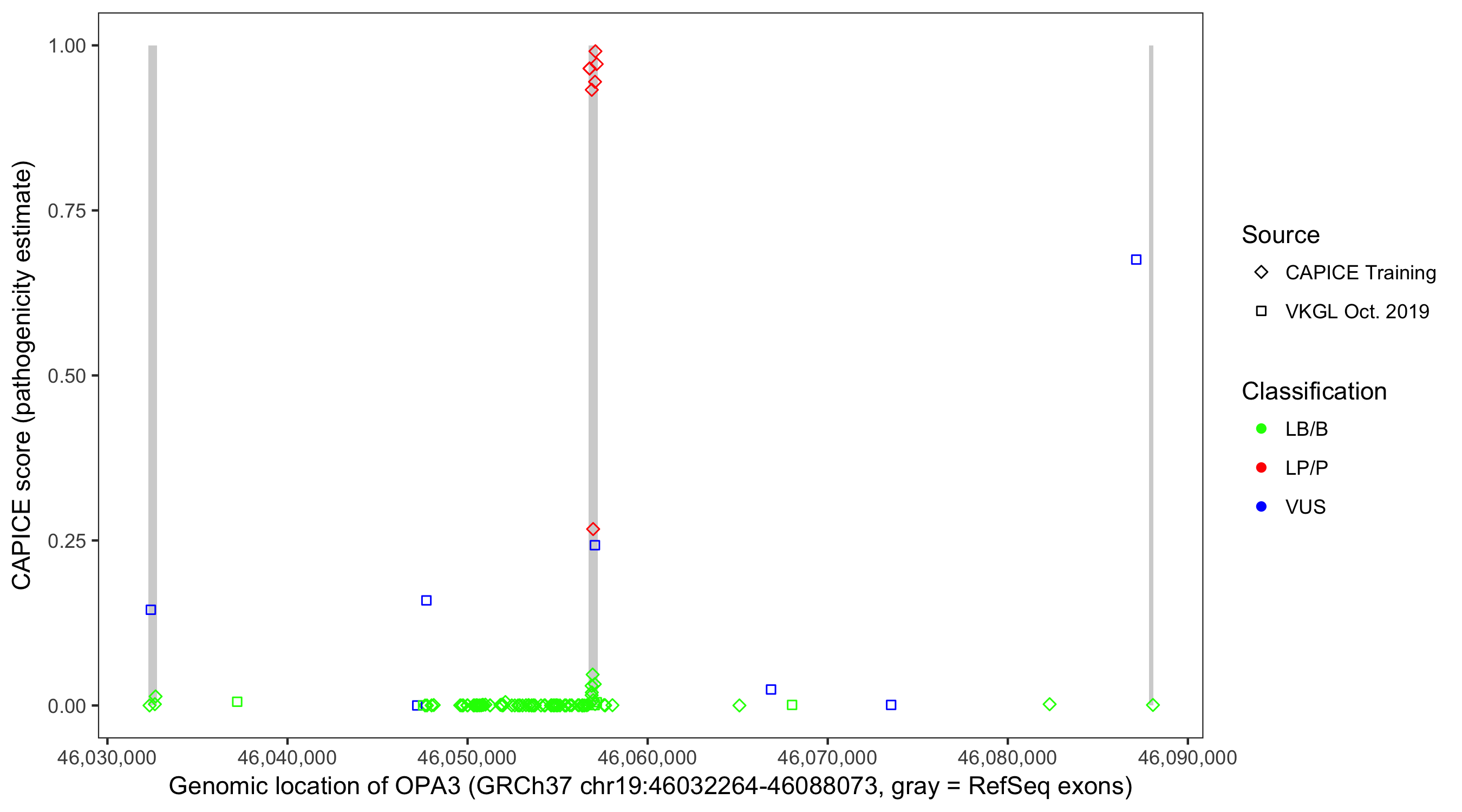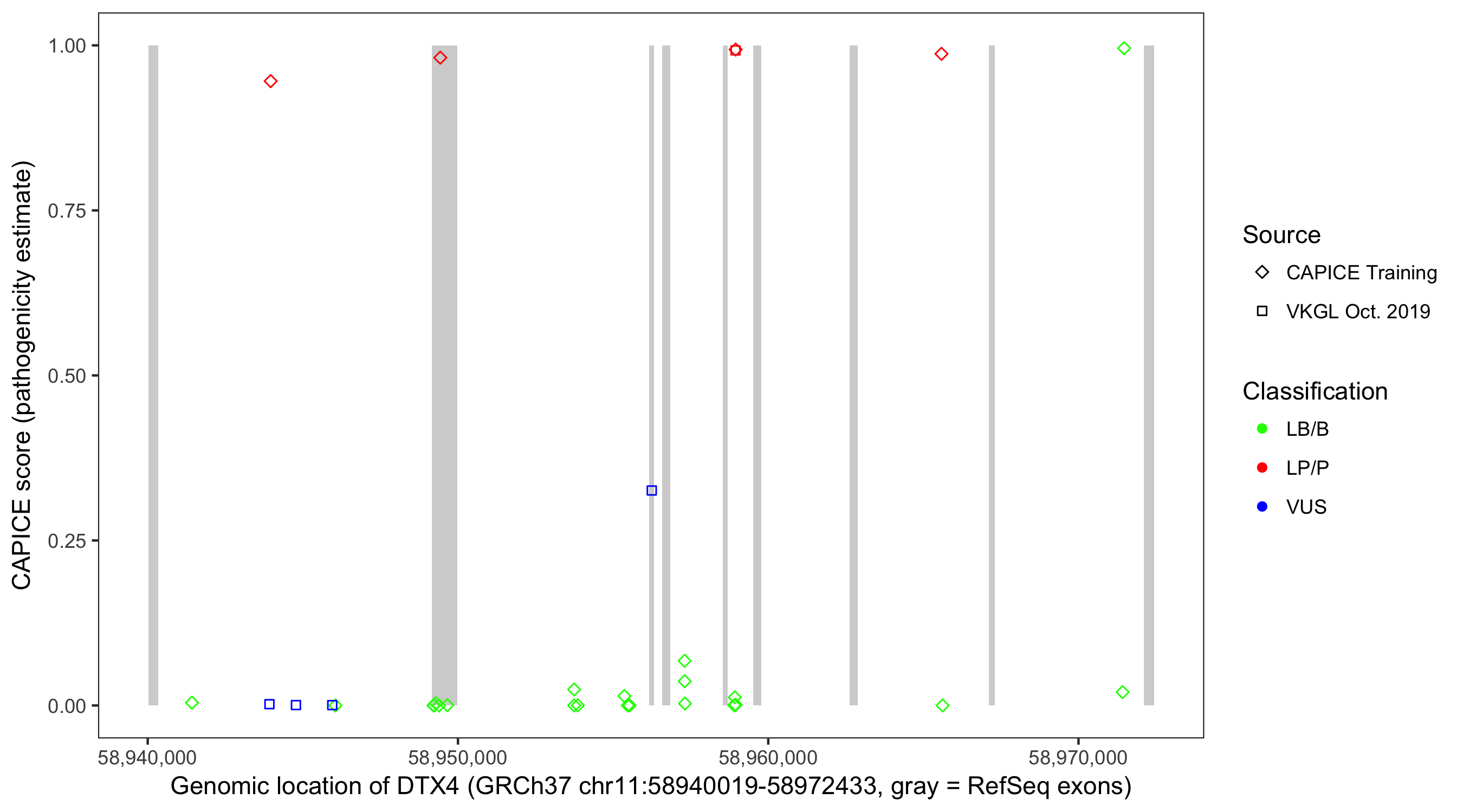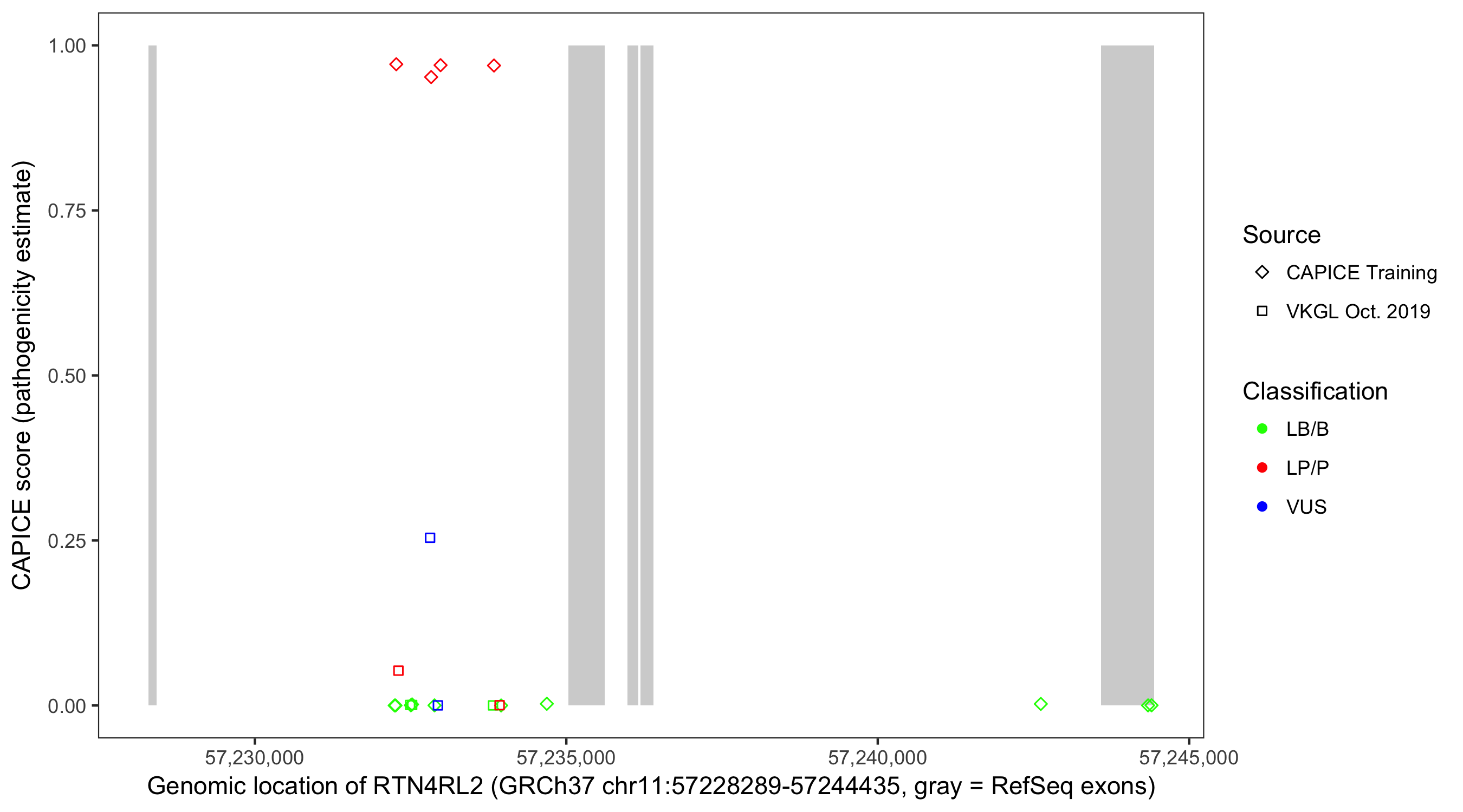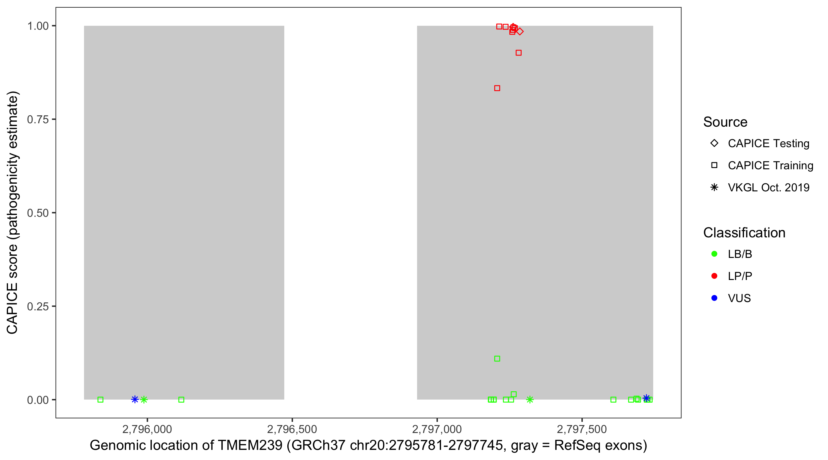 Shown are CAPICE train/test variants plus VKGL Oct 2019.