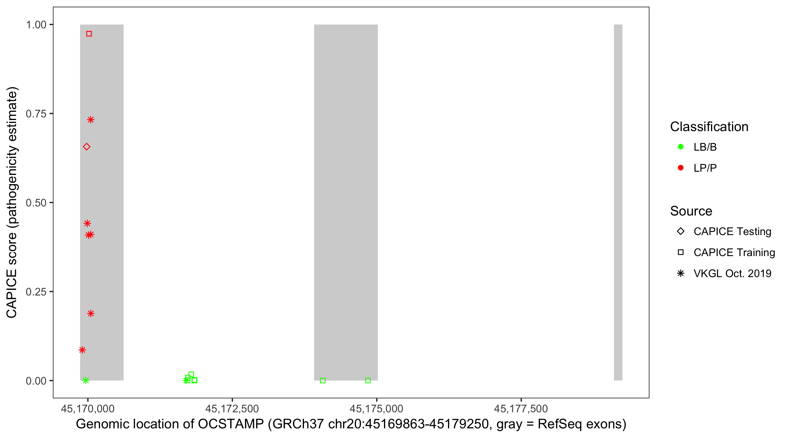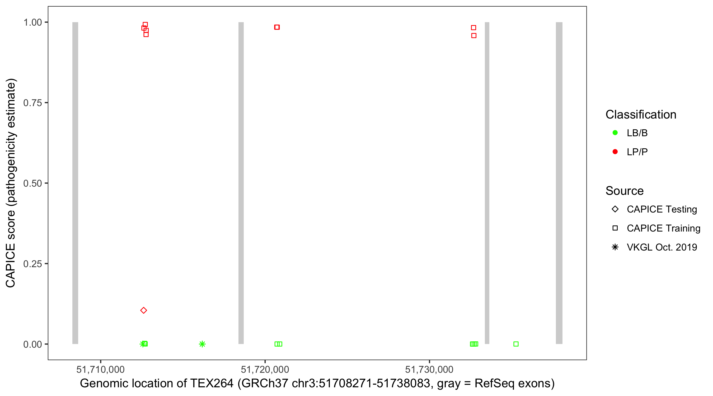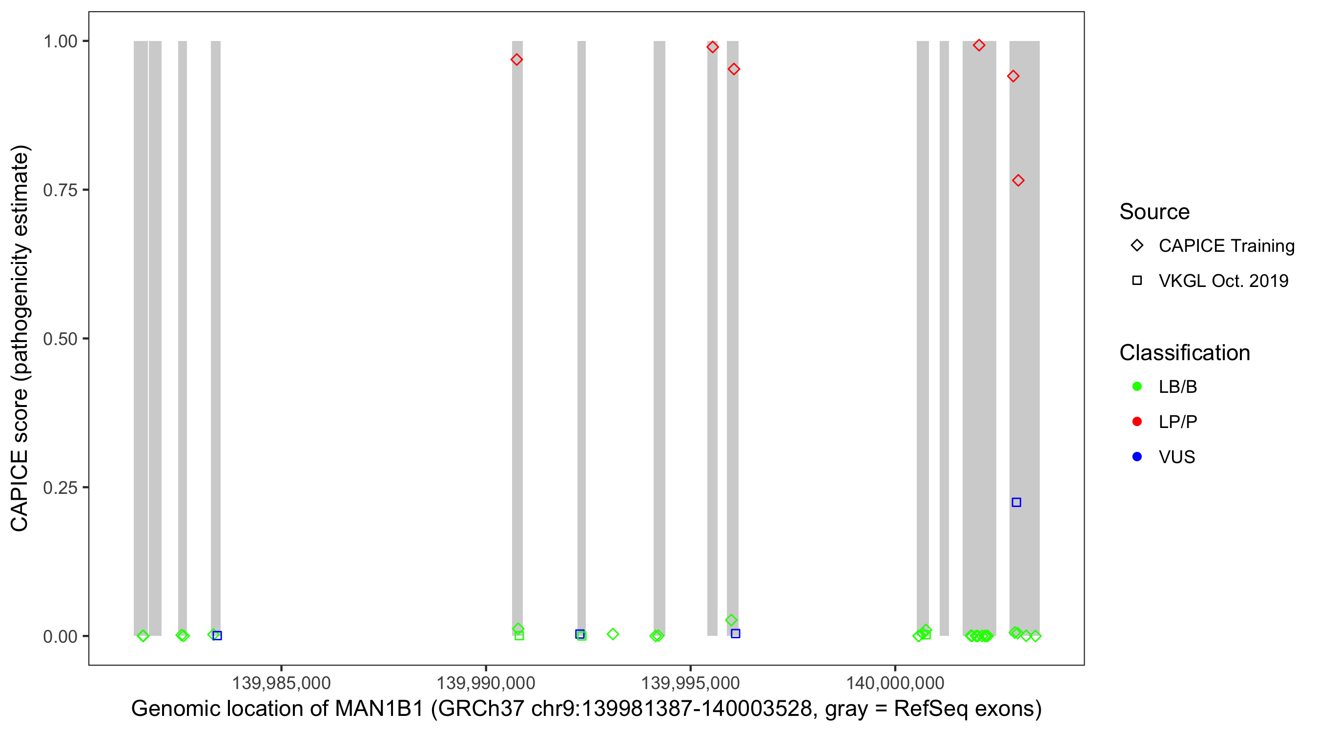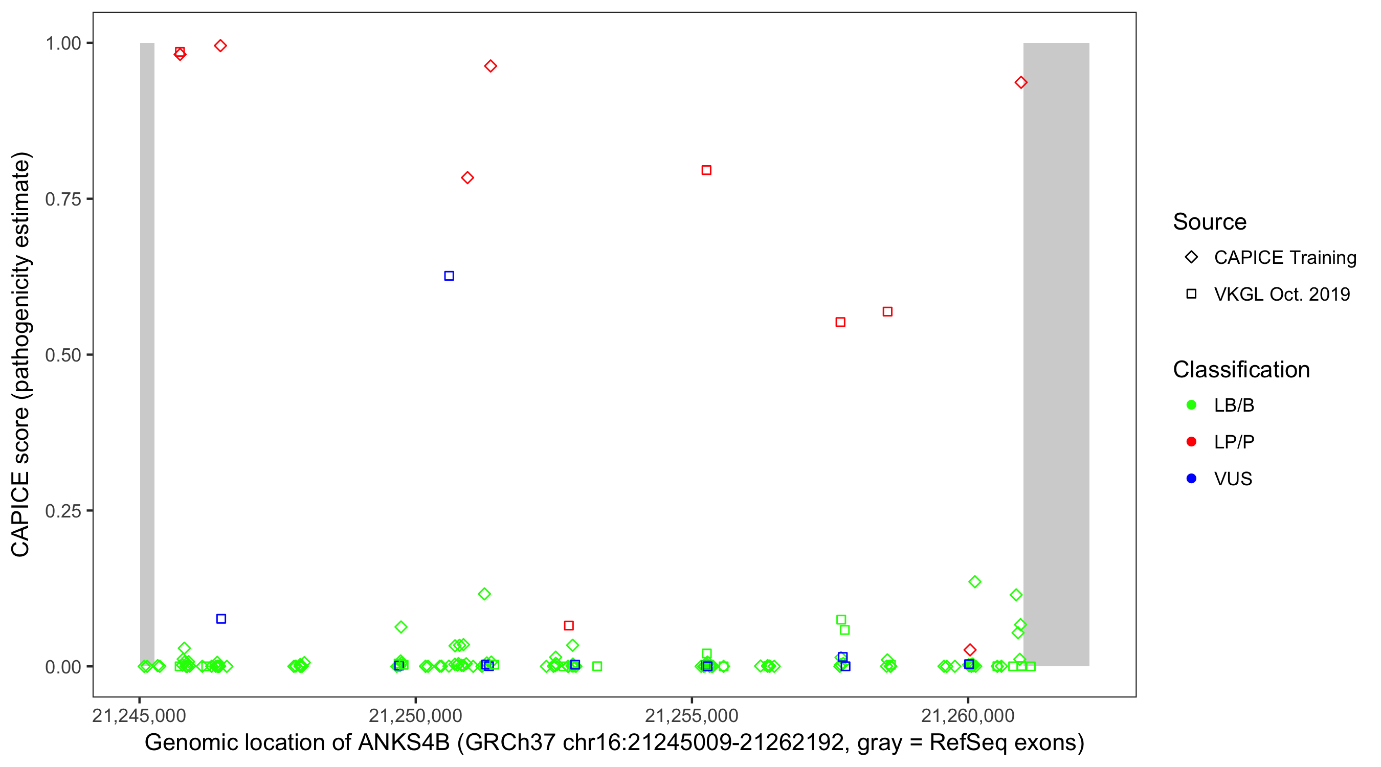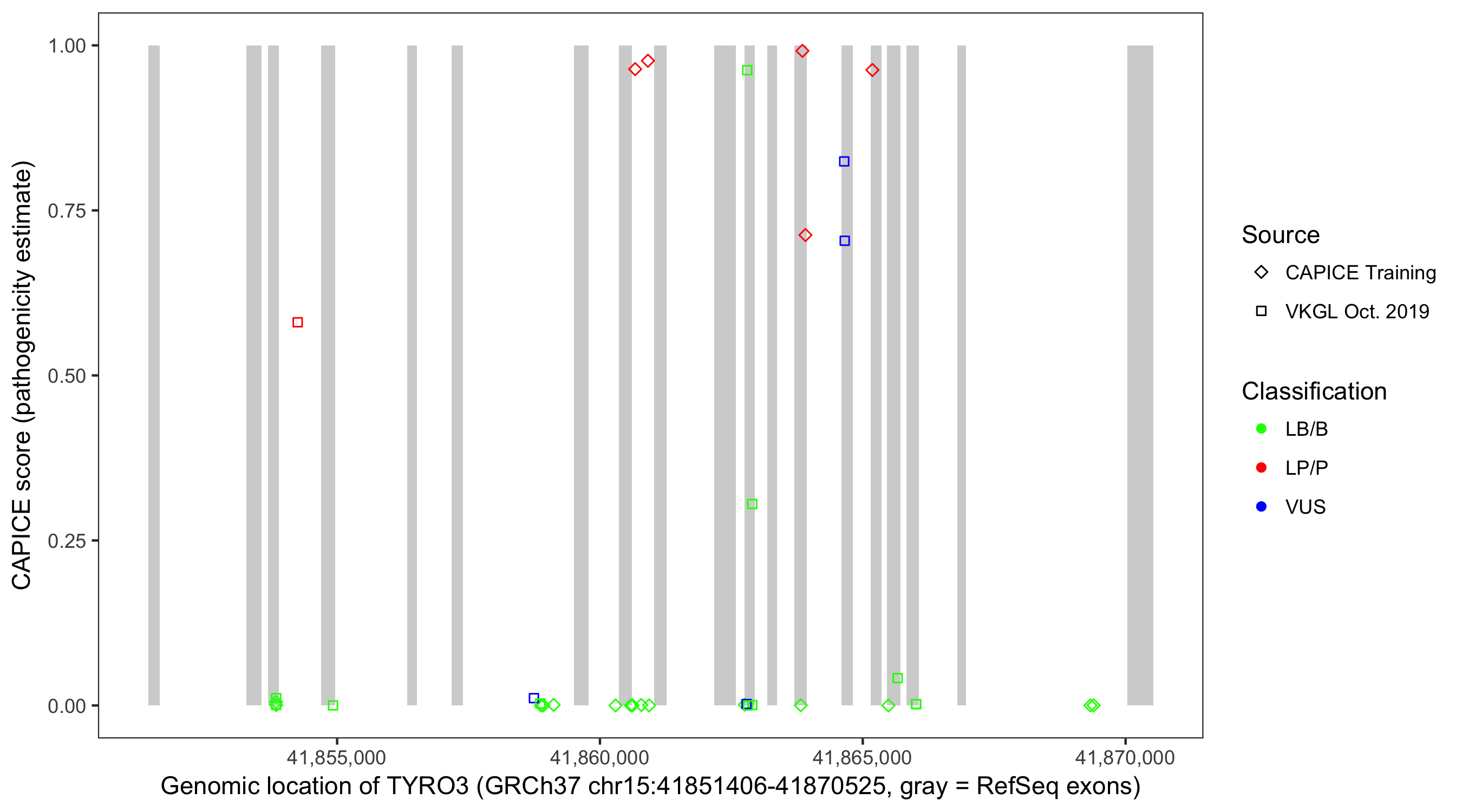 Shown are CAPICE train/test variants plus VKGL Oct 2019.
