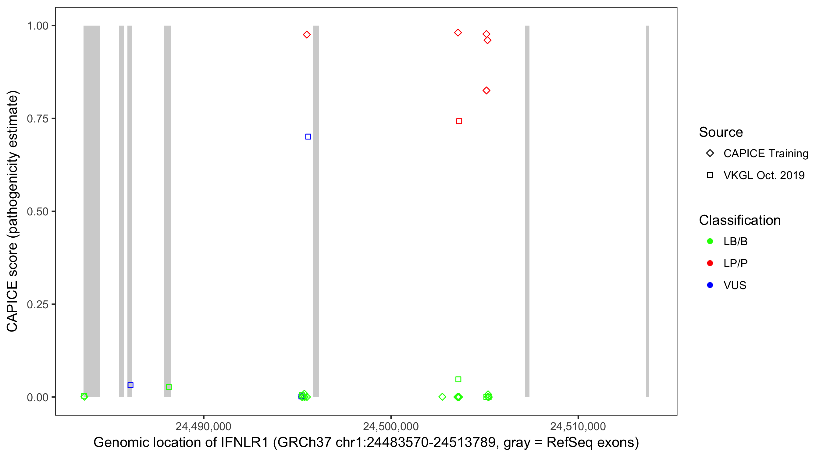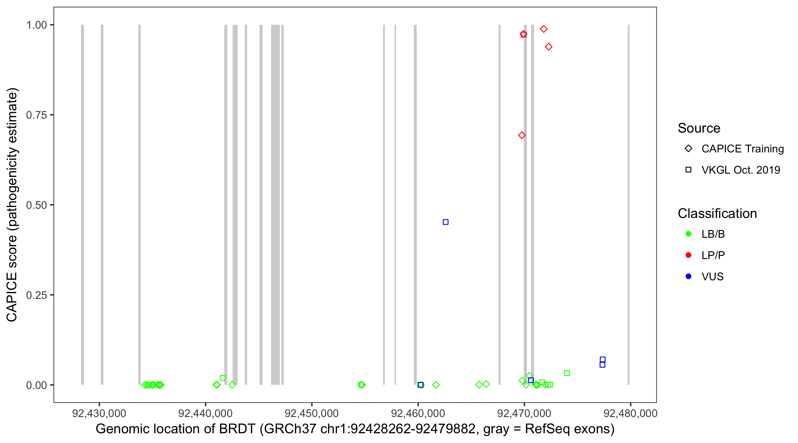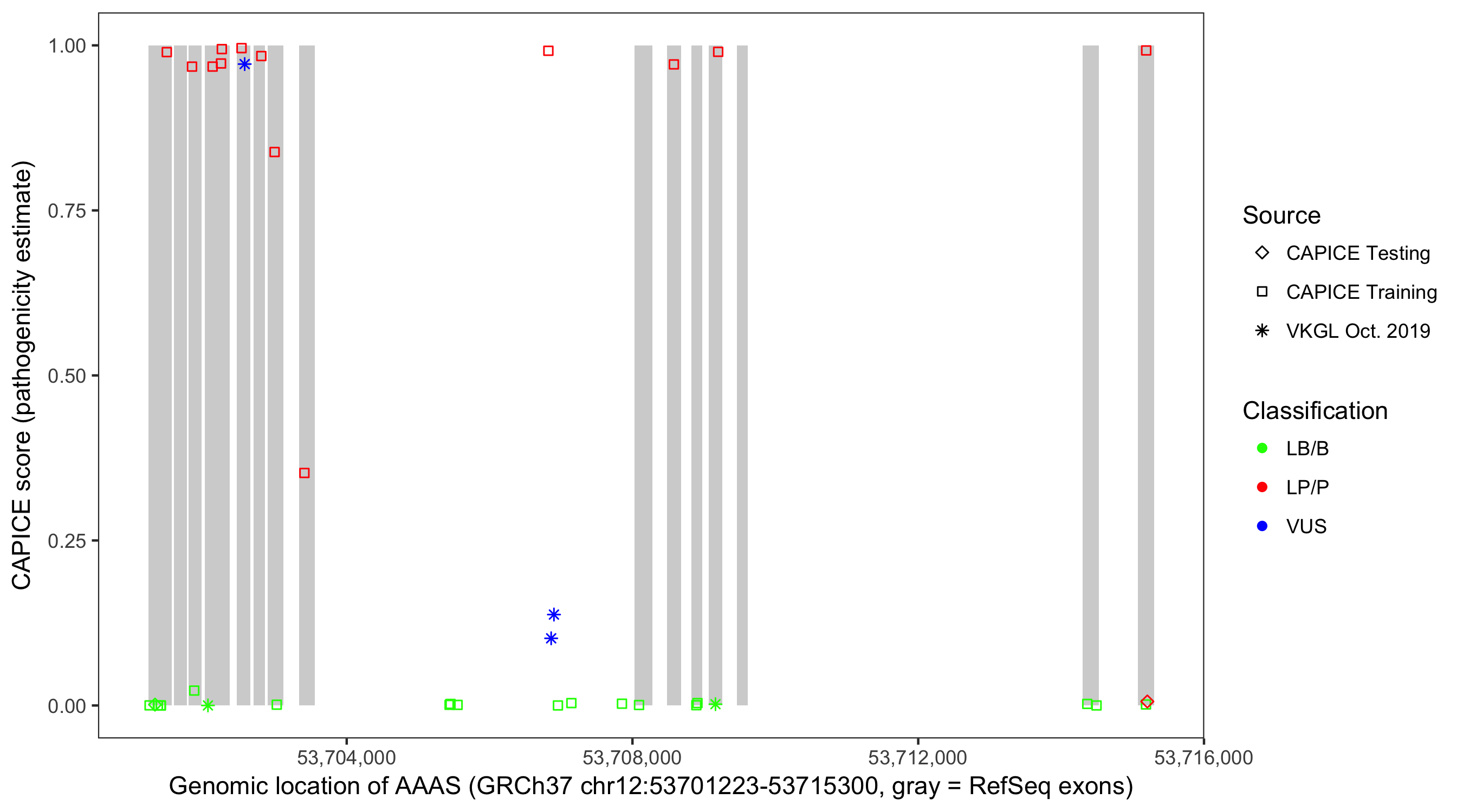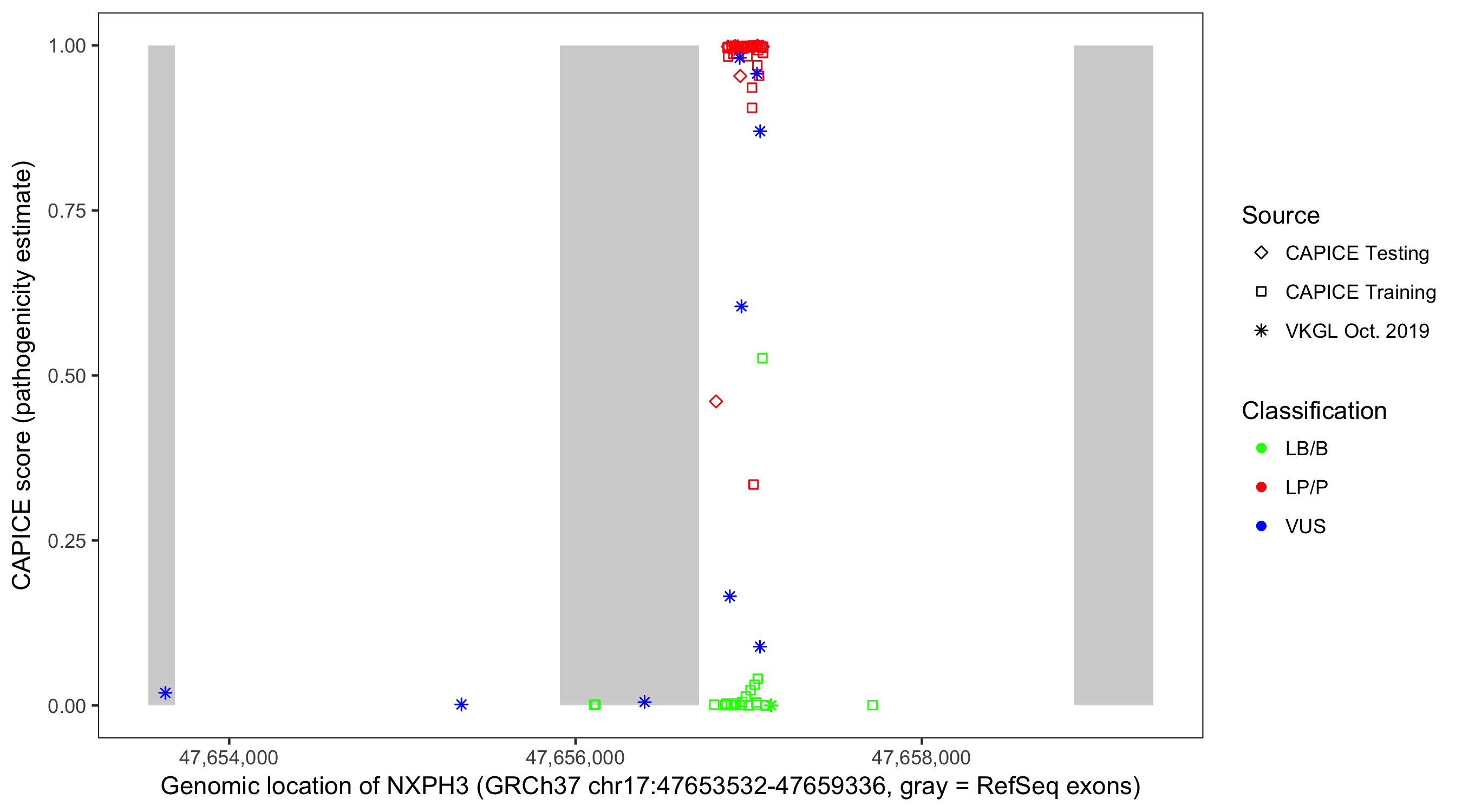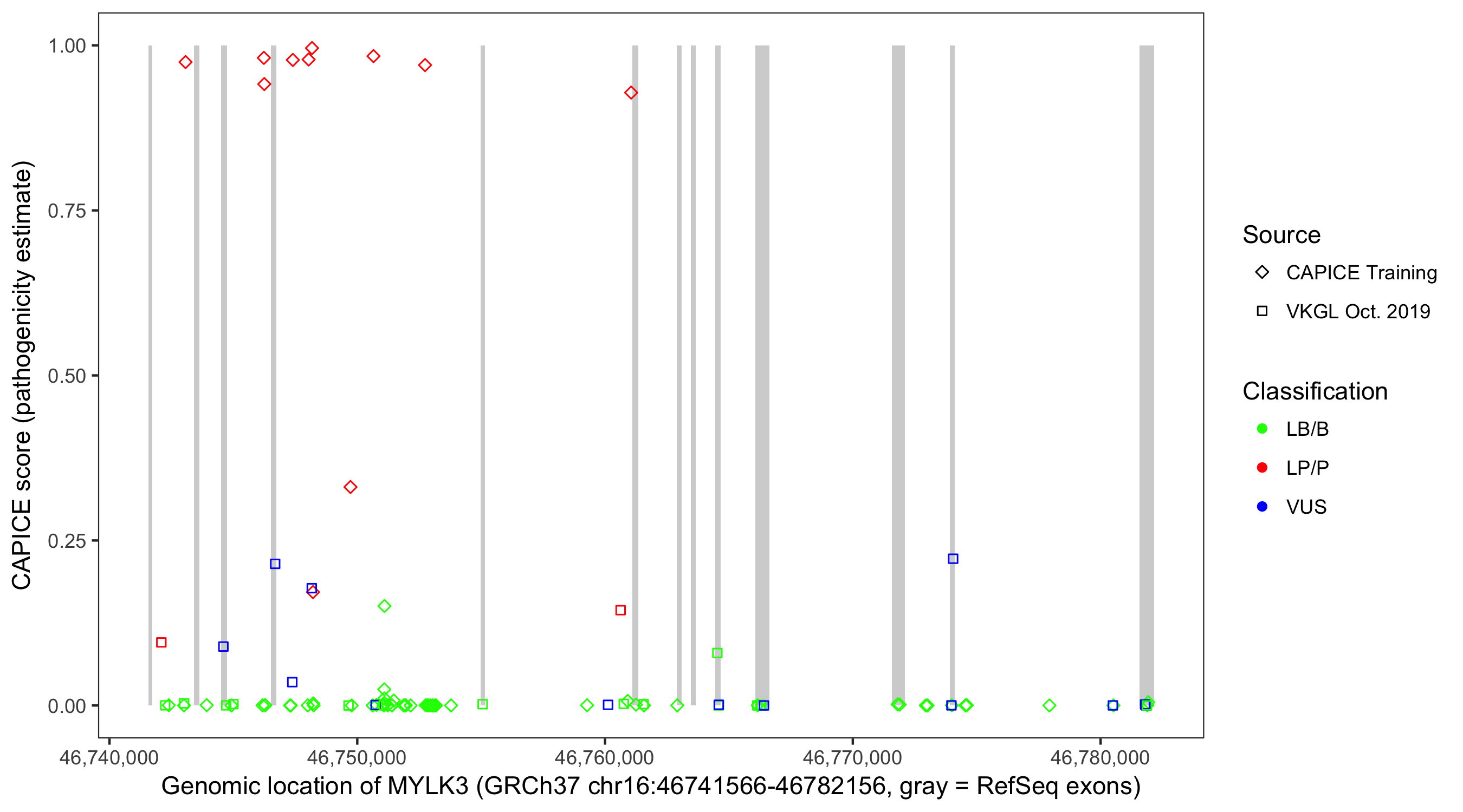 Shown are CAPICE train/test variants plus VKGL Oct 2019.