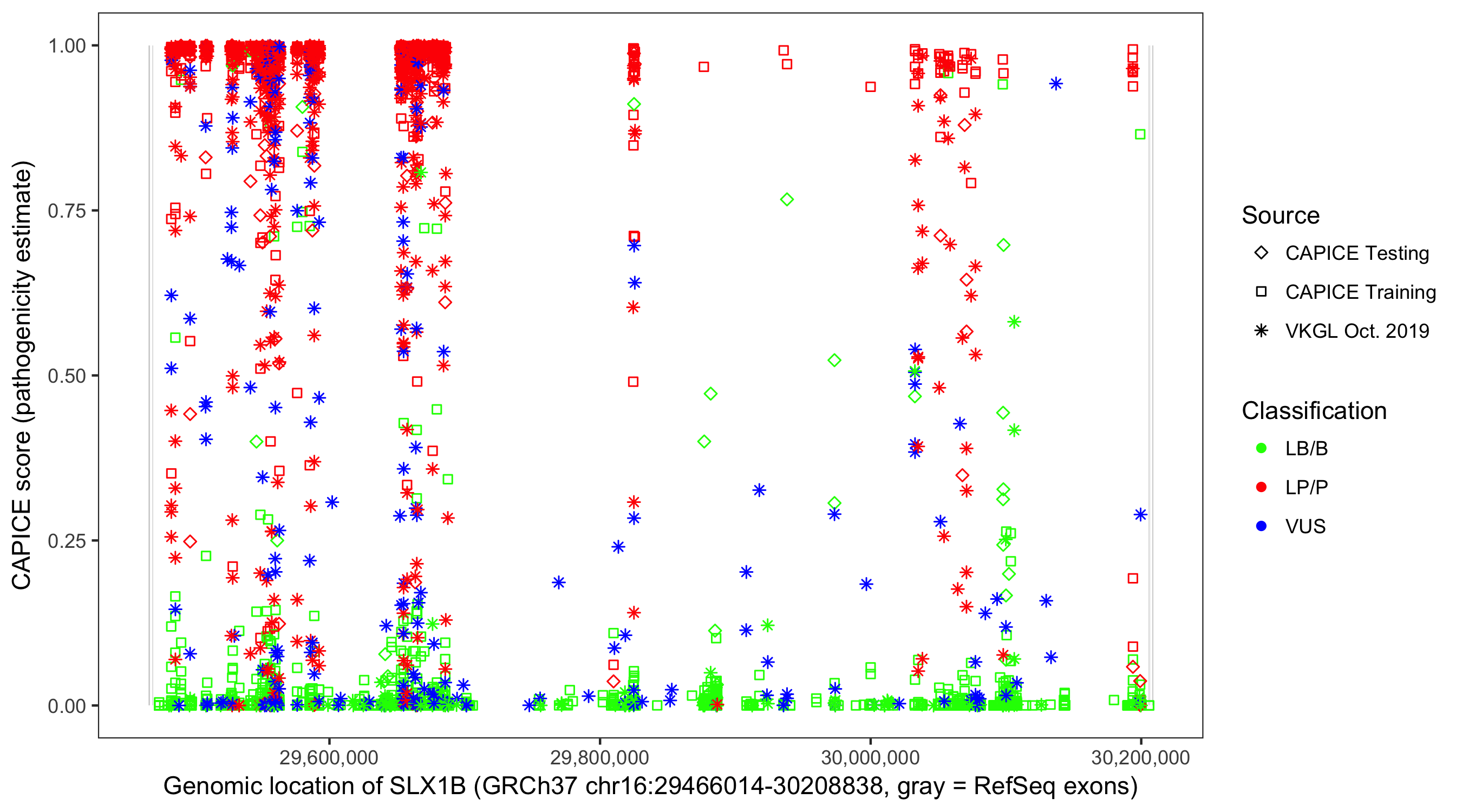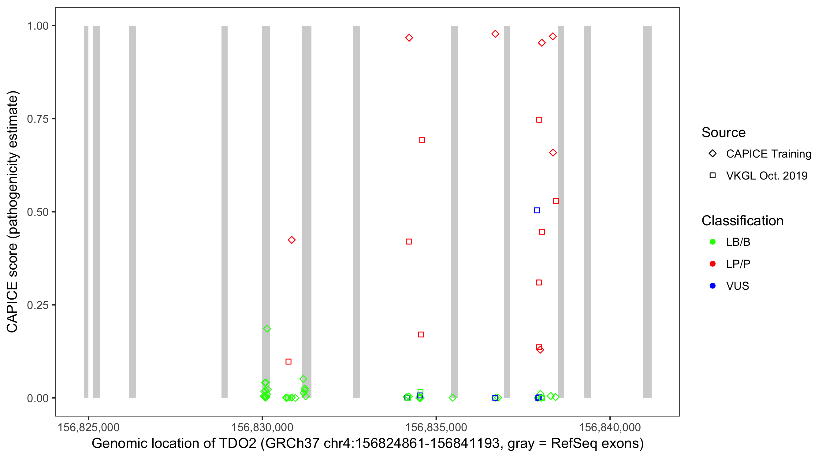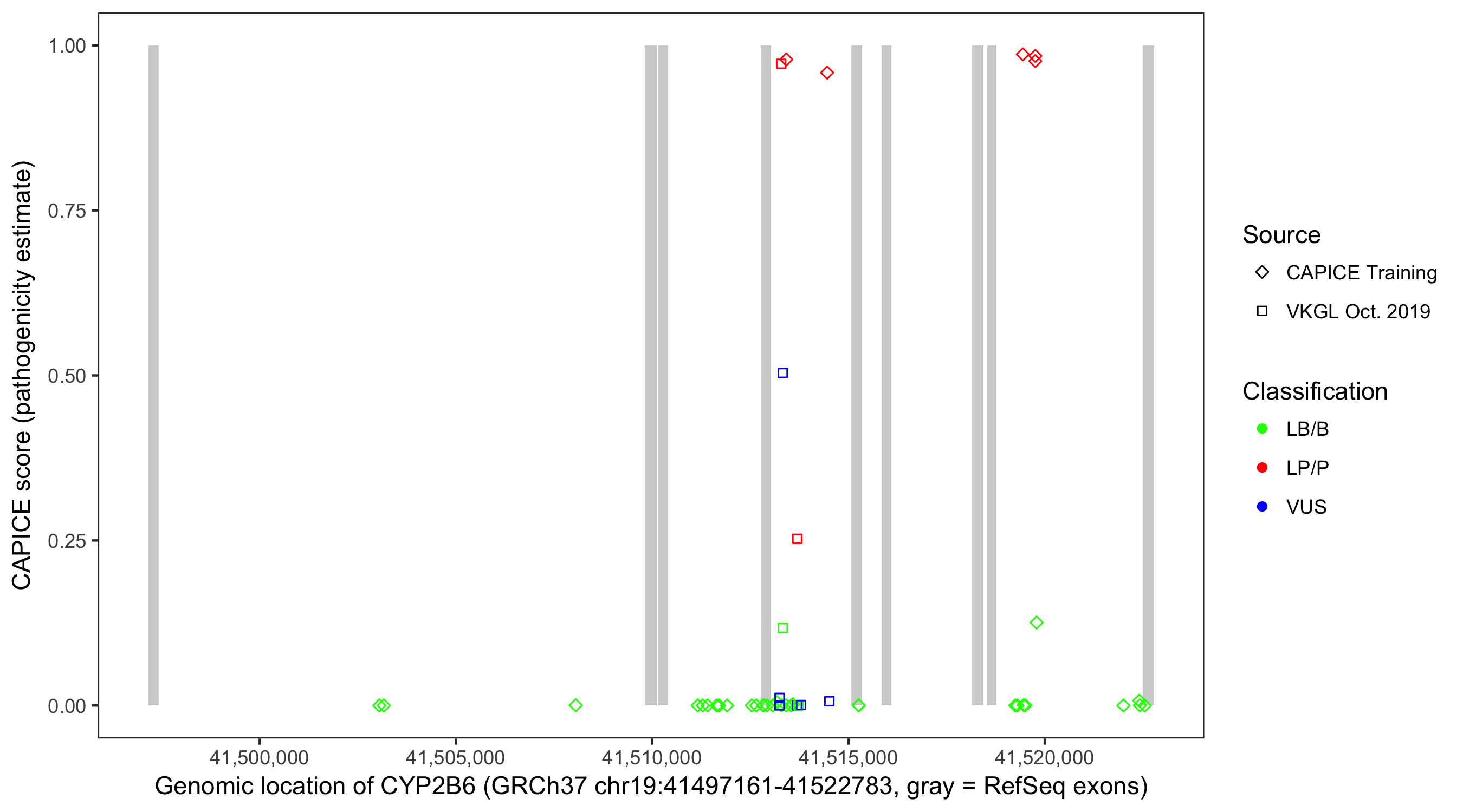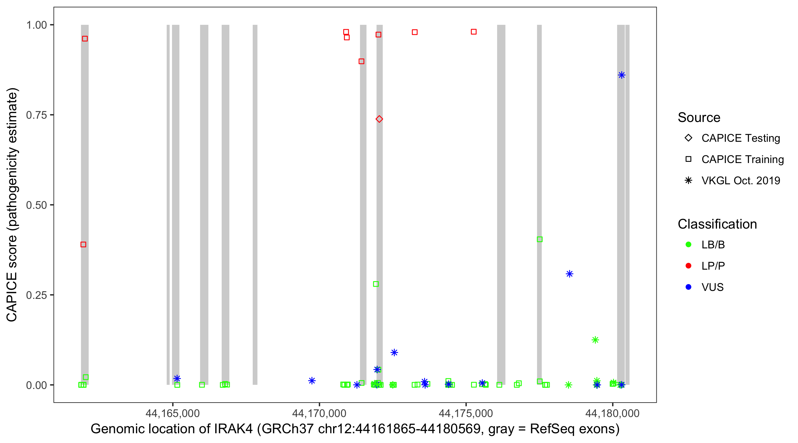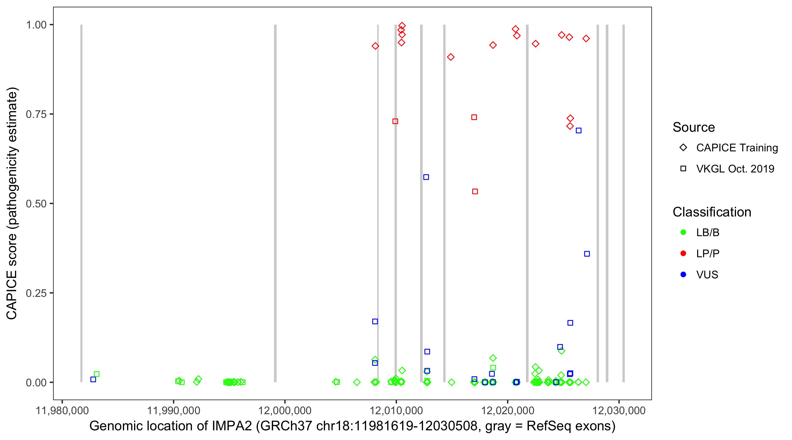 Shown are CAPICE train/test variants plus VKGL Oct 2019.
