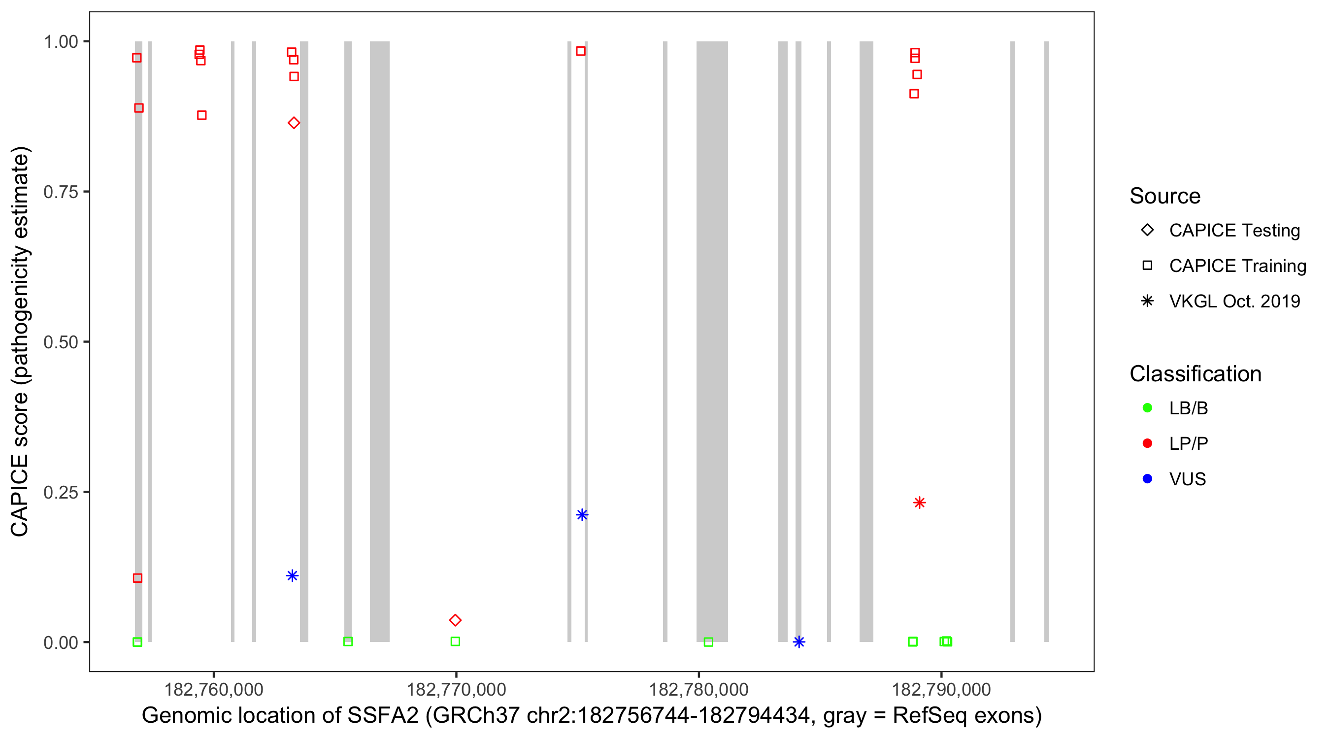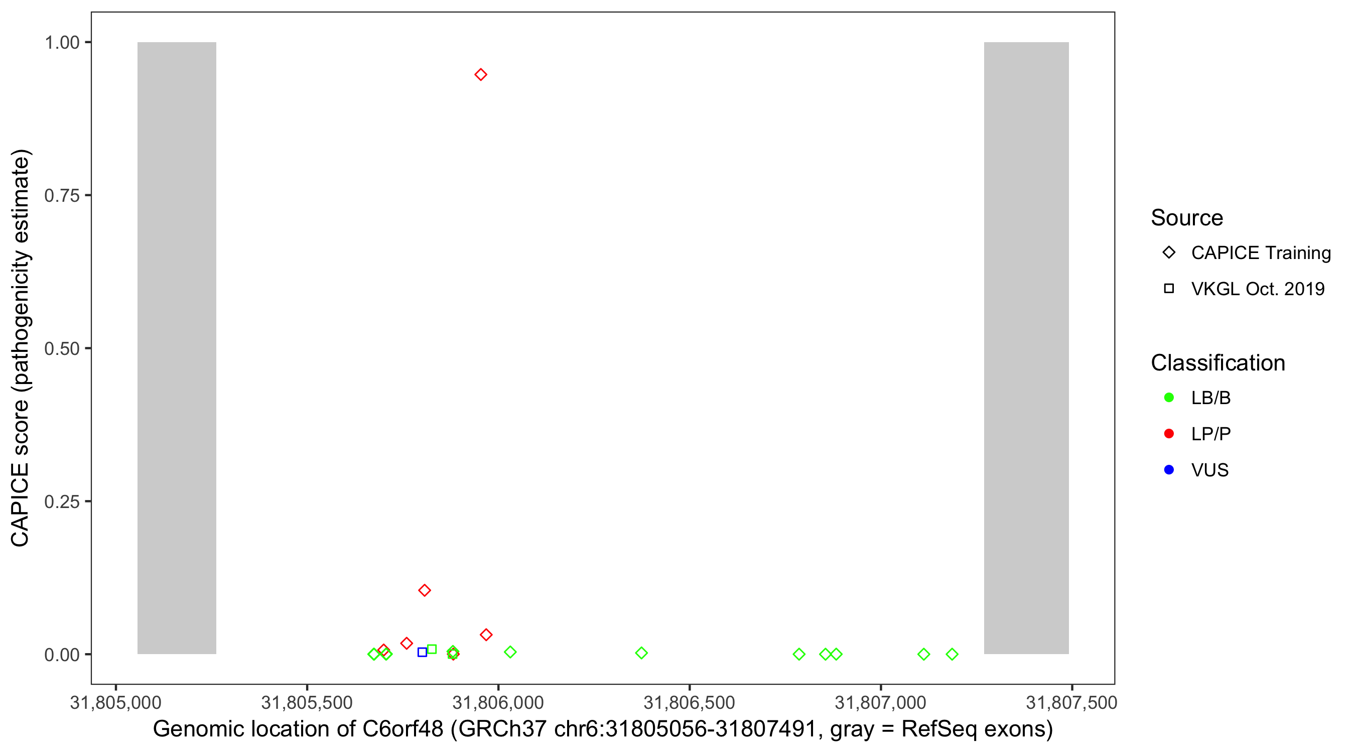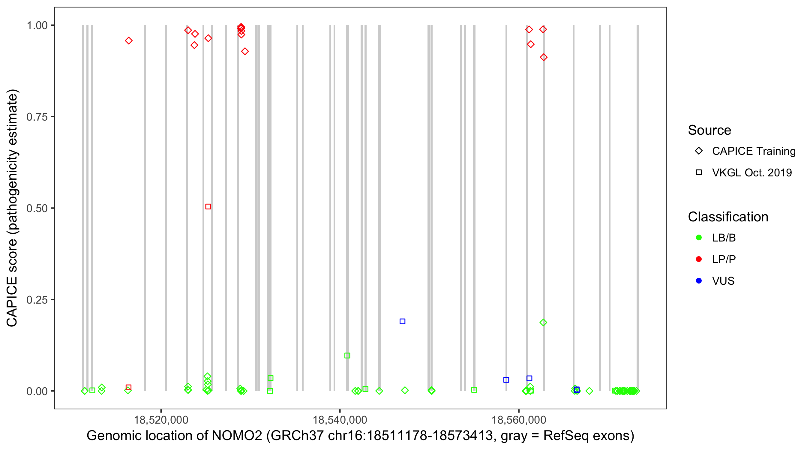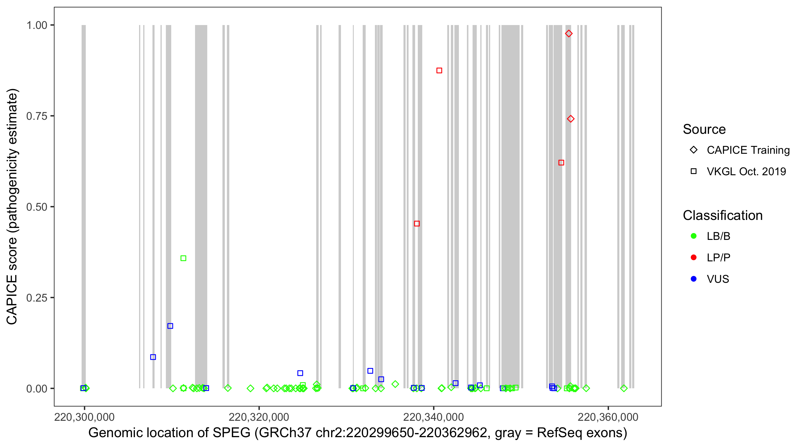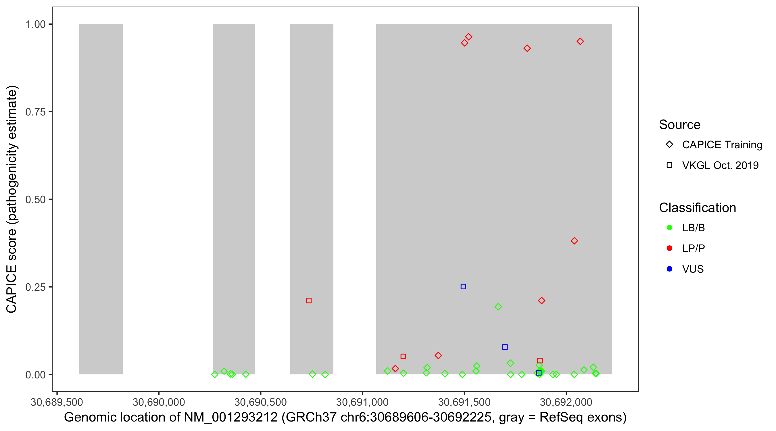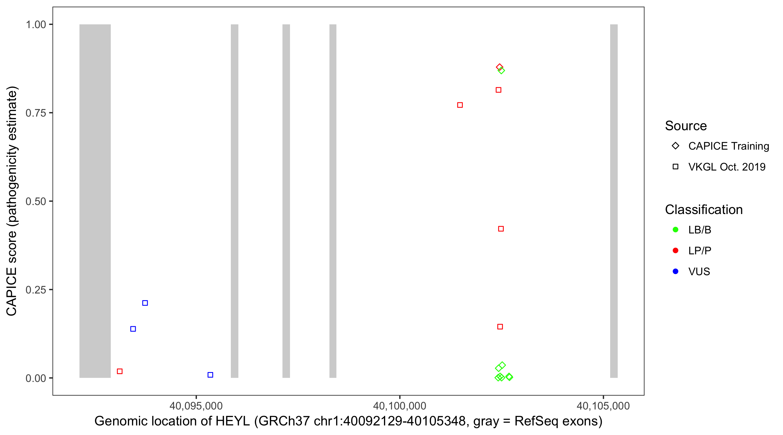 Shown are CAPICE train/test variants plus VKGL Oct 2019.