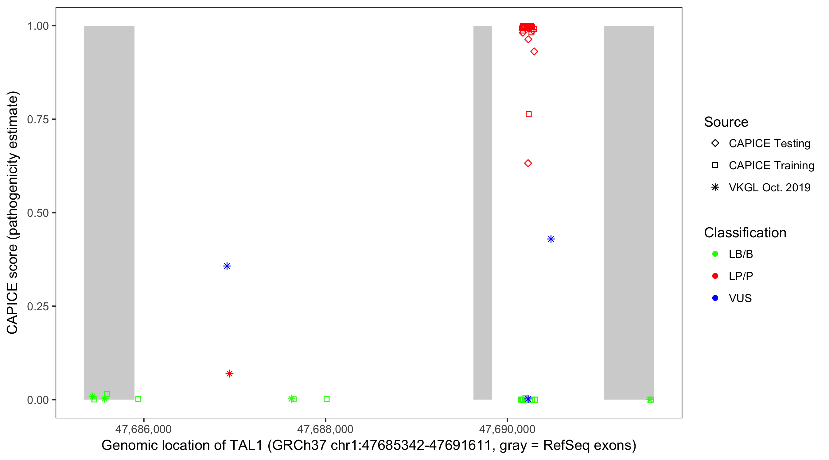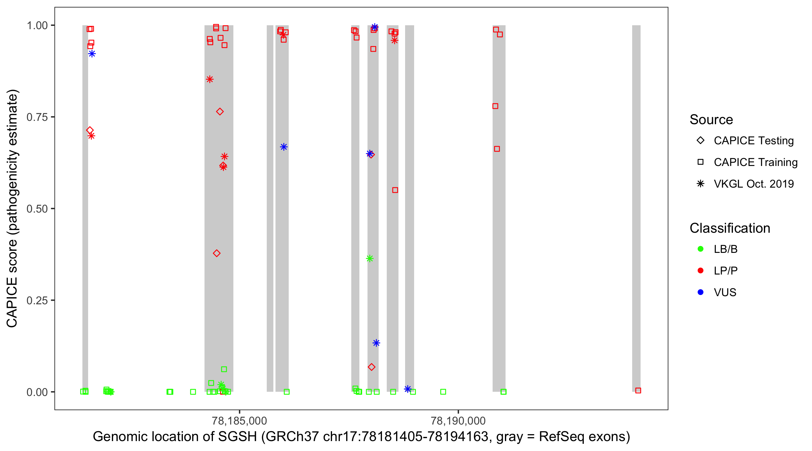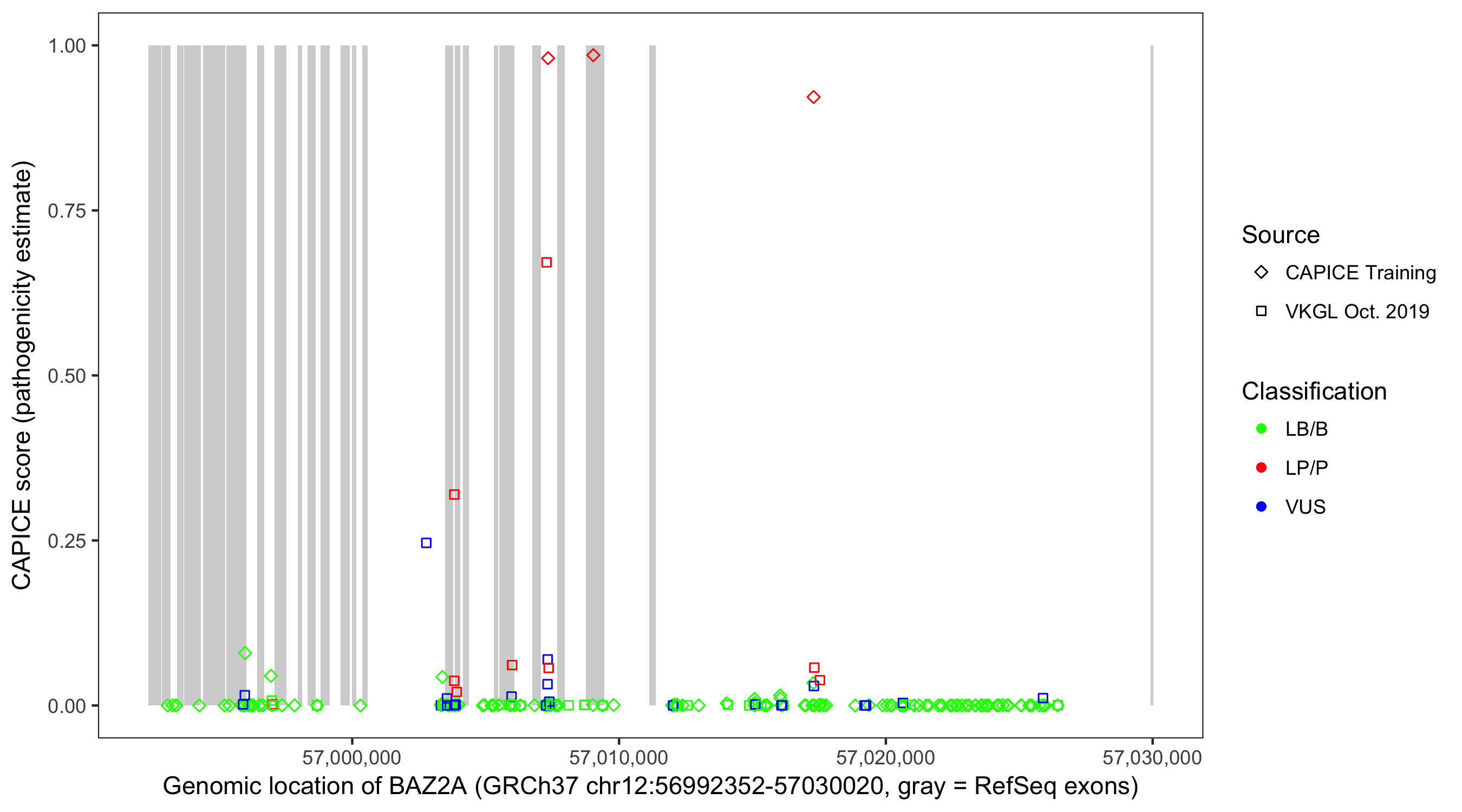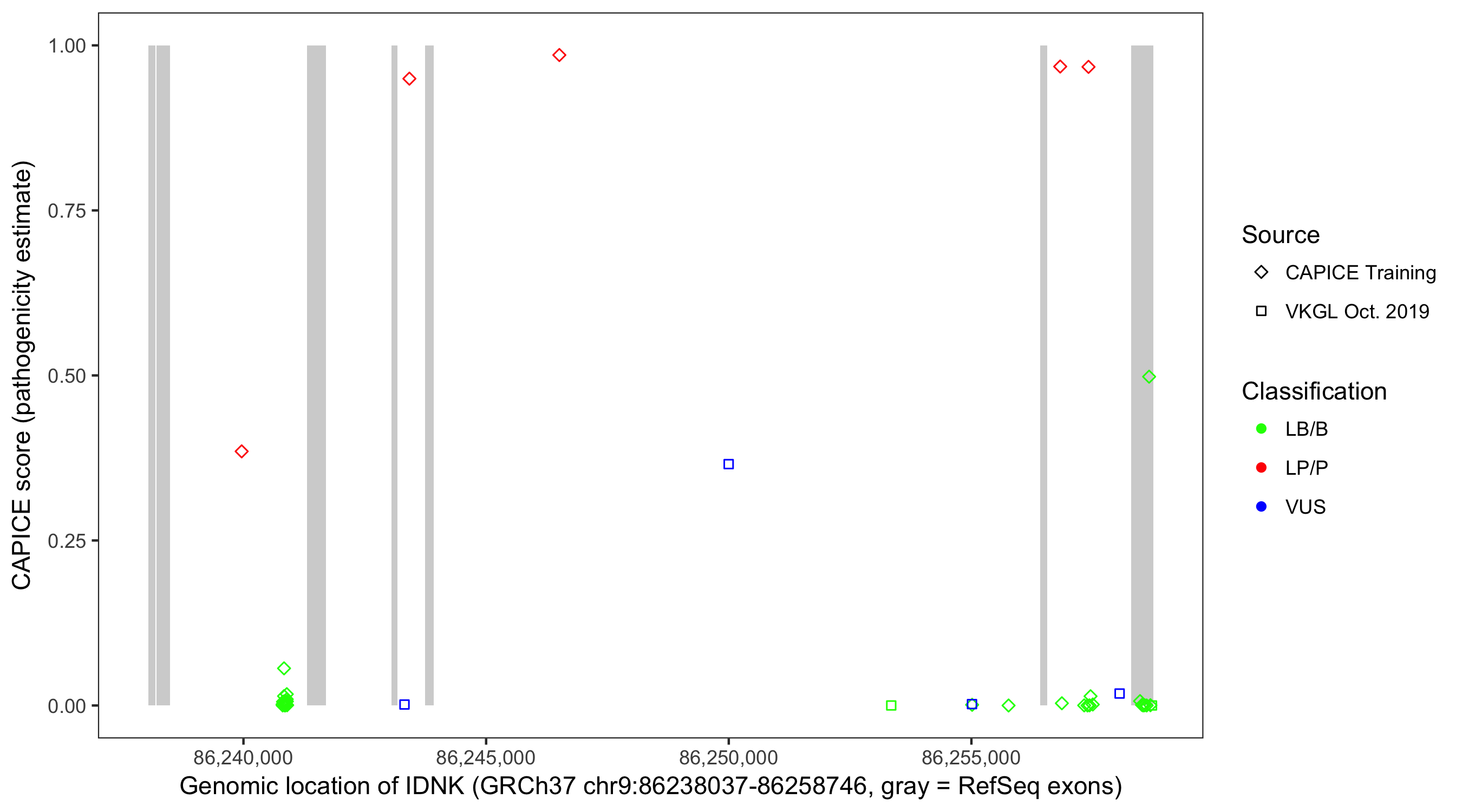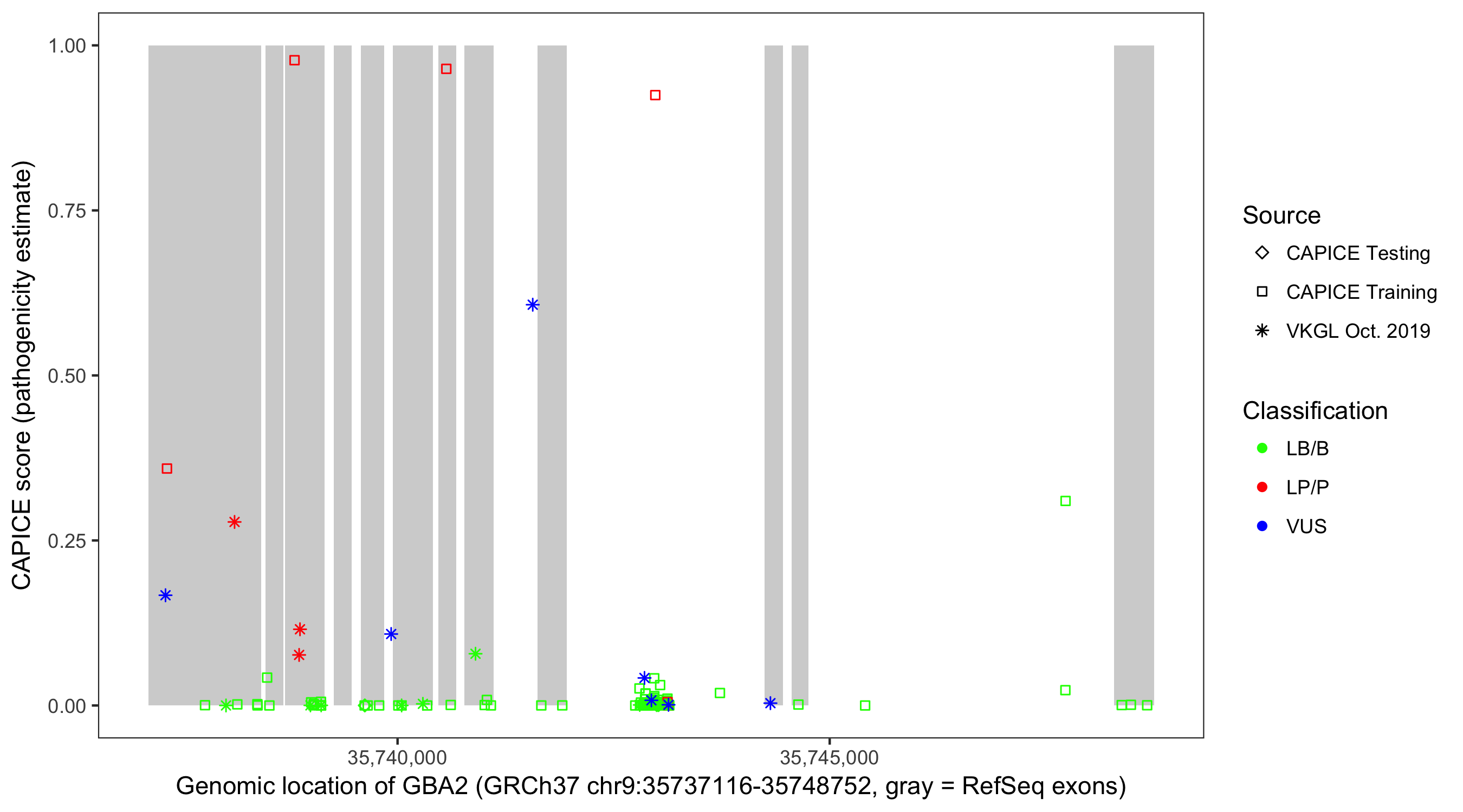 Shown are CAPICE train/test variants plus VKGL Oct 2019.