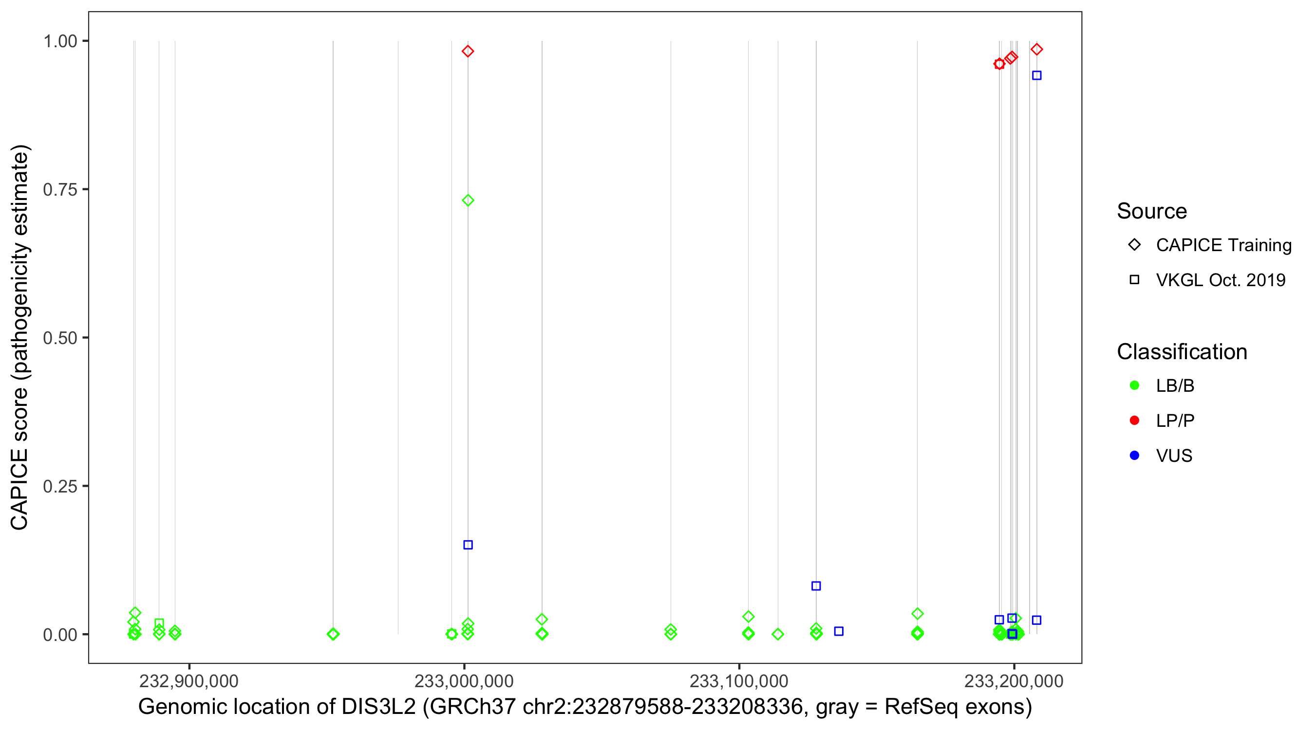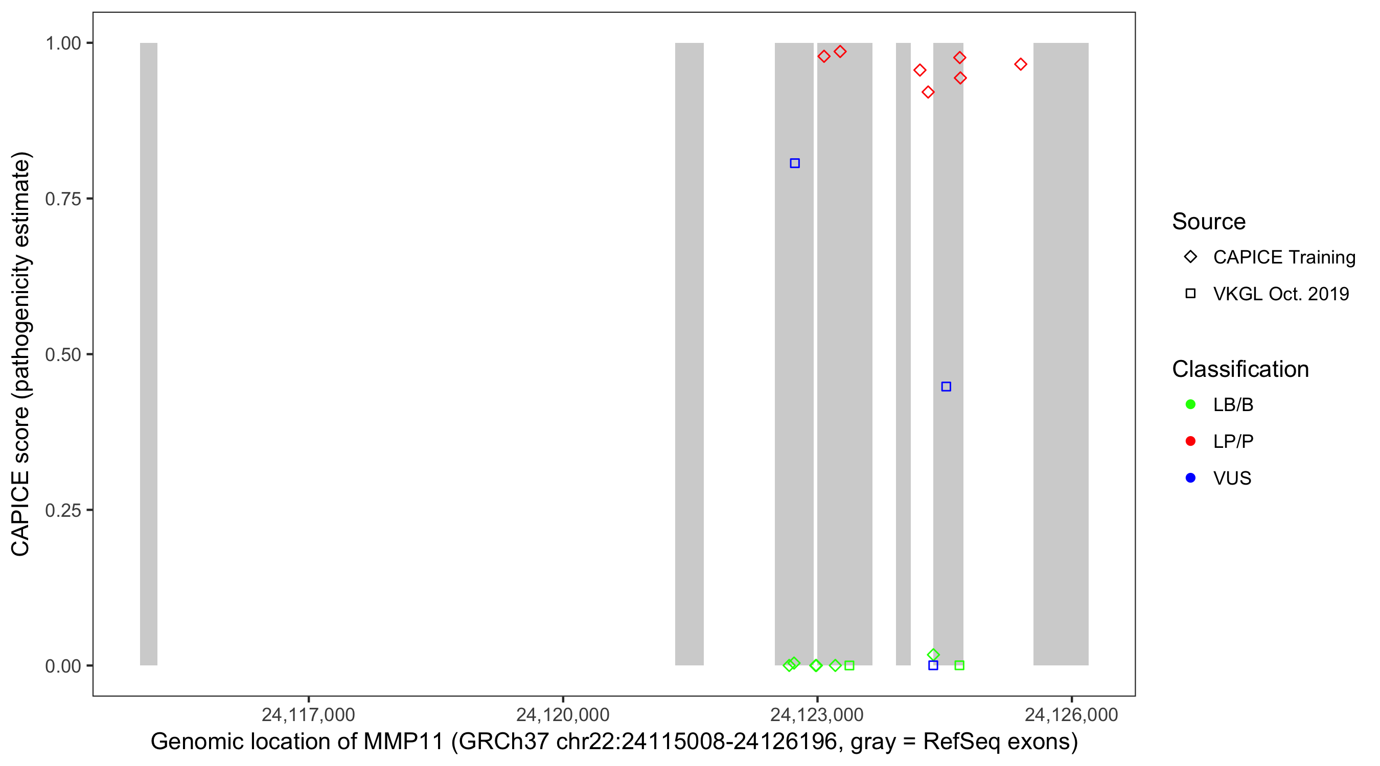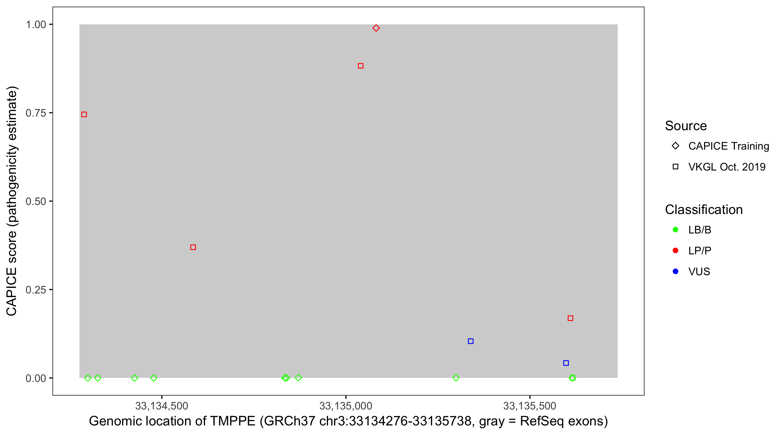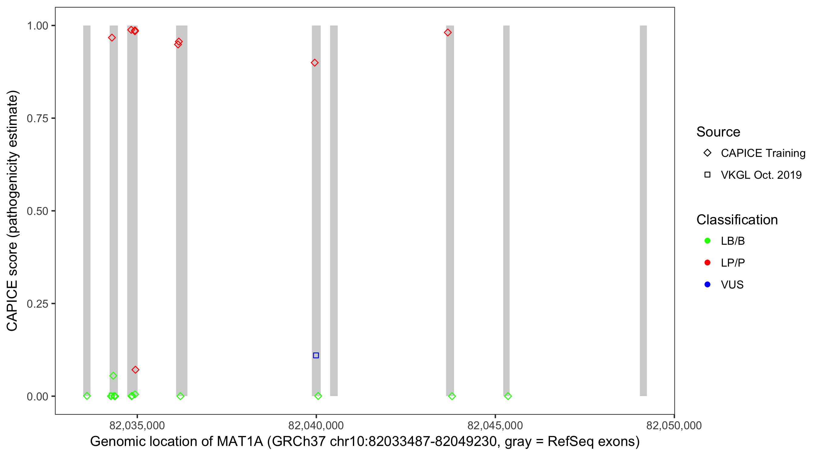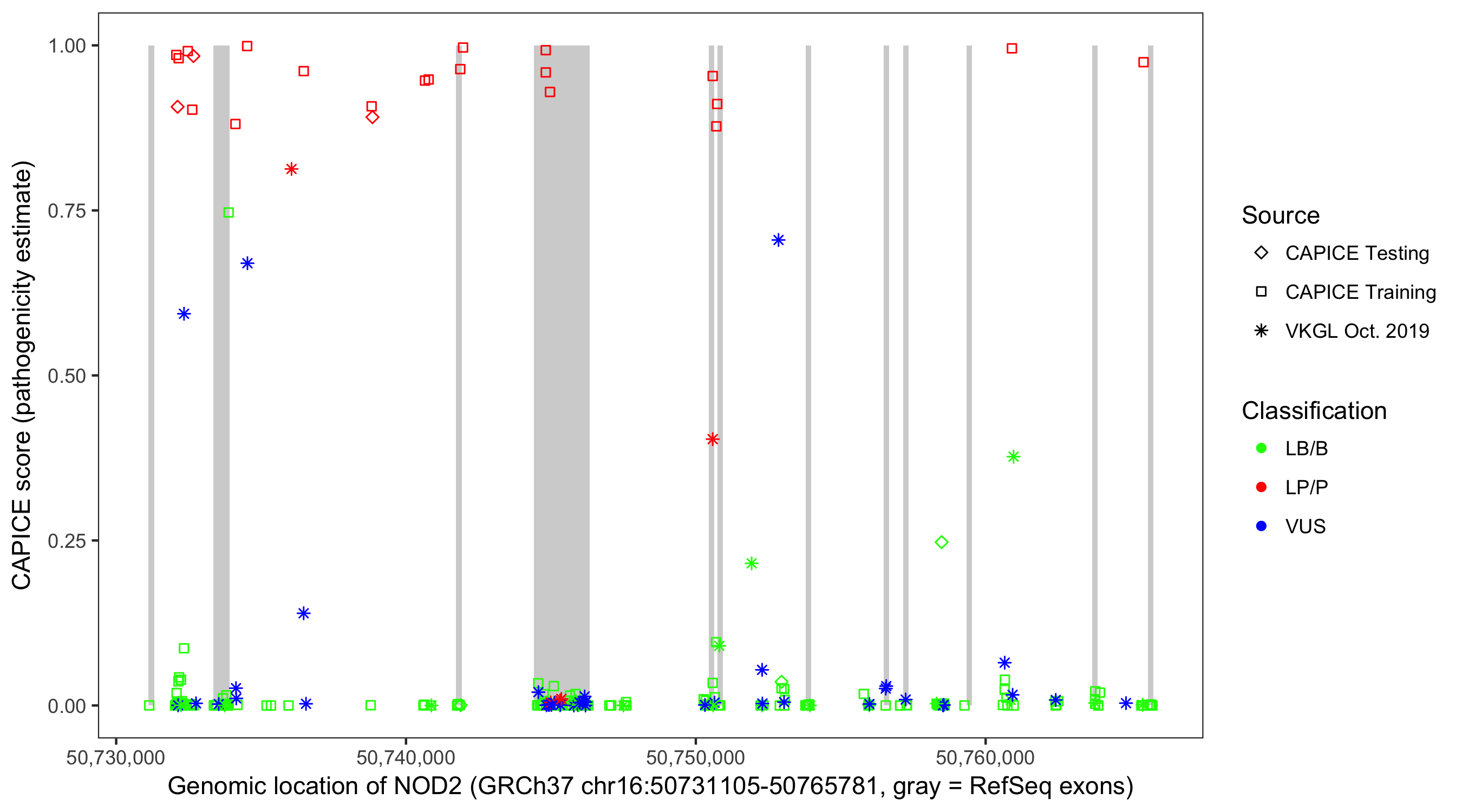 Shown are CAPICE train/test variants plus VKGL Oct 2019.